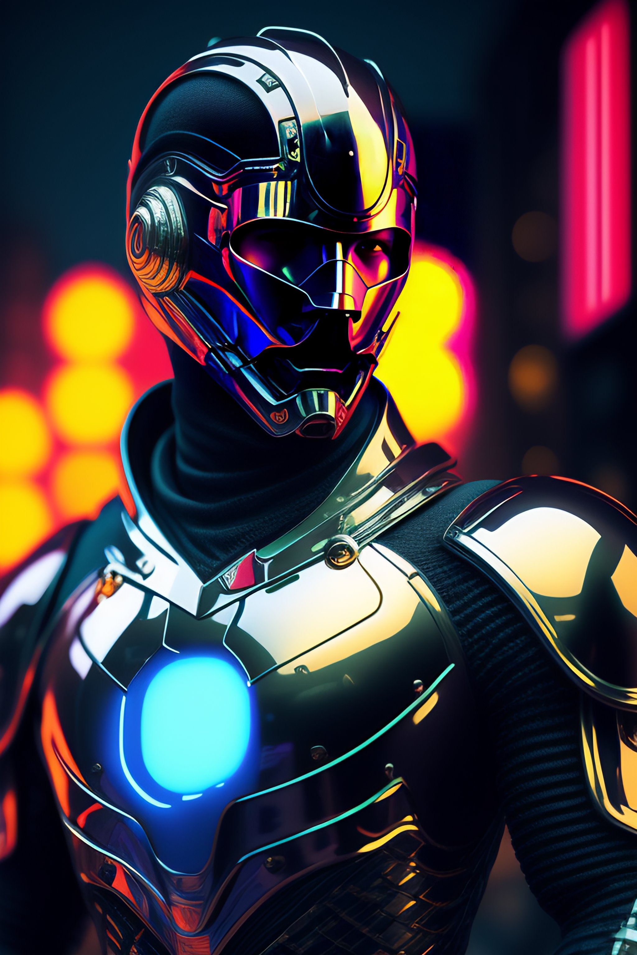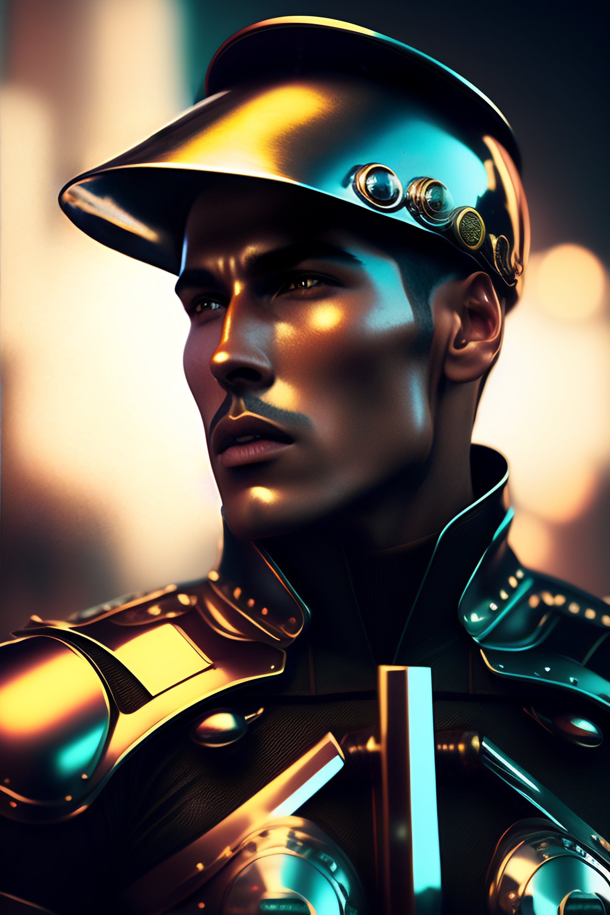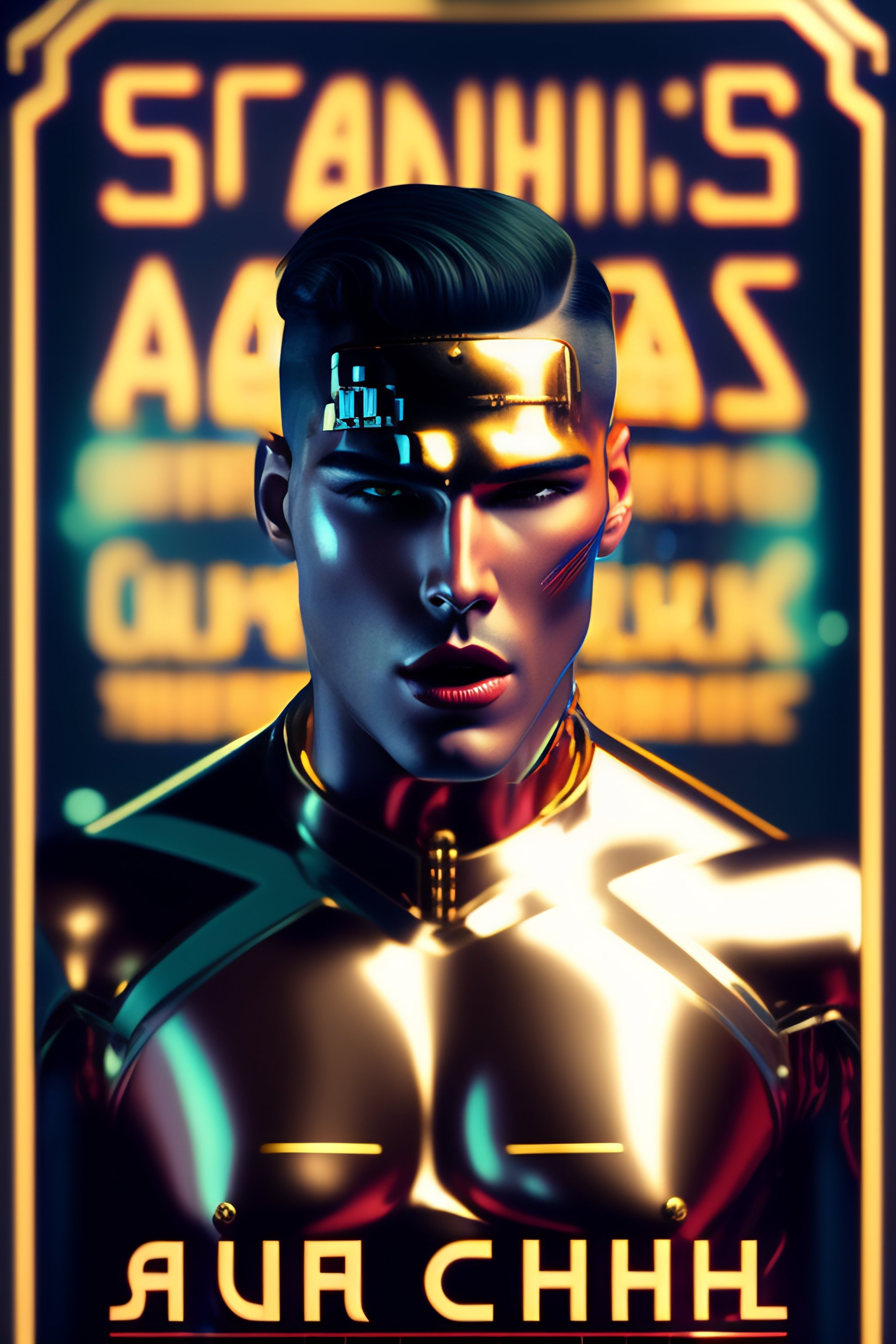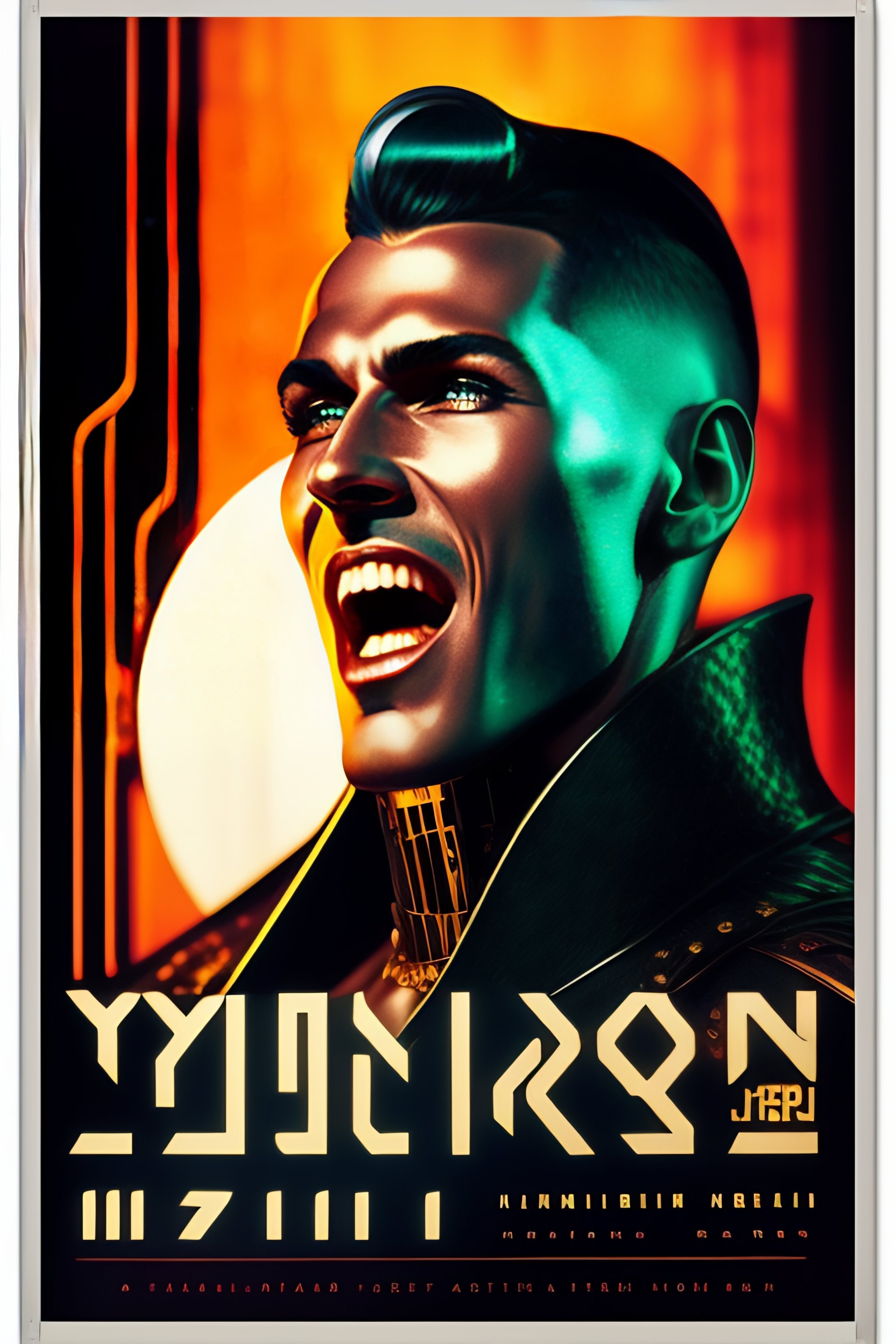 Fangs out of mouth, hyper realistic cyberpunk aesthetic, a bit robotic, vintage medium shot 1920's poster chrome and metallic color, 8k, figther man