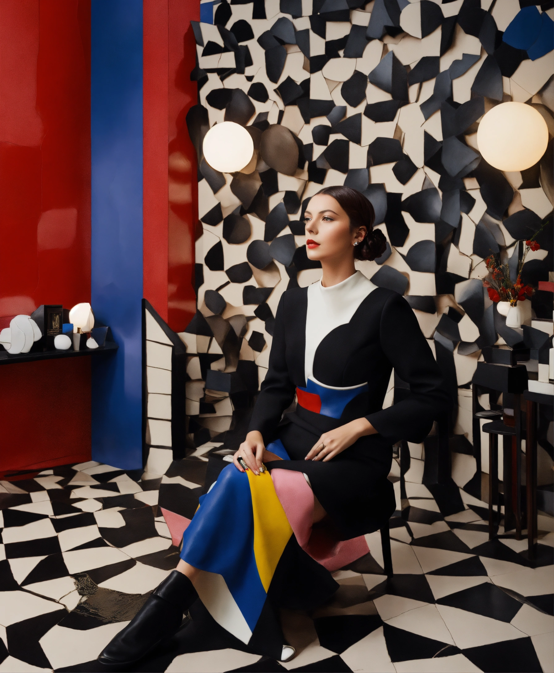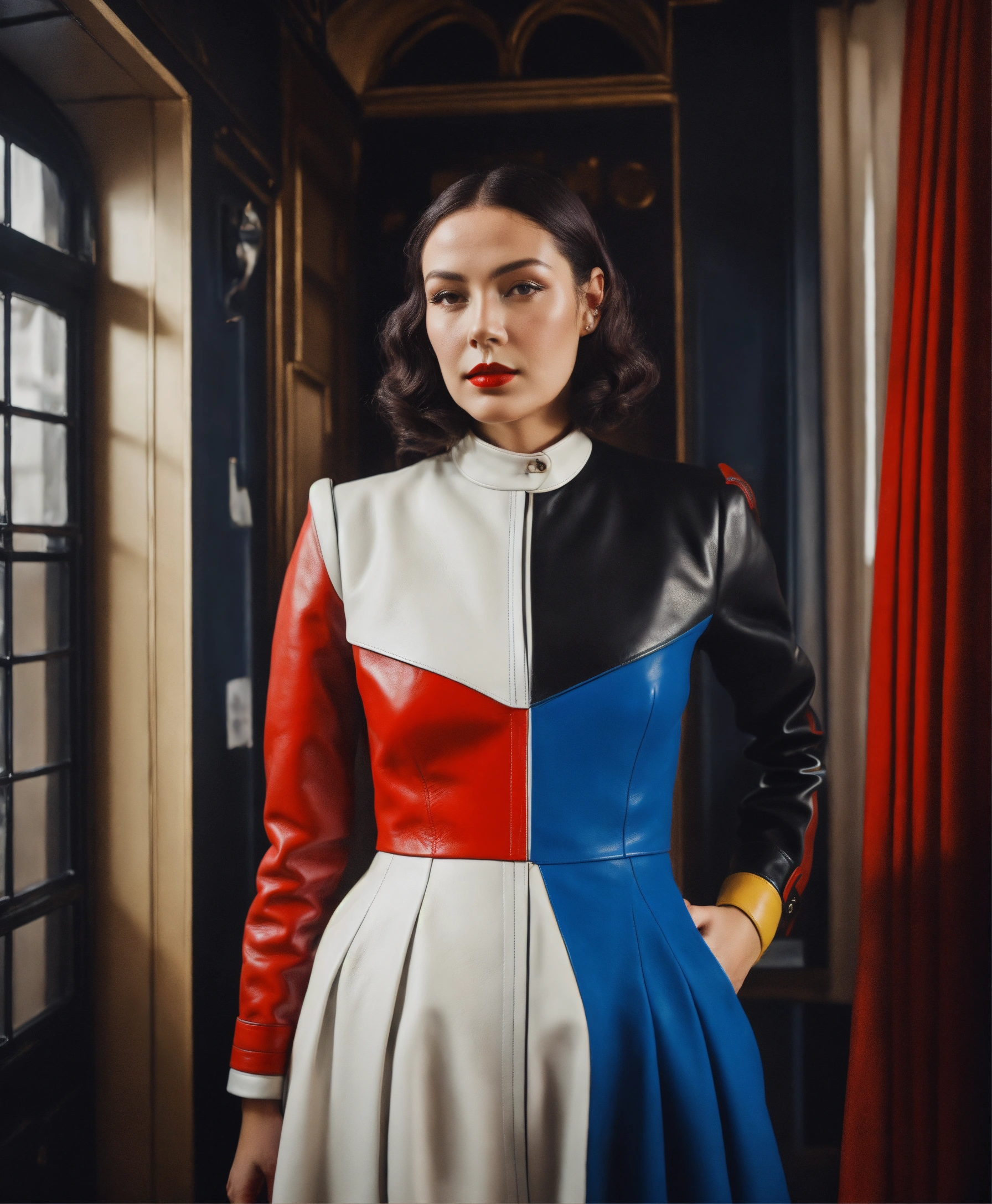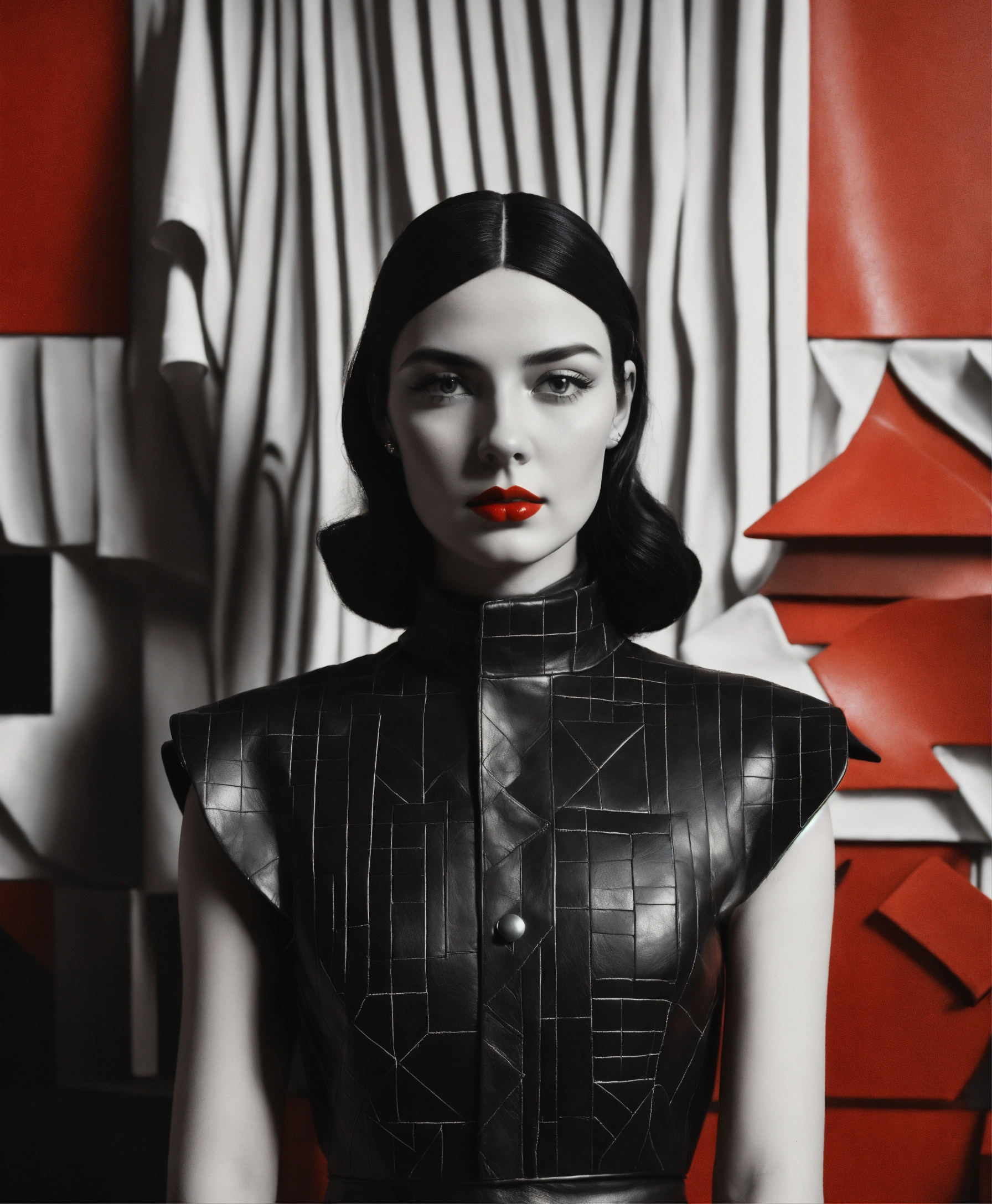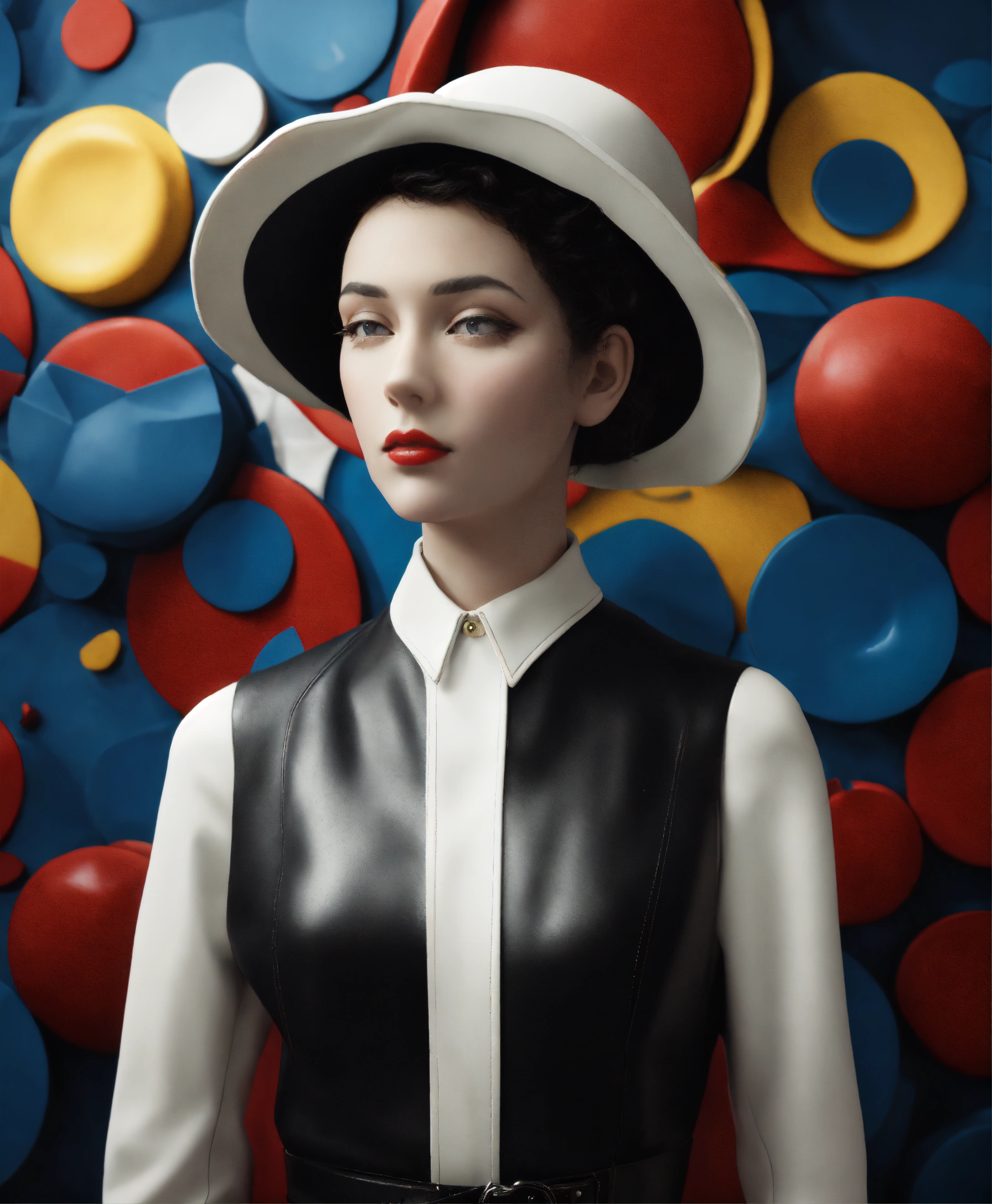 Black and white and primary colors, 3d clay cosmos, portrait artist leather clothes lady, immersive inspired experience, art deco land, rené magritte inspiration.