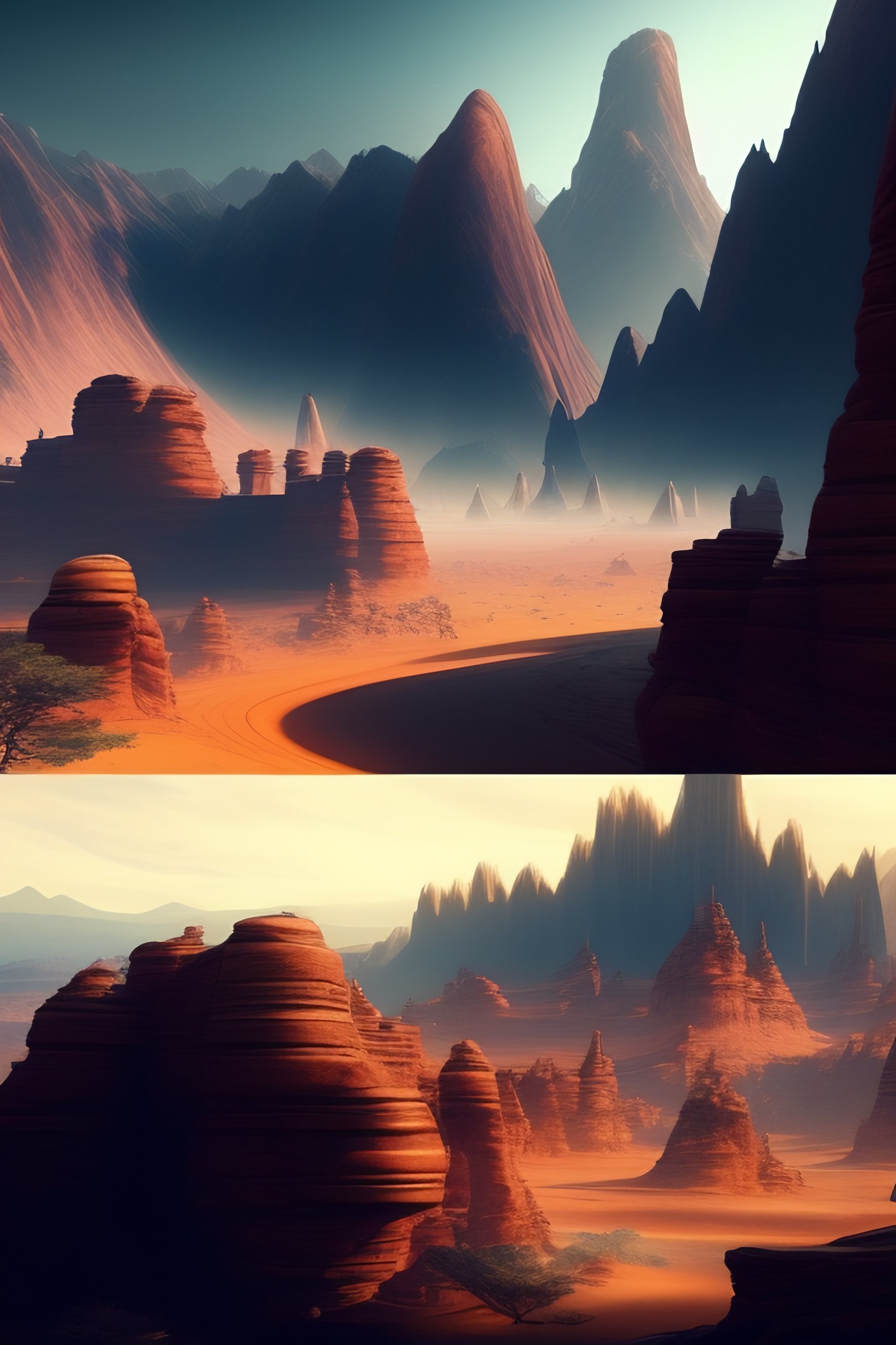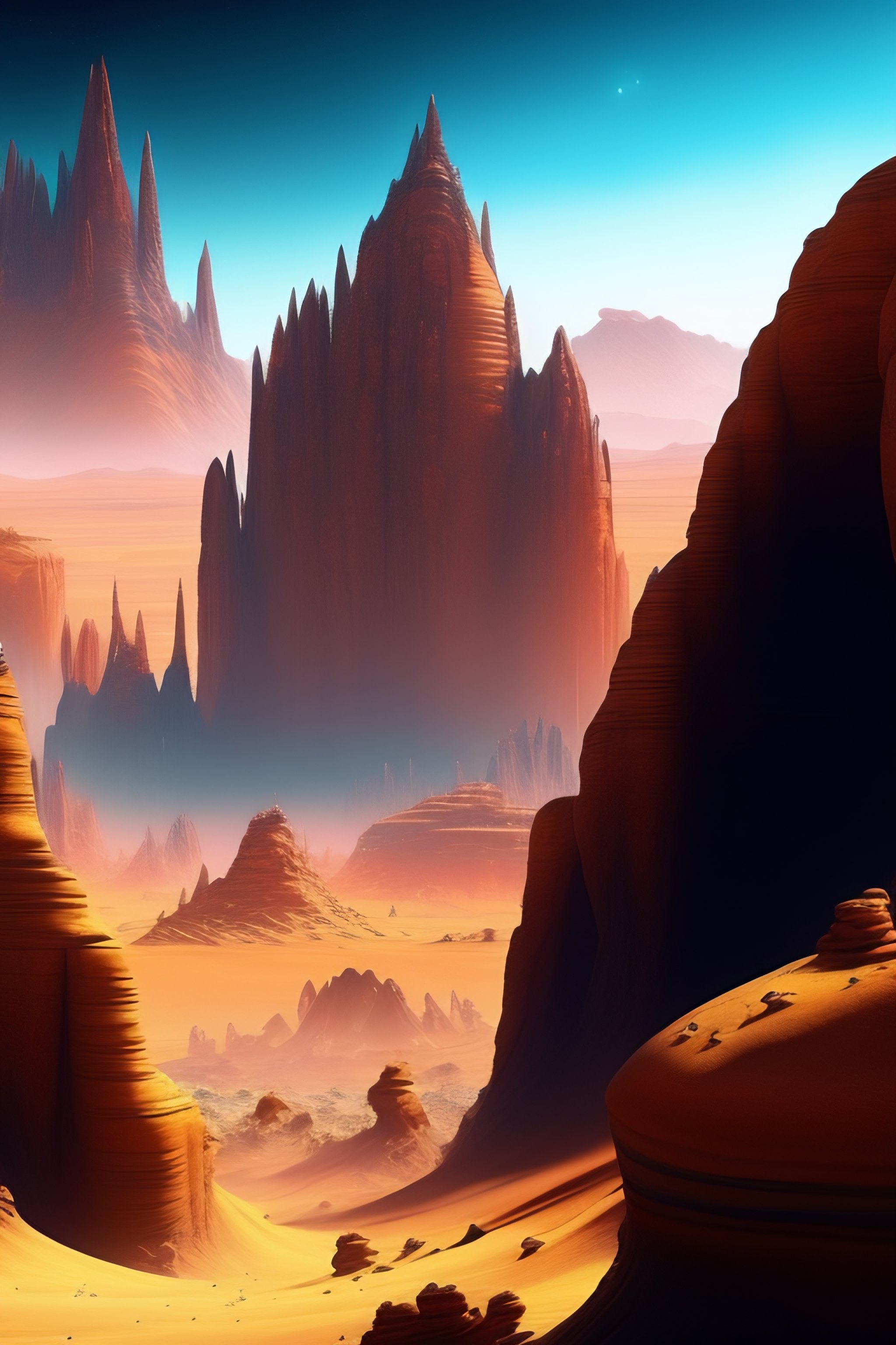 Incredible alien landscape, a dusty world on another planet, strange shaped mountains and rocks, in the style of marvel, highly detailed
