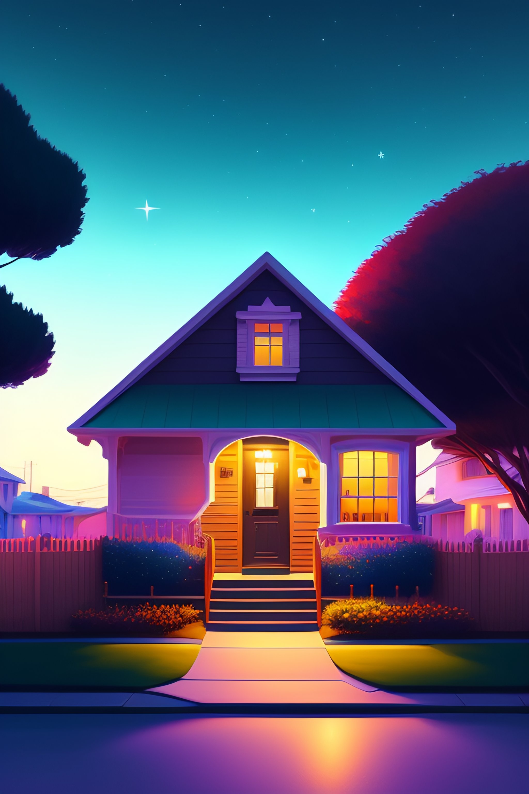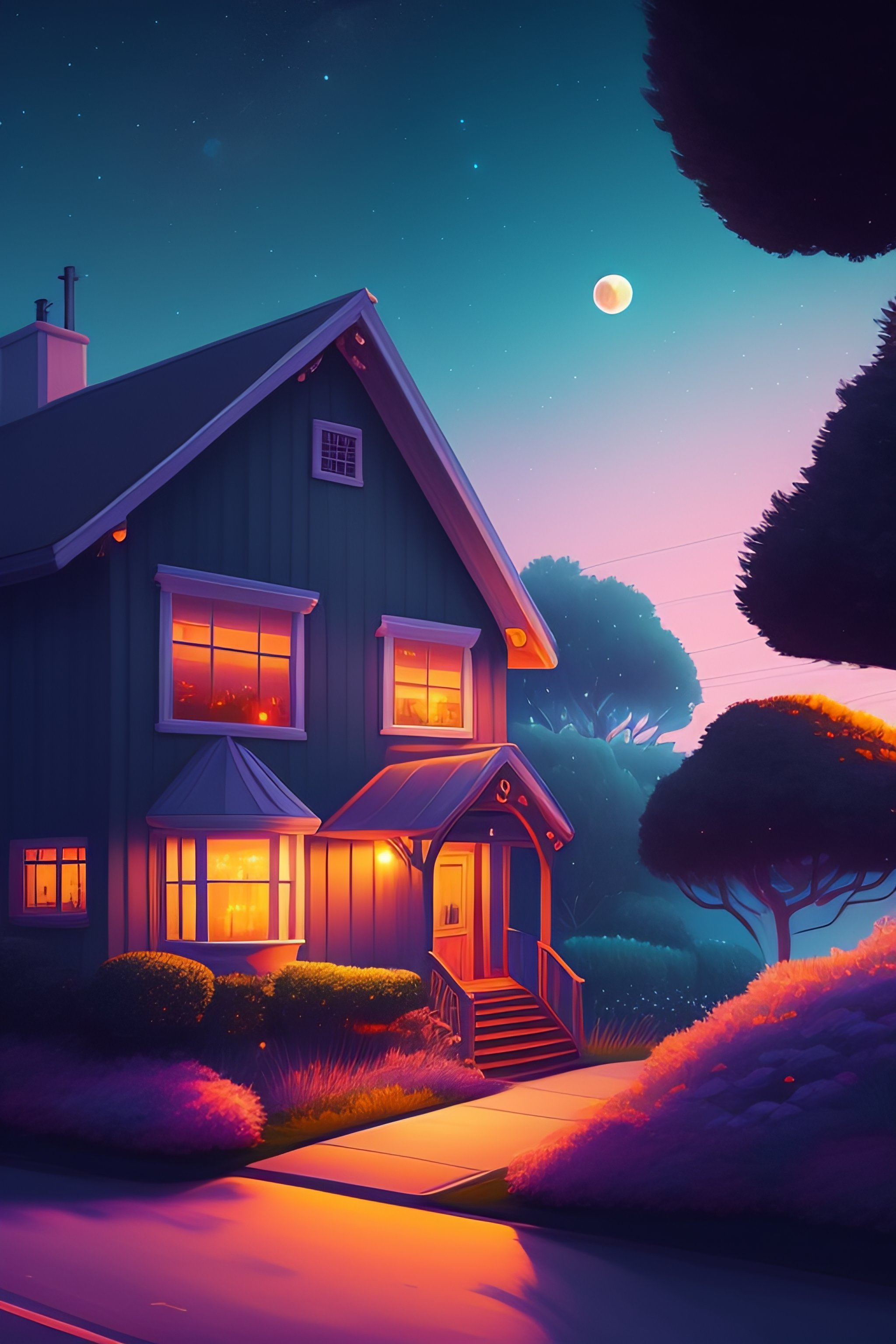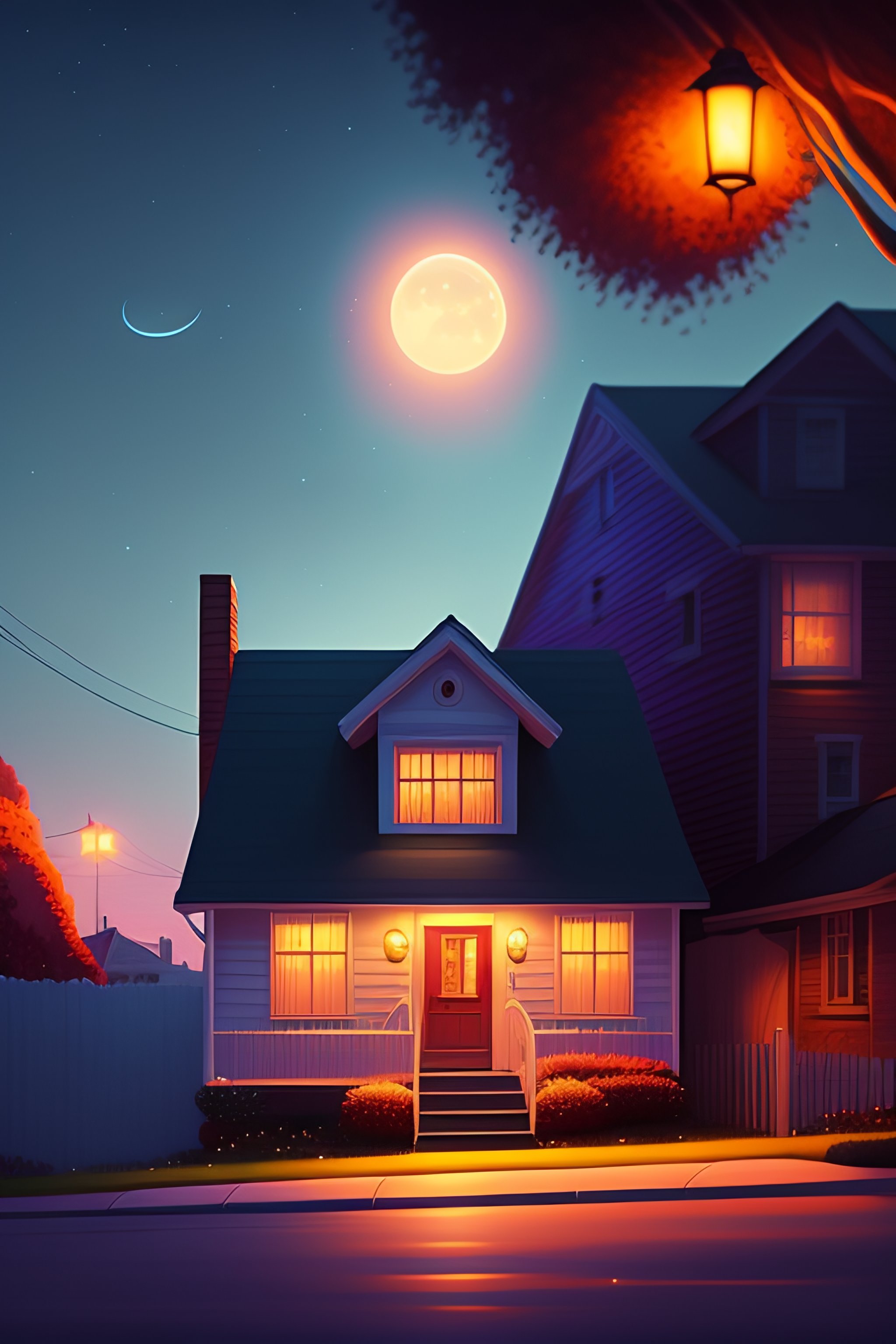 The small house on a street in san francisco, dark night, moon starry sky, gibli, james gilleard, atey ghailan, exquisite lighting, clear focus, very coherent, plain background, very detailed, vibrant, digital painting, cozy, bokeh blur
