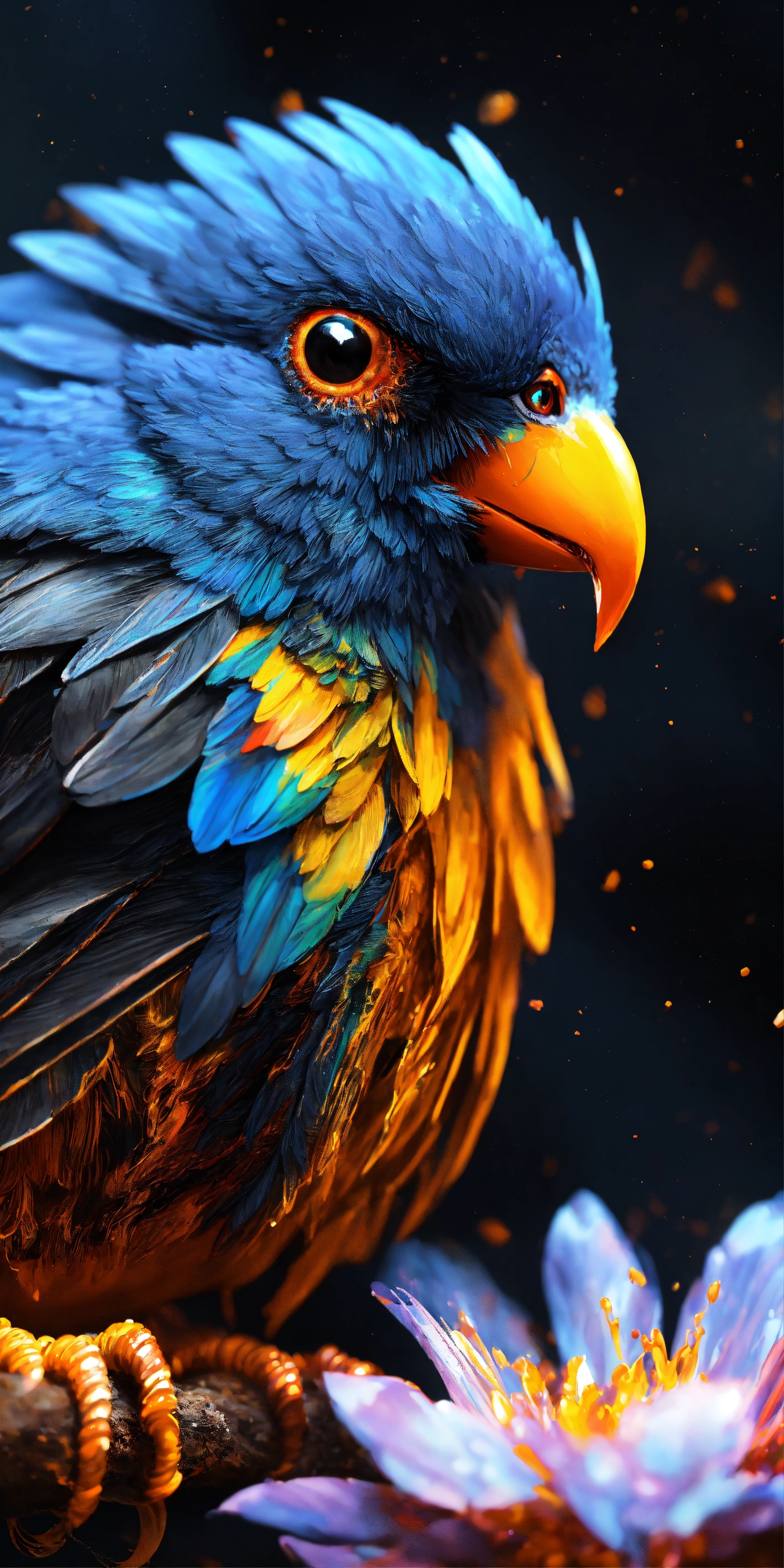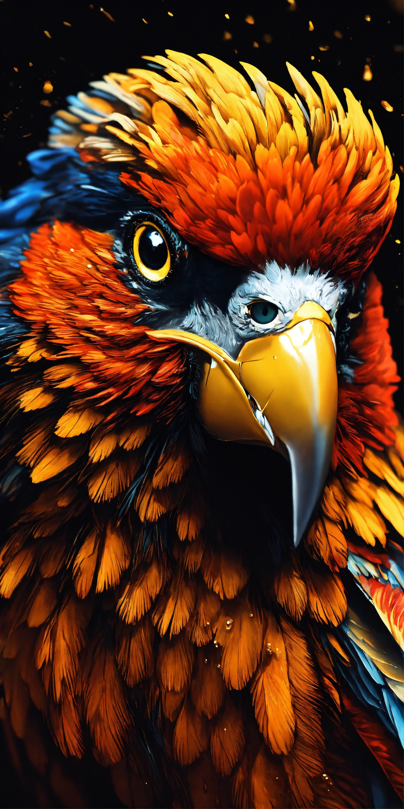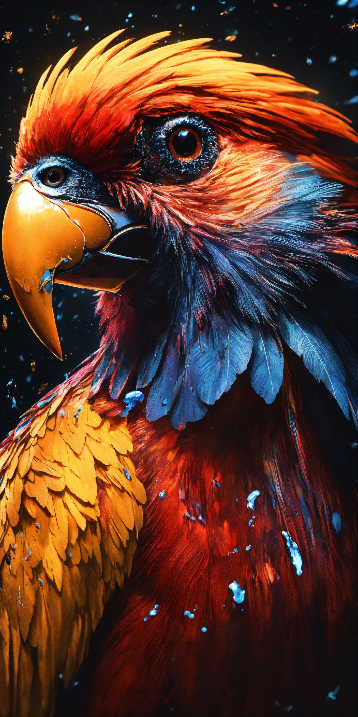 ((a bird)), hyperdetailed eyes, tee-shirt design, line art, black background, ultra detailed artistic, detailed gorgeous face, natural skin, water splash, colour splash art, fire and ice, splatter, black ink, liquid melting, dreamy, glowing, glamour, glimmer, shadows, oil on canvas, brush strokes, smooth, ultra high definition, 8k, unreal engine 5, ultra sharp focus, intricate artwork masterpiece, ominous, golden ratio, highly detailed, vibrant, production cinematic character render, ultra high quality model