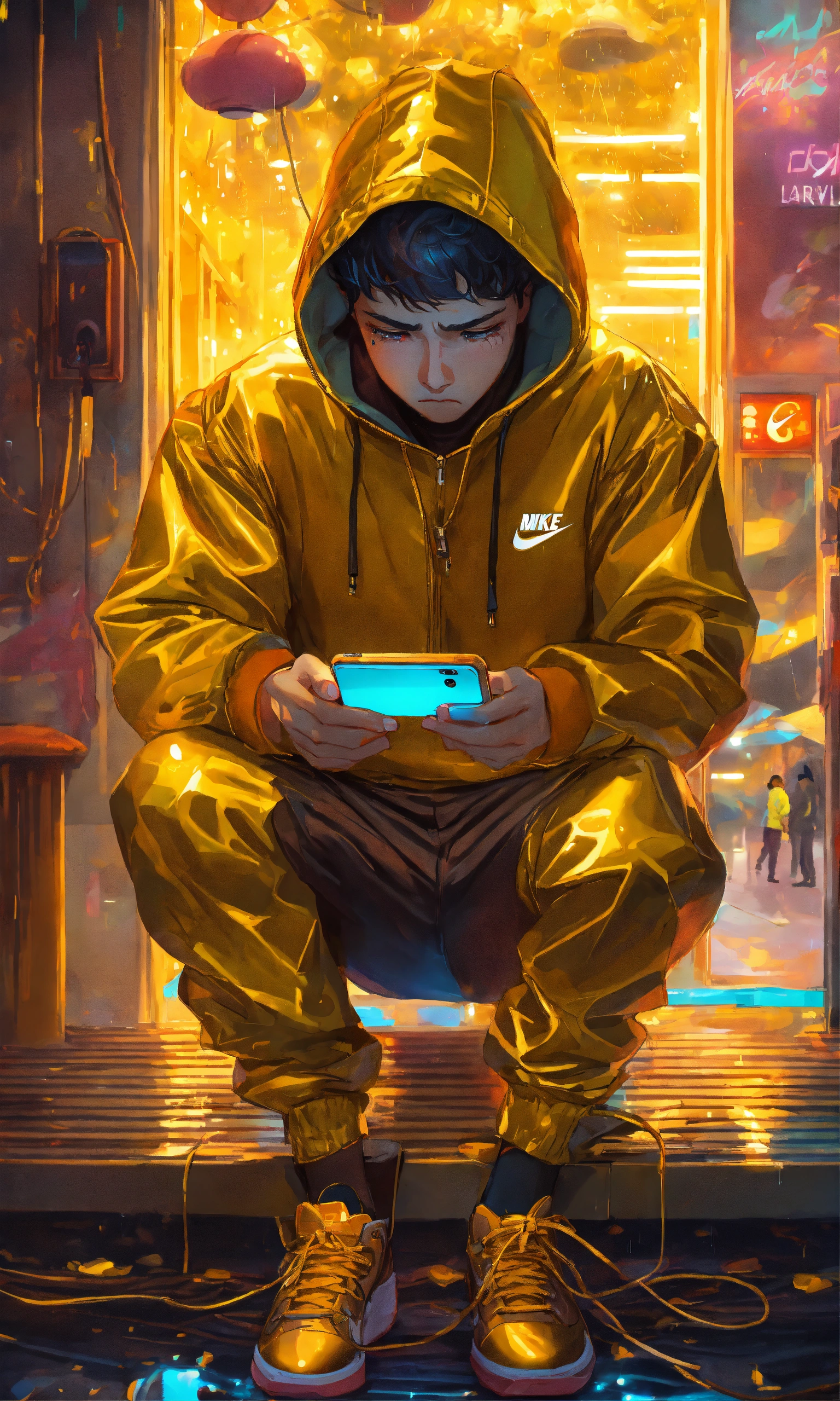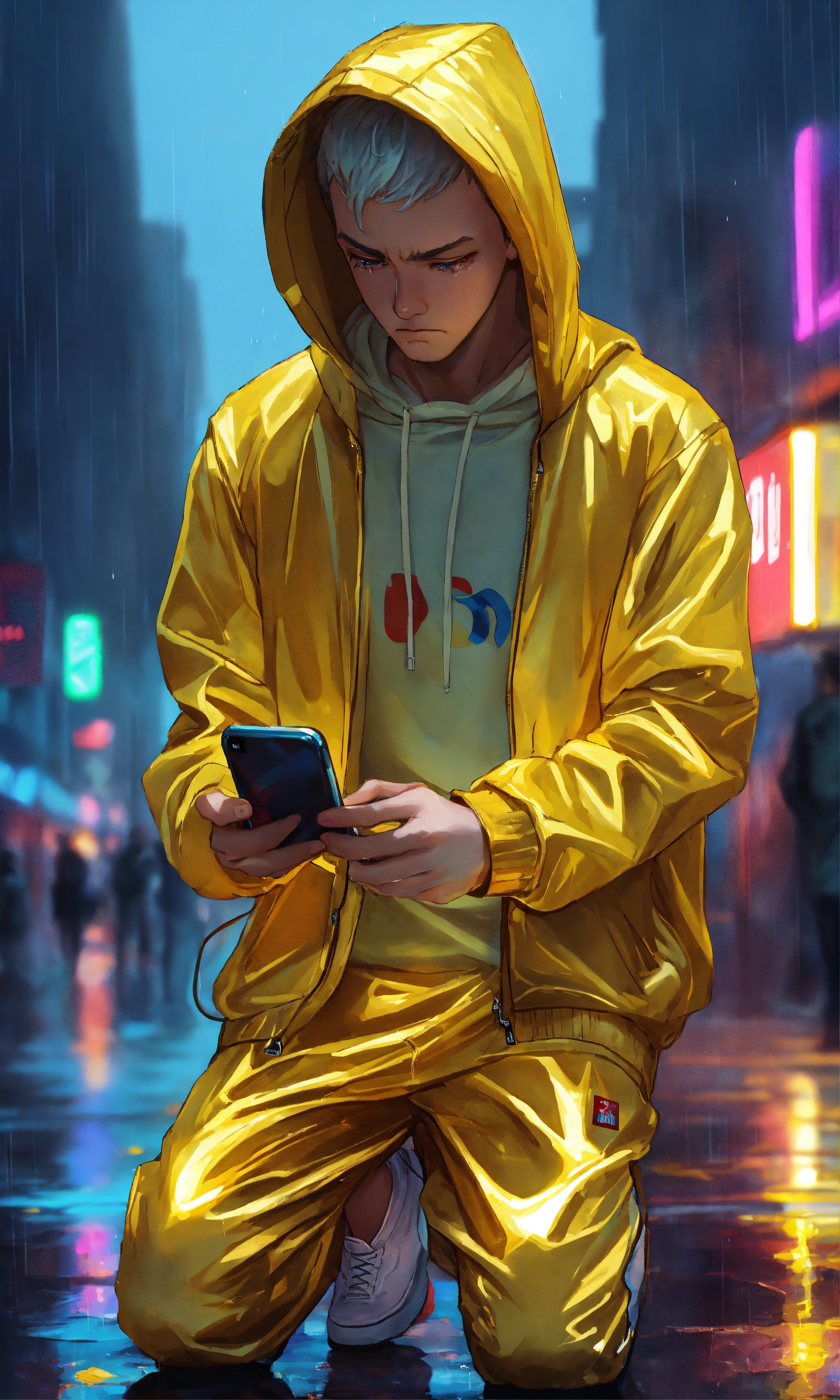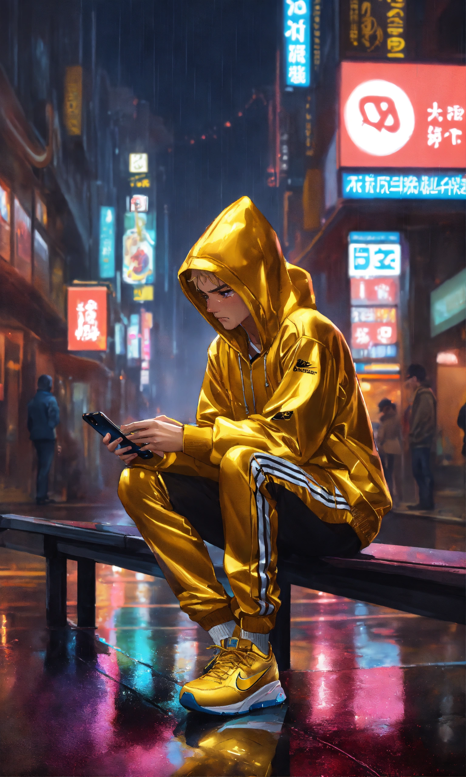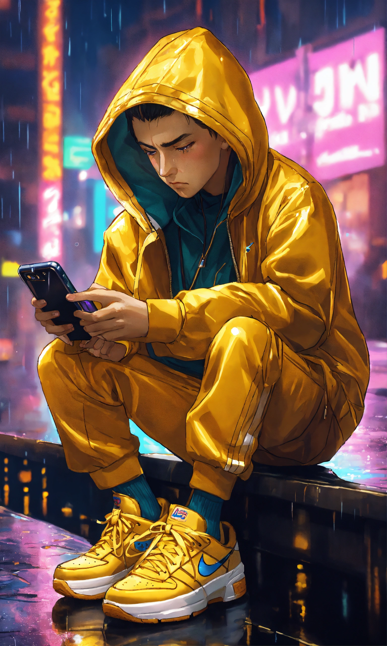 Jack hanma, wearing shiny golden hoodie jacket, looking down at smartphone, sad look on face, tear running down cheek, nike basketball shoes, trending on artstation, neon lights, rainy night, stunning full body anime art by mark ryden