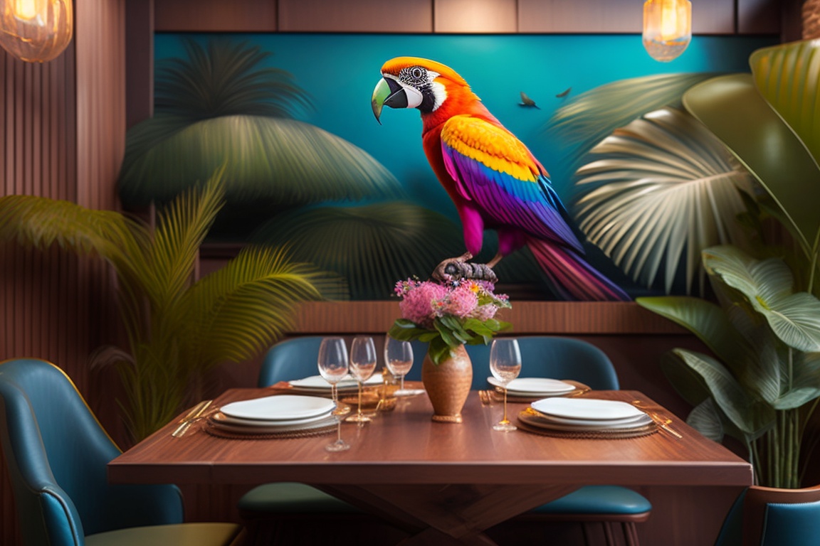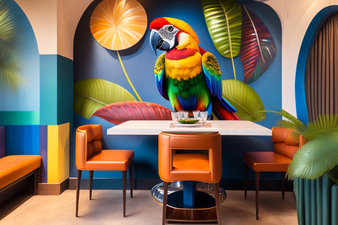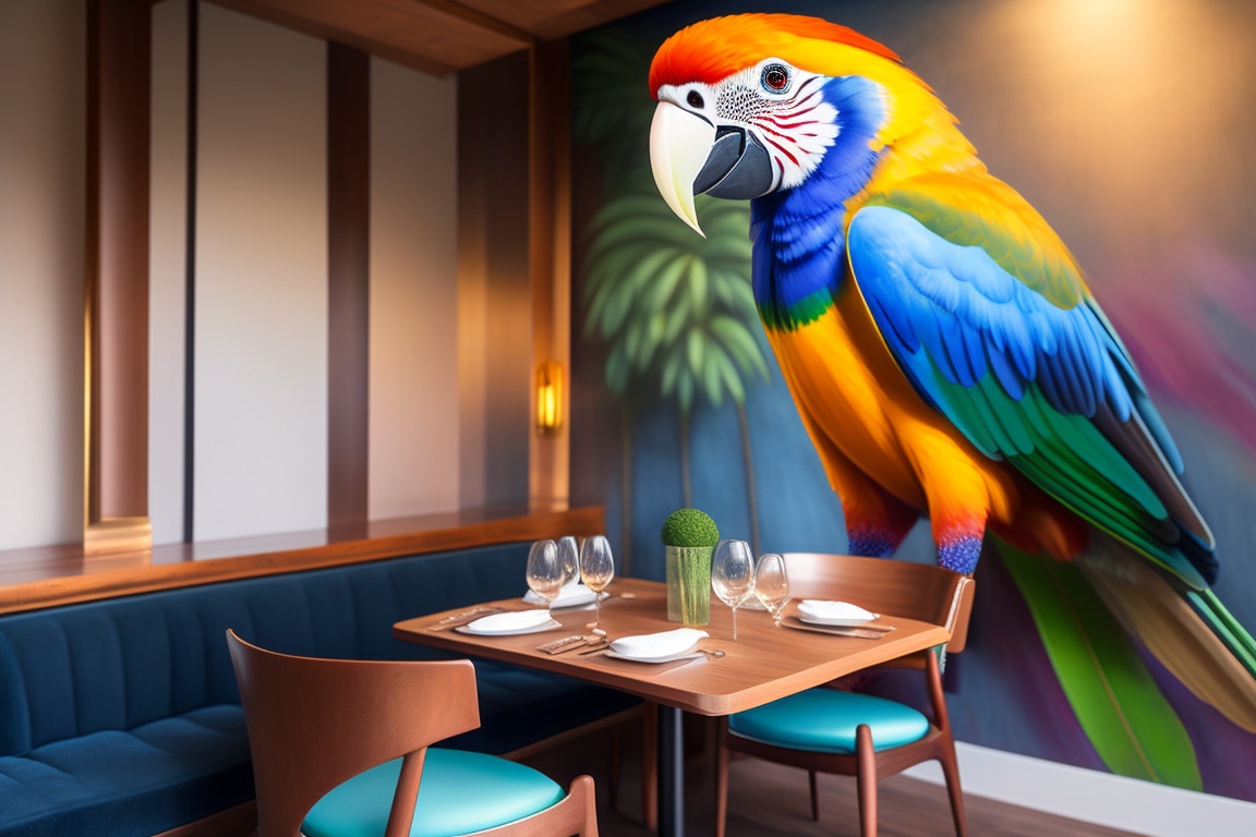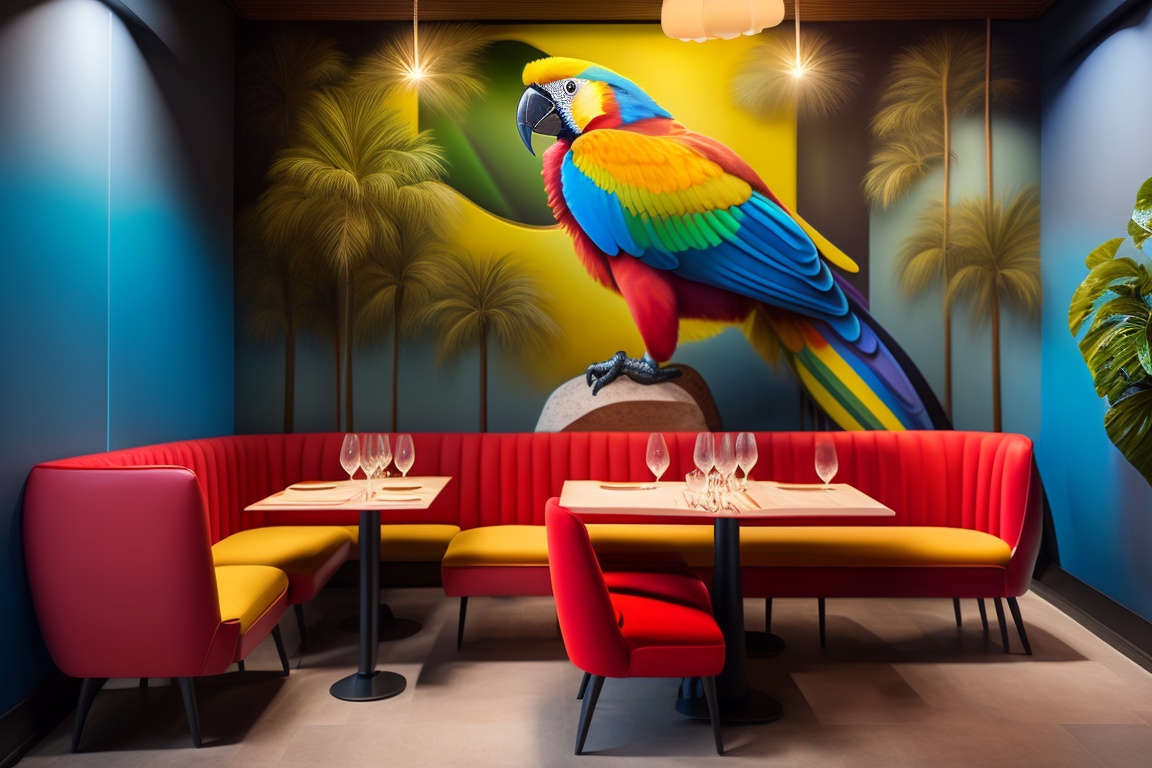 Inside stories bangalore restaurant, a mural of a macaw covers an entire wall, depicted with a fusion of realistic and abstract elements, the artwork brings a touch of tropical paradise to the dining area, artwork, painted with acrylics and mixed media techniques