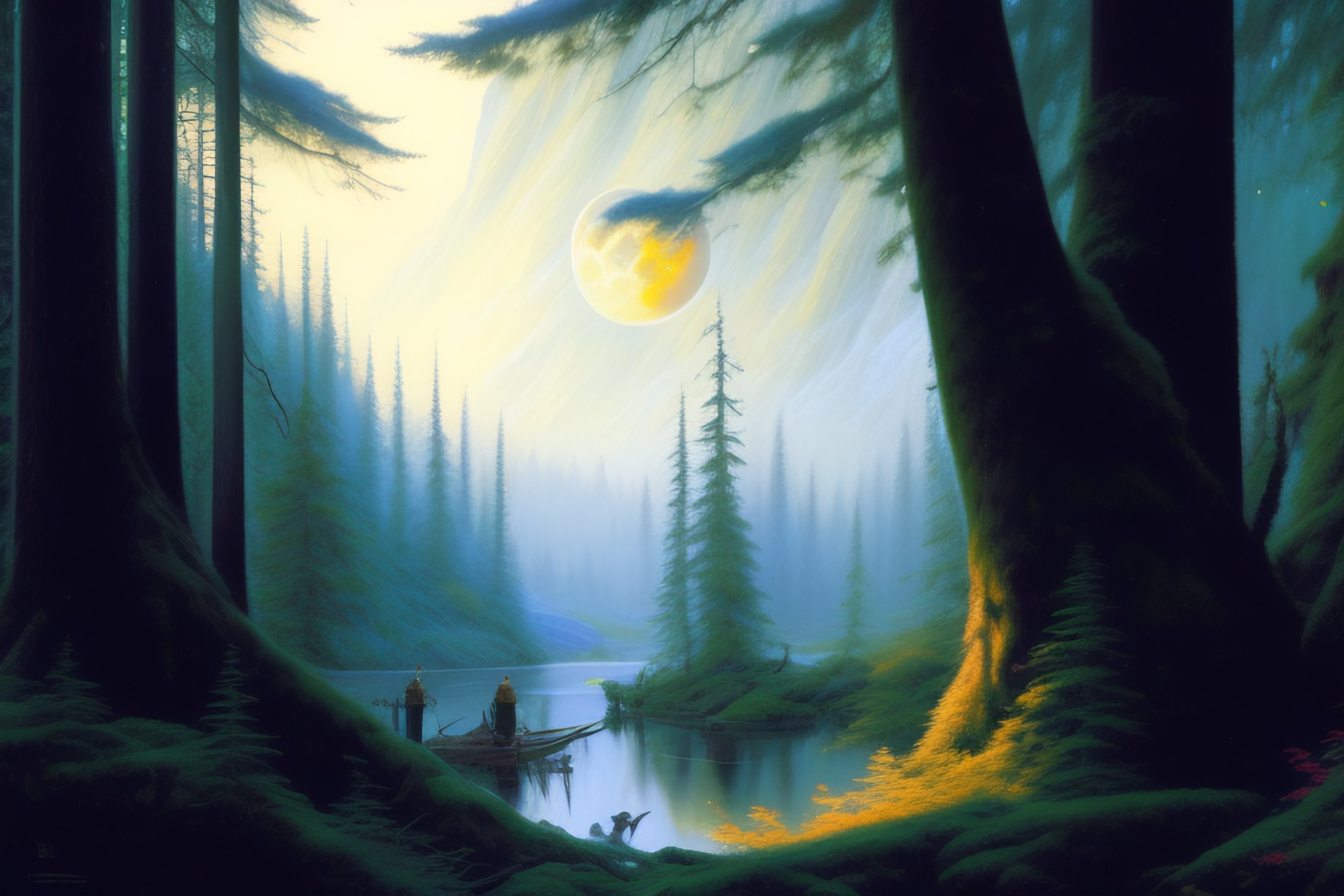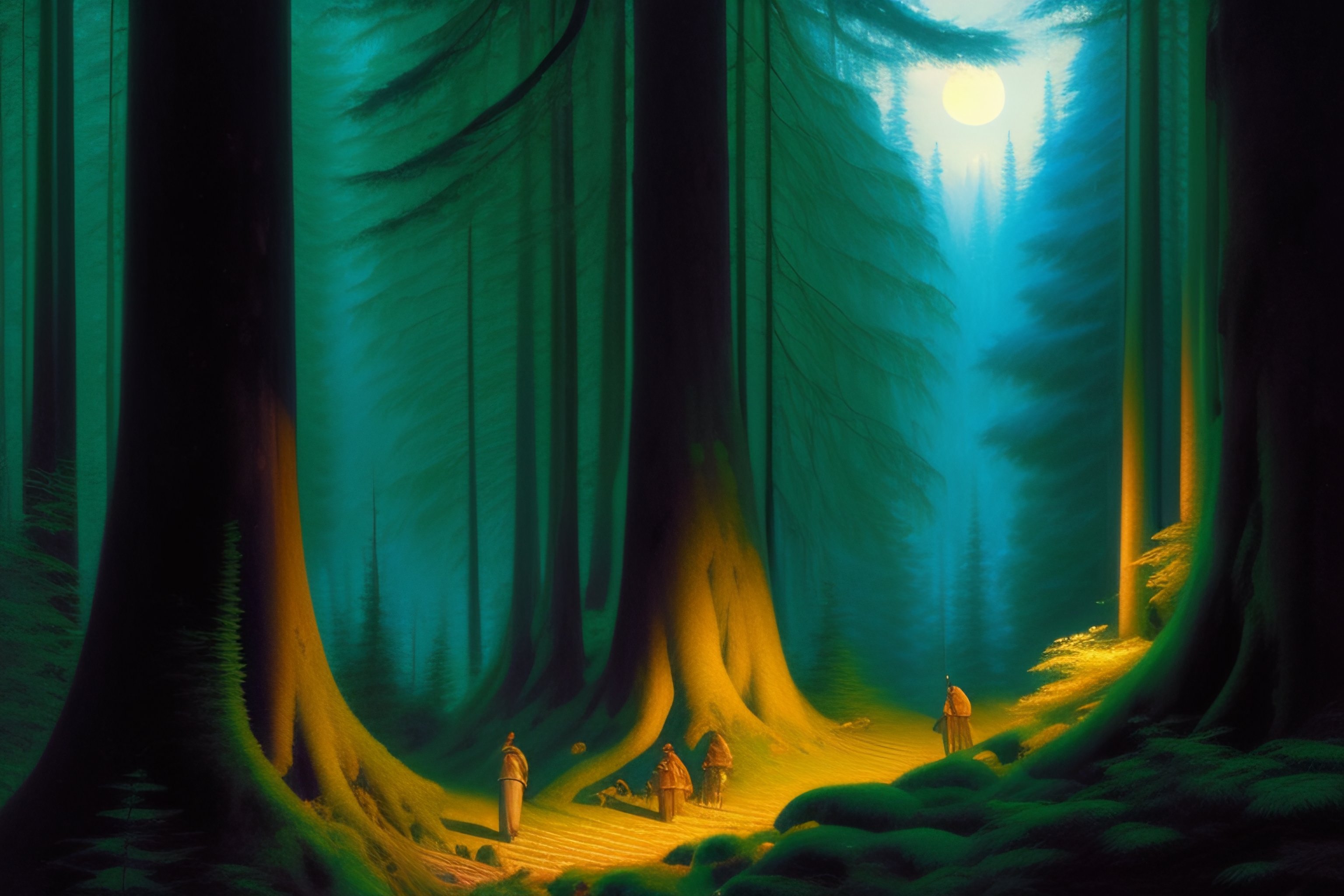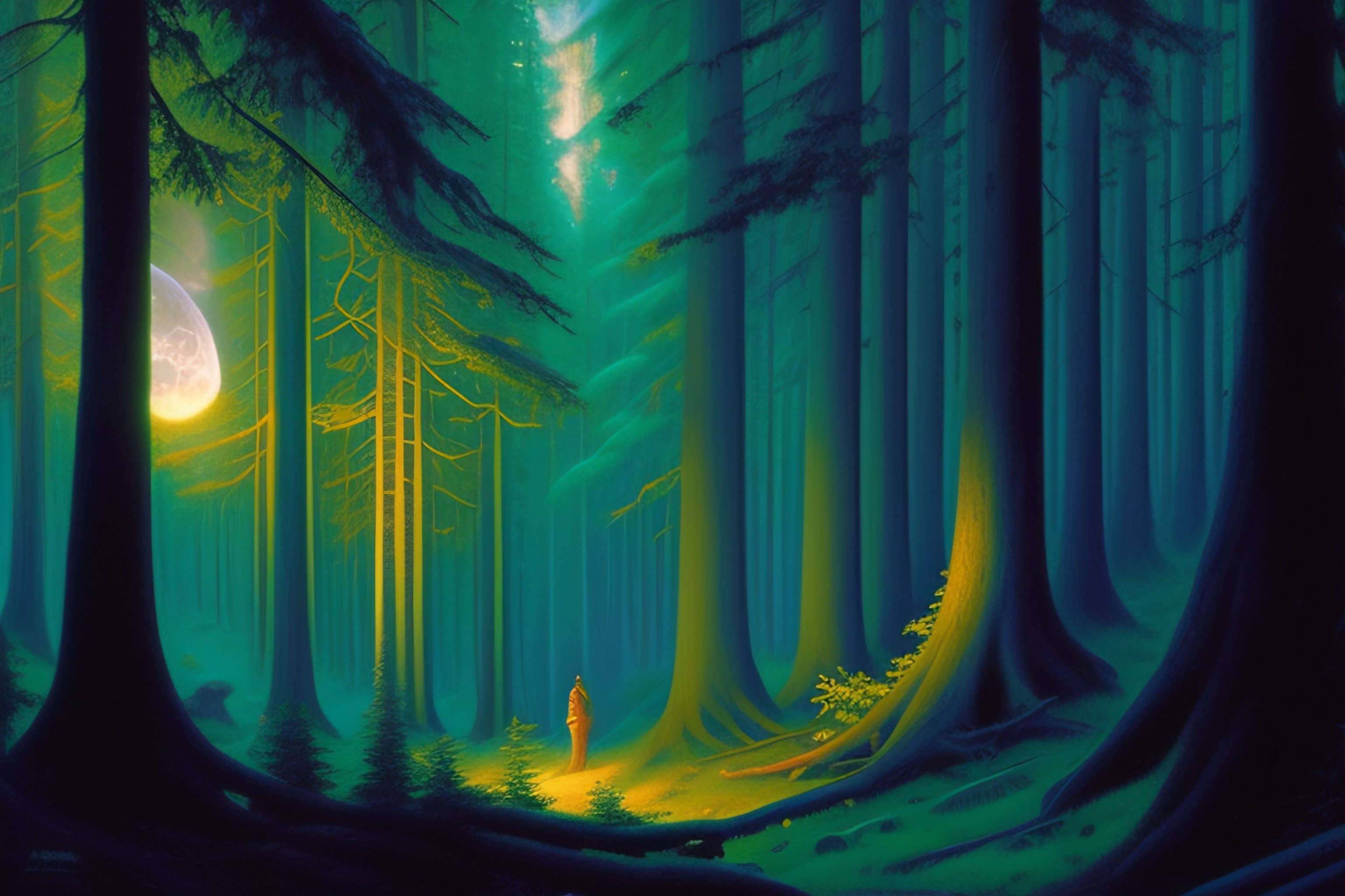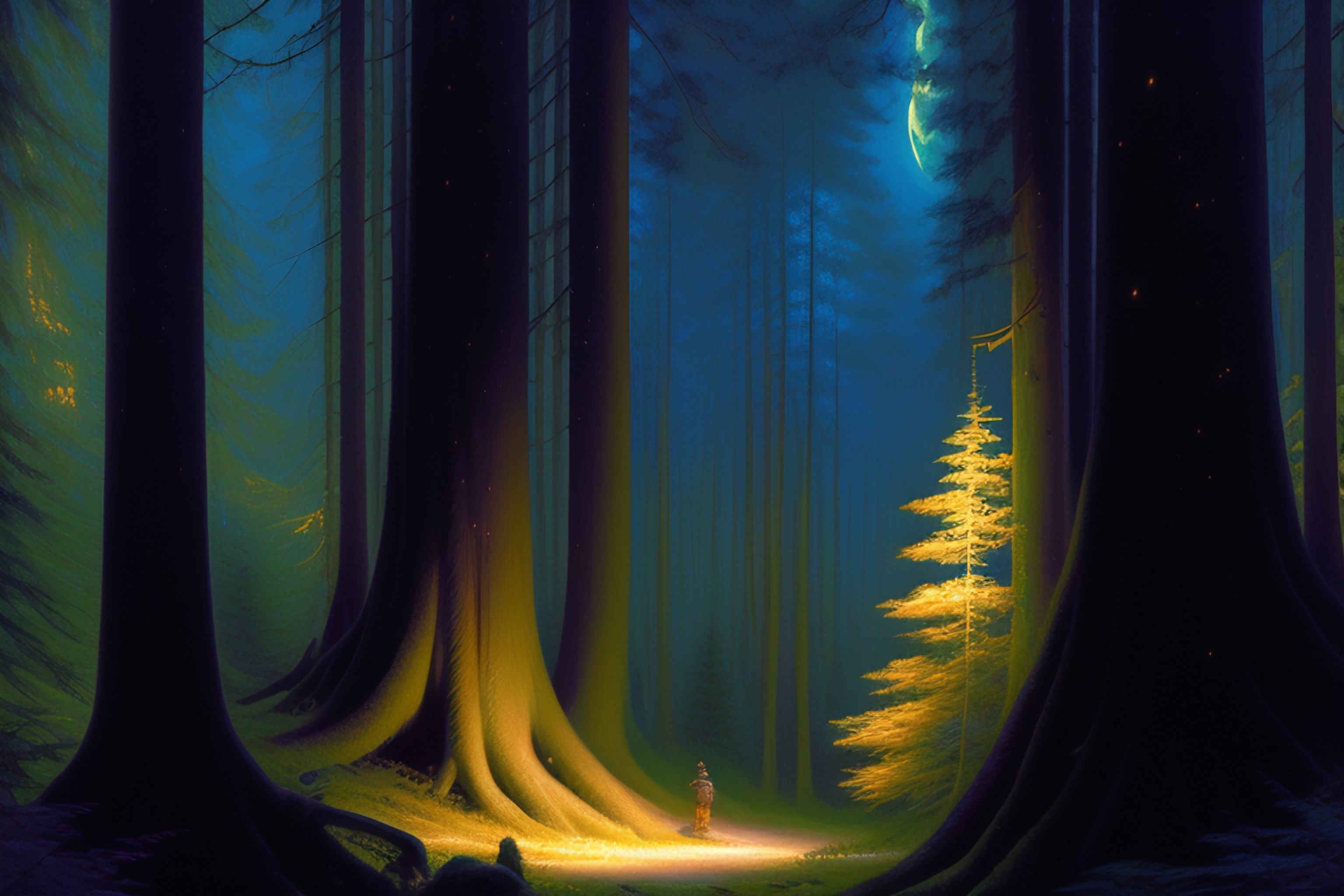 A very dense forest, big trees, ((lots of big trees))++, near trees, dnd art, fantasy, fear atmosphere, dark, moon light, highly detailed, art by donato giancola and bayard wu, digital art, trending on artstation, 4k