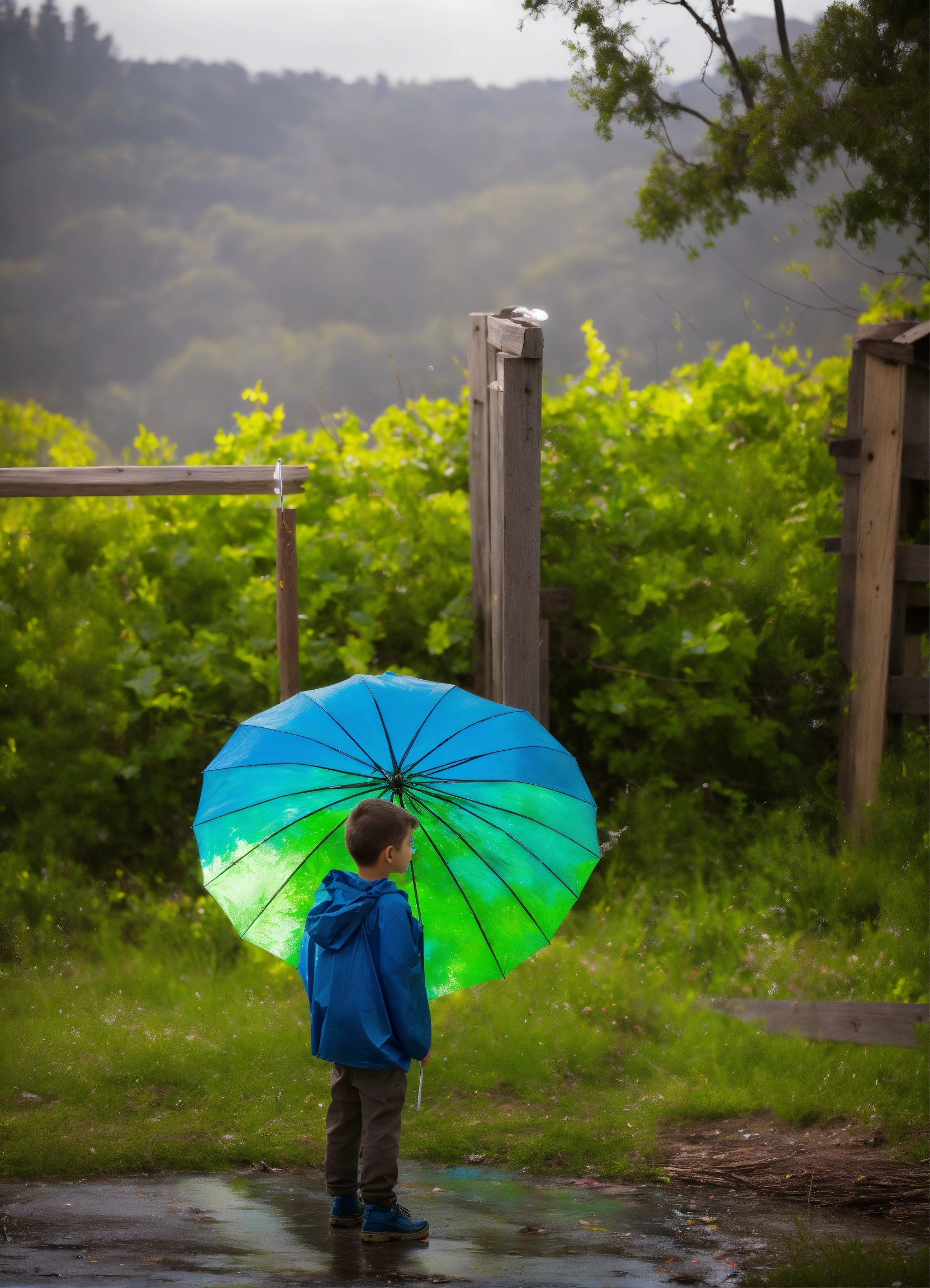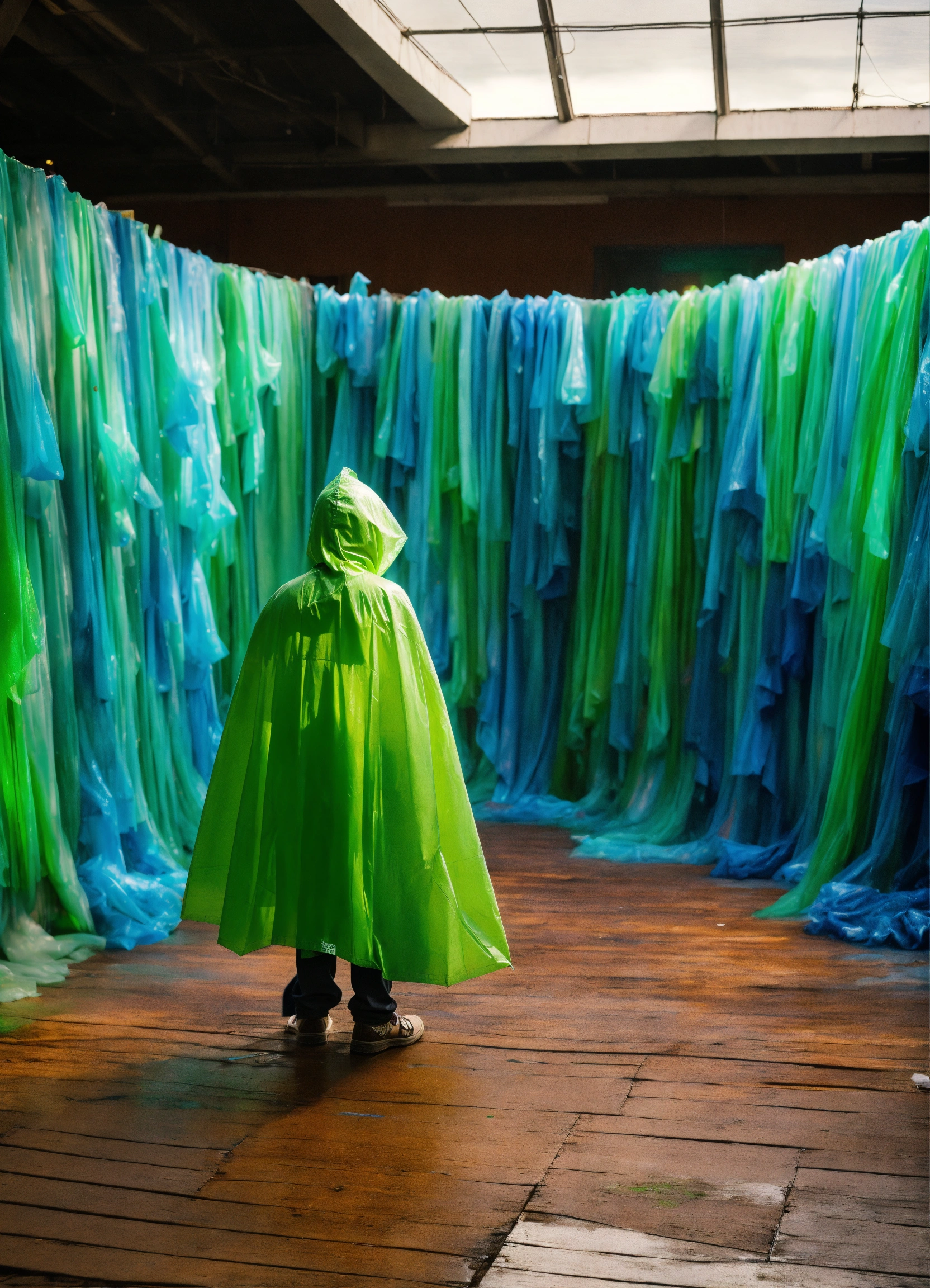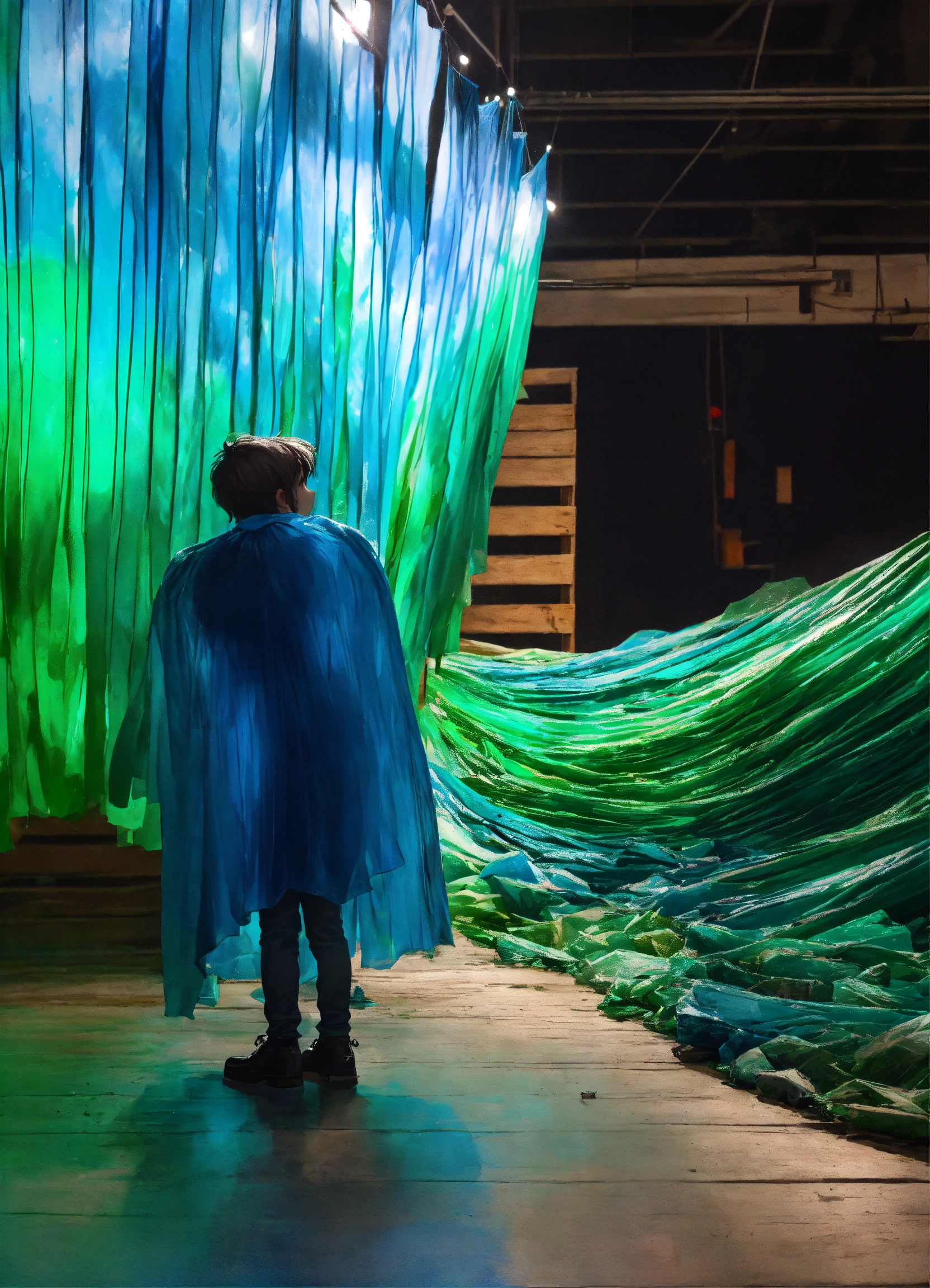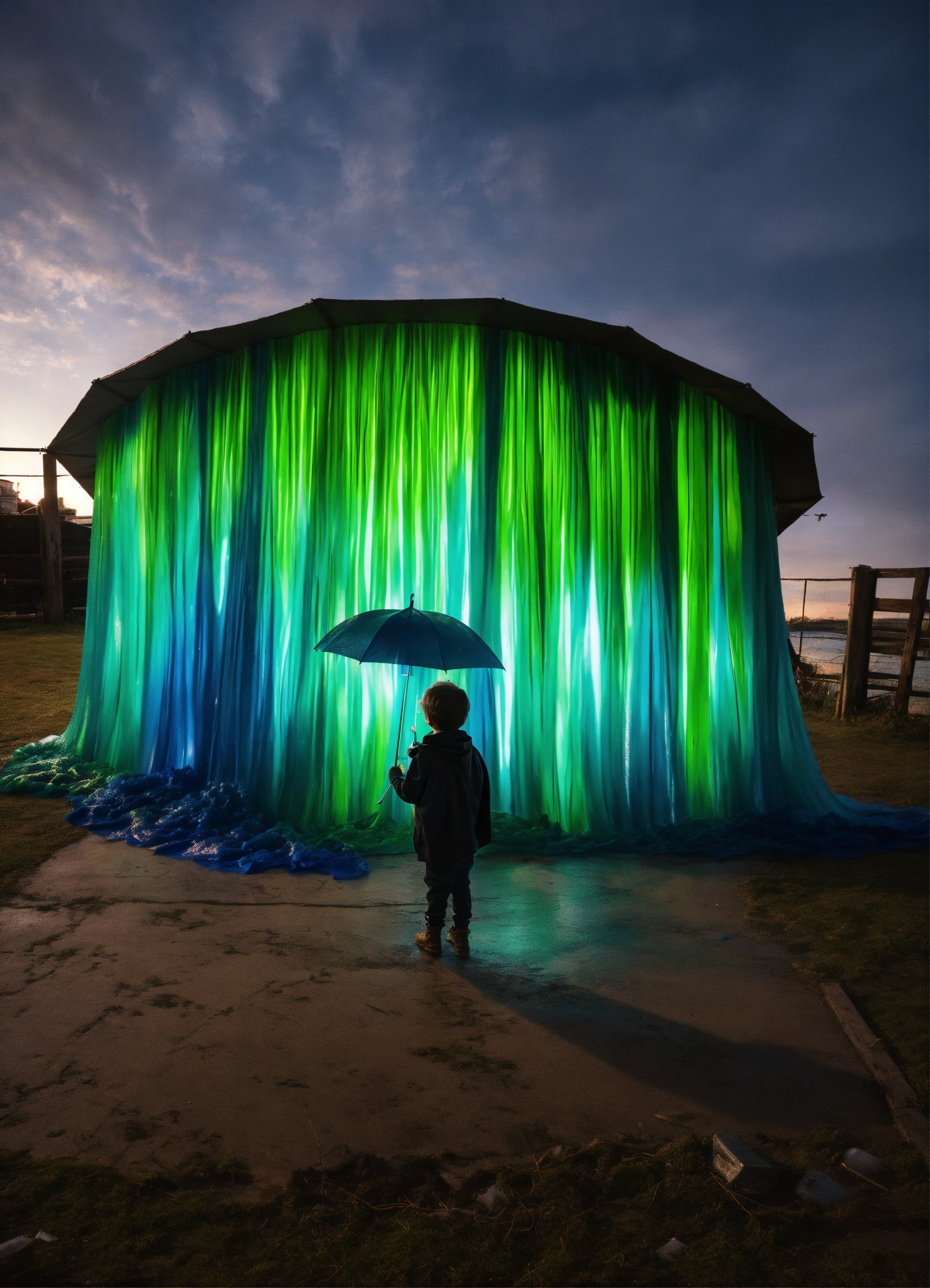 Art installation, massive wave, dyed blue and green fused plastic bags, old fence board wood, pollution, dramatic lights, kid in a cape, holding umbrella