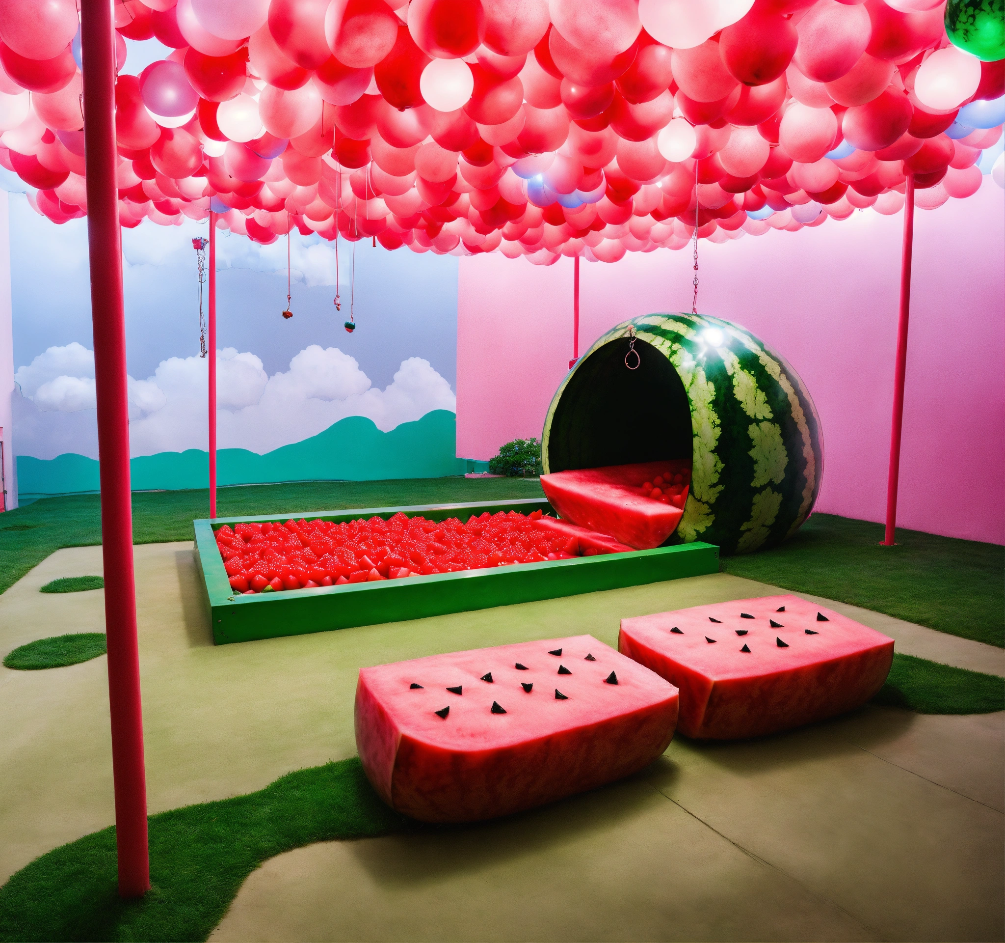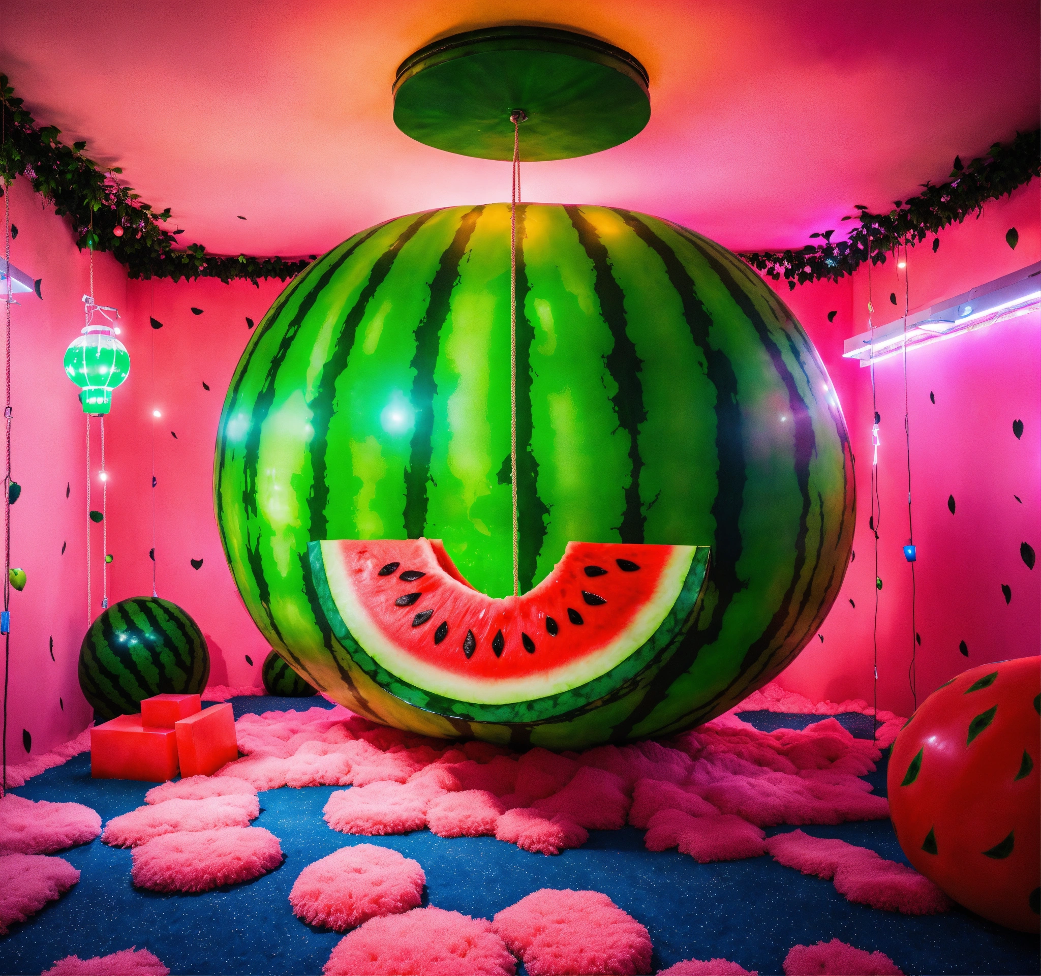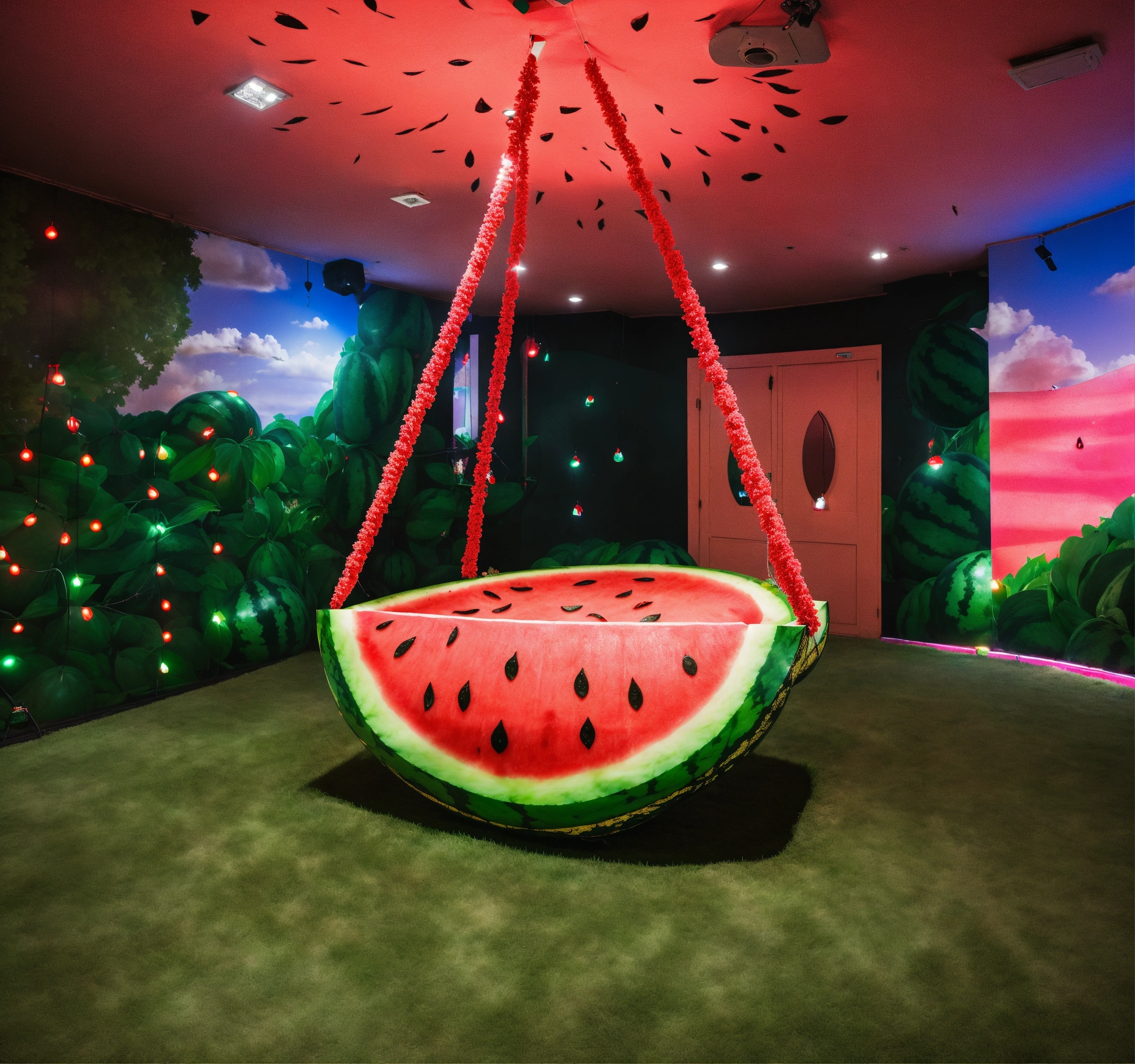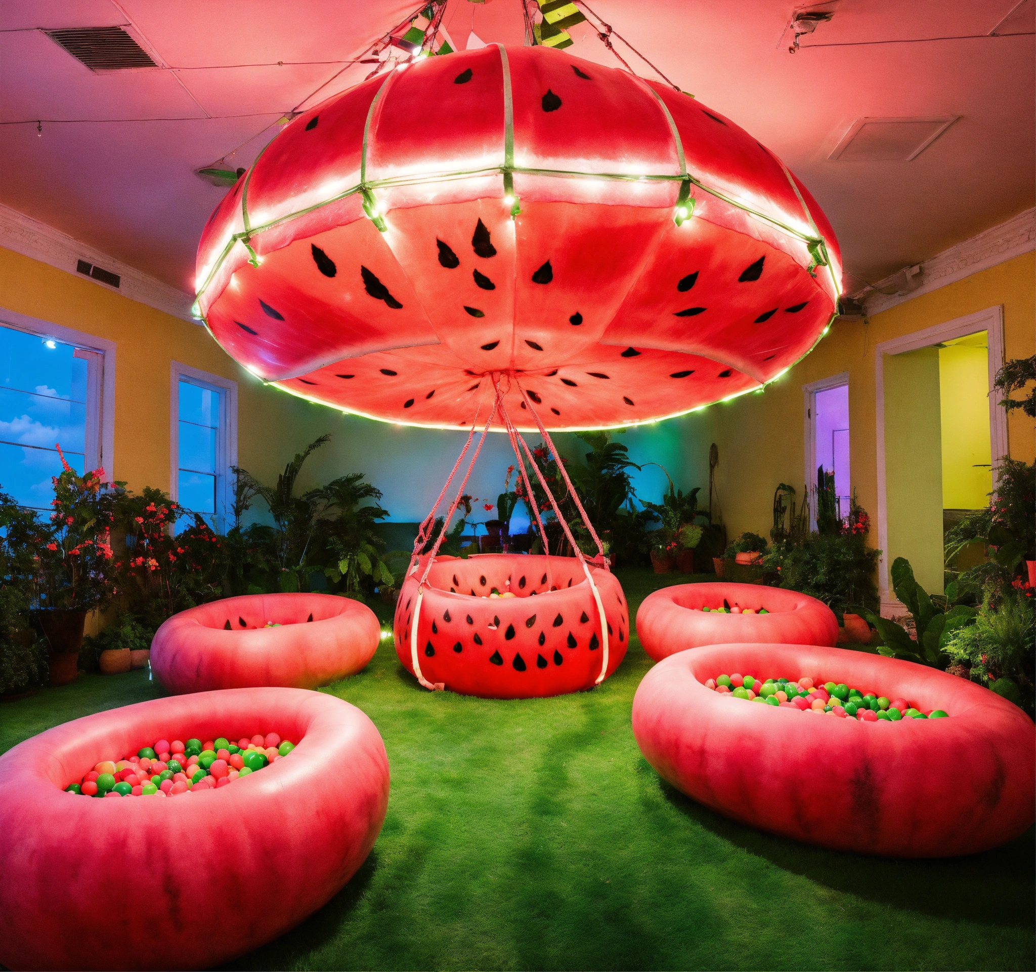 Watermelon room with giant watermelon swing over grass, led lights and clouds and a watermelon ball pit