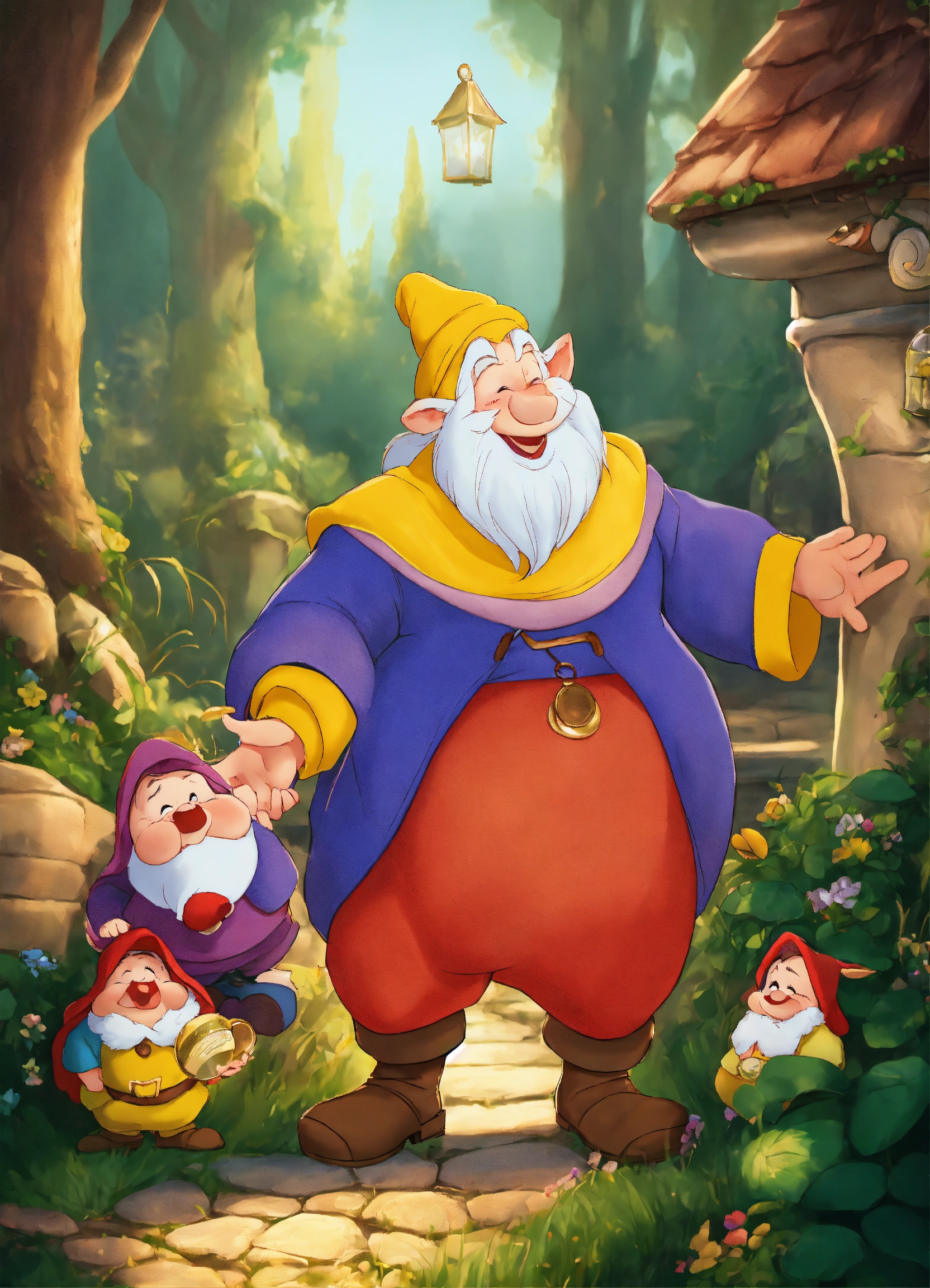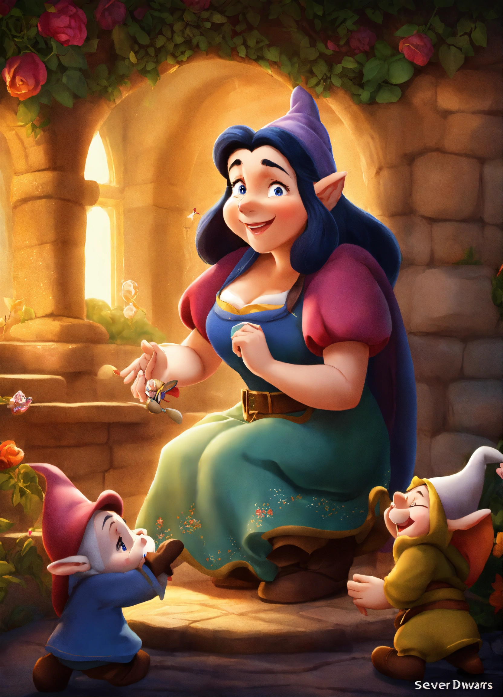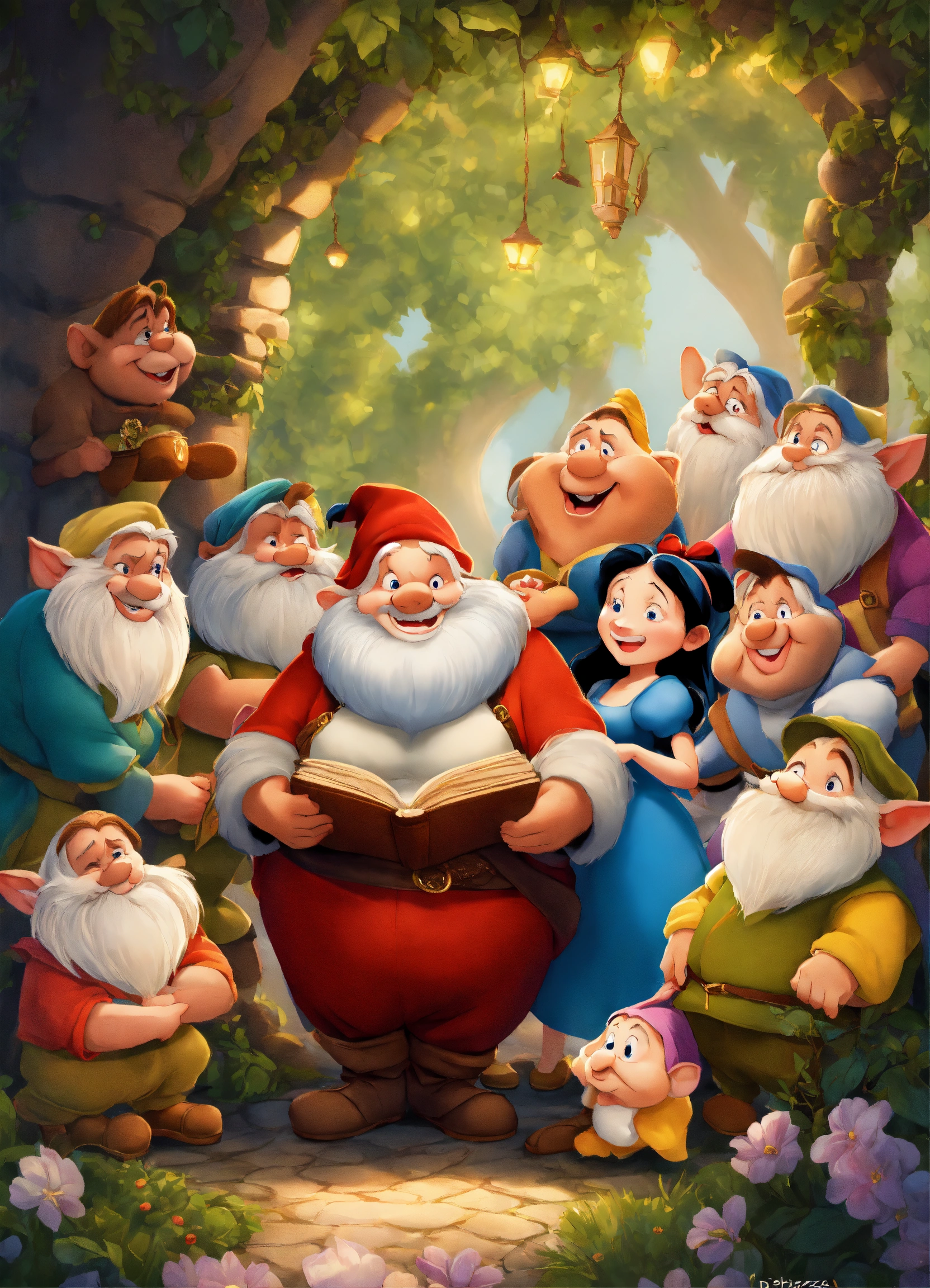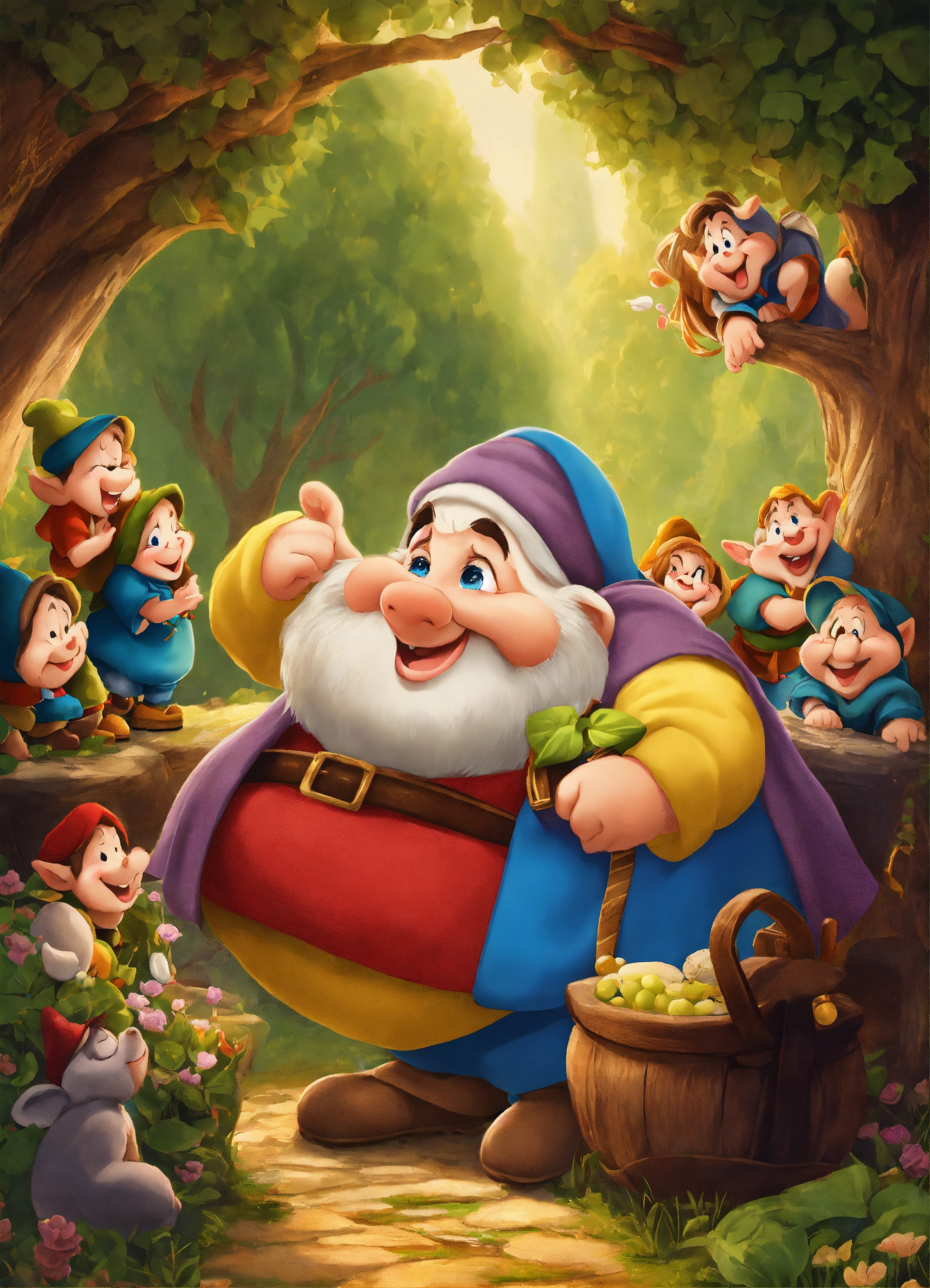 They welcomed her with open arms and allowed her to stay, enchanted by her kindness and beauty.seven dwarfs doc, grumpy, happy, sleepy, bashful, sneezy, and dopey
