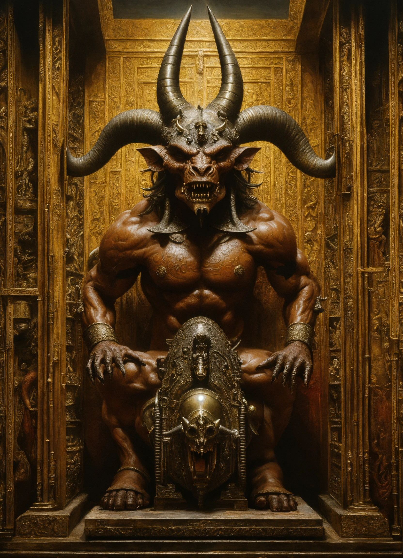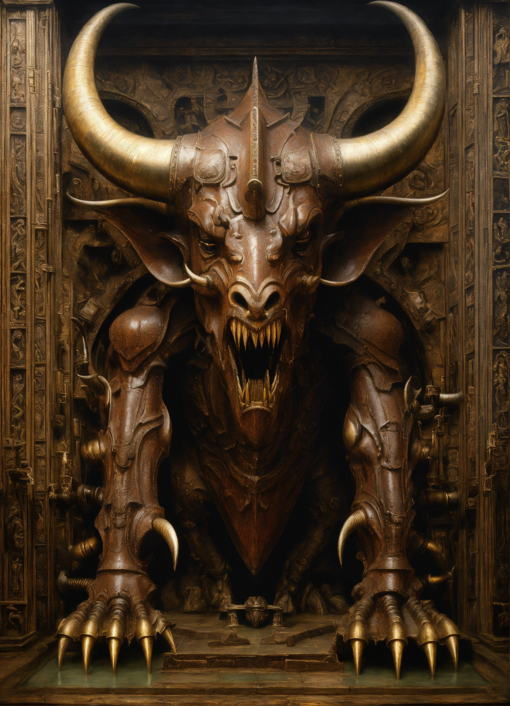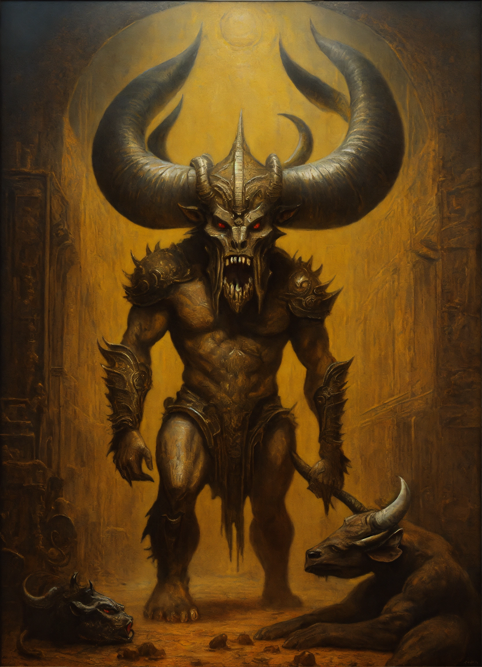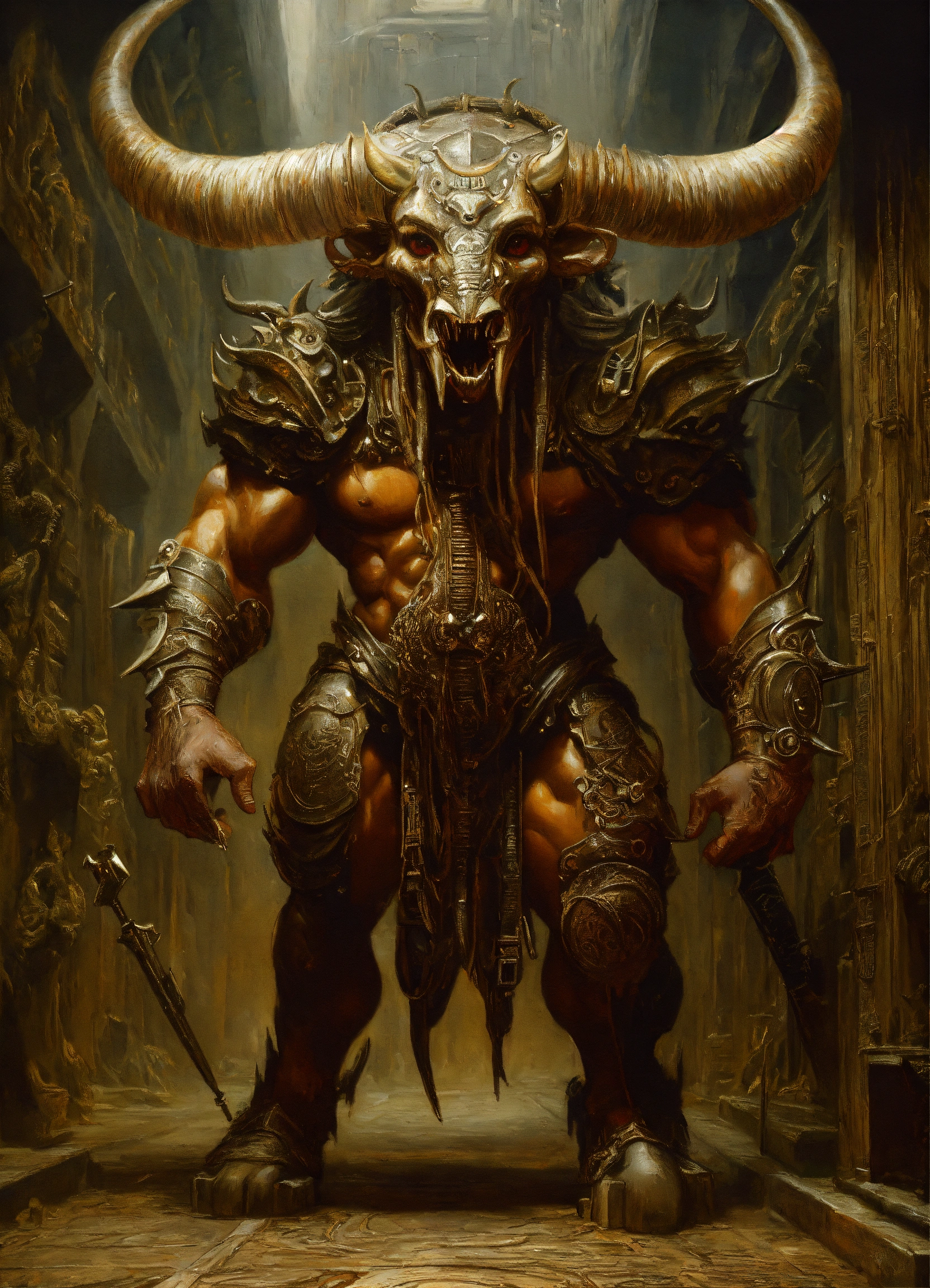 An oil painting by h.r. giger of a terrifying minotaur, the artwork is rich in detail and texture, creating a vivid image, highly complex, and meticulously detailed. an authentic conceptual and careful depiction, inferring a perfect visual representation of a medieval fantasy fine art, hd 4k resolution television.