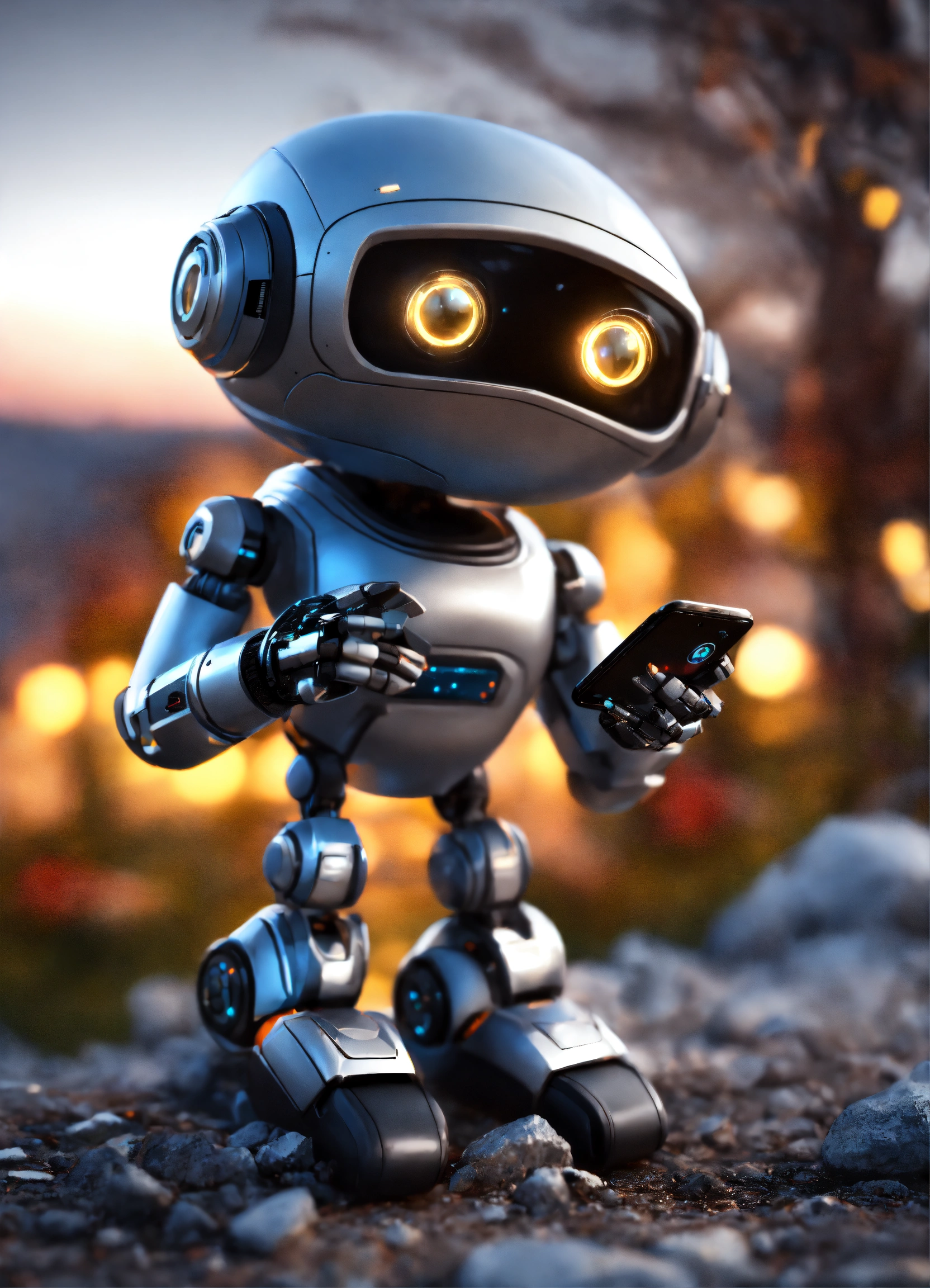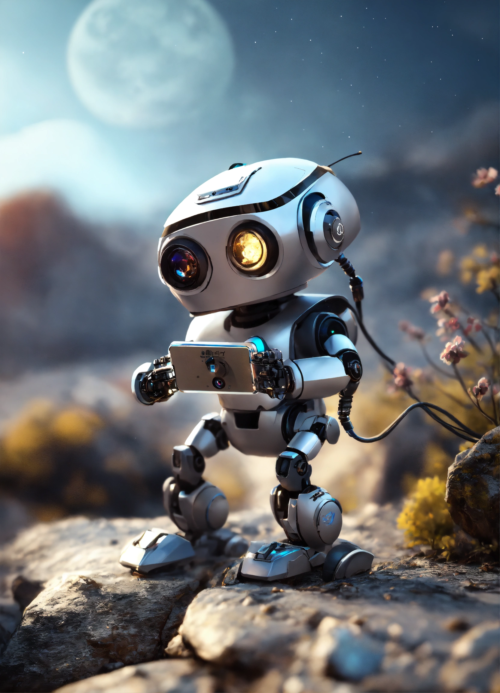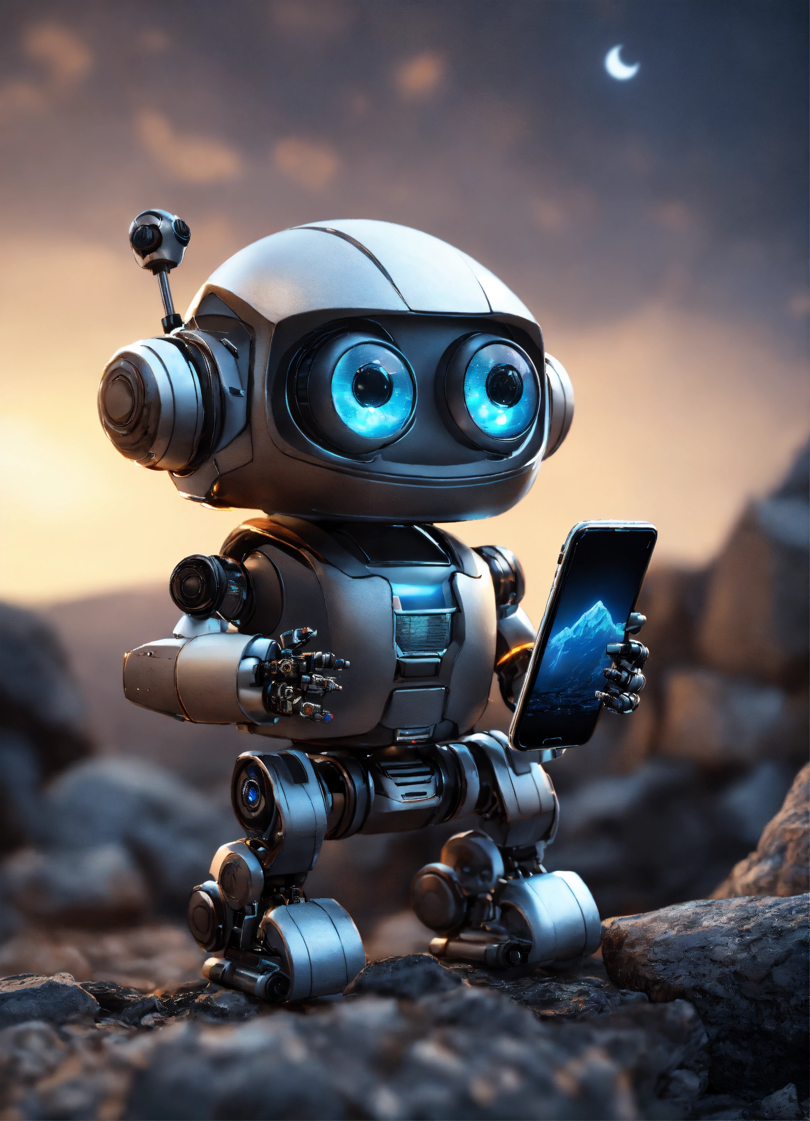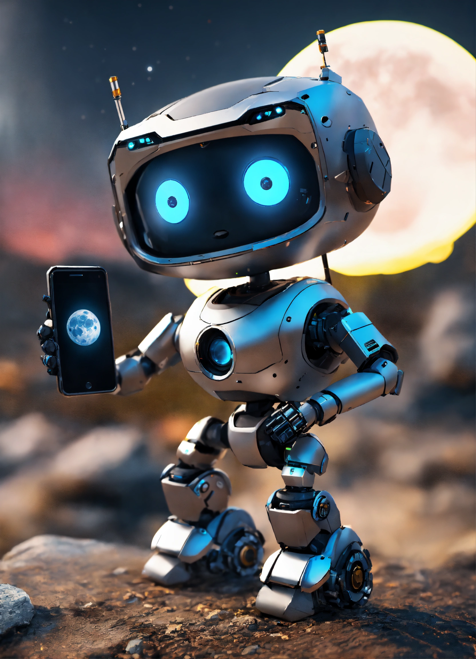 Cute tiny robot with cute eyes, holding smartphone in hands, rendered in unreal engine. hdr, realistic, cinematic light, fine details. moon background woth rocks, all picture in gray and black colors