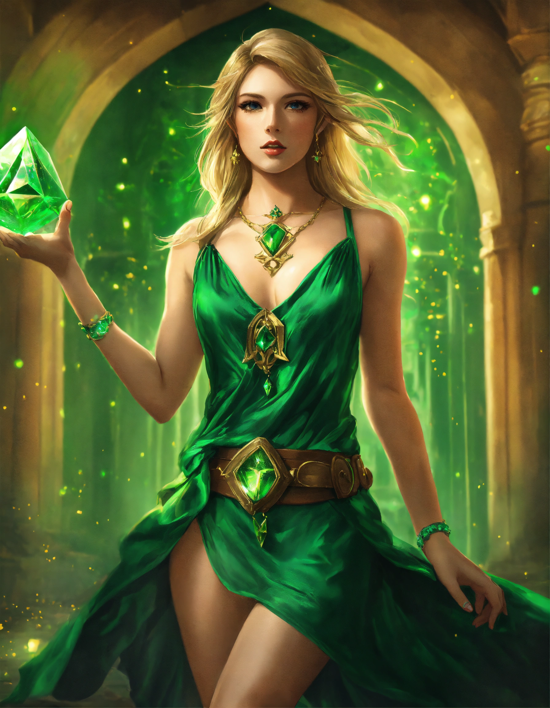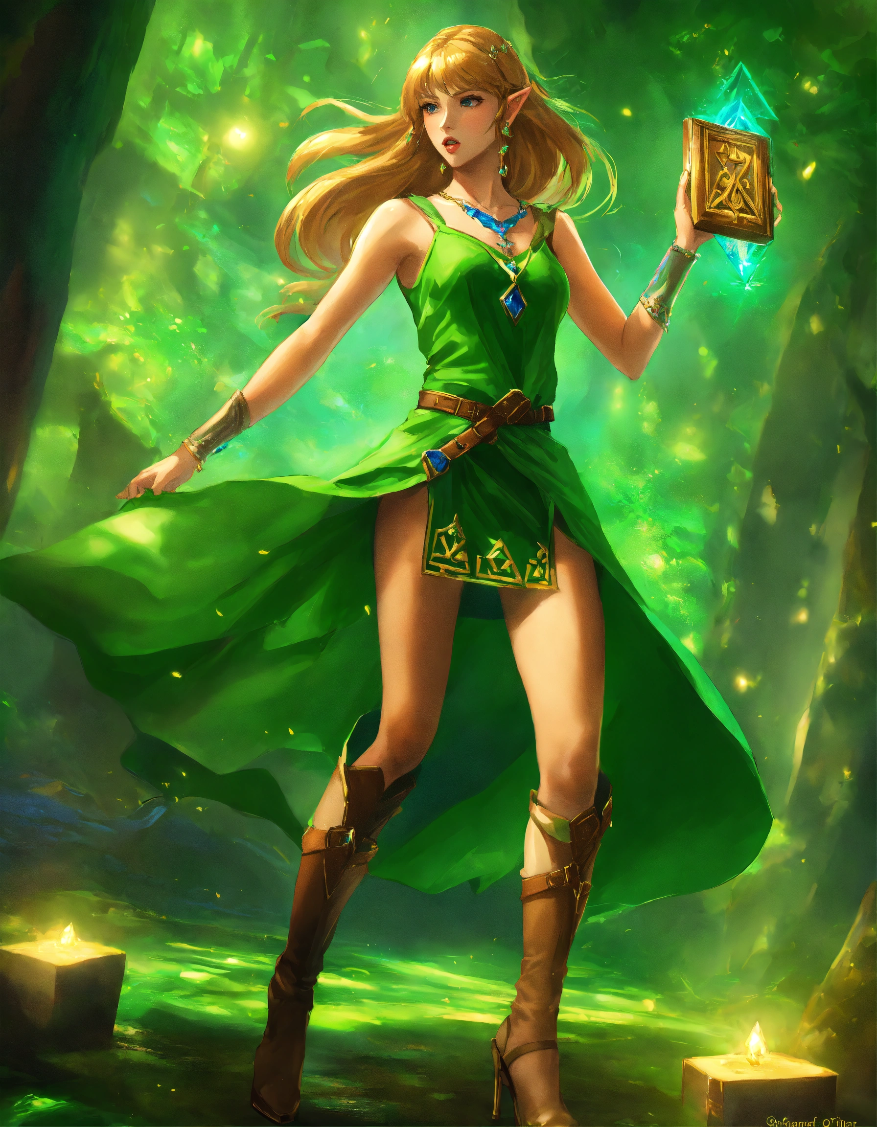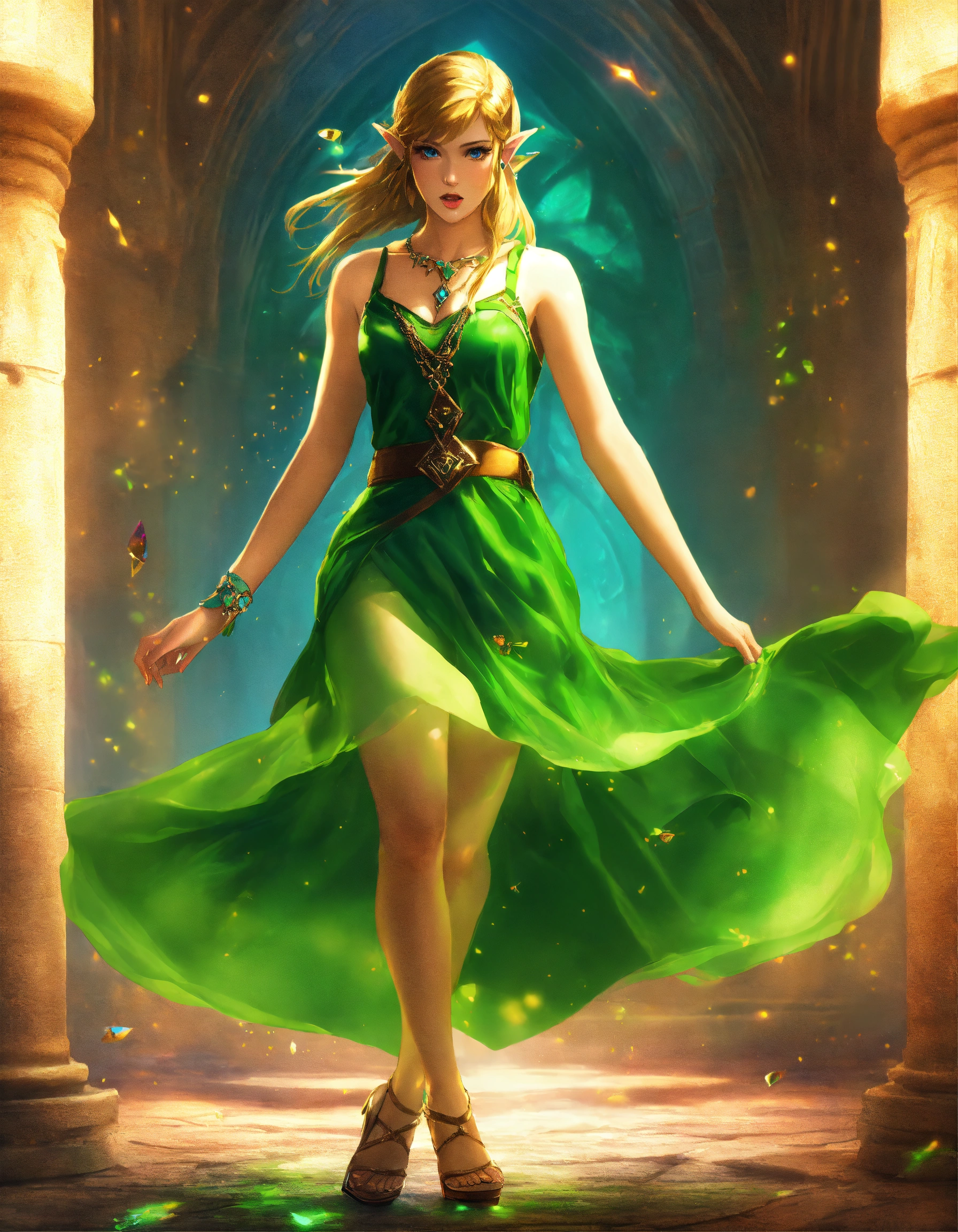 Full body fantasy art portrait of magic spell transforming femme link from legend of zelda sleeveless green silk short dress triforce jewelry afraid shocked high heels