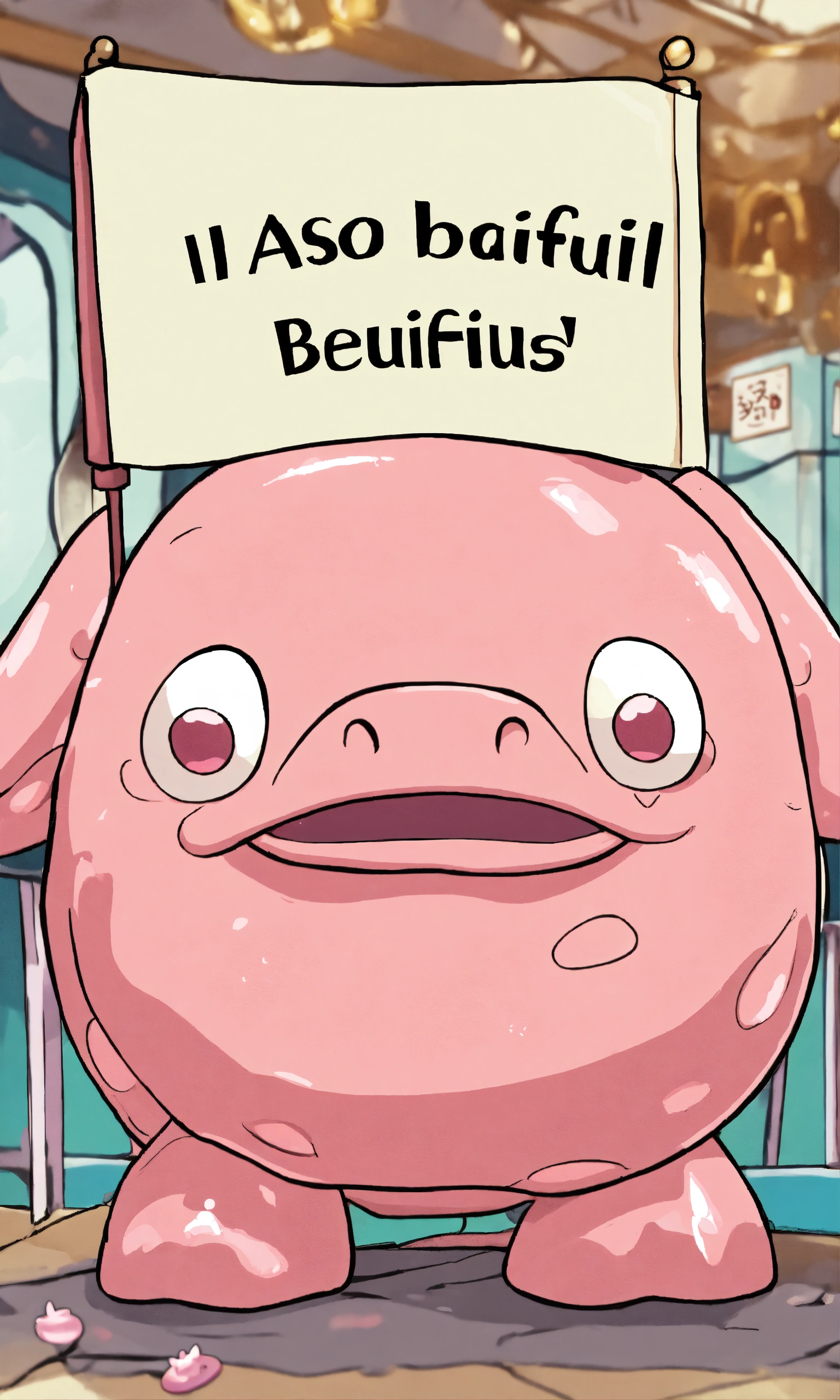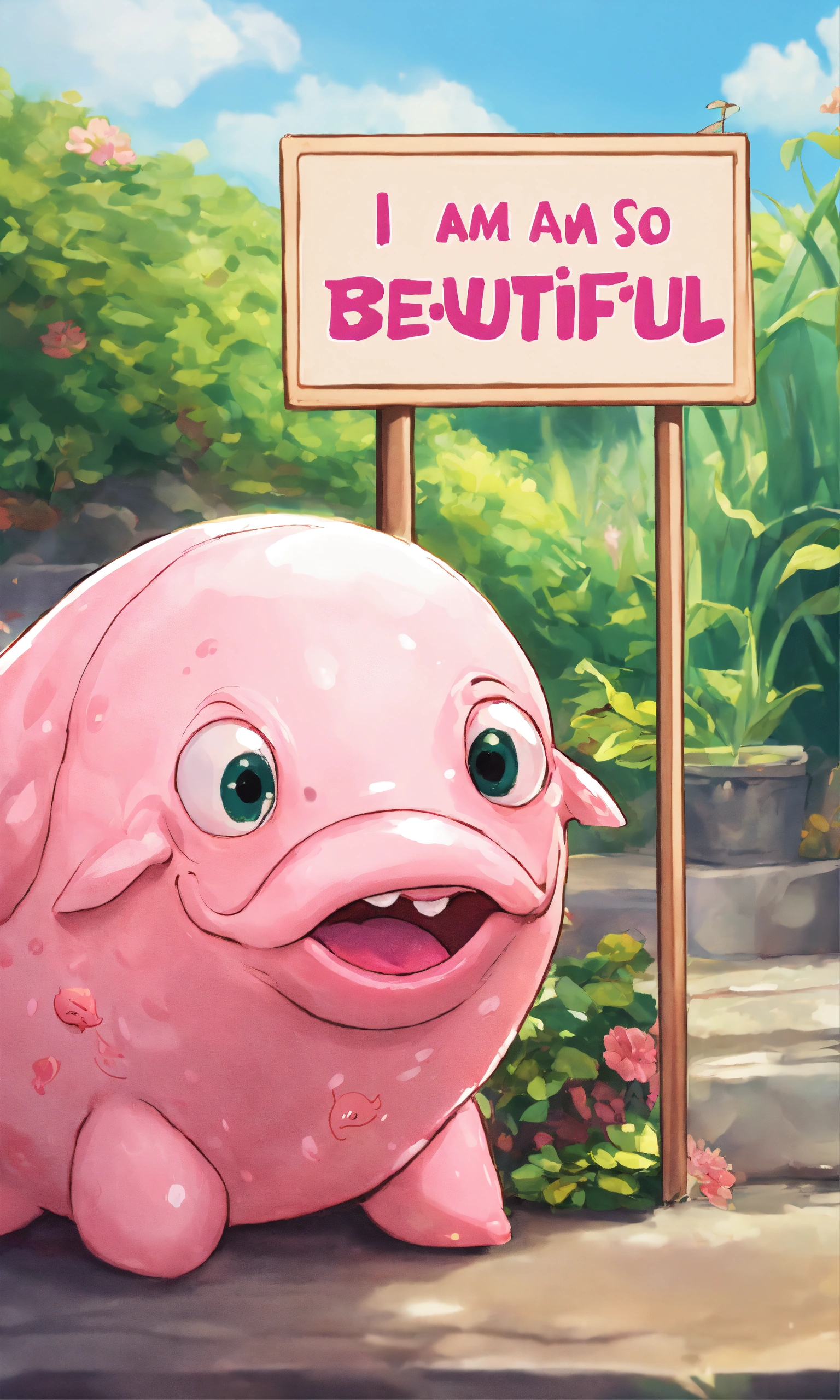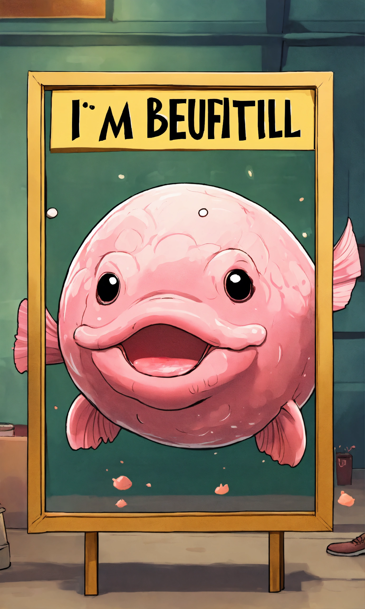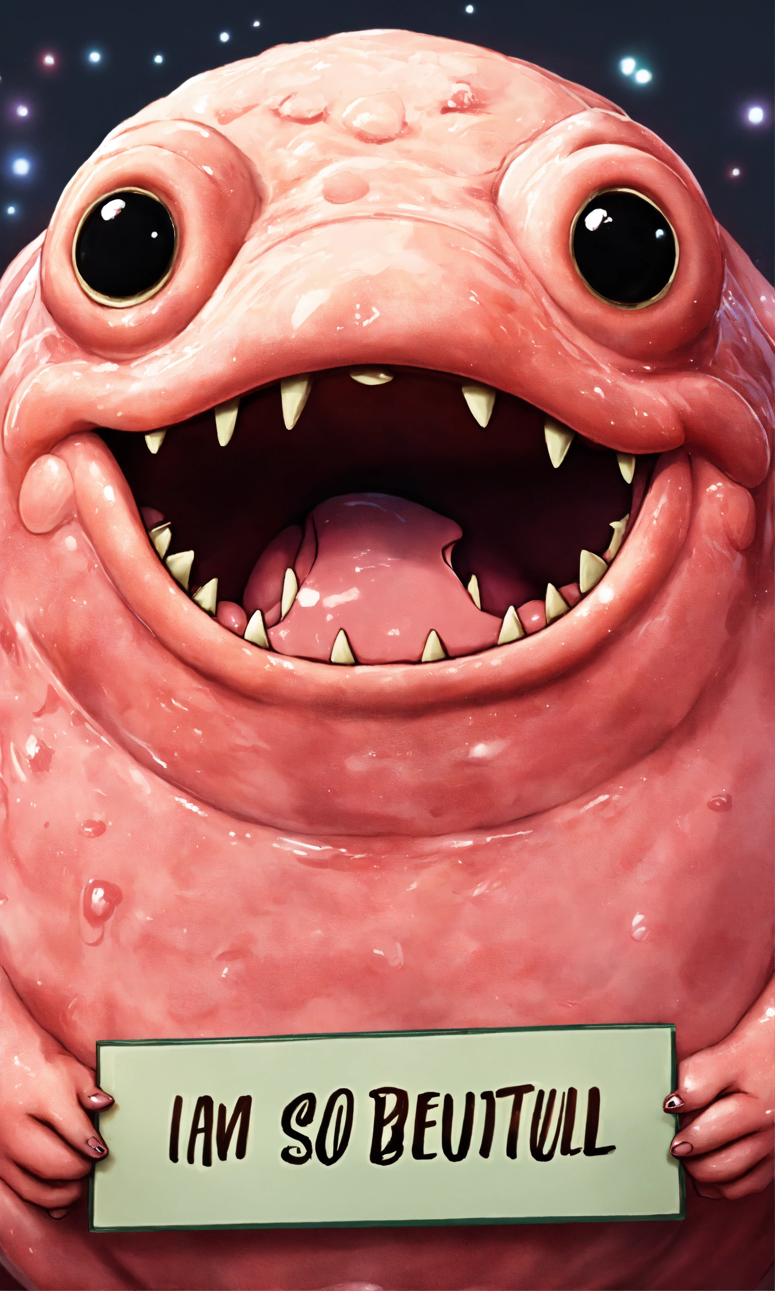 Ugly blobfish holding a sign that says 'i am so beutiful'