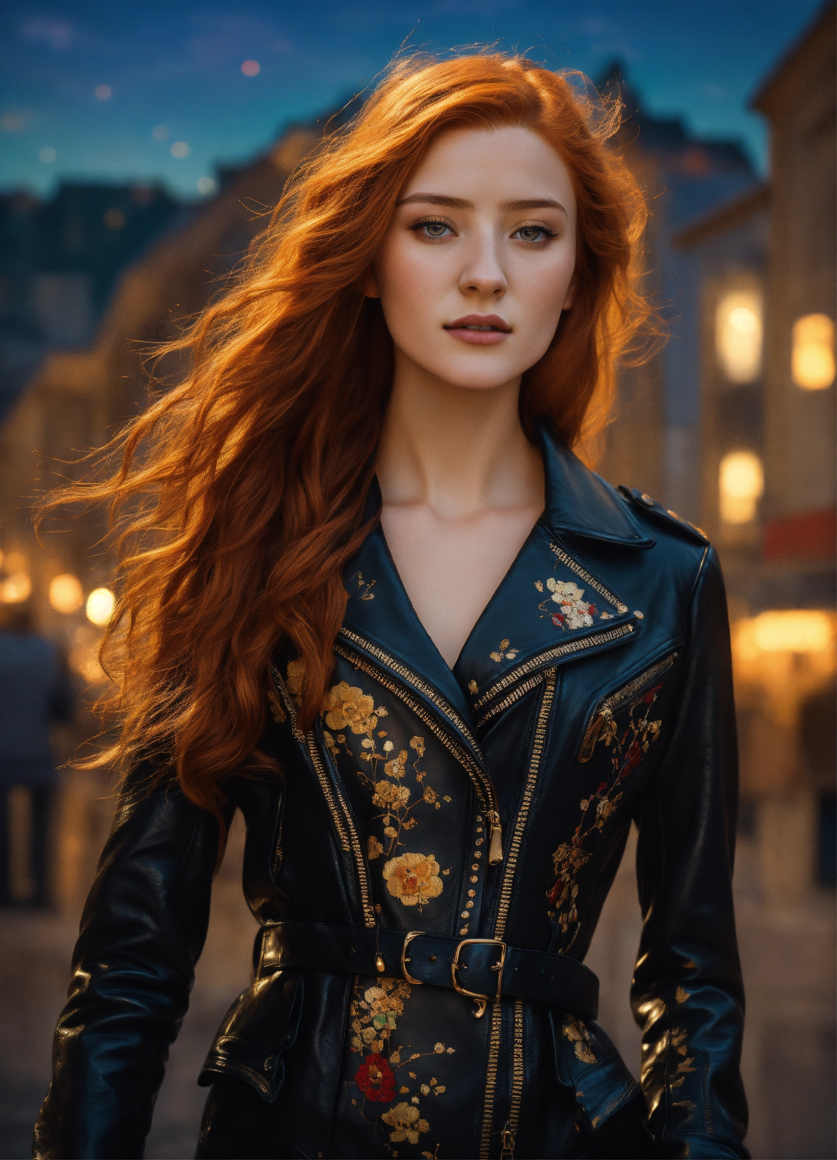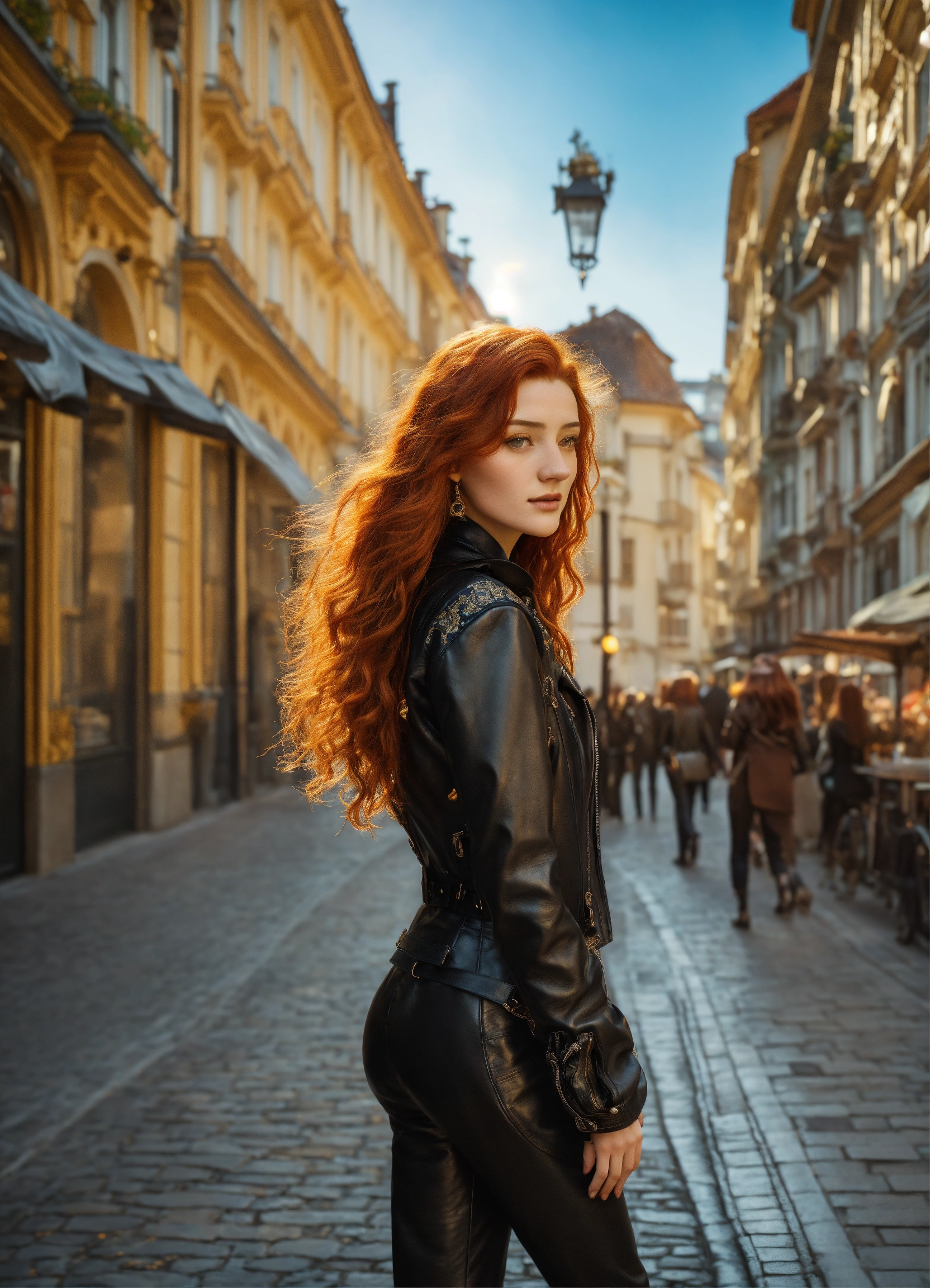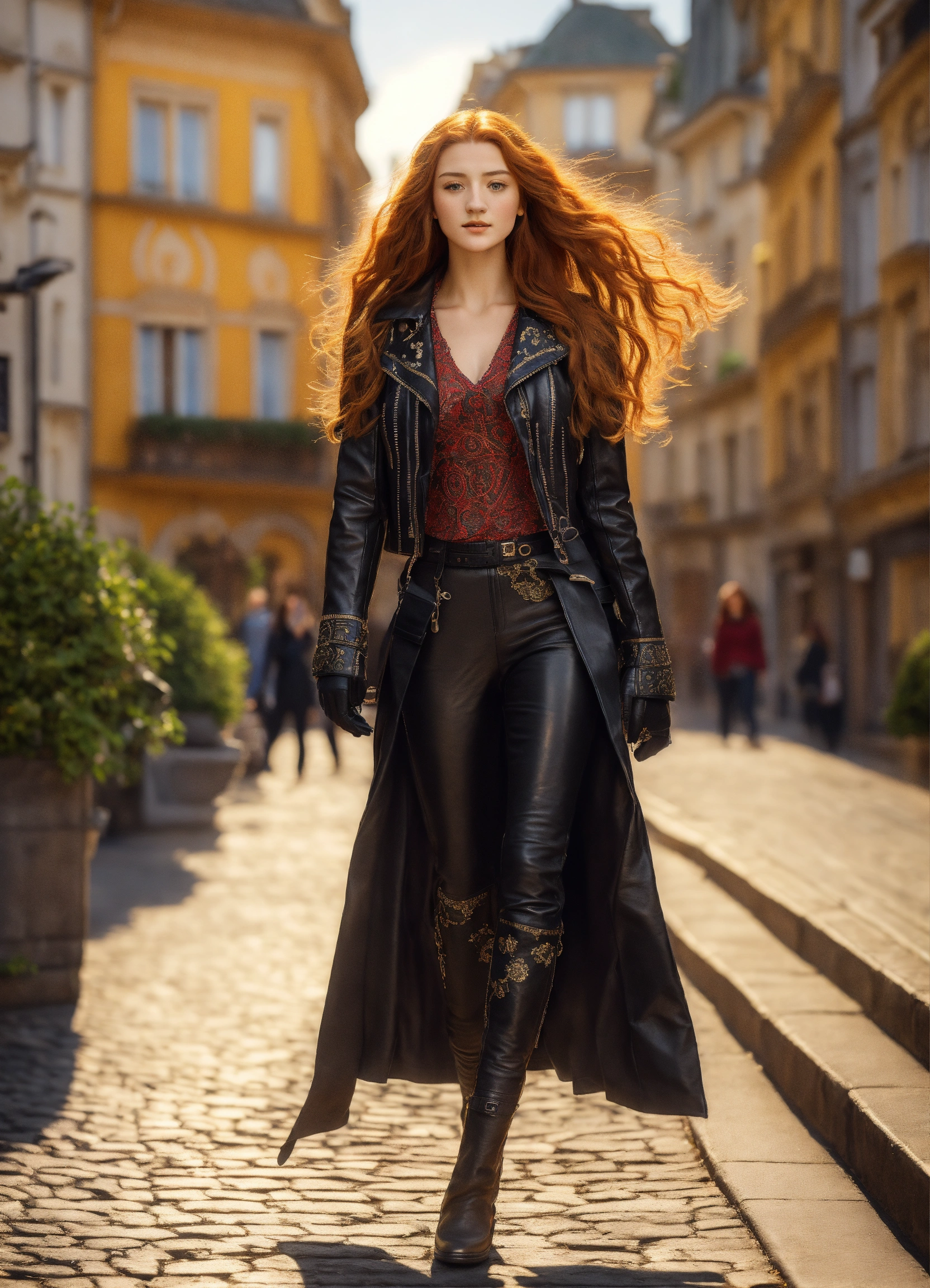 A beautiful 20 years old girl wearing a black leather jacket, pants and gloves walking in a sunny european city outside golden summer light, by gustav klimt art, deco art nouveau style, stunning intricate details, high definition, 8k render fullbody, very long red hair looks like a real life version of sansa stark