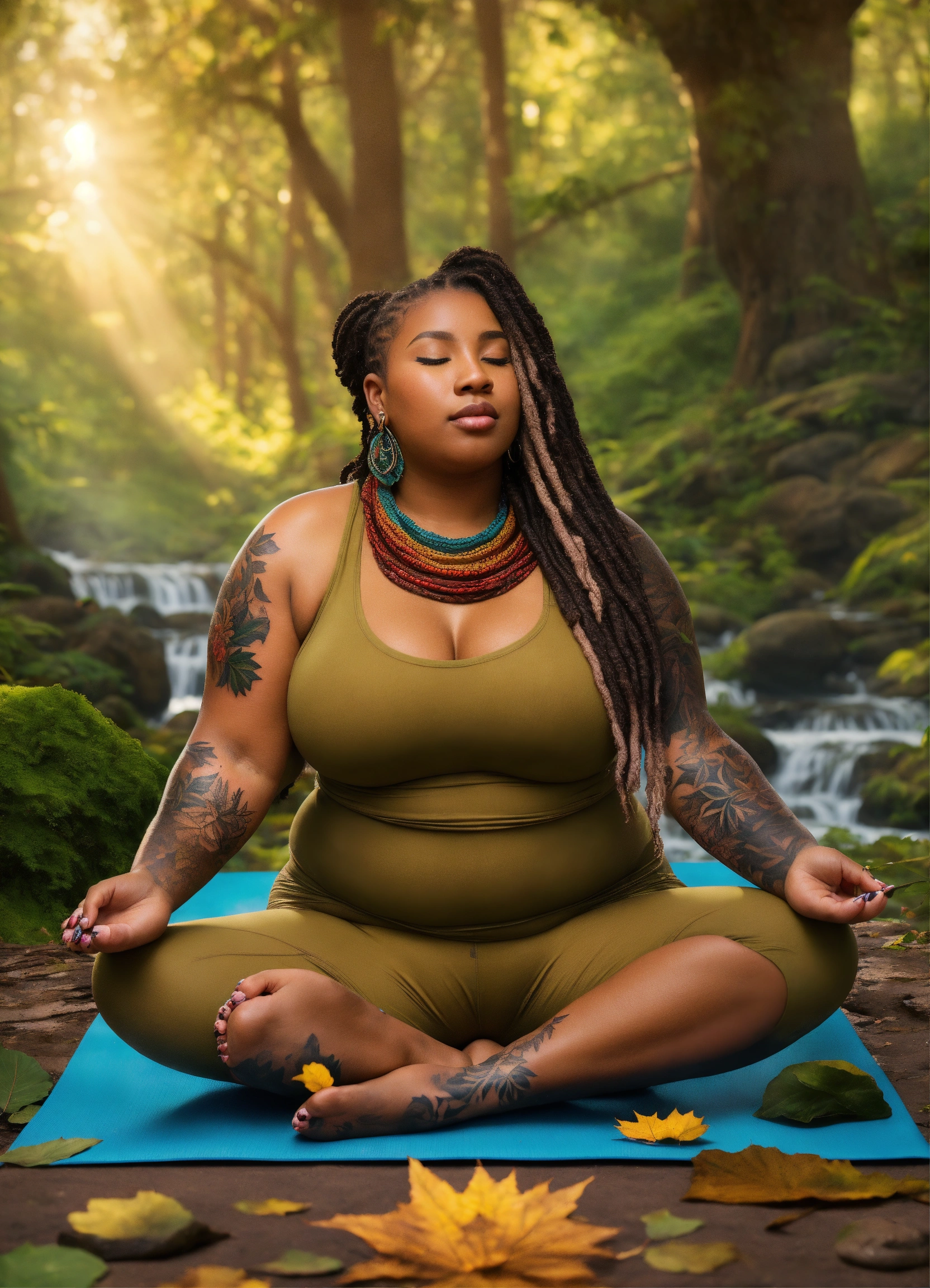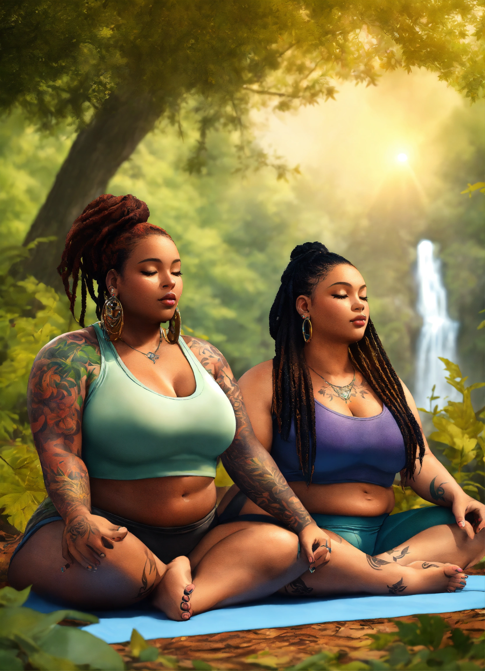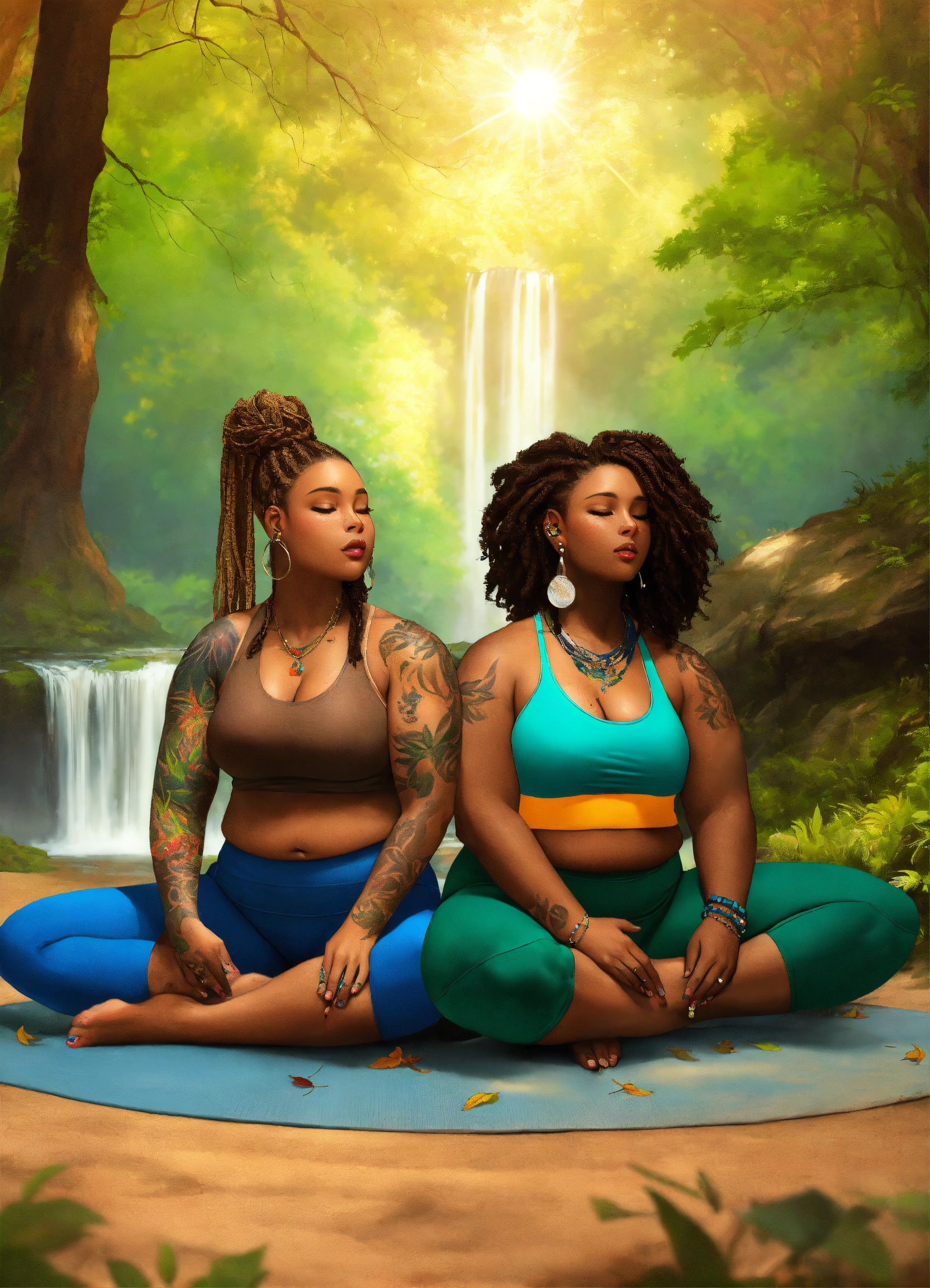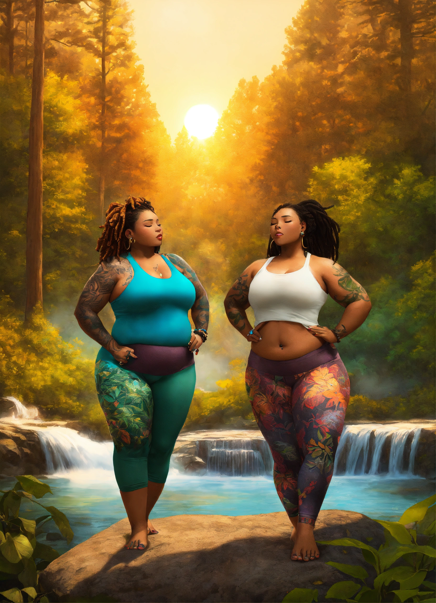 An ultra realistic, high resolution, two tattooed plus size brown skin females, with locs, doing yoga poses in nature, with leggings, various color shirts tied in the front, eyes closed, noses pierced, big earrings, painted finger and toenails and bare feet. background with tall trees with leaves that are changing colors, waterfall and the sun reflecting off their brown skin