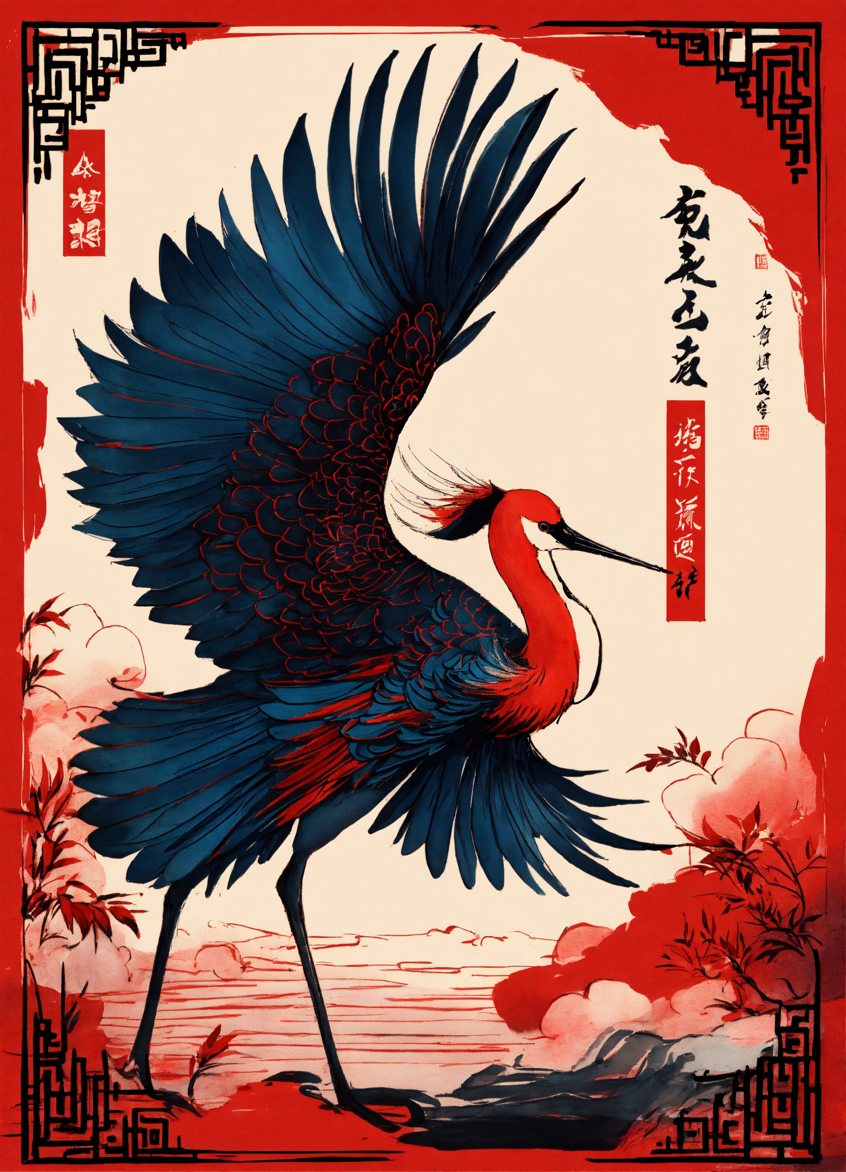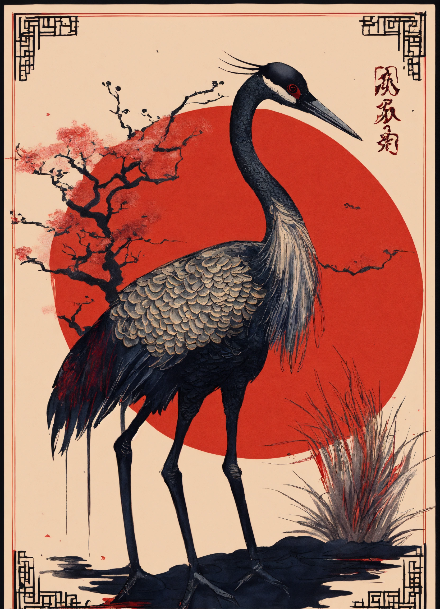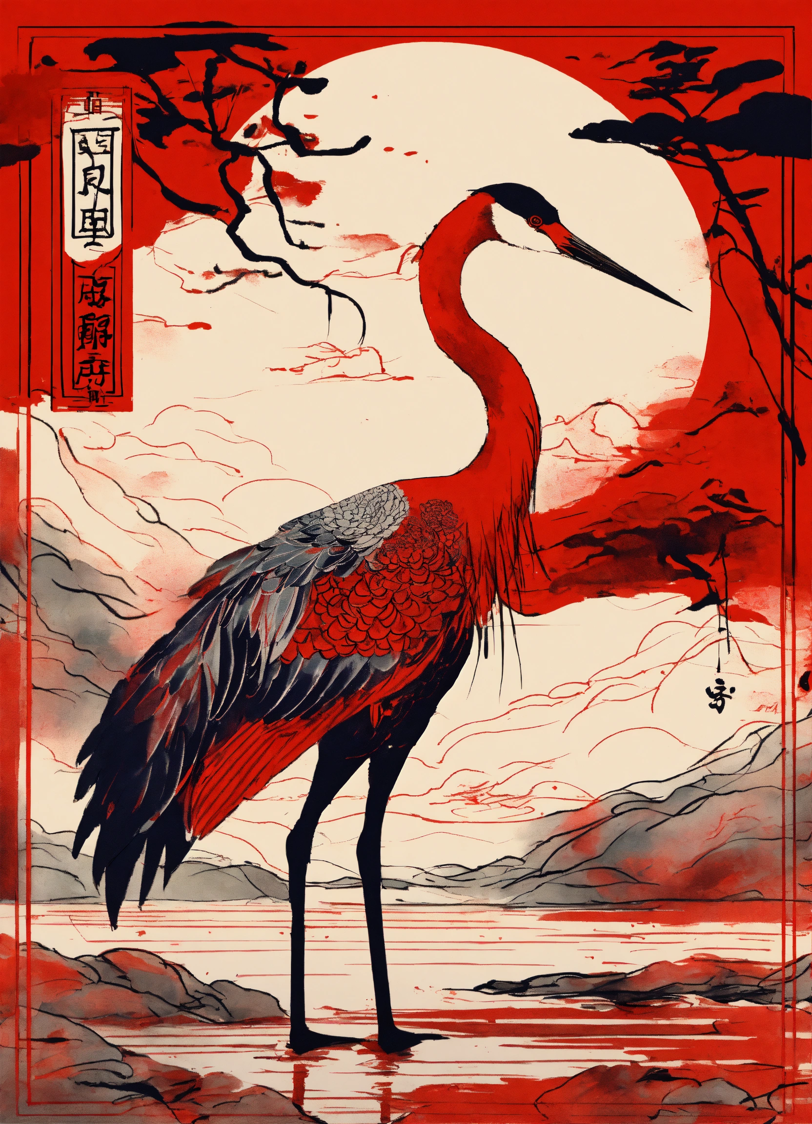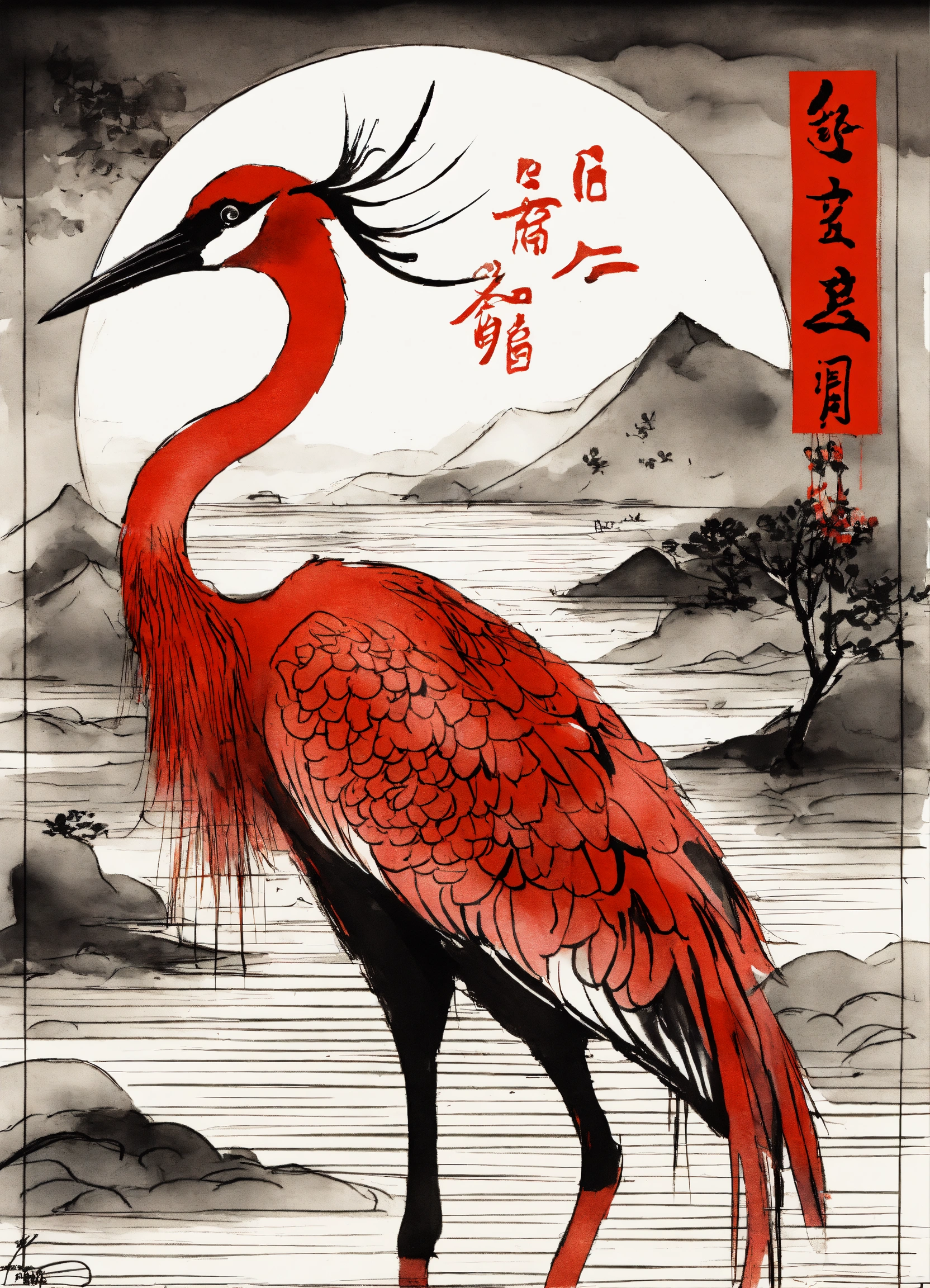 Shuǐmò huà, 水墨画, black and red ink, a crane in chinese style, ink art by mschiffer, whimsical, rough sketch, (sketch1.3) aquarius zodiac sign