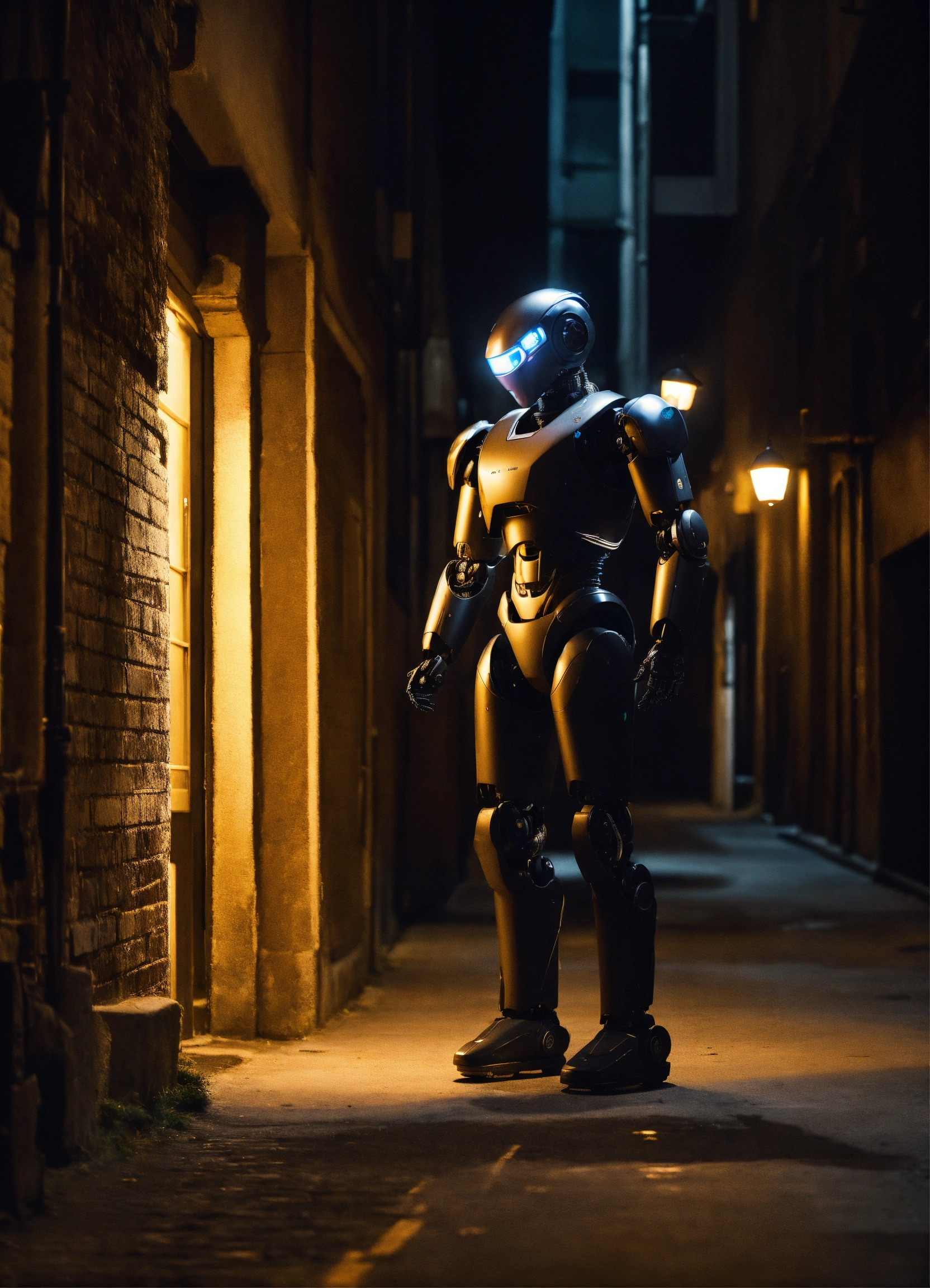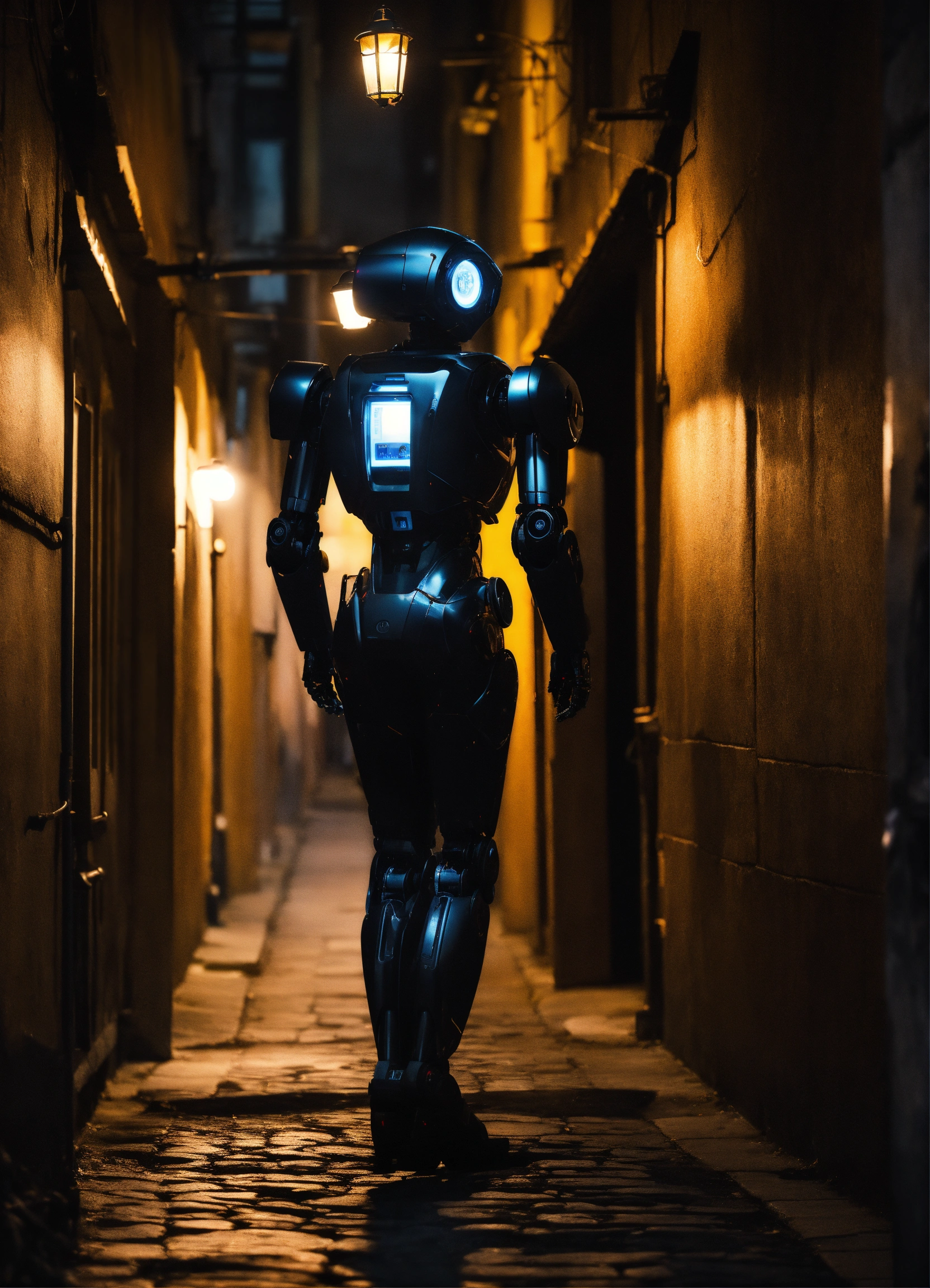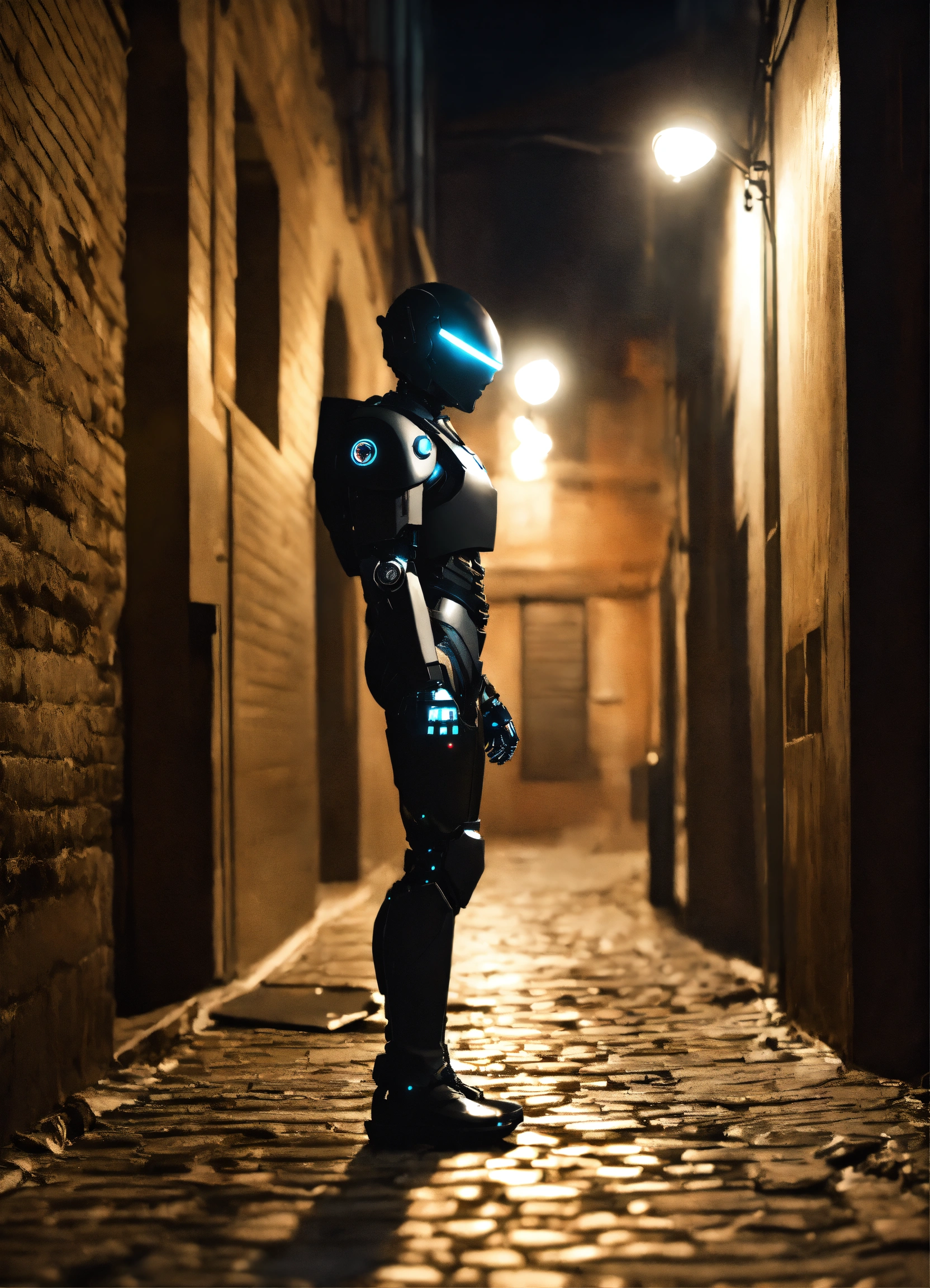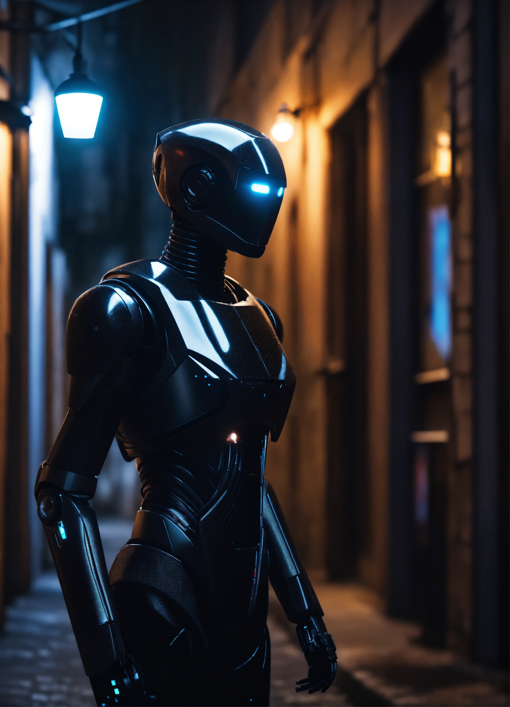 A realistic photograph of a black robotic suit deactivating invisibility, in a dark alley lit by a single lamp, dramatic illumination, hyperdetailed, hyperrealistic, 8 k