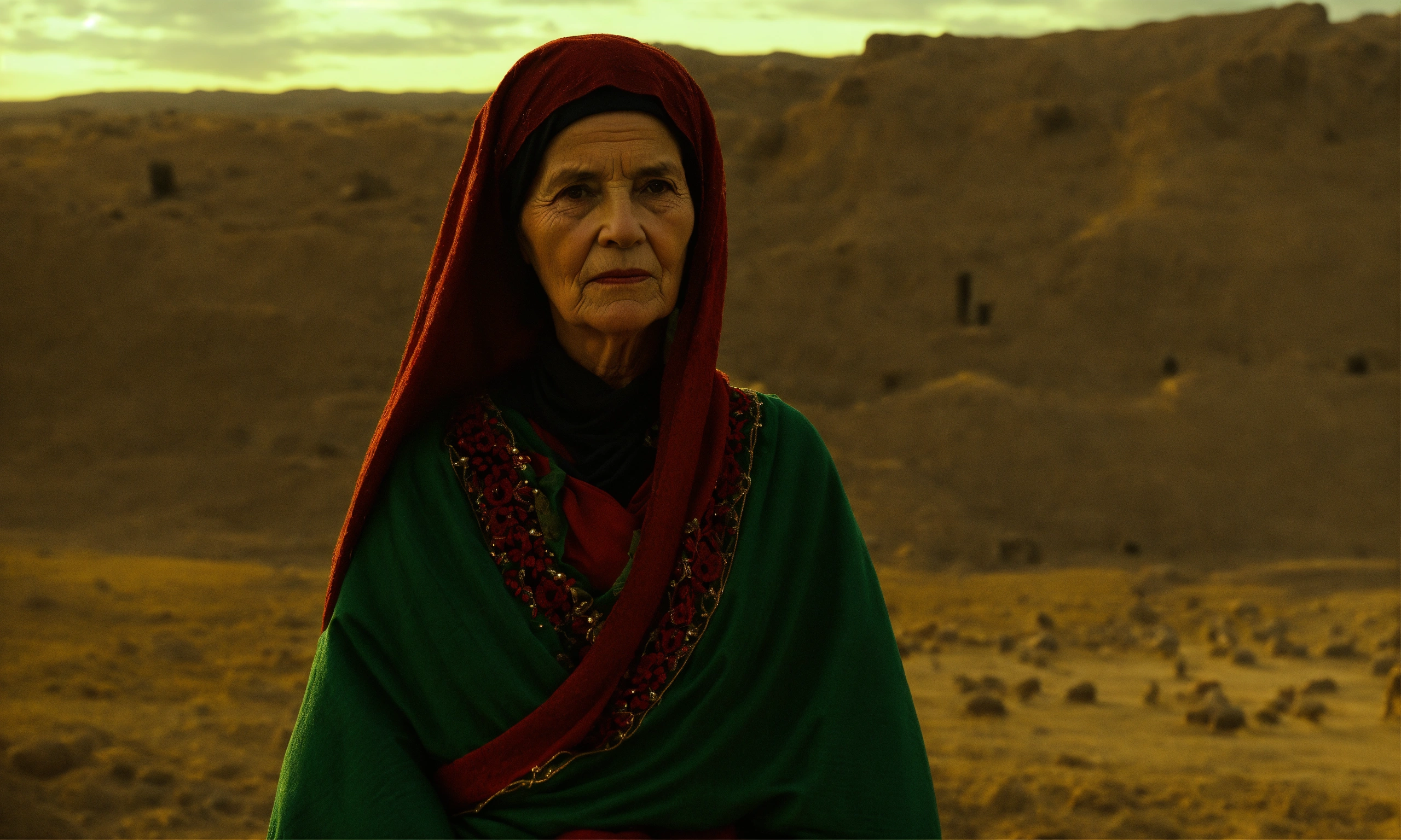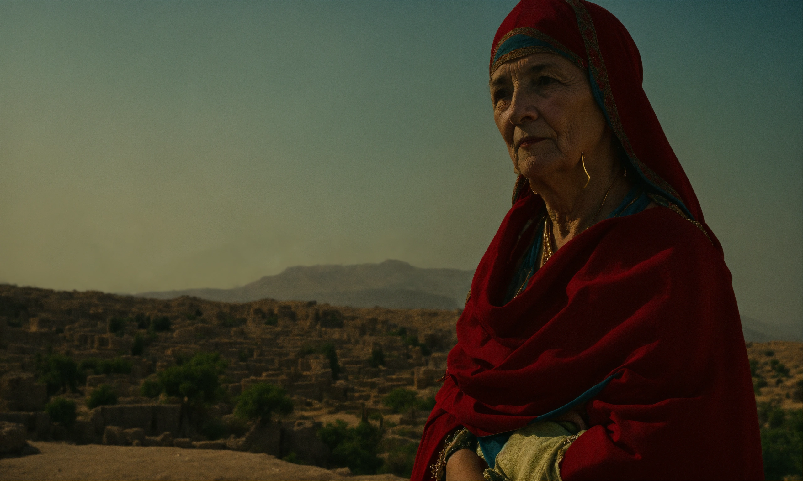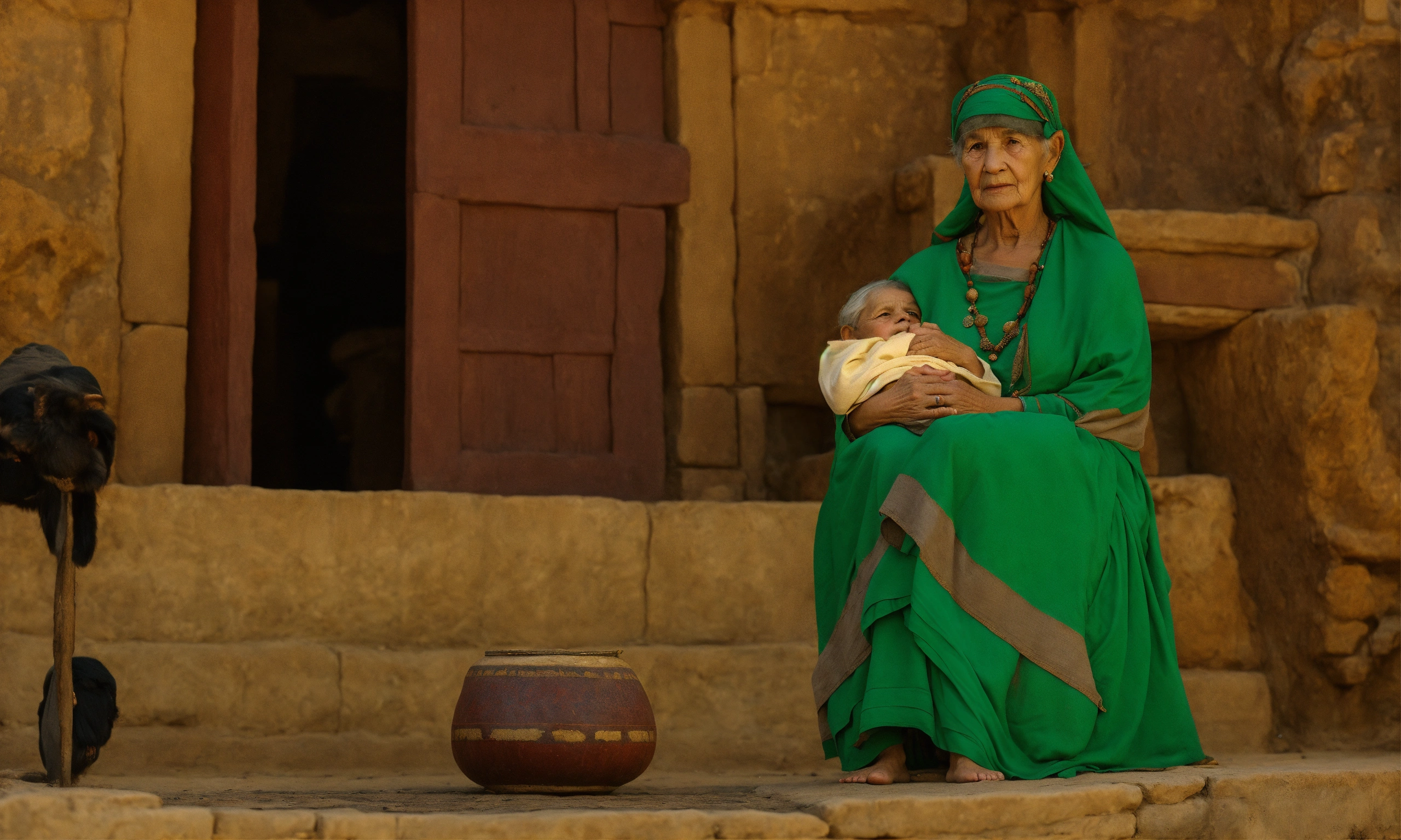 An old woman, with a type of red trban on the head, ancient life, sarah wife of abraham, with a son in her arms