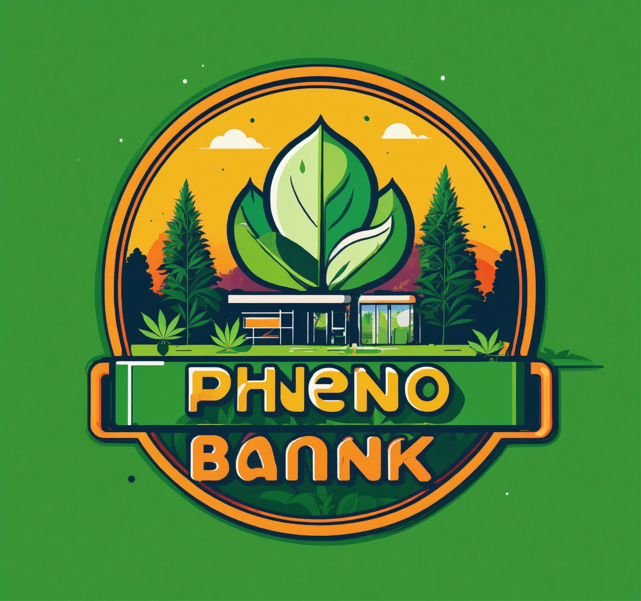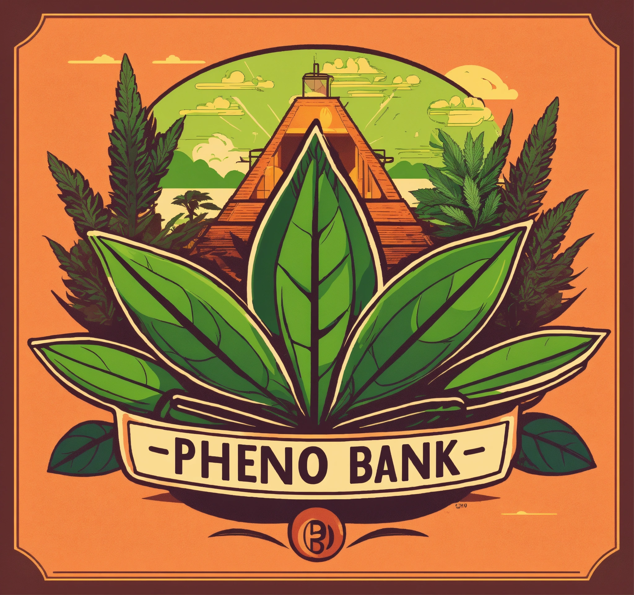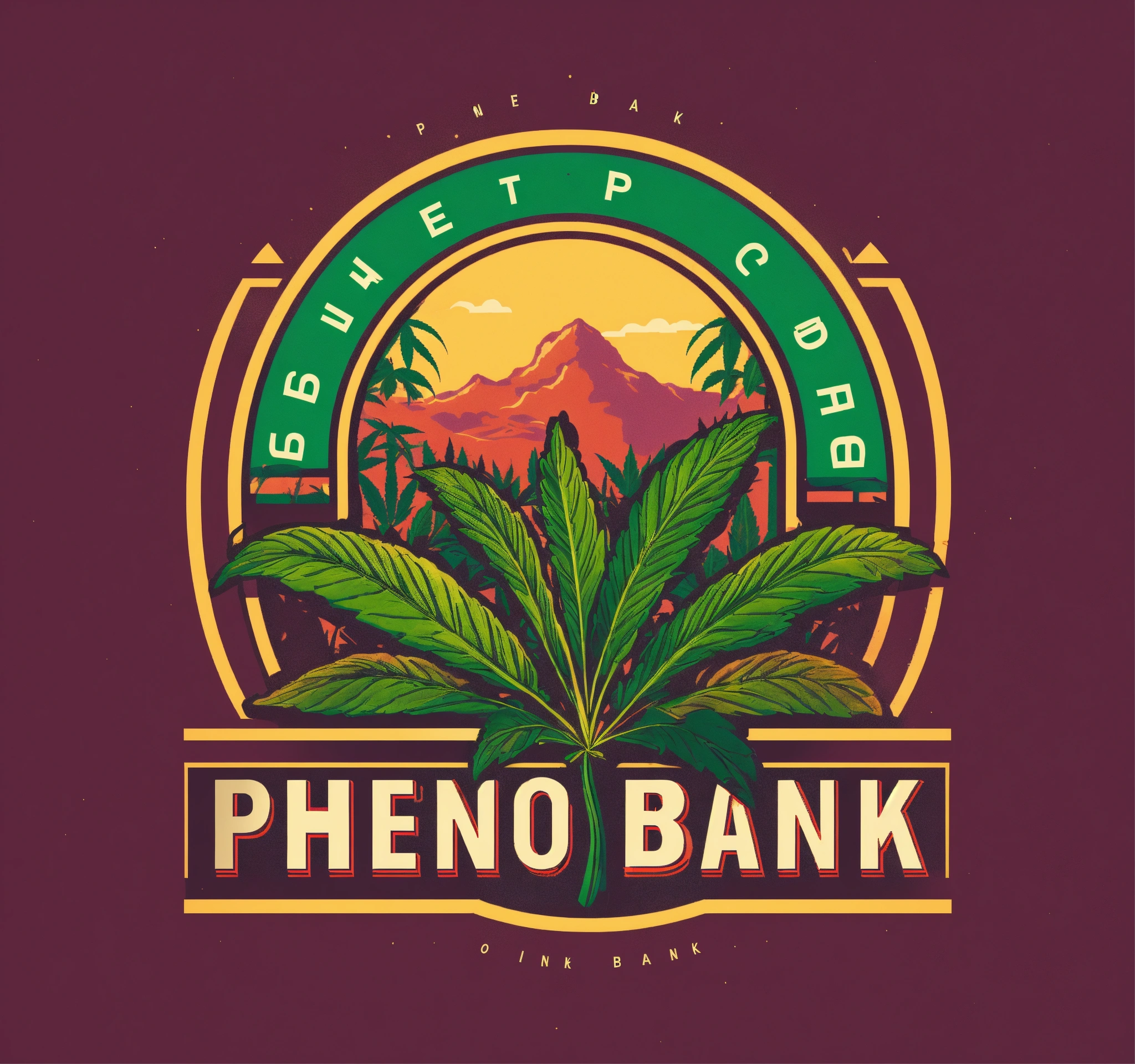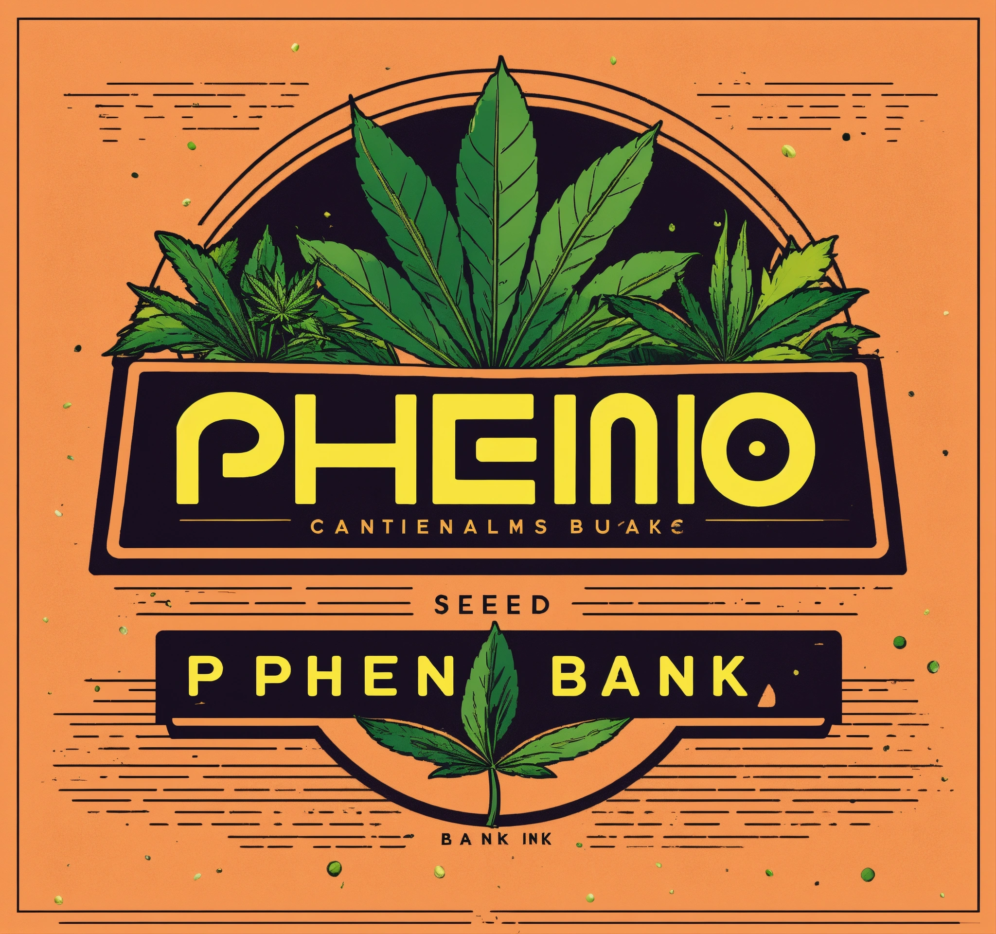 Logo of a seed store with name "pheno bank". minimalist, pop art, retro futuristic seed, plant, cannabis leaf, steam, bud. greenhouse, farm, field garden. jungle, rainforest. monkey, rabbit