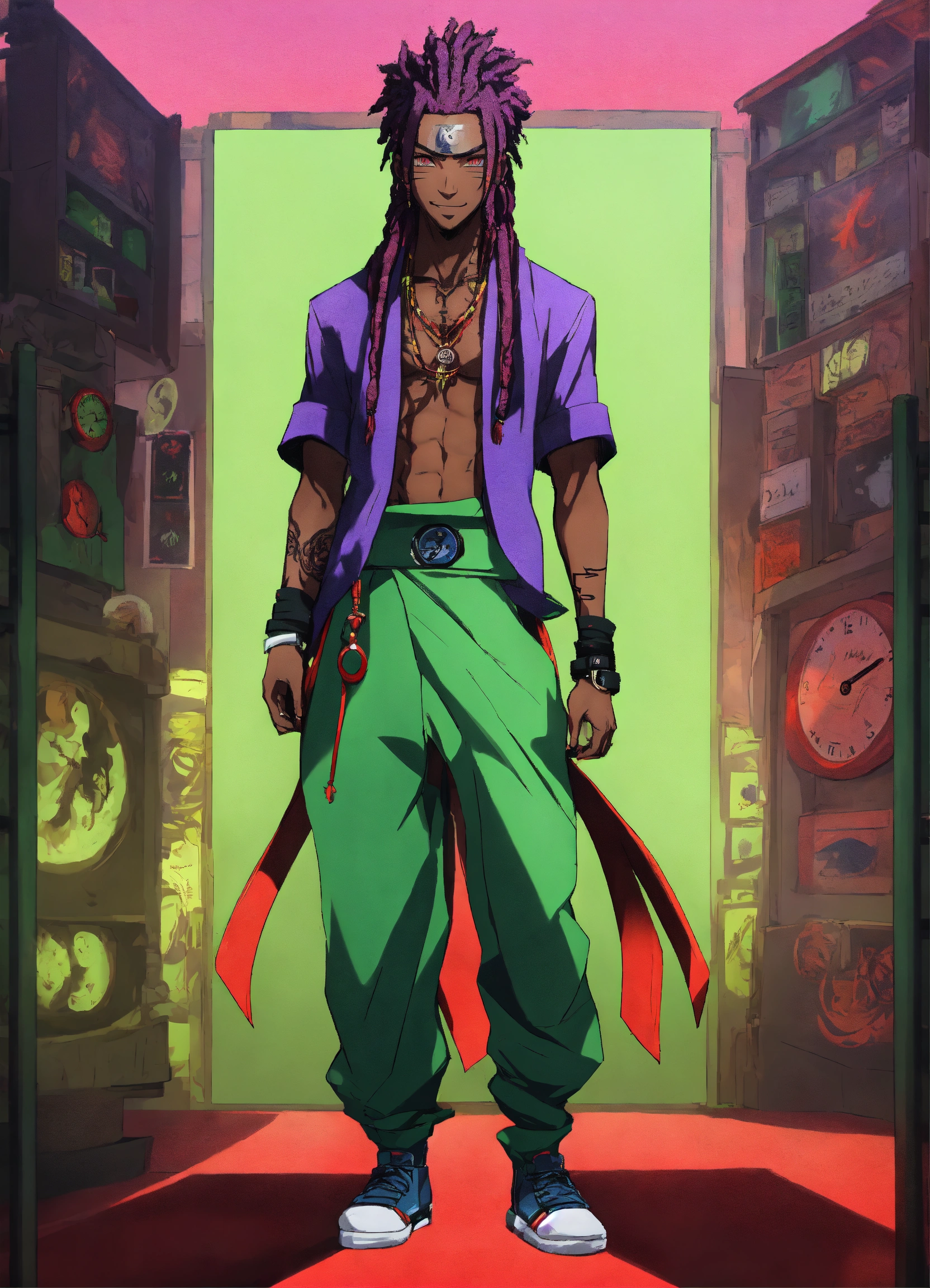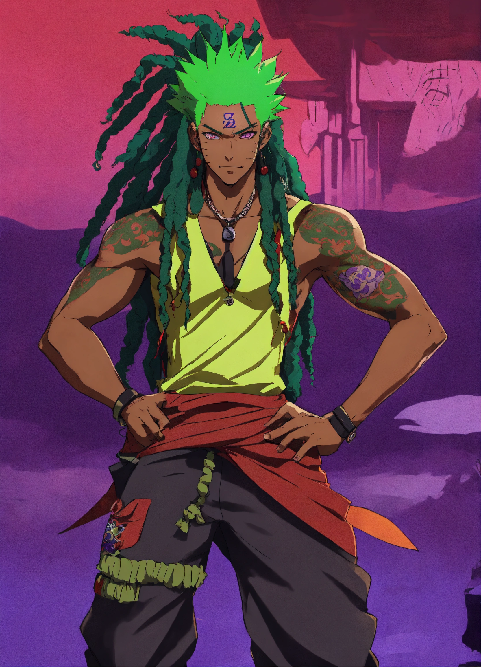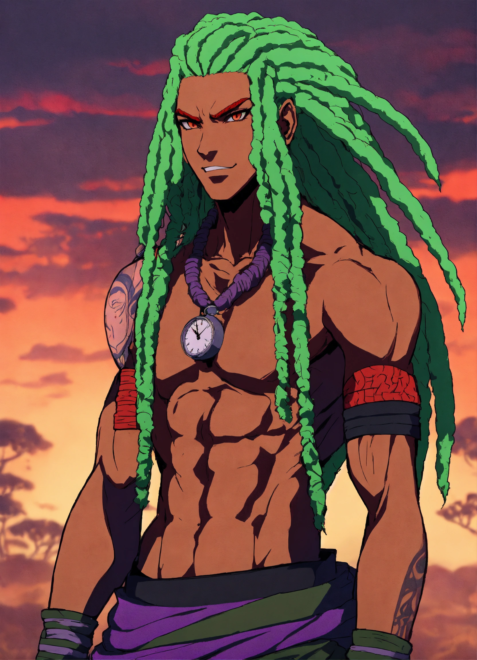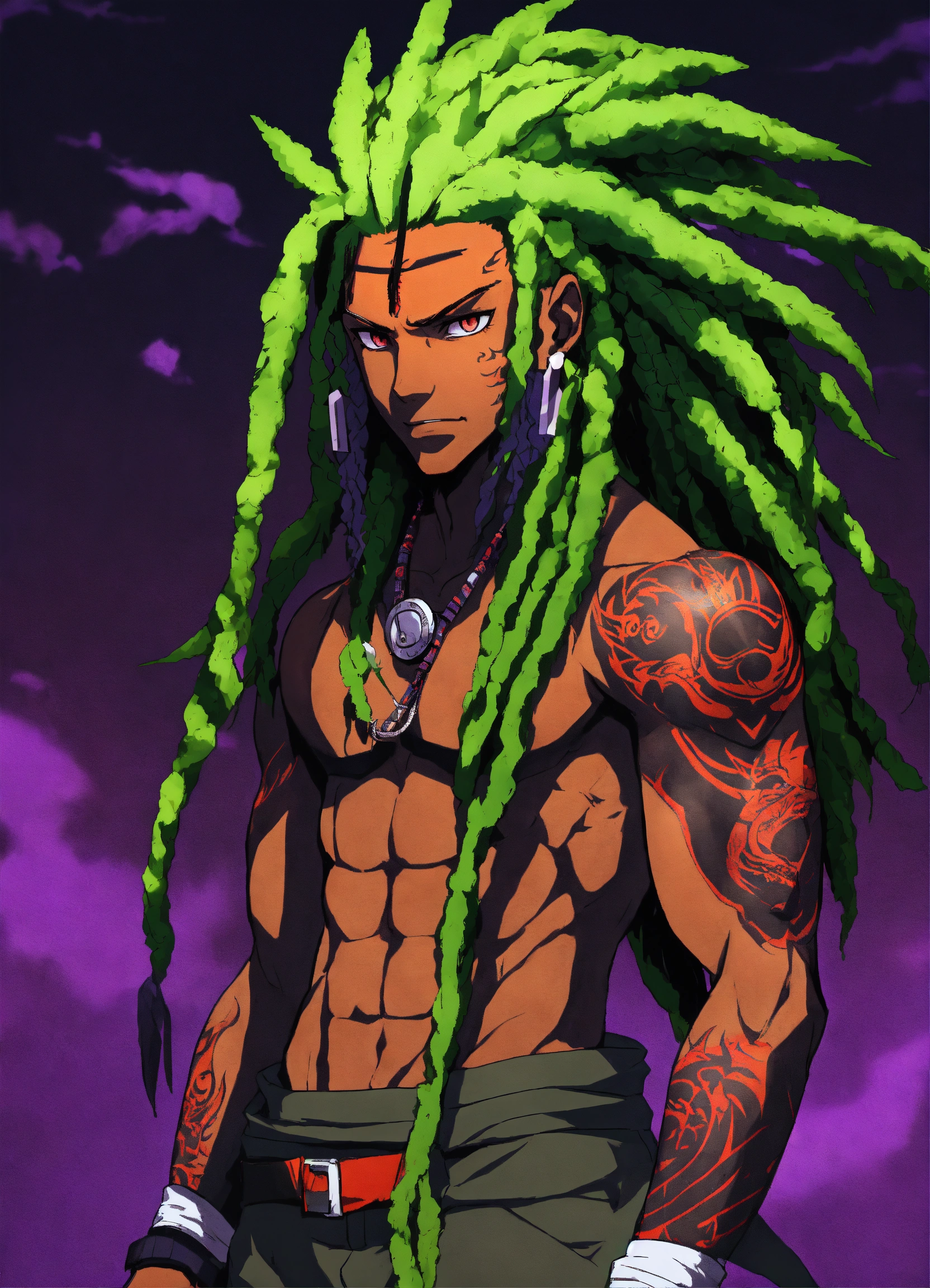 African naruto anime character, athletic physique, long green hair, which is styled in a wild dreads and untamed manner, red dragon eyes, he wears a black and purple clock, anime style, male, has a smirk on his face, has tattoos, full body view