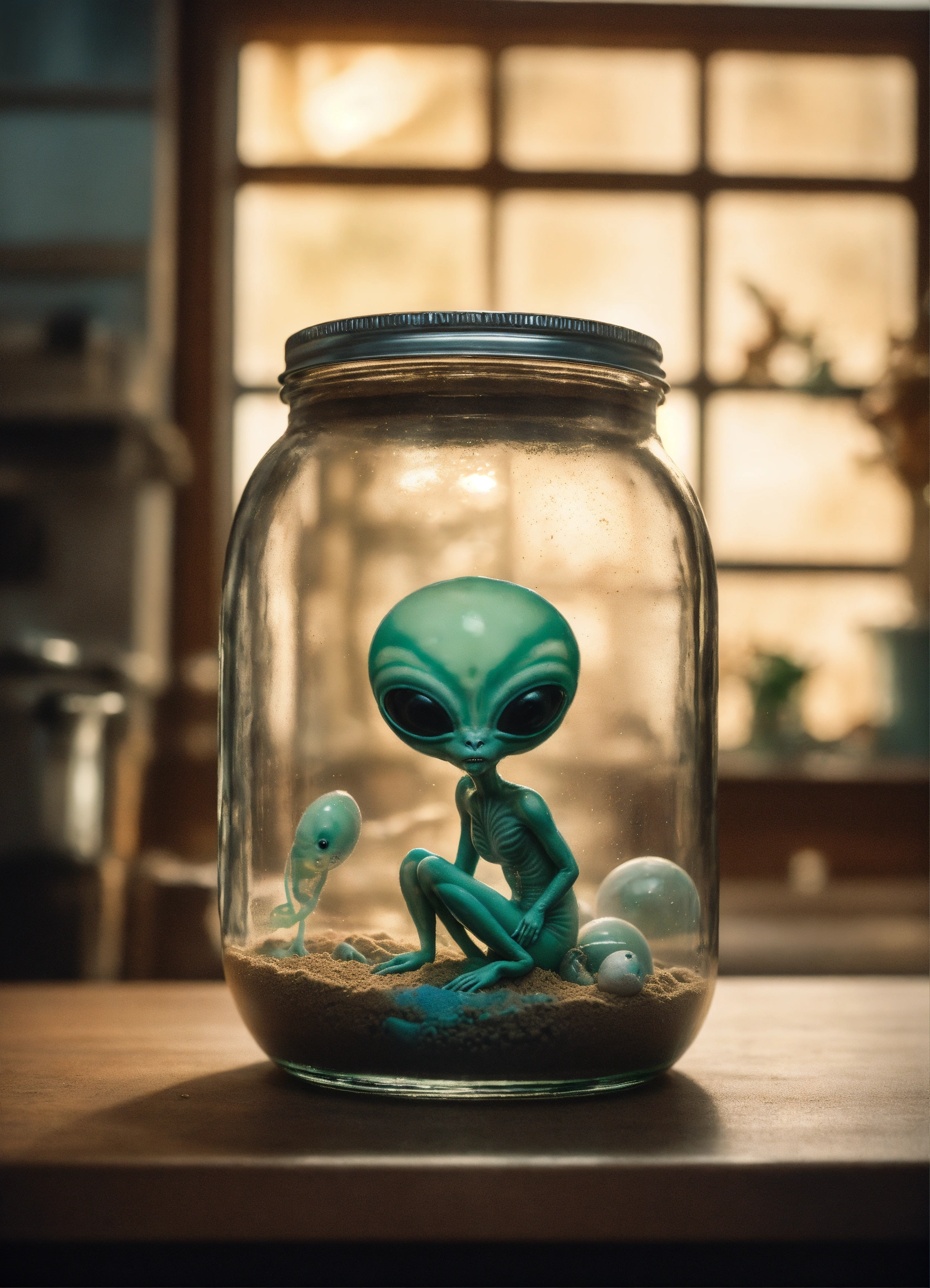 A professional, high quality photograph of an alien embryo trapped in a glass jar in the style of audrey kawasaki, on a table with a dusty surface, chaotic, a masterpiece, depth of field, subtractive lighting, panorama, add details, pastel colors.