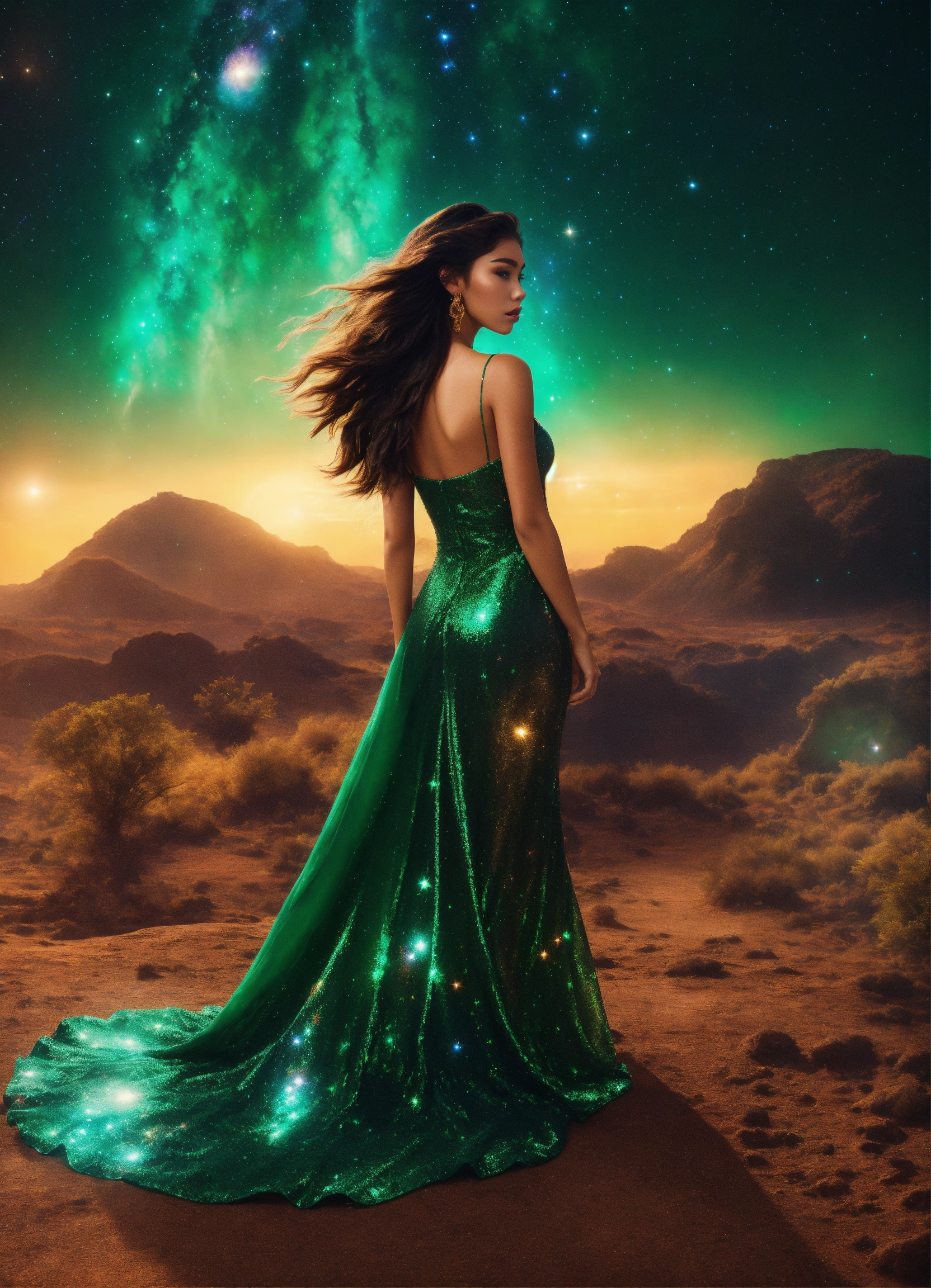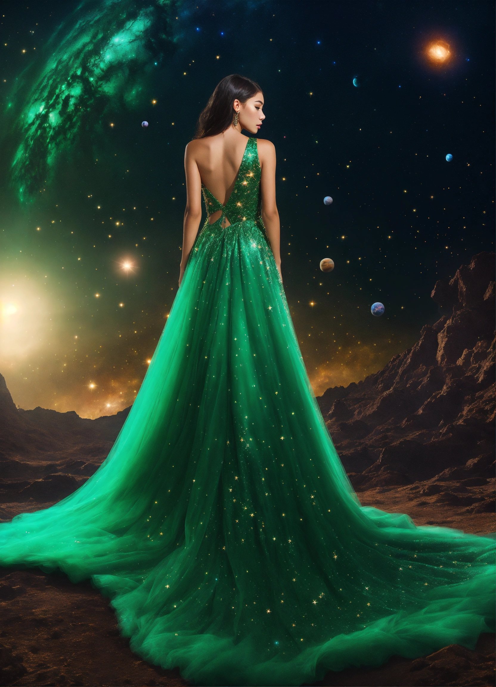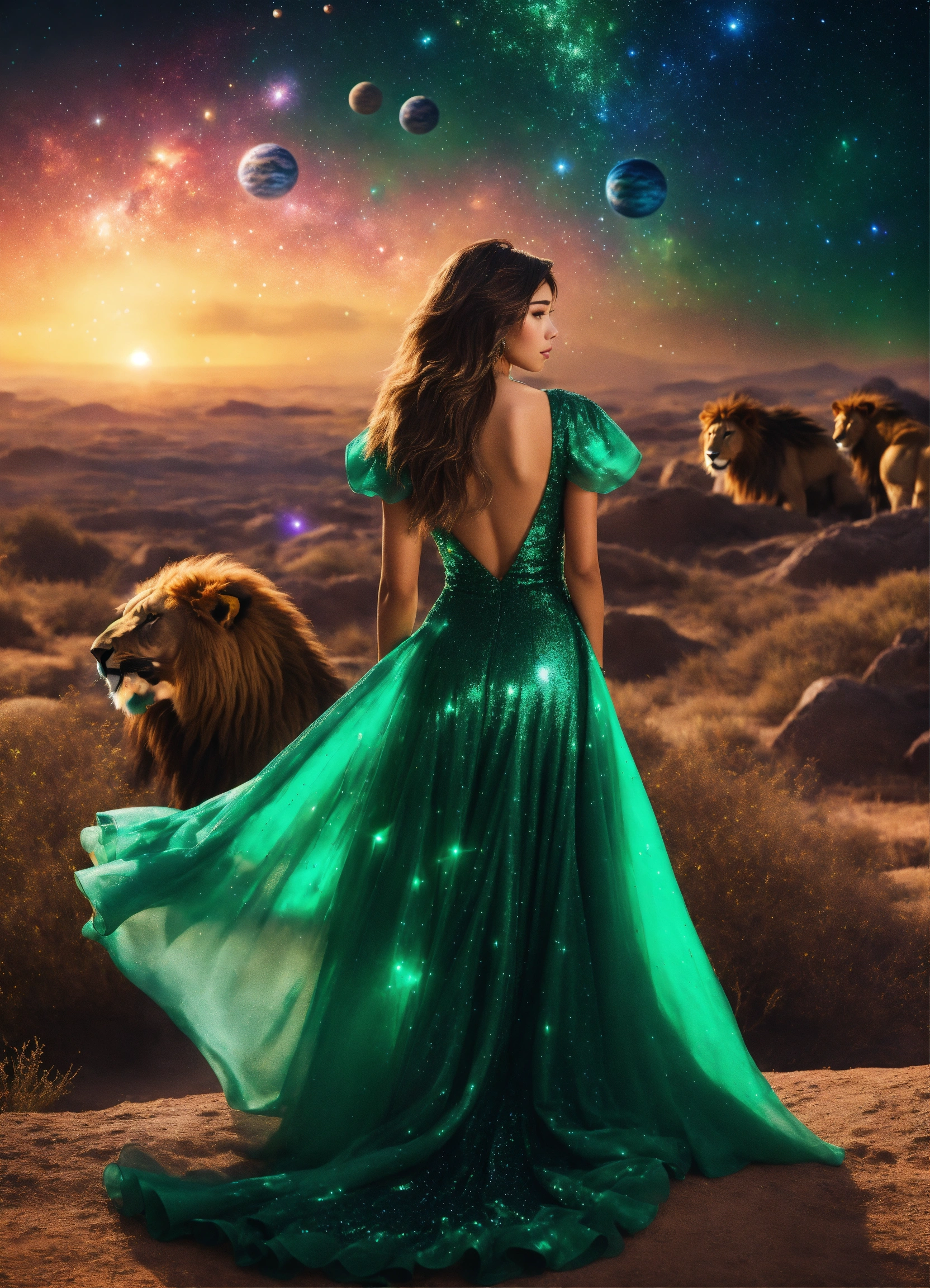 Madison beer in a emerald sparkling cocktail dress, black, on an isolated planet, back turned. stars raining down, a majestic lion with golden mane watching her. galaxy filled with planets, realistic. full body. 4k real photoshoot.