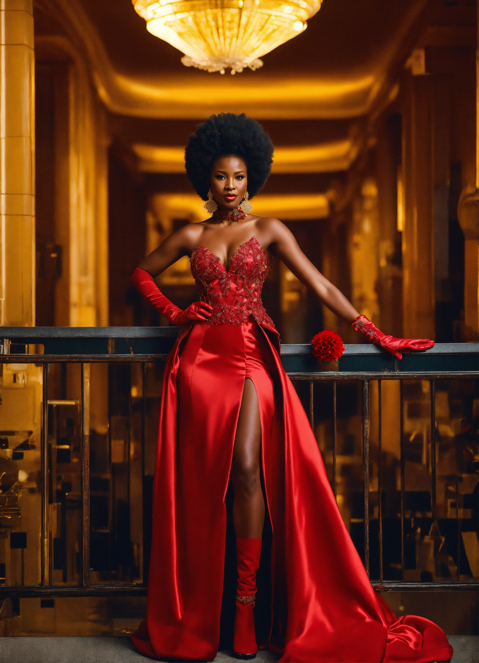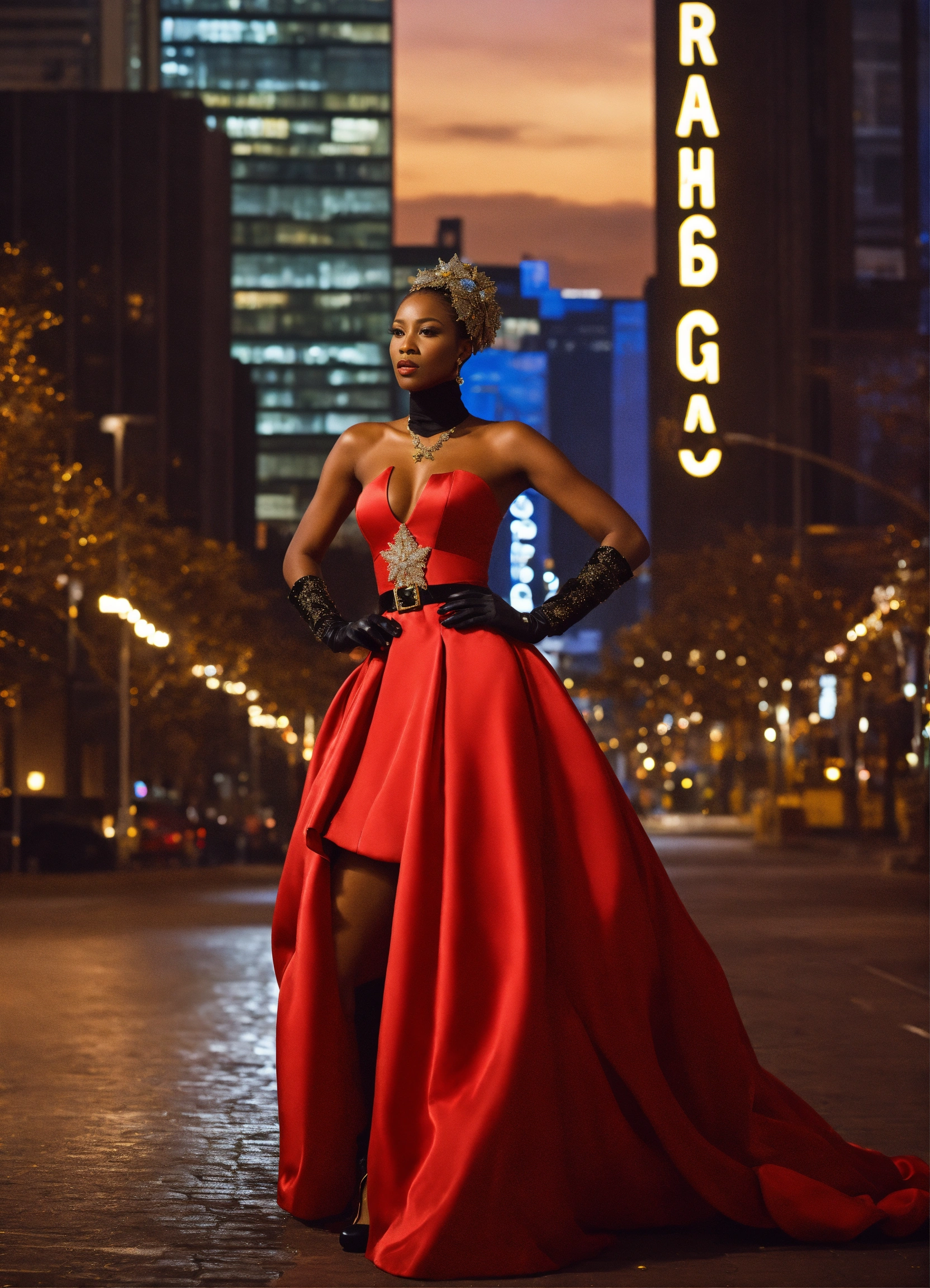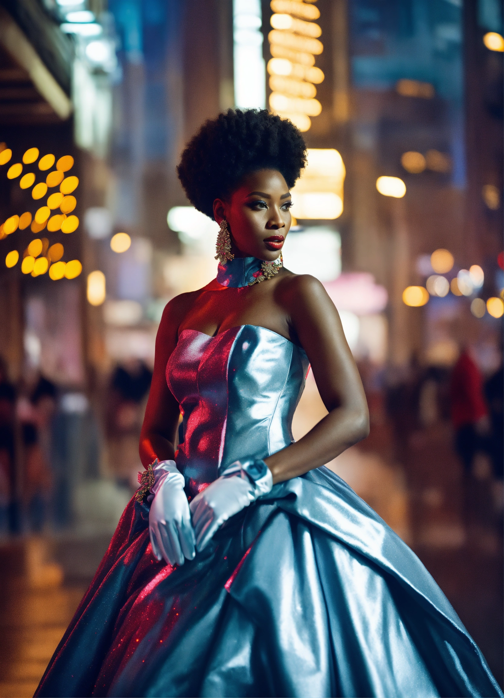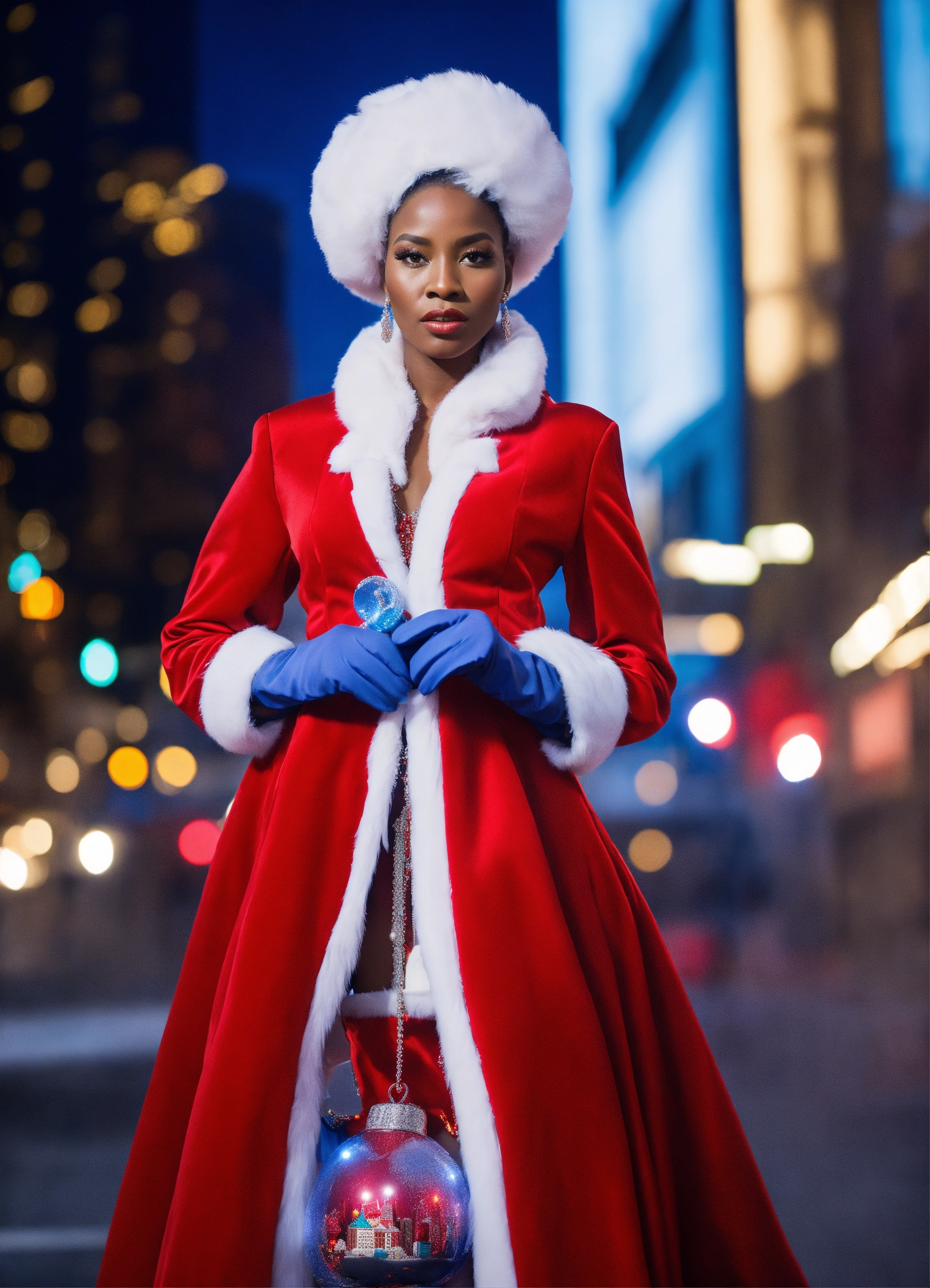 A extremely beautiful modern african american mrs. santa claus, wearing evening gown and gloves, inspired by balenciaga, in a futuristic city.
