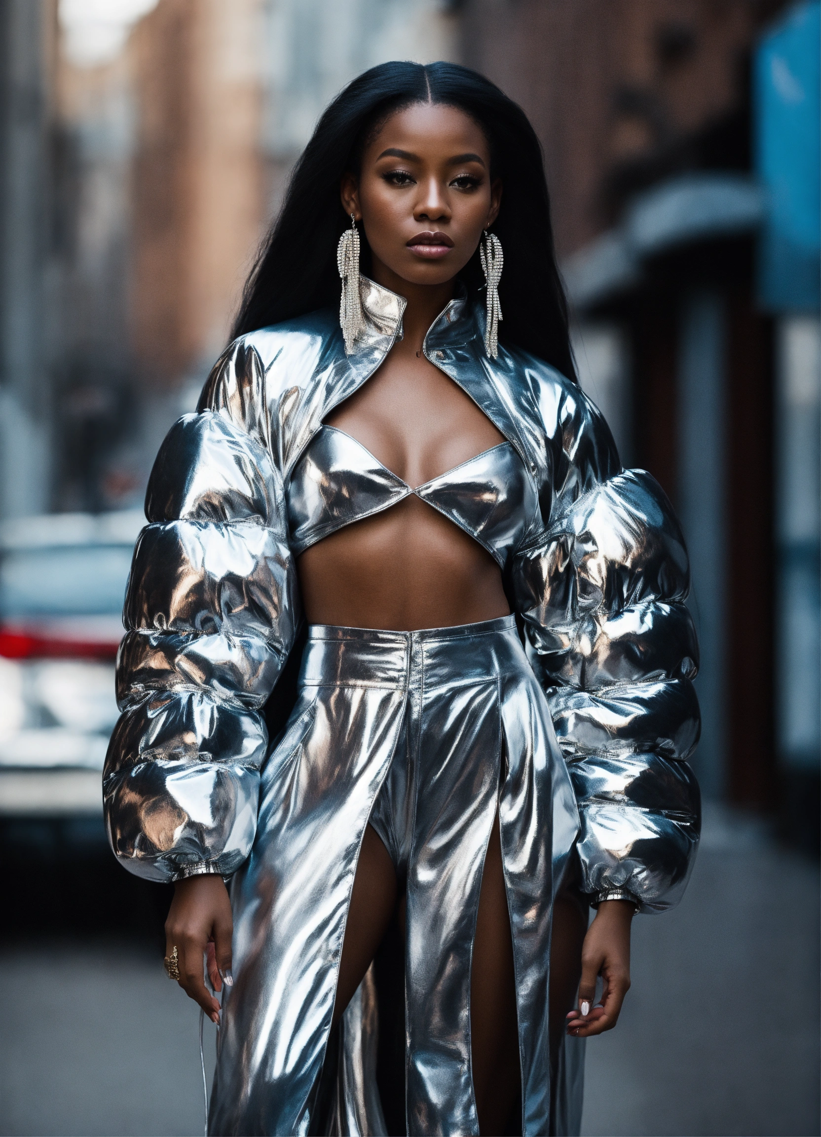 Black woman, in silver high fashion street wear with puffer sleeves, avant-garde, long flowing hair, edgy sleek styling, photography