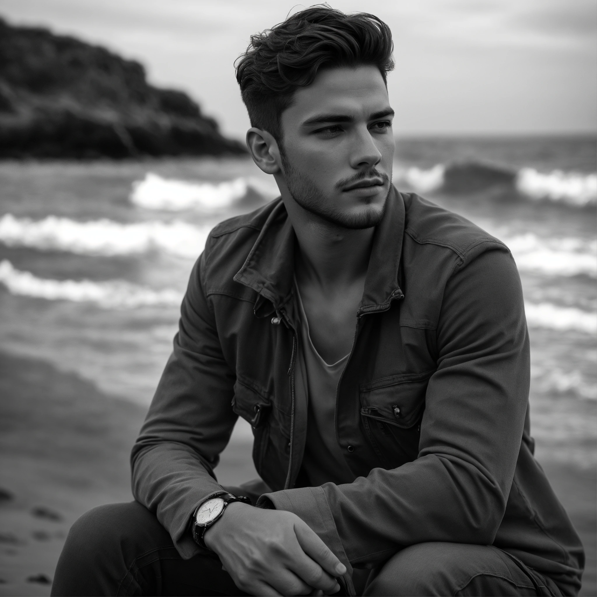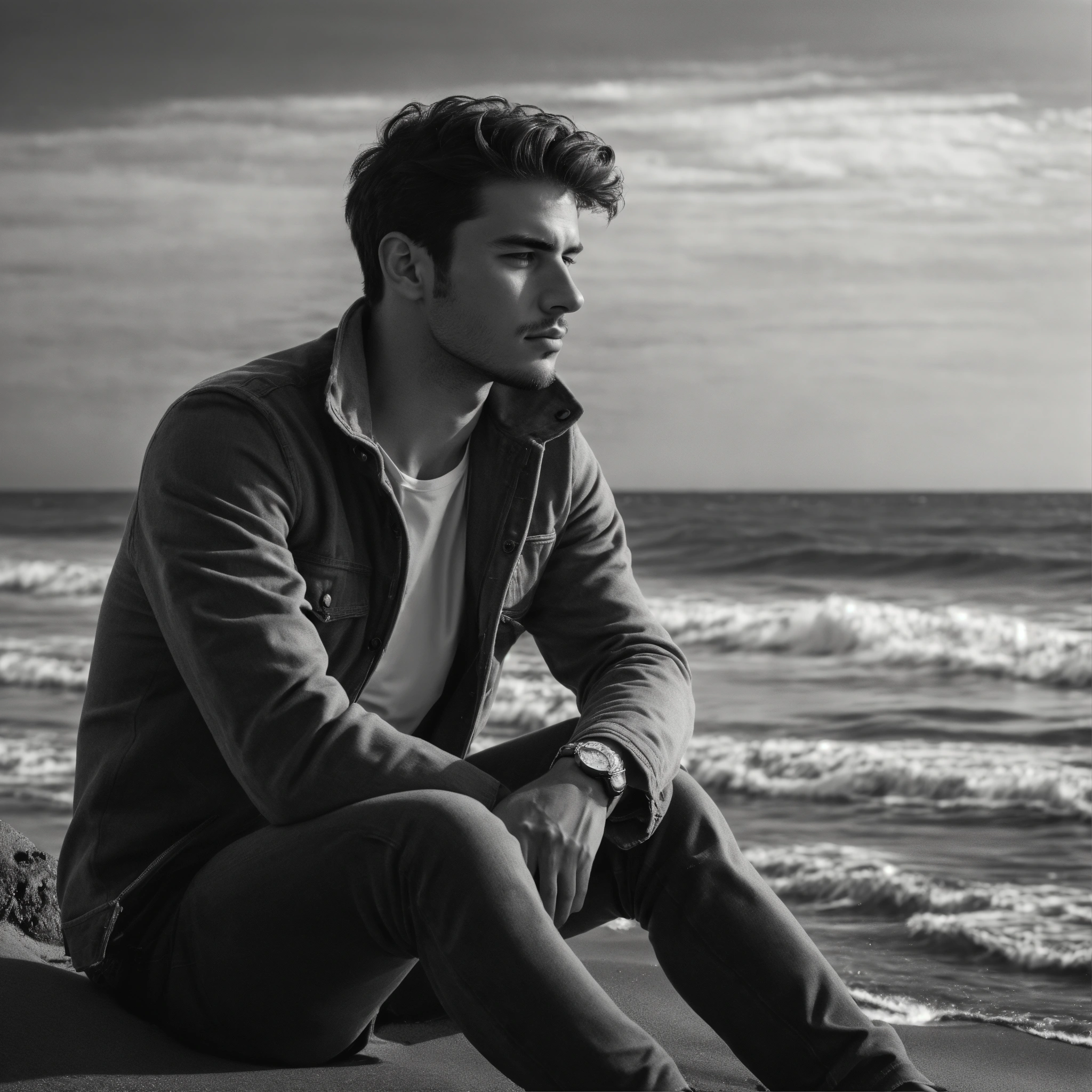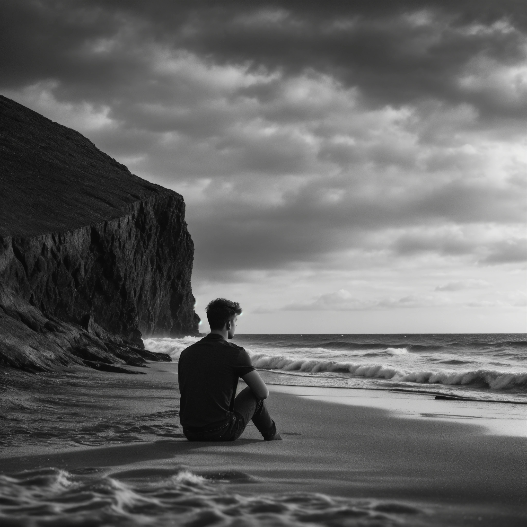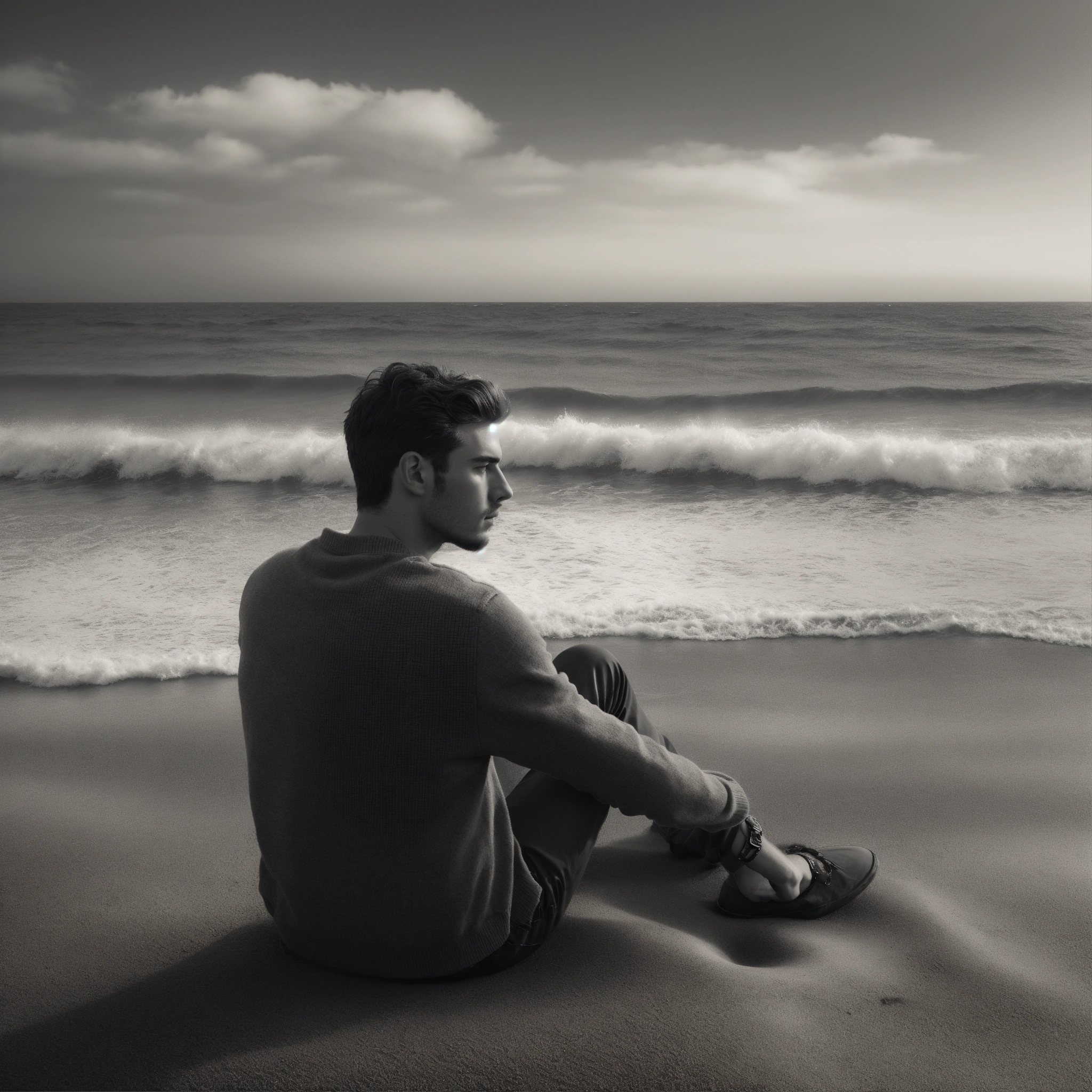 Photorealistic, b&w, grey shades, young handsome man sitting on a beach, watching the waves, in thoughts, thinkful, sad, watching the camera, detailed, 8k, q2