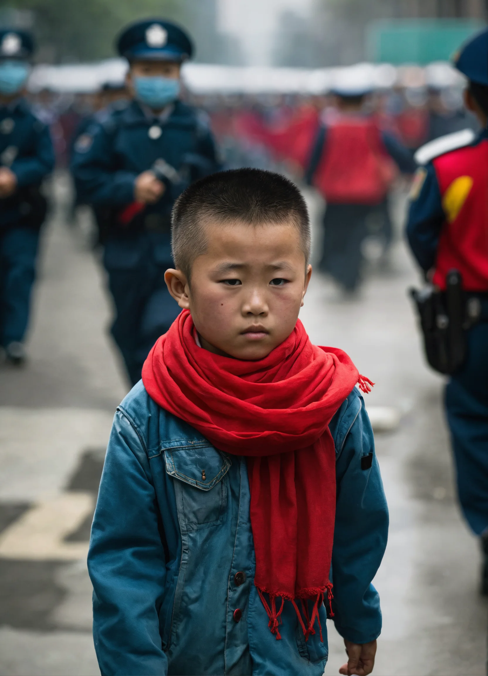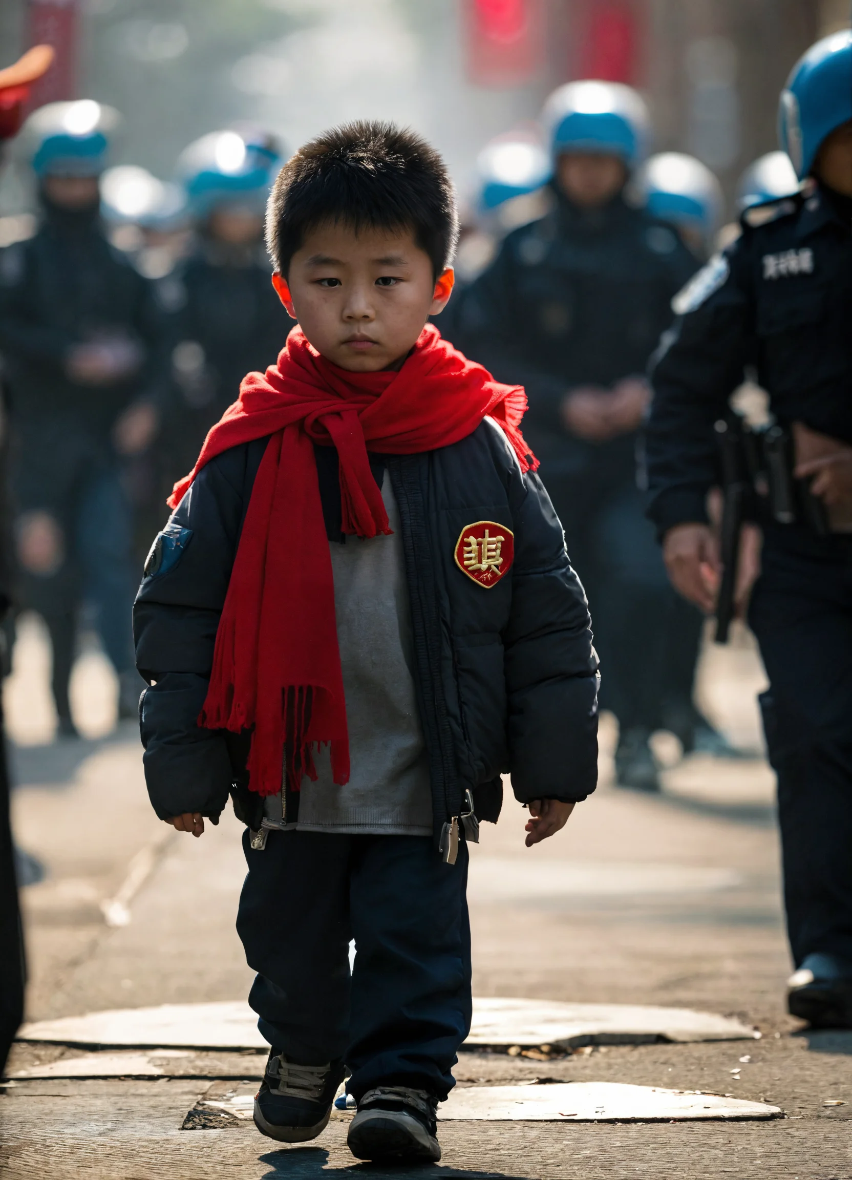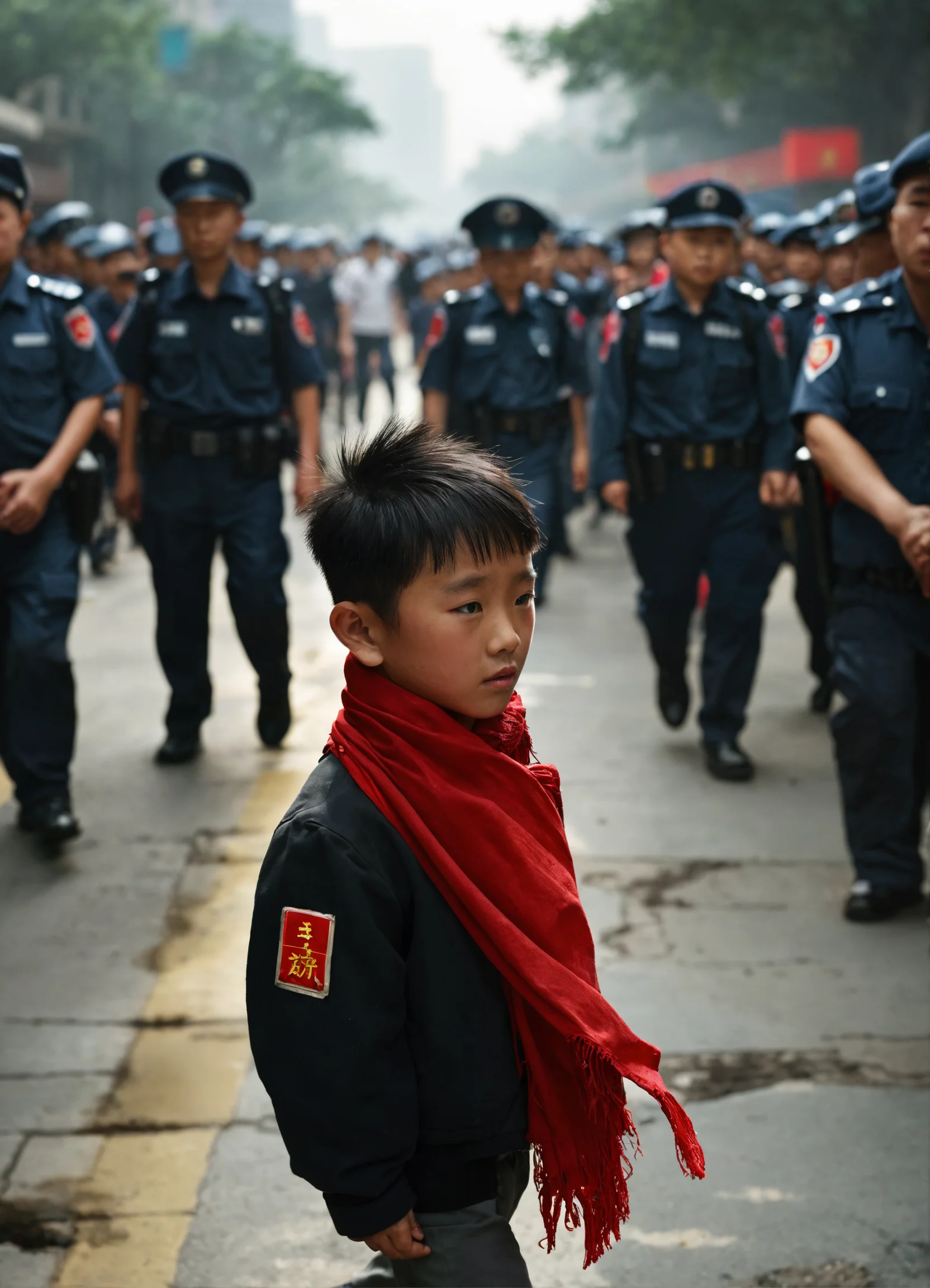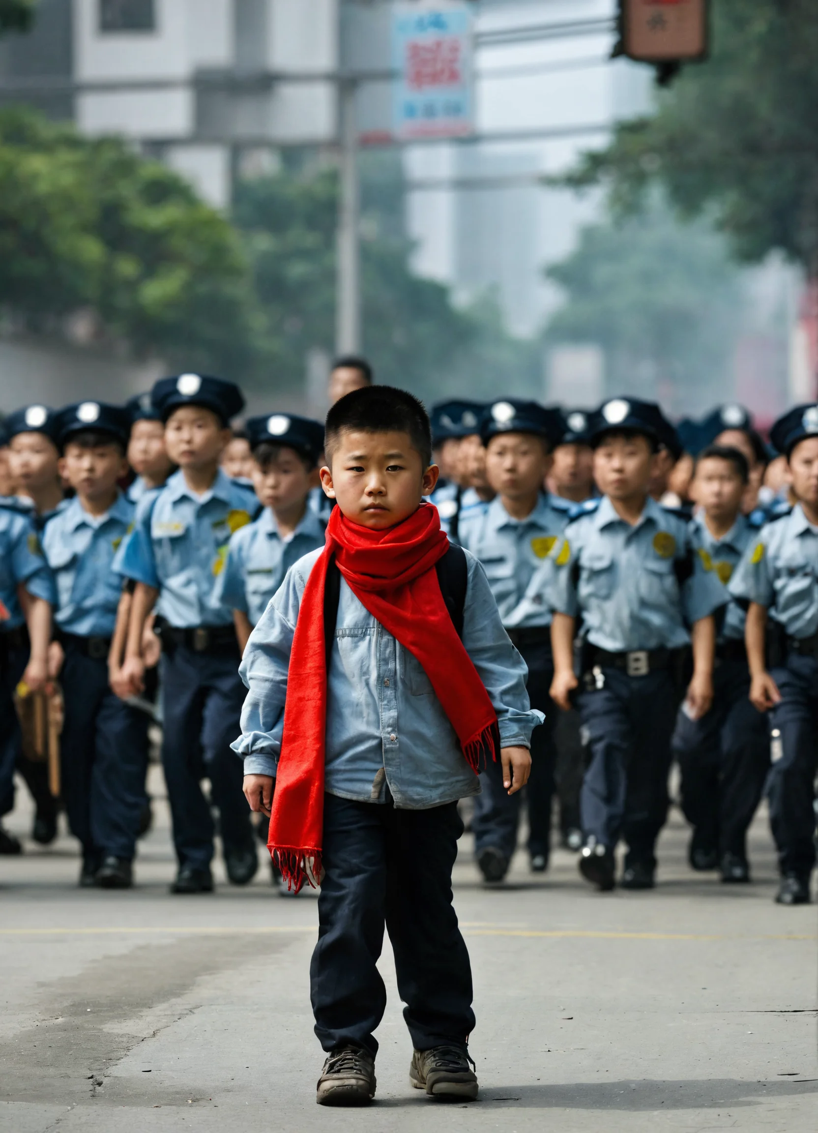 A chinese elementary school student, wearing a red scarf, walks alone on the street, without any other children following, surrounded only by many police officers and bodyguards behind and around him.