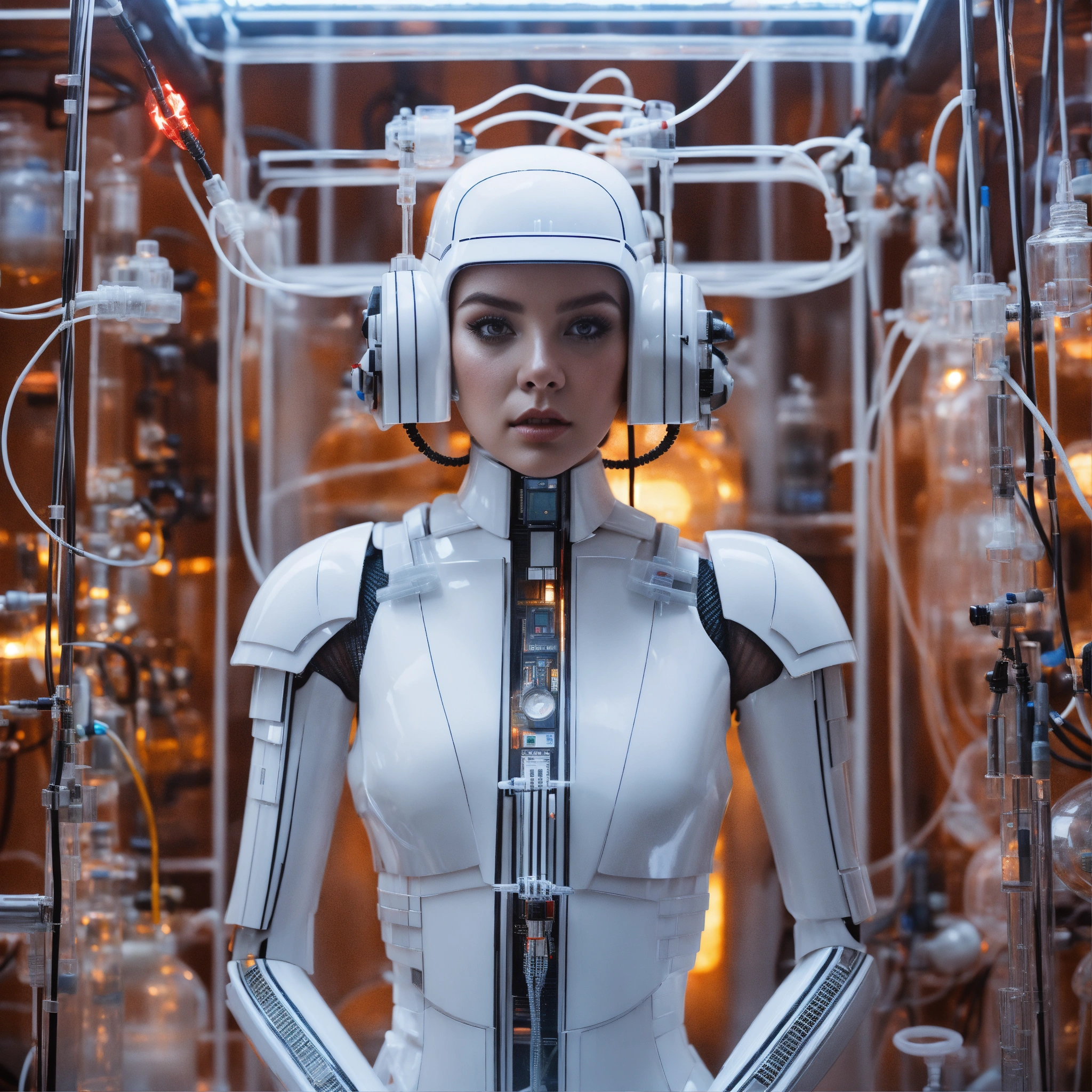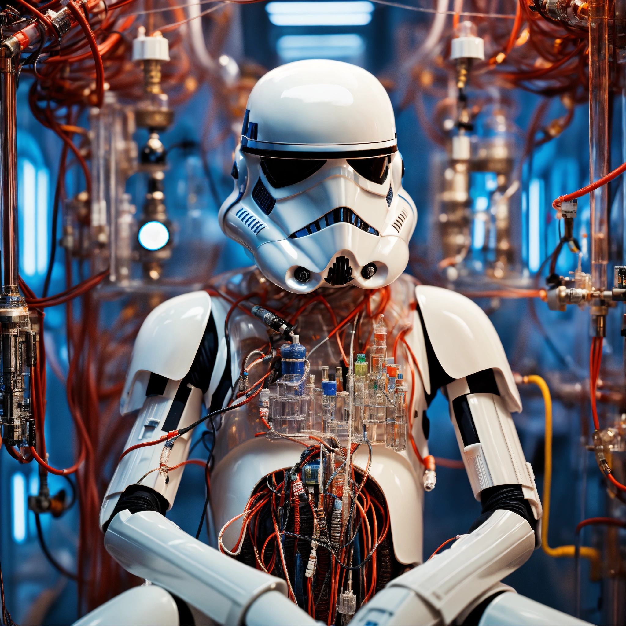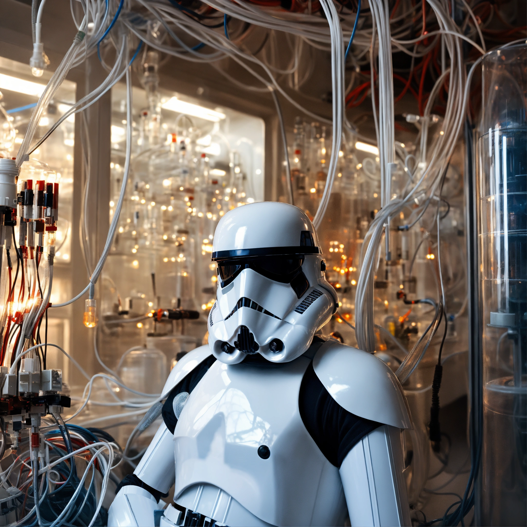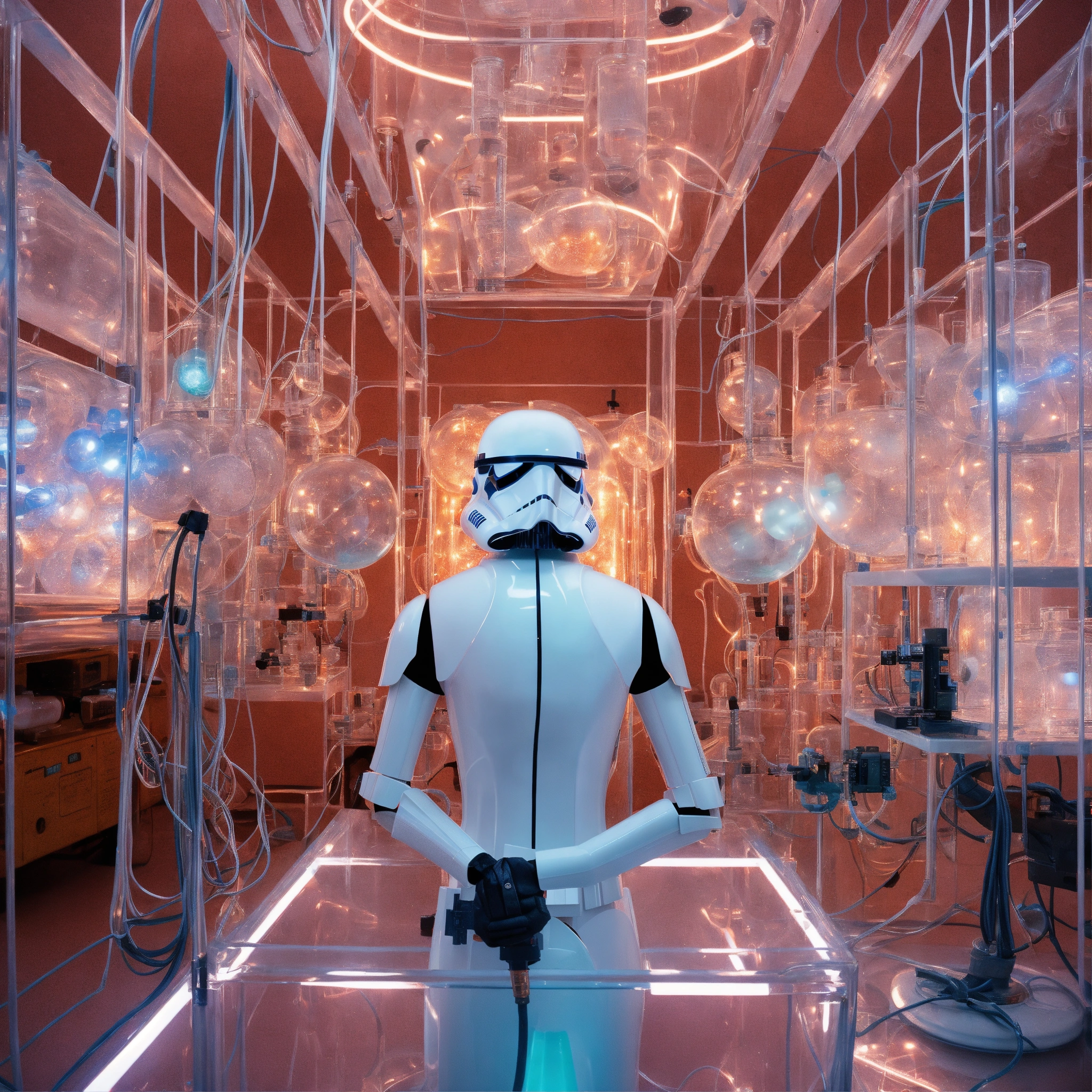 Close up portrait photography, transparent white plexiglass starwars stormtrooper in an alchemistic laboratory in a full of cables and wires and led, an attractive, 80 degree view, art by sergio lopez, natalie shau, james jean and salvador dali