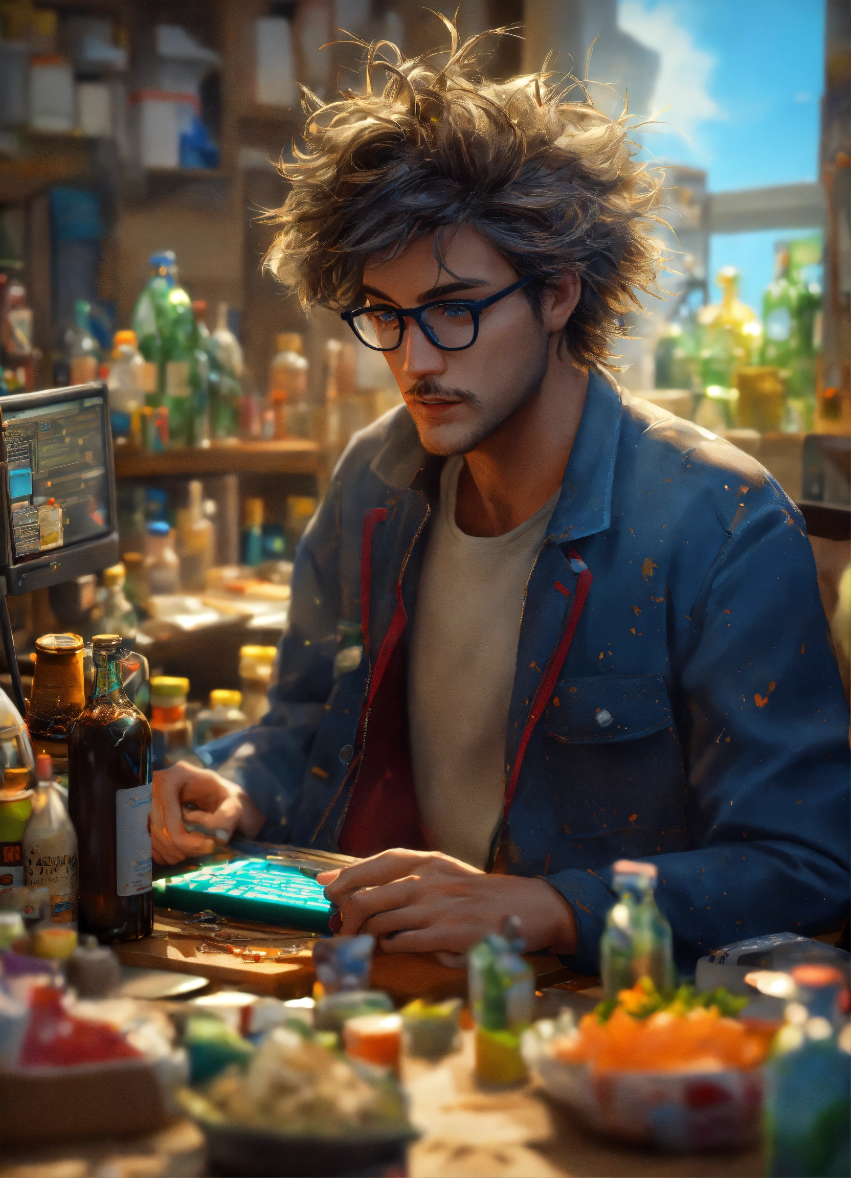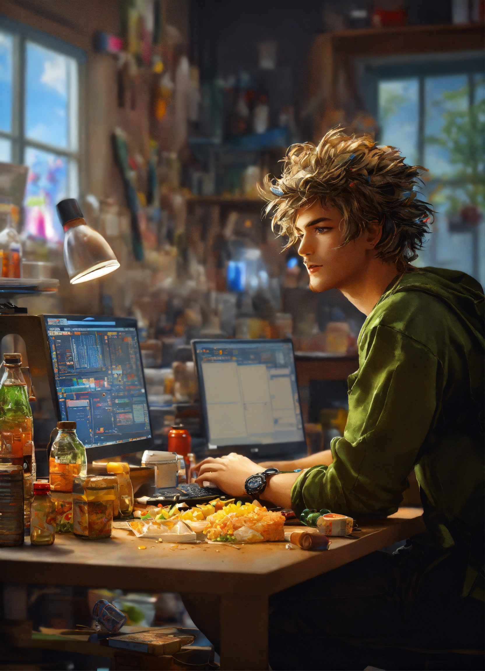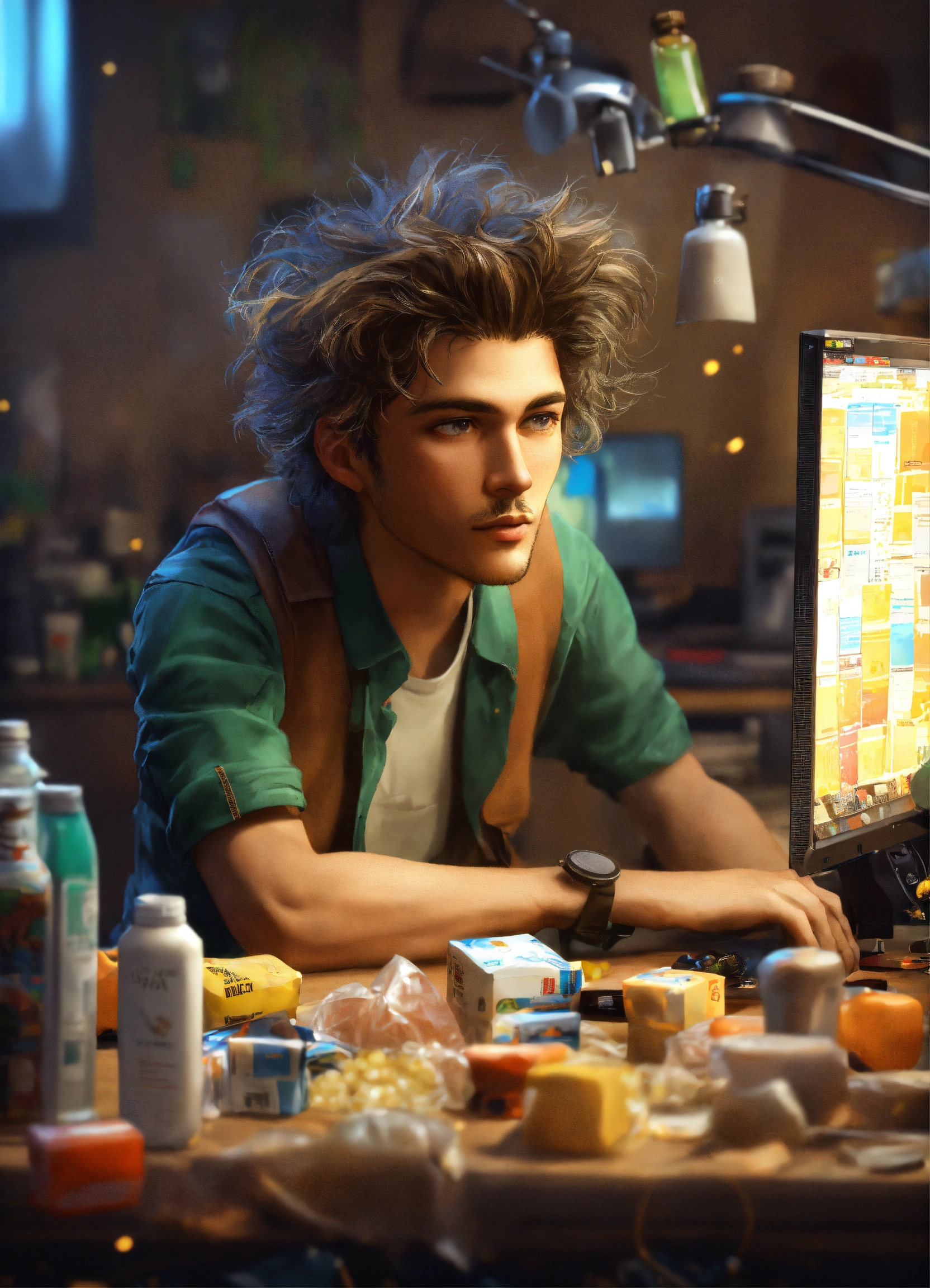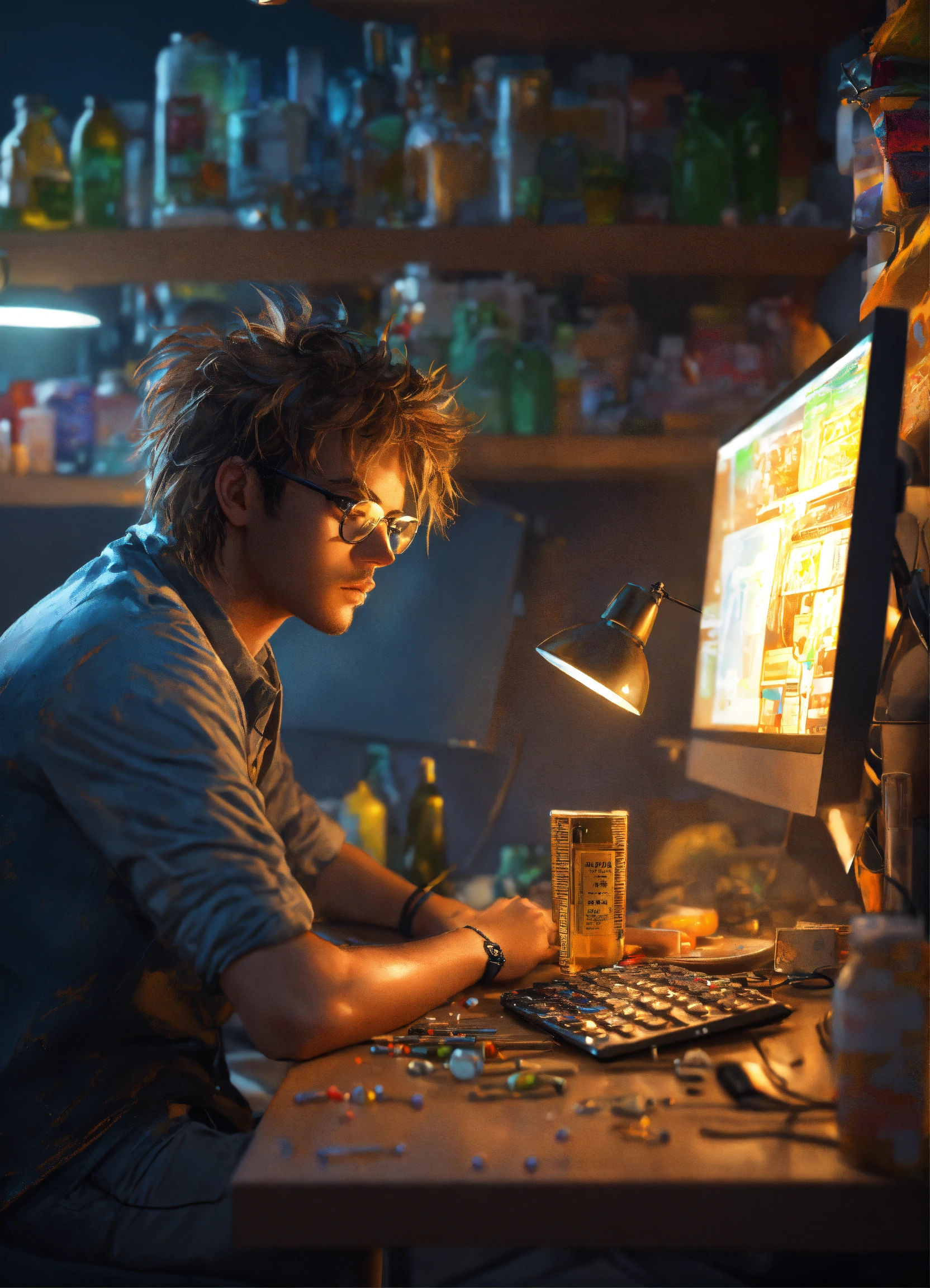 Masterpiece, best quality, (funny programmer with tousled hair1.2), (sits at a computer1.2), (empty bottles and food packages on the table1.1), incredible detail, highly detailed, composition, ultra-detailed, light leaks, trending on artstation, sharp focus, absurdres