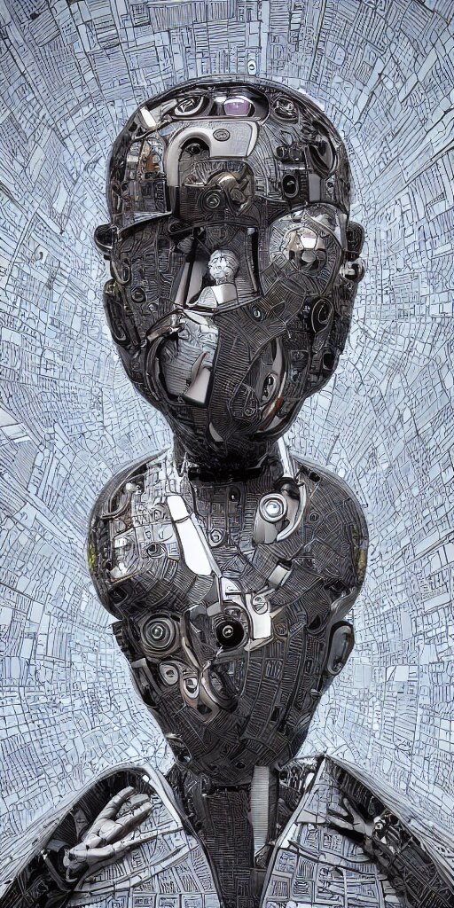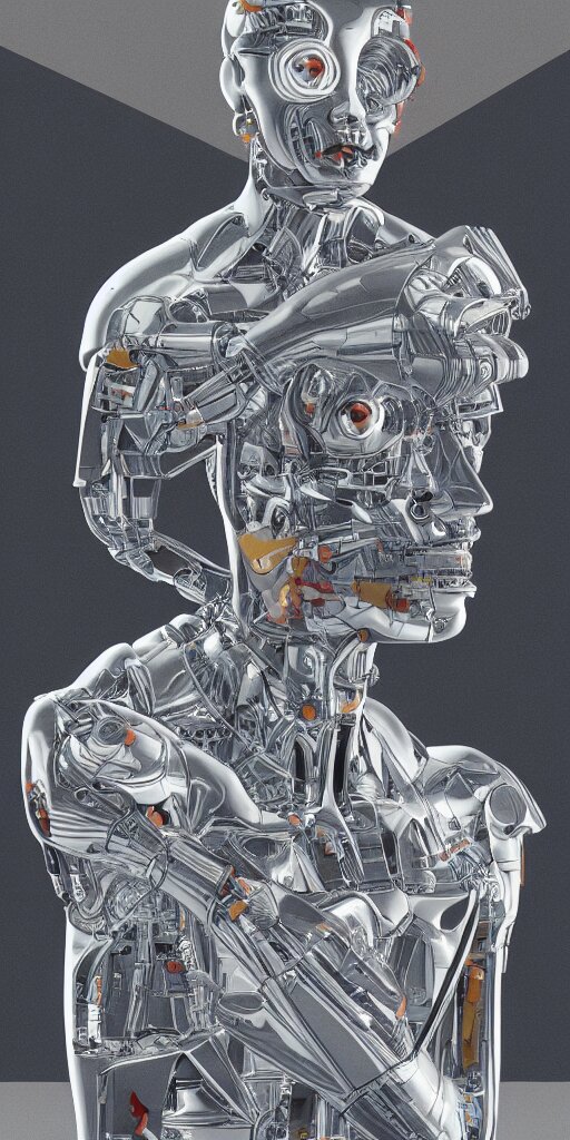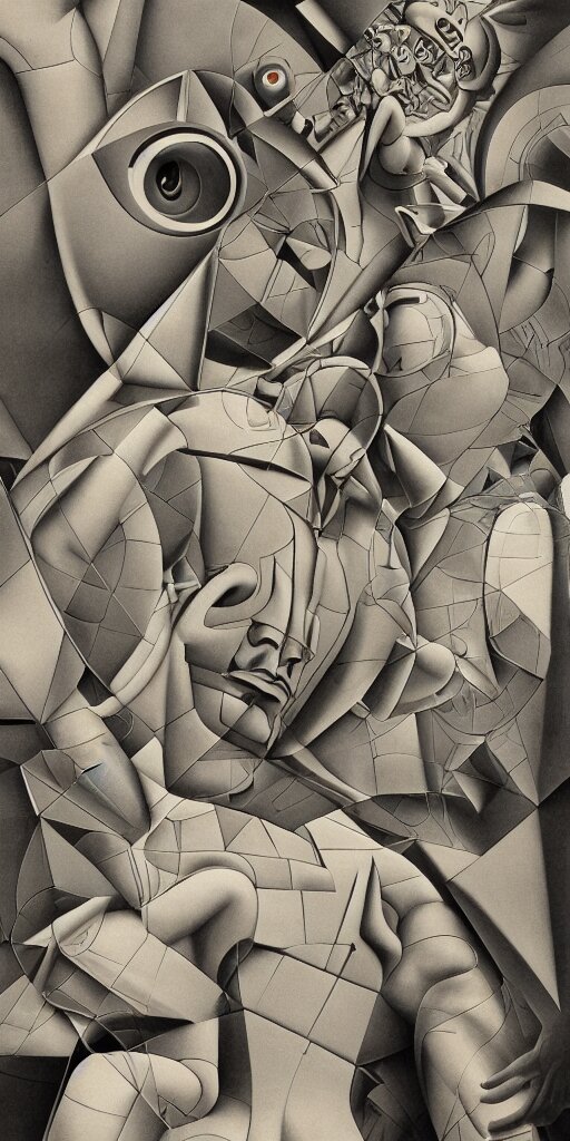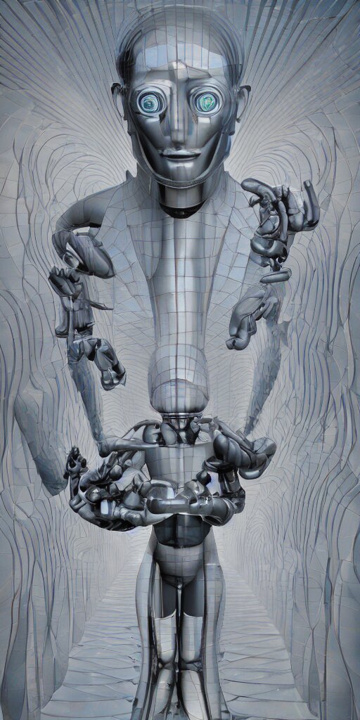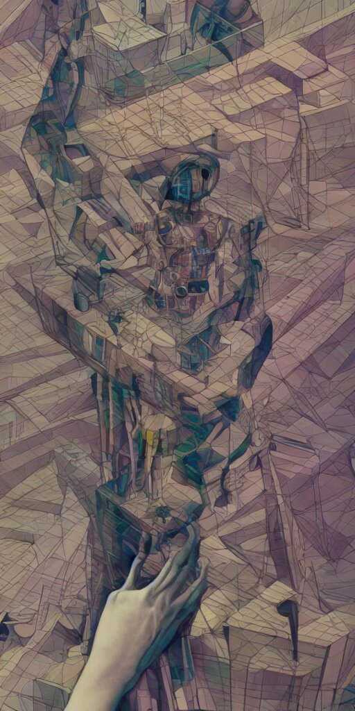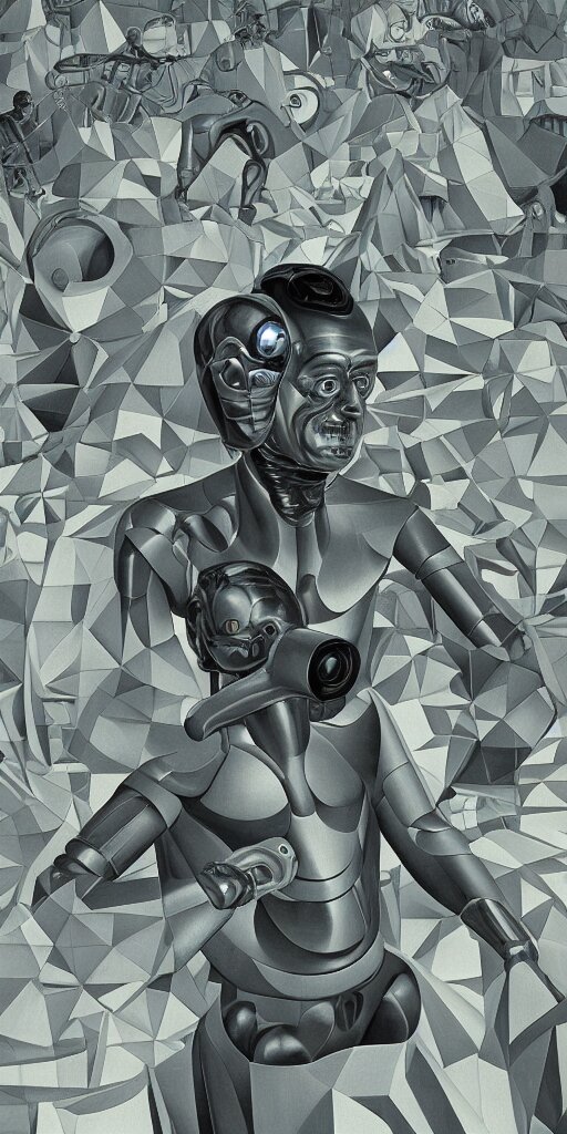Modern man being morphed into future trans human cybernetic man, basil wolverton, high detail, studio ghibli, mc escher, picasso, dali, muted colors, cubism, octane render