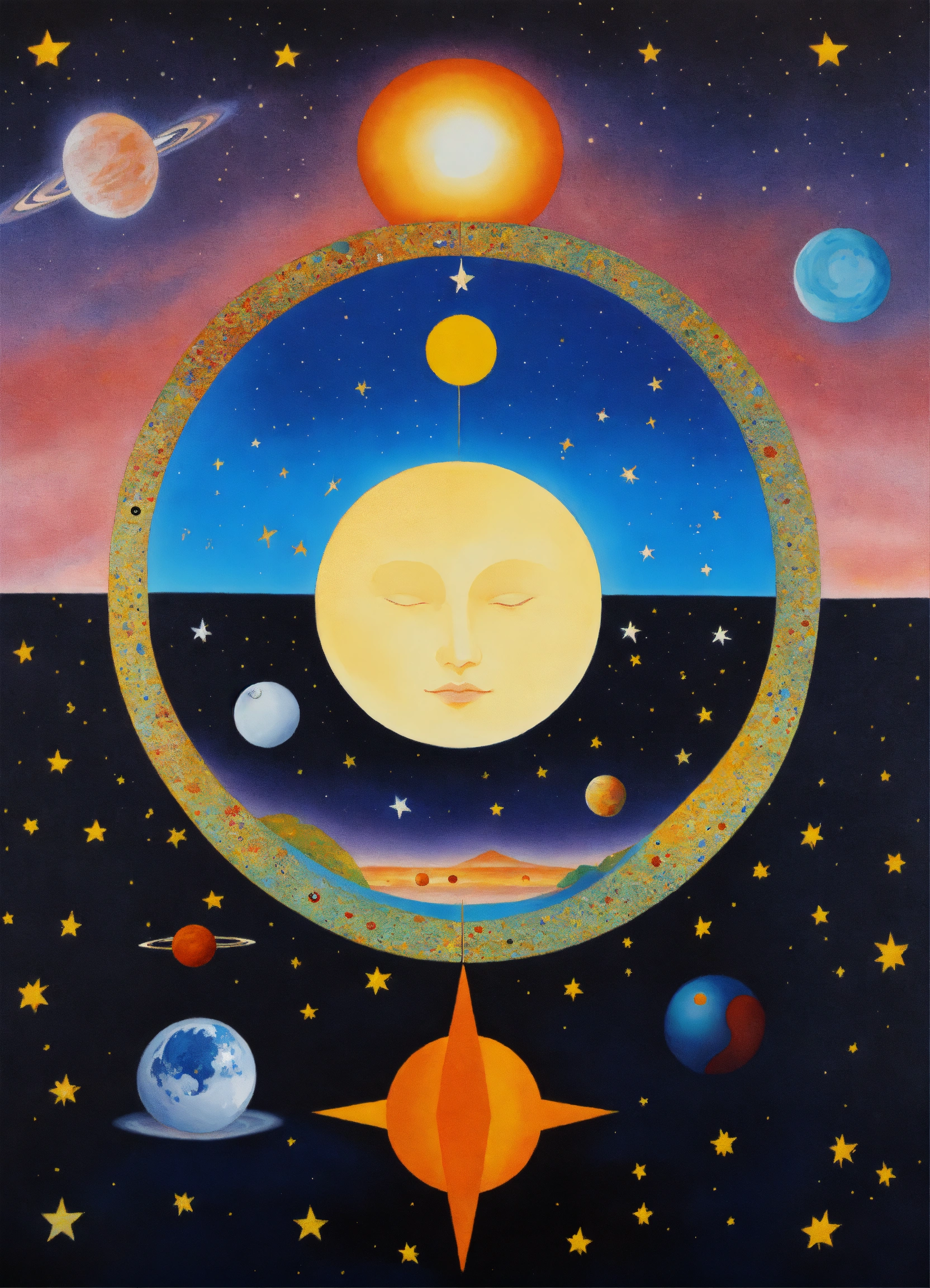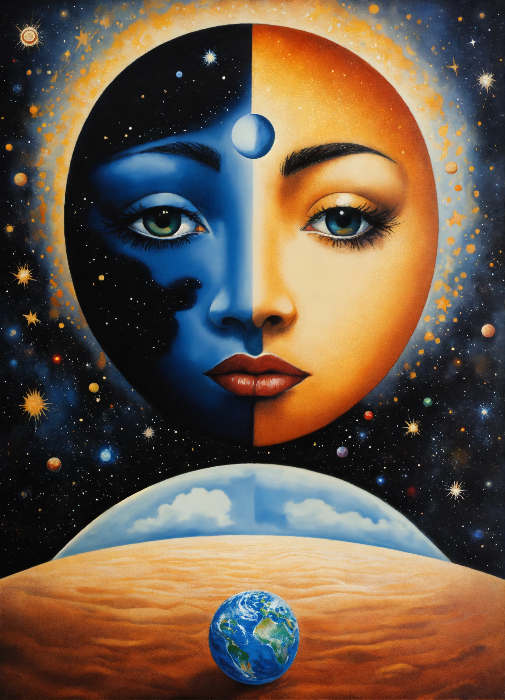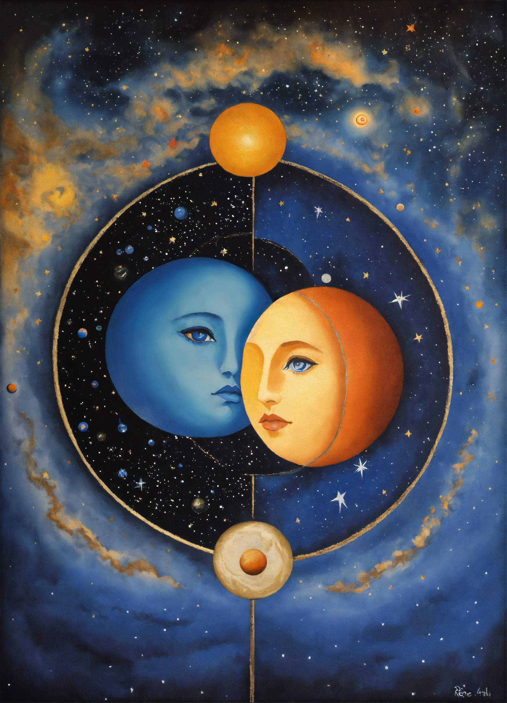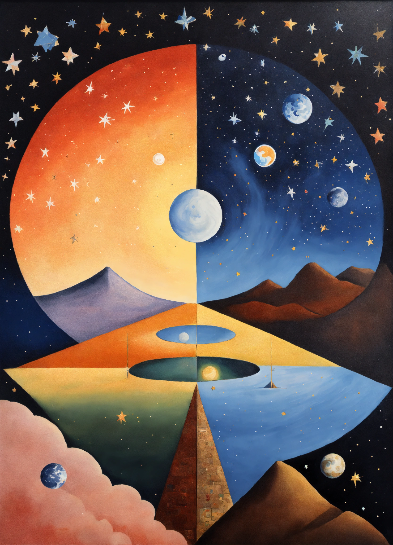 Yin and yang, night and day, 4 corners of the universe painted rene margritte, stars and planets indigenous people, symmetrical, star child
