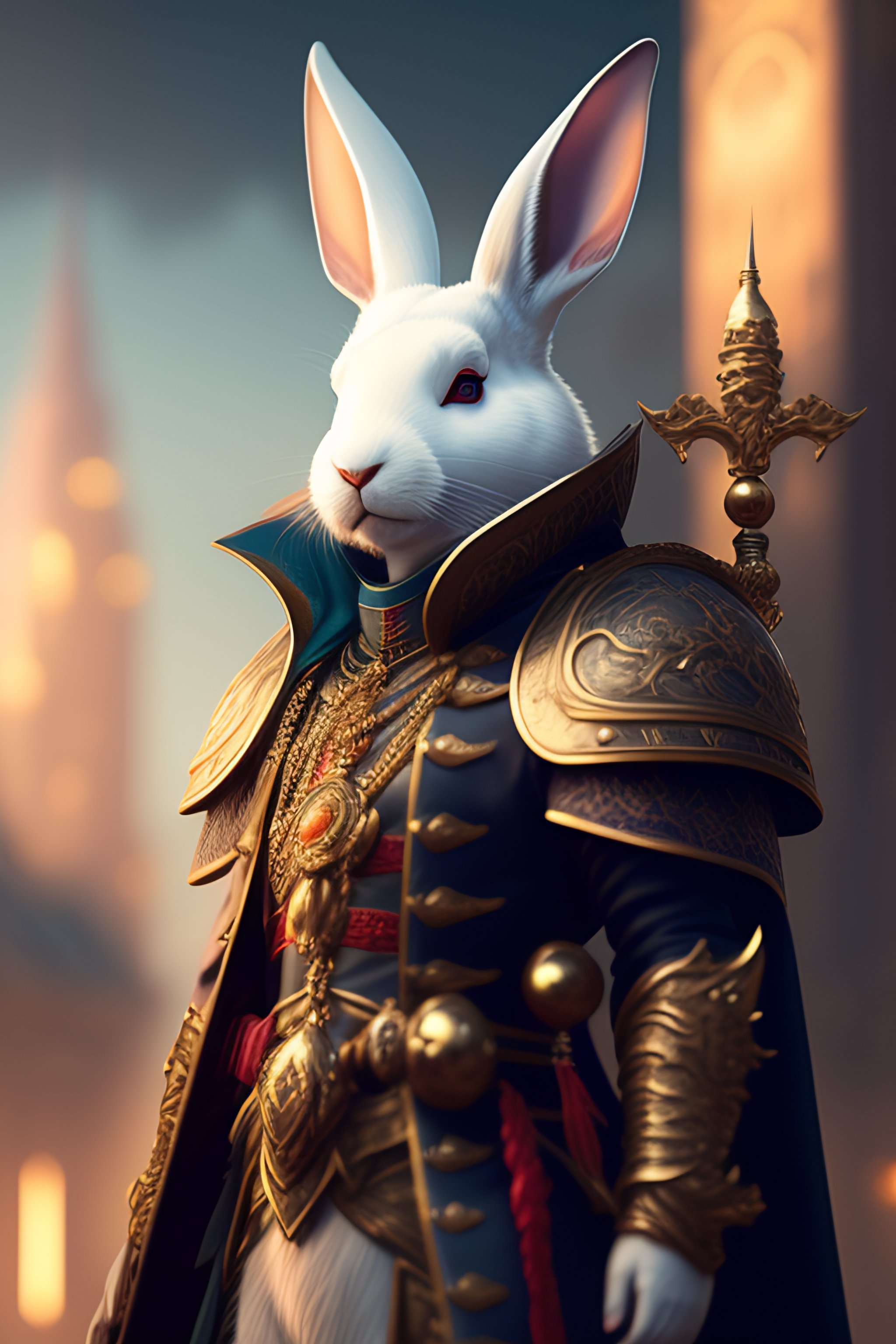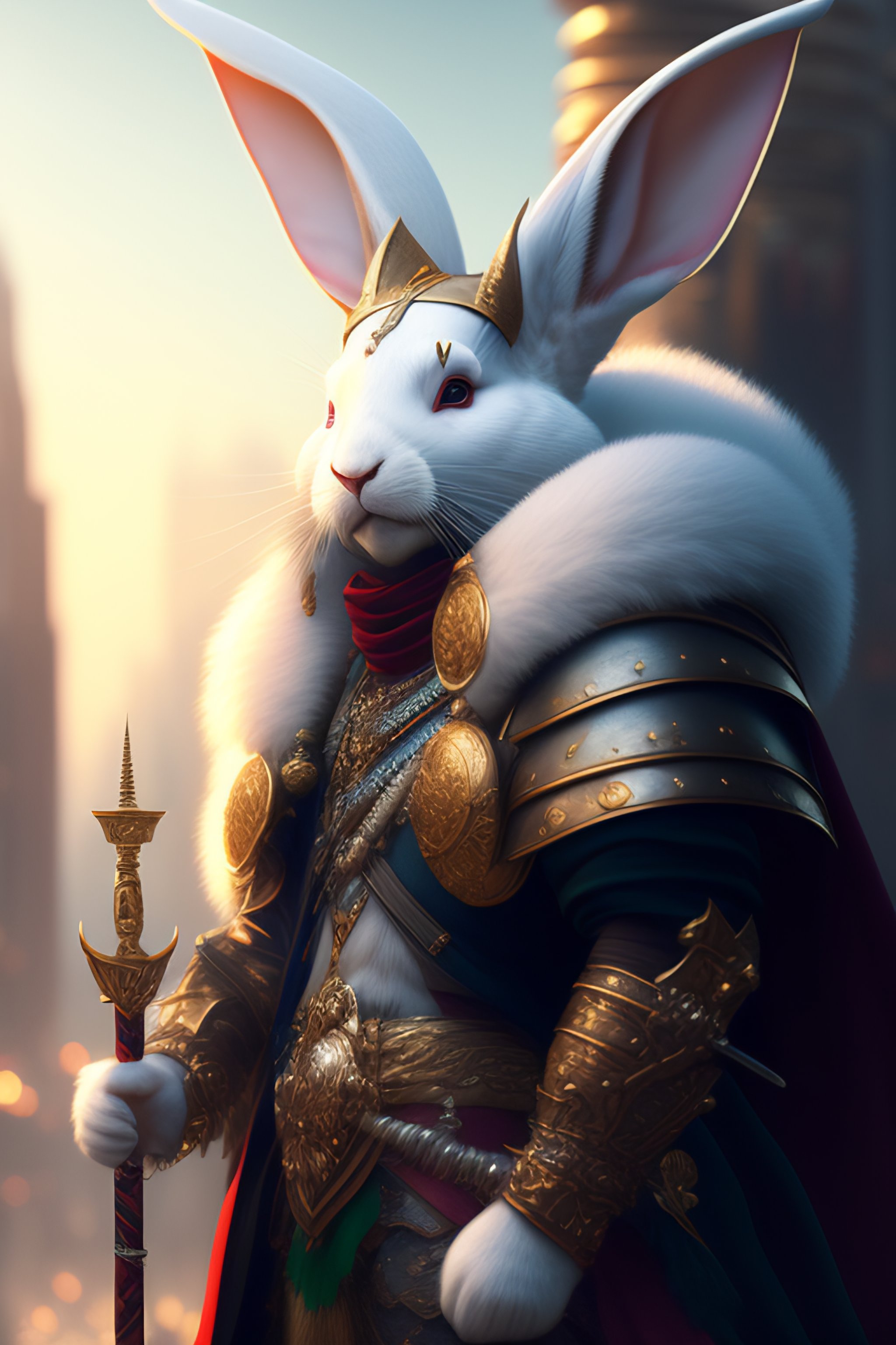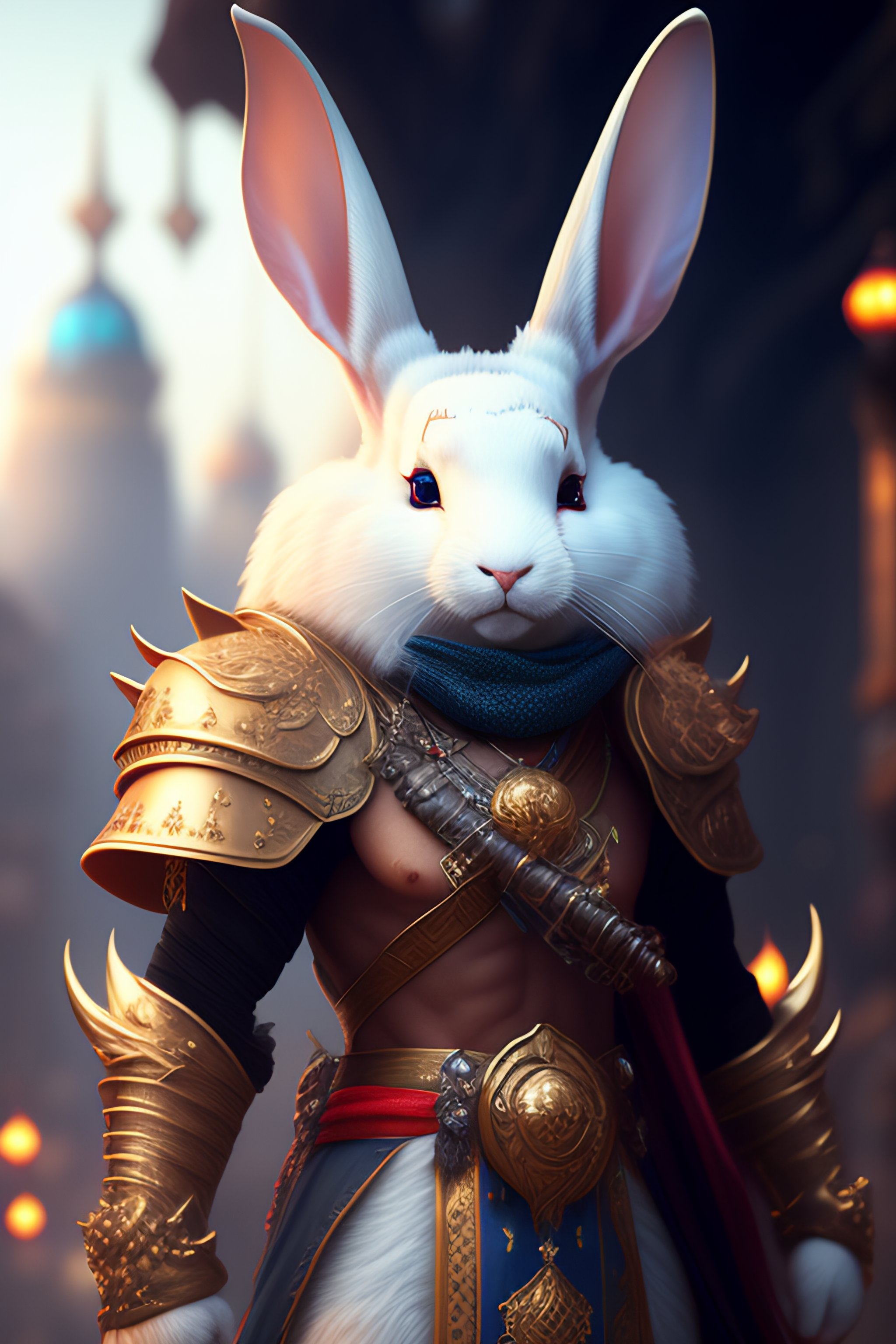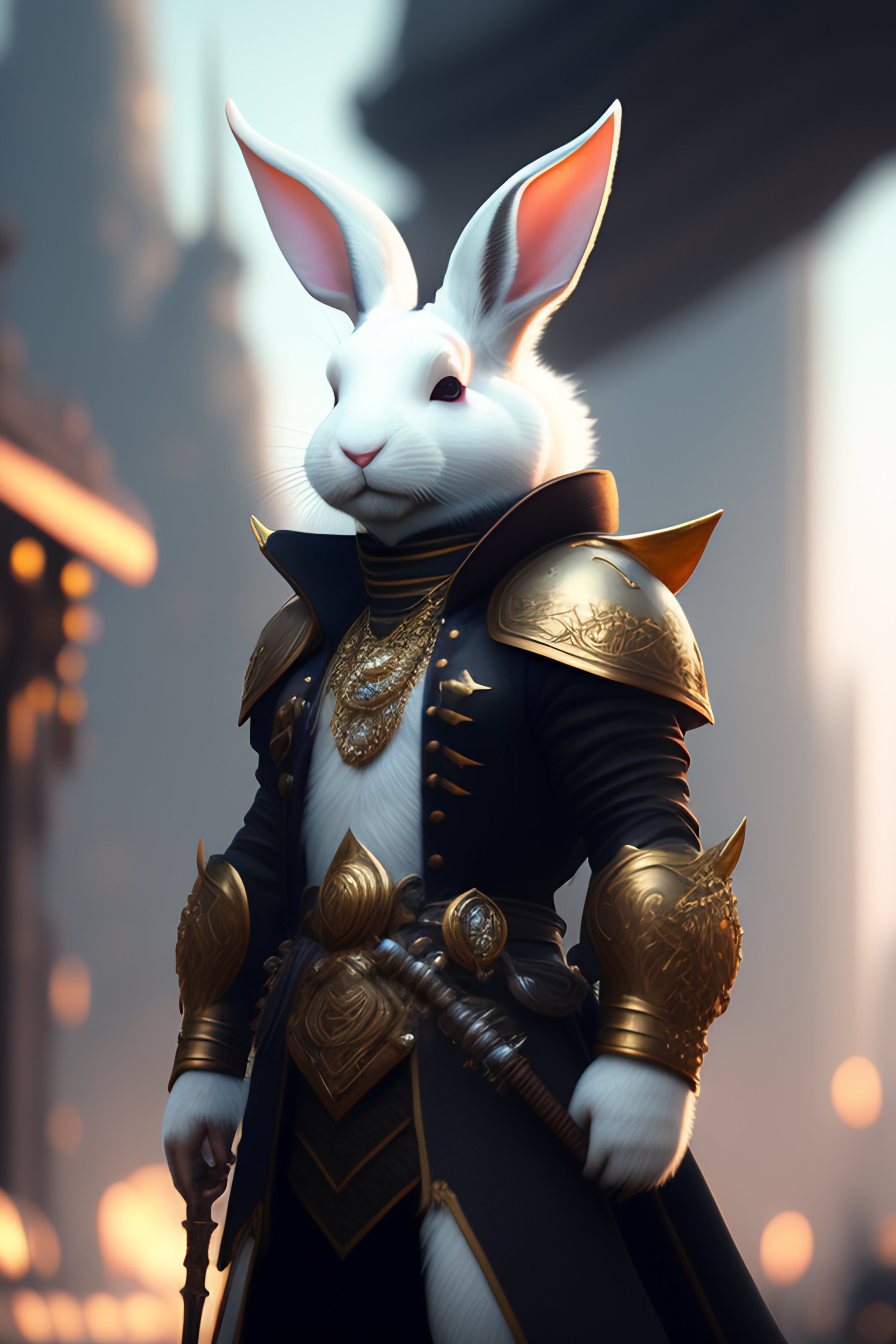 An anthropomorphic white rabbit with a human face, a male wizard face, dressed as a punked warrior, with weapons, a city background, fine art, award-winning, intricate, elegant, sharp focus, cinematic lighting, highly detailed, digital painting, 8 k concept art, art by guweiz and z. w. gu, masterpiece, trending on artstation, 8 k