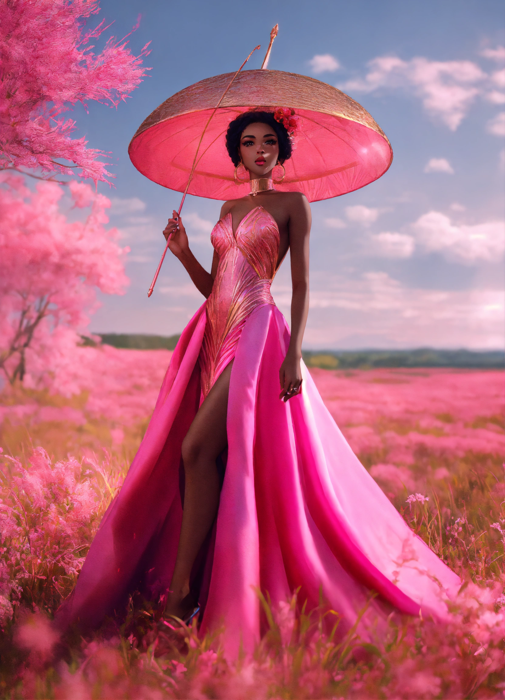 Pretty human looking alien, golden dark skin, african features, volumpious, in haute couture pink dress, and heels, in grassy field, bright sunny day, 8k, unreal engine.