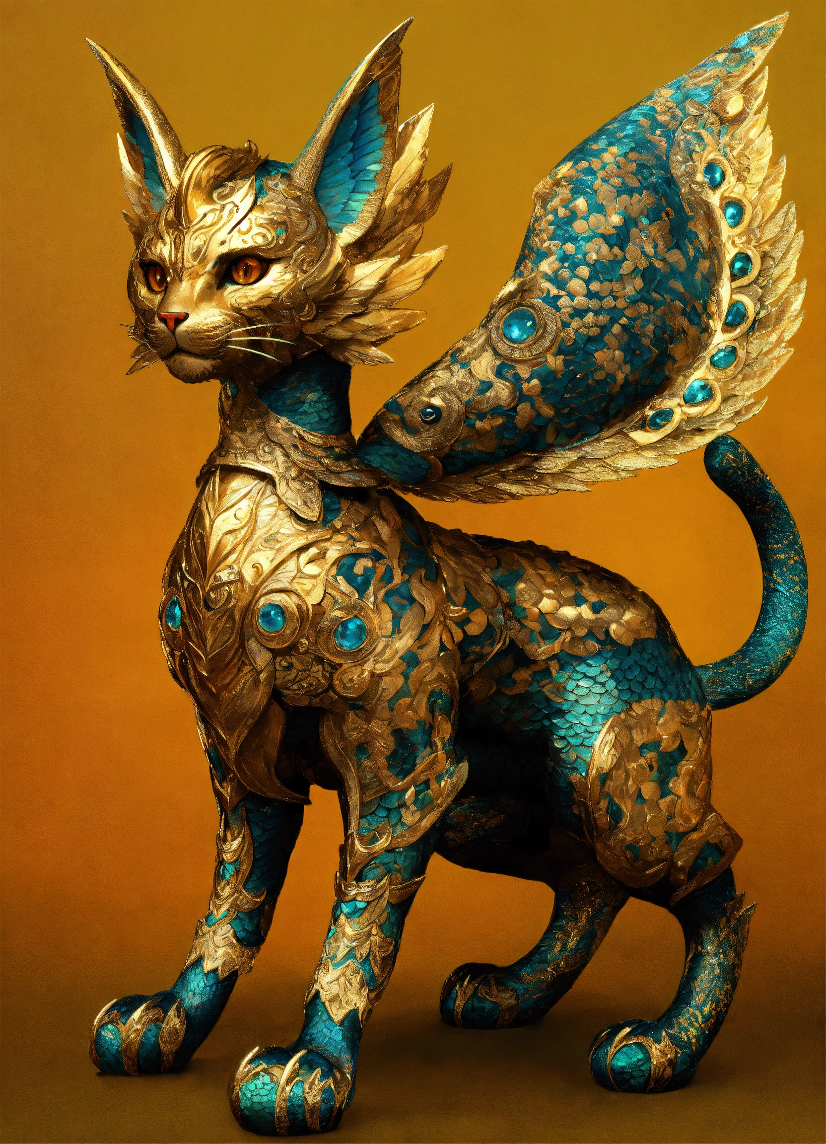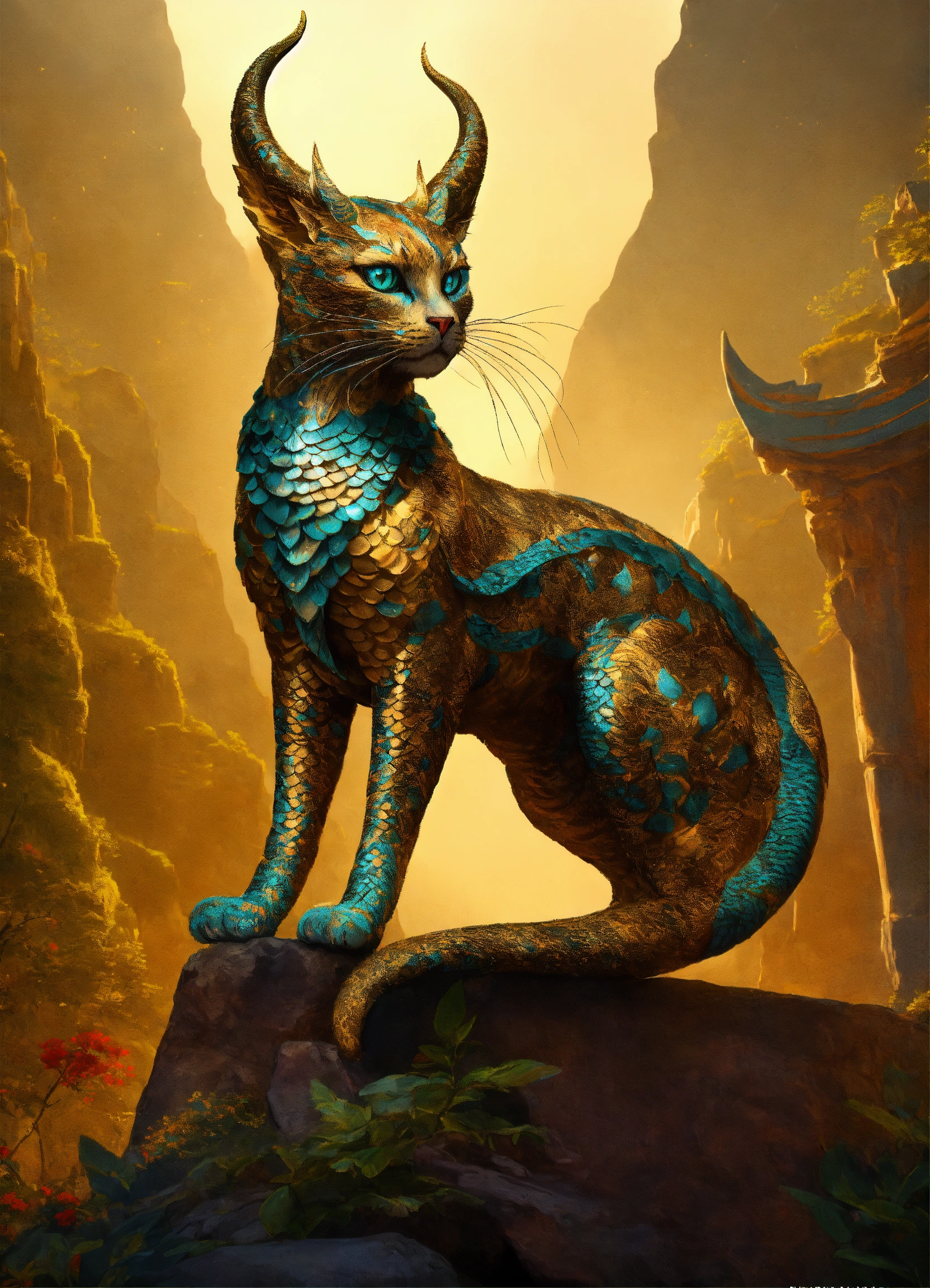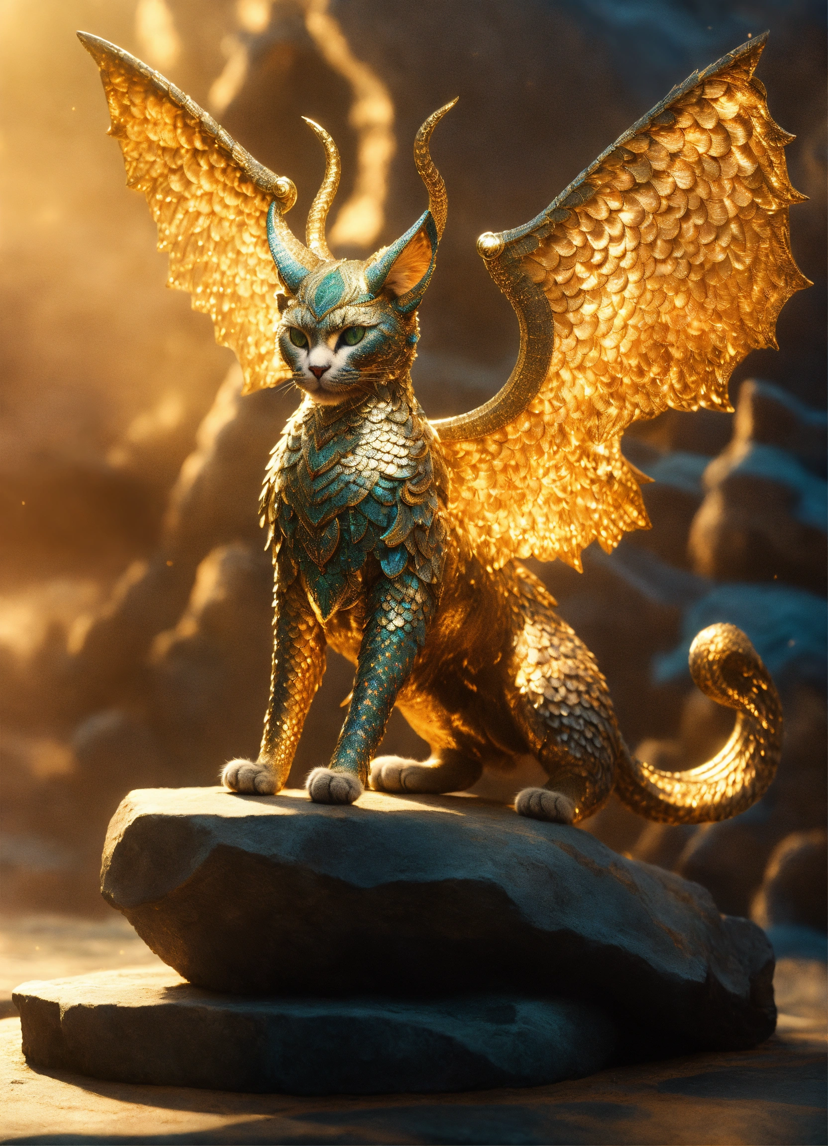 A cat like human with two legs, transforming into a mythical beast from the classic of mountains and seas, covered in scales, with radiant horns and wings, embodying boundless mystique. as the mythical beast from the classic of mountains and seas, this cat, adorned in scales with radiant horns and wings, personifies the timeless allure of ancient legends.