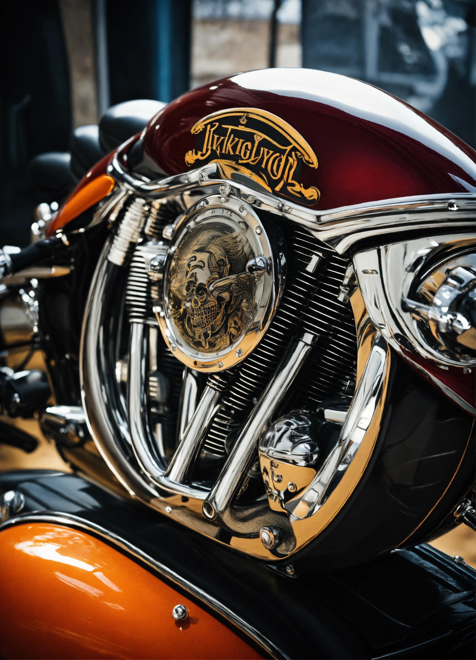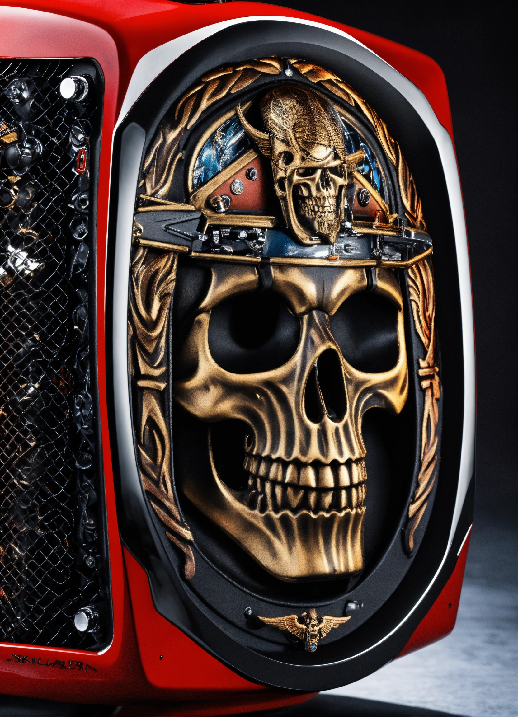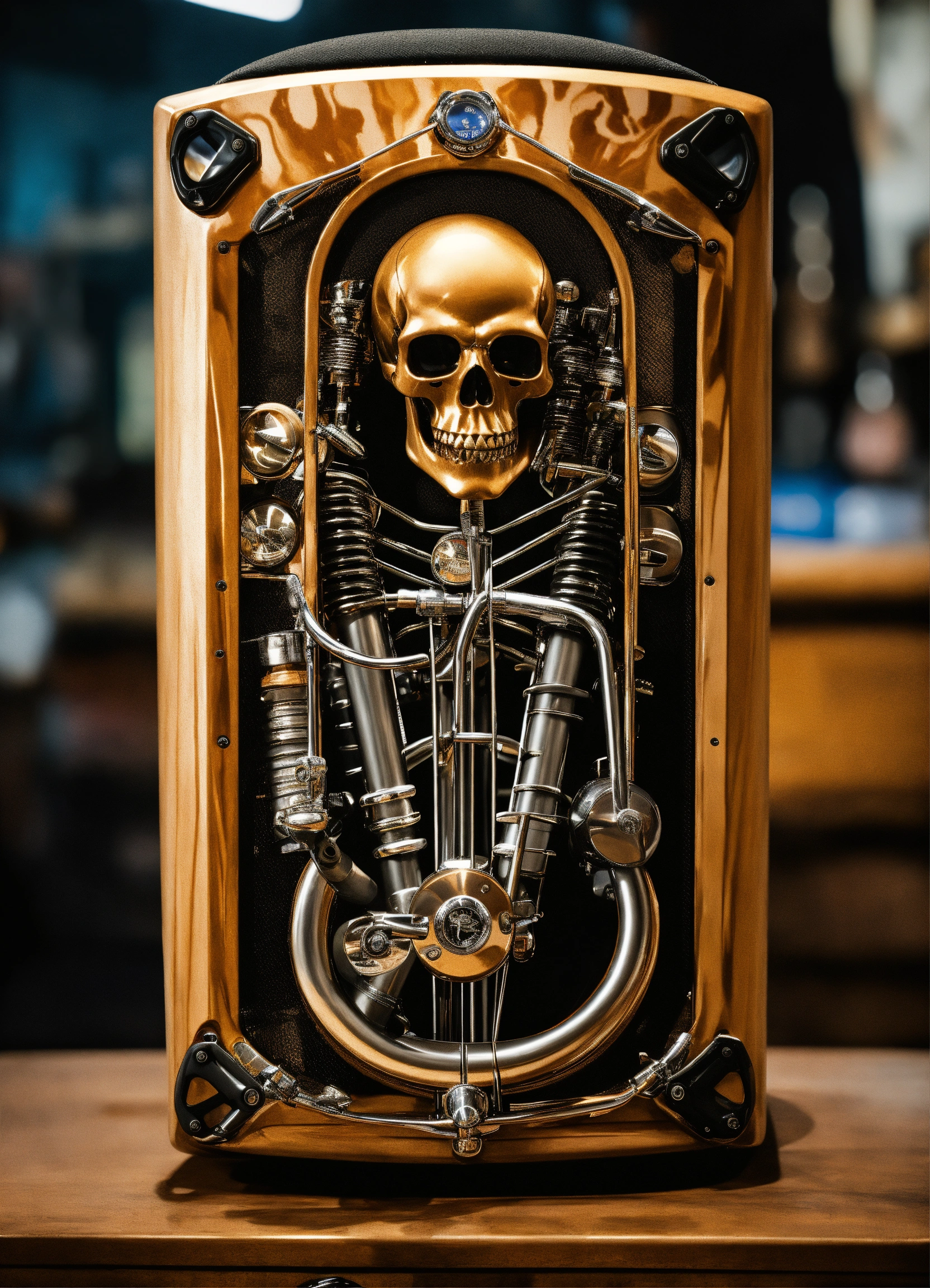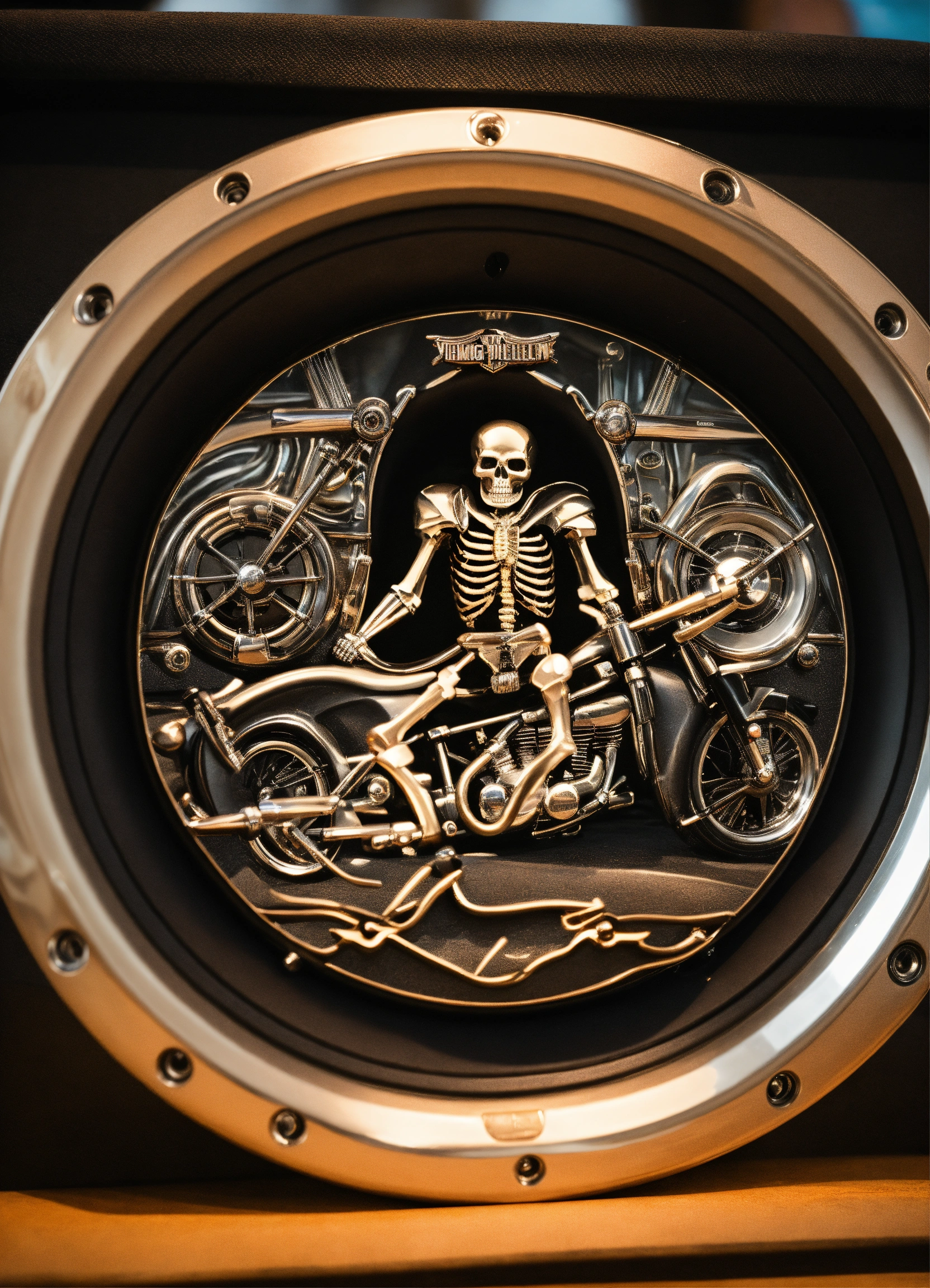 The side panel of a customized speaker, adorned with a photorealistic, image in stunning 32k ultra-definition of a viking skeleton biker, riding a harley-davidson motorcycle.