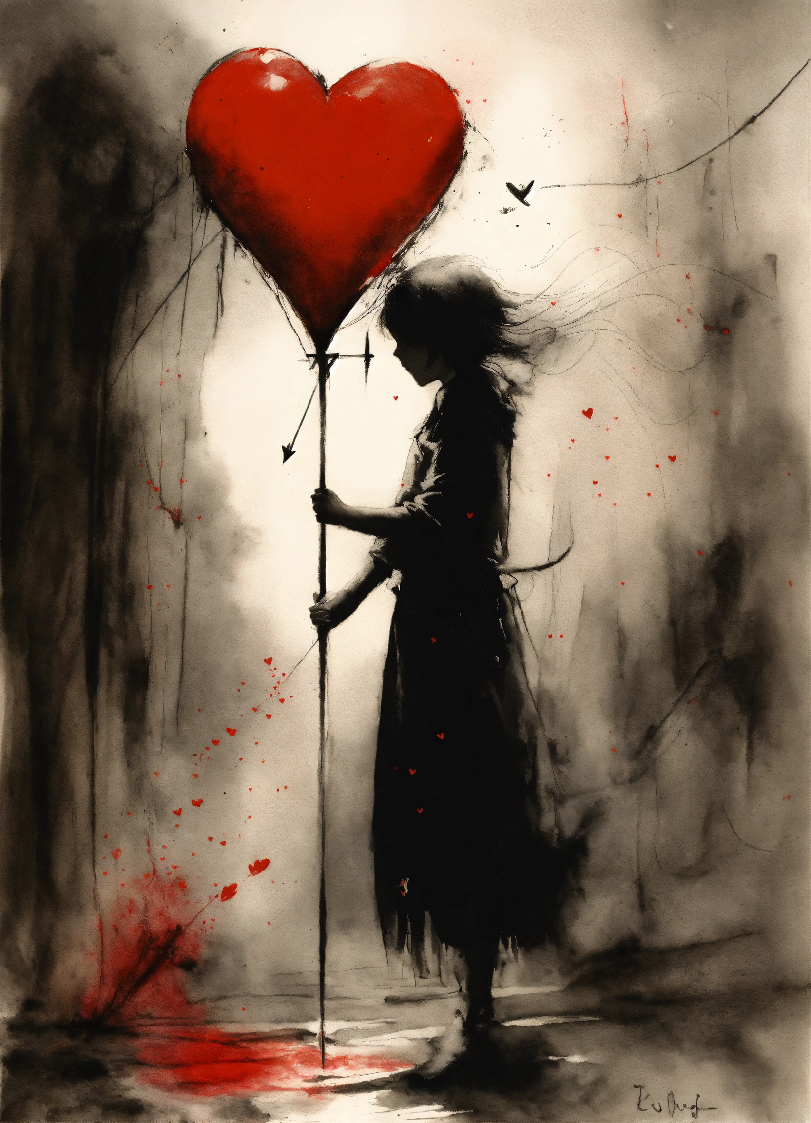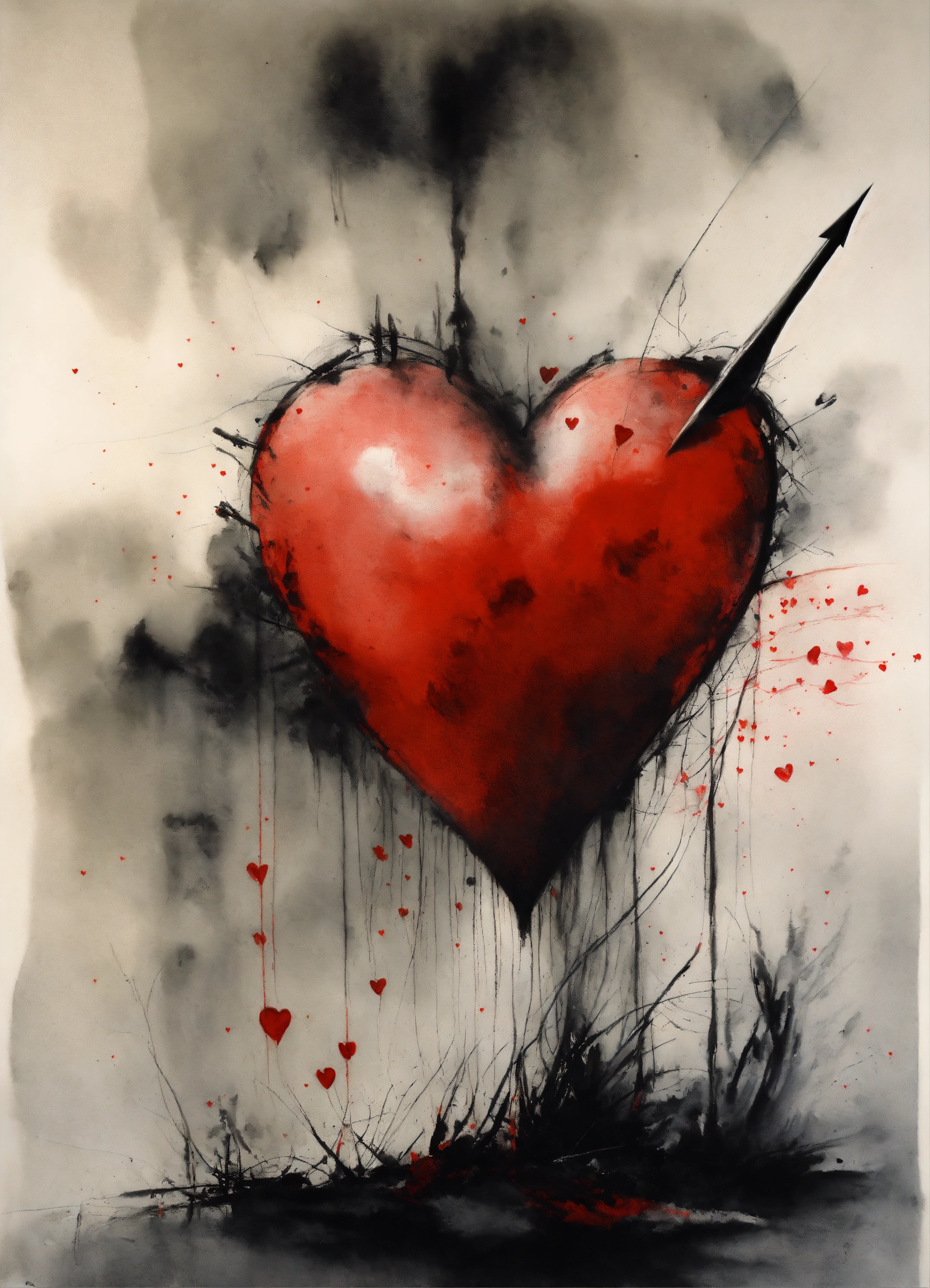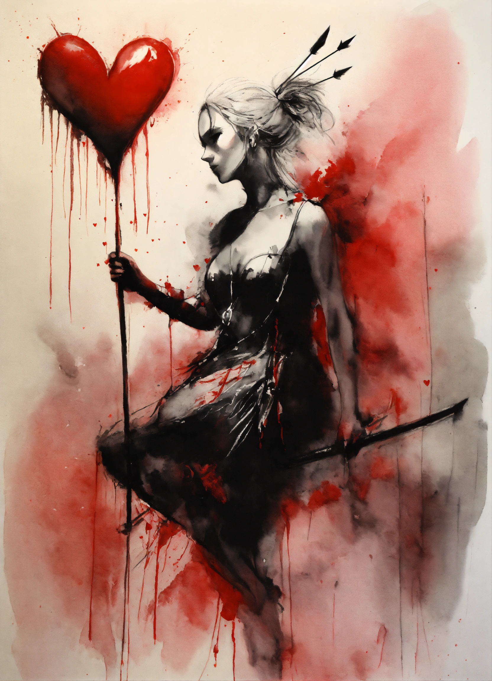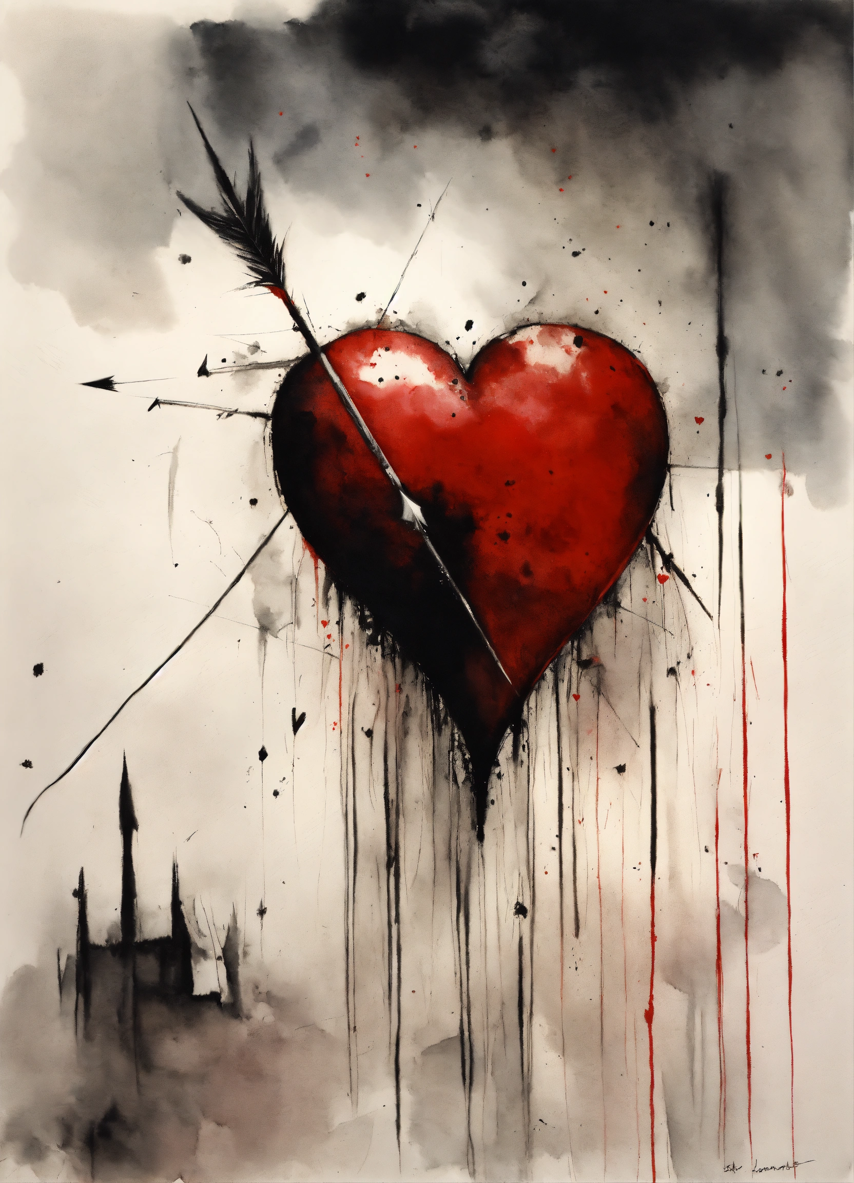 Stephen gammell style, dessin, aquarelle, aquarelles, noir et blanc et rouge, de marais, de sombres créatures, dégoulinant, un gros coeur avec une fleche qui le transpersse, représentation de l'amour a big heart with an arrow piercing it, representation of love