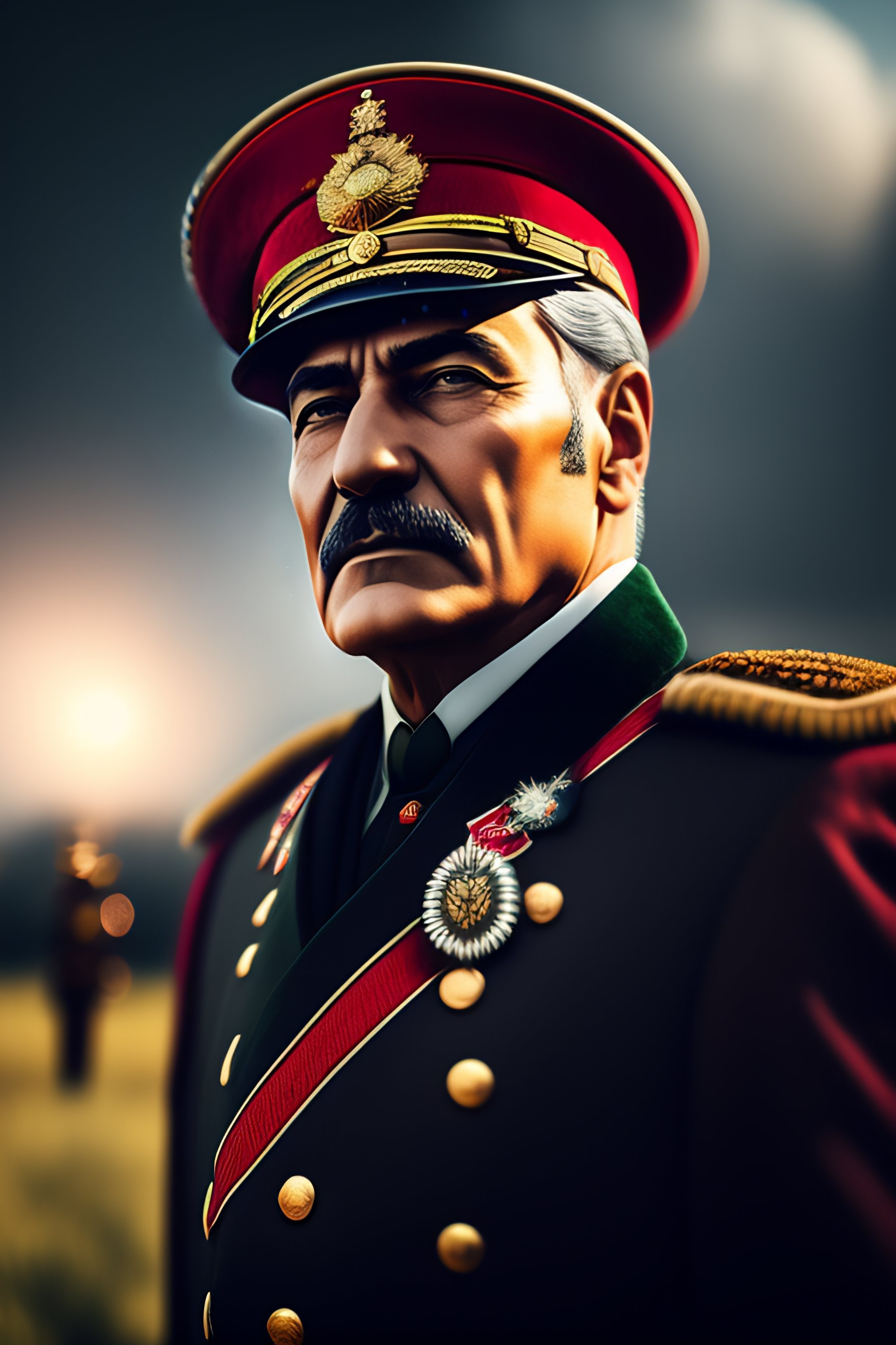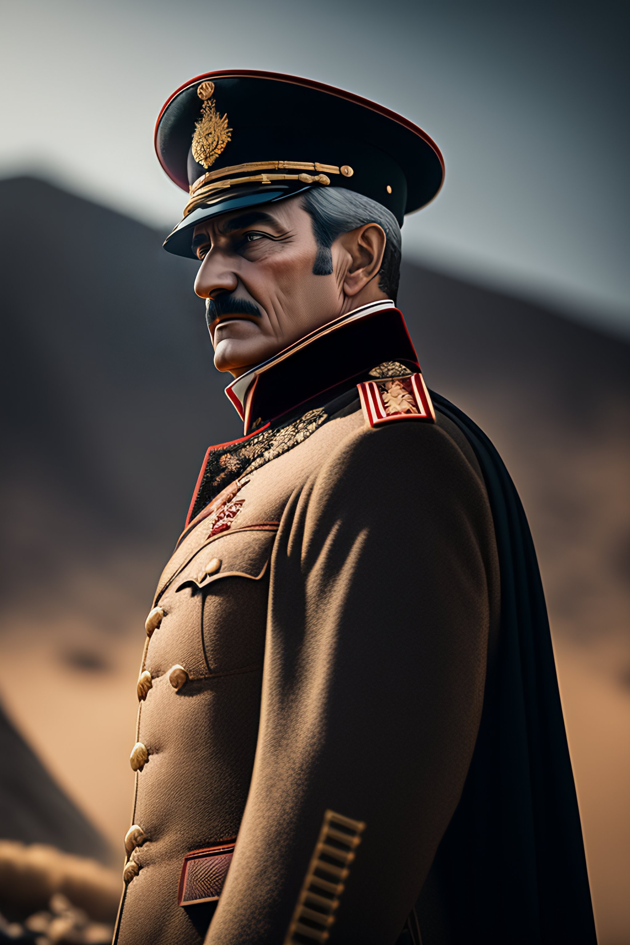 The founder of the turkish republic "mustafa kemal ataturk" in military uniform at a battlefield, highly detailed, unreal engine 5, extremely detailed, octane render, hyper-realistic, hyperrealistic, cinematic mode, insanely detailed, 3ds max + v-ray, action shot + with a dynamic pose, action shot, + cinematic shot + photos taken by arri + incredibly detailed, sharpen, details + professional lighting, photography lighting + 50mm, 80mm, 100m + lightroom gallery + behance photographys + unsplash + contrast