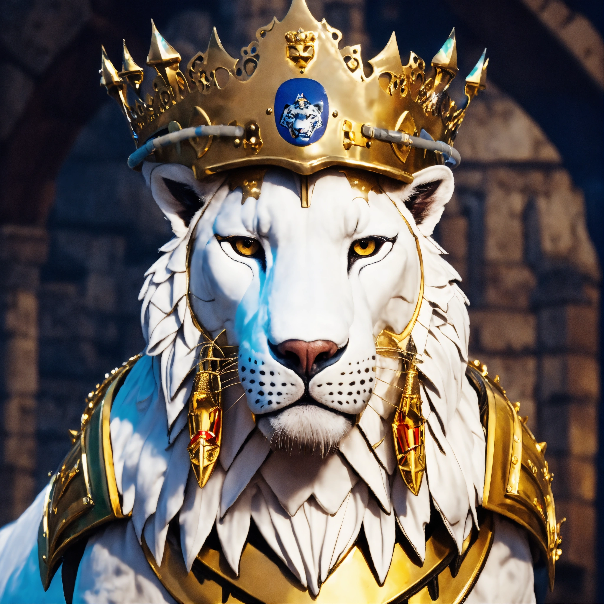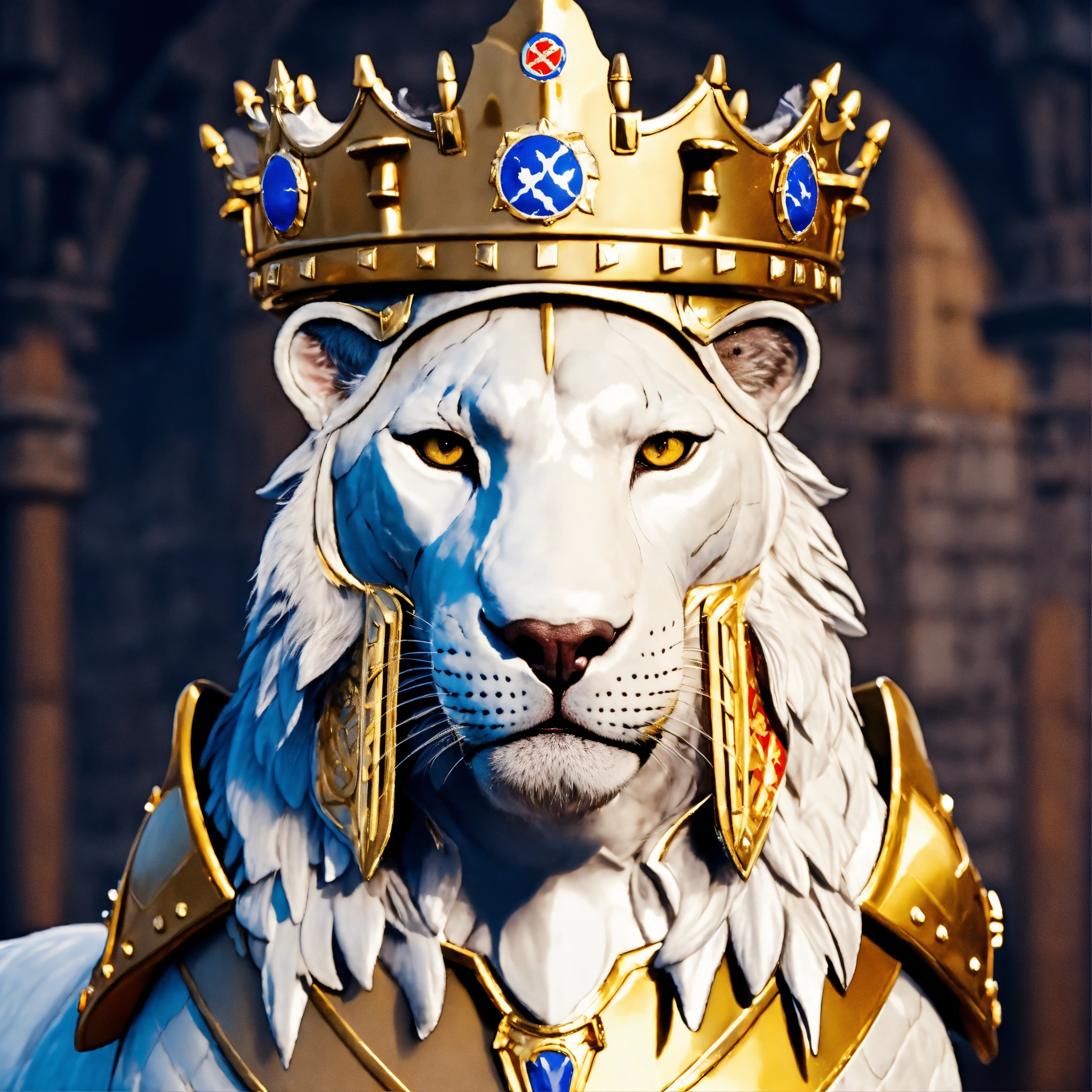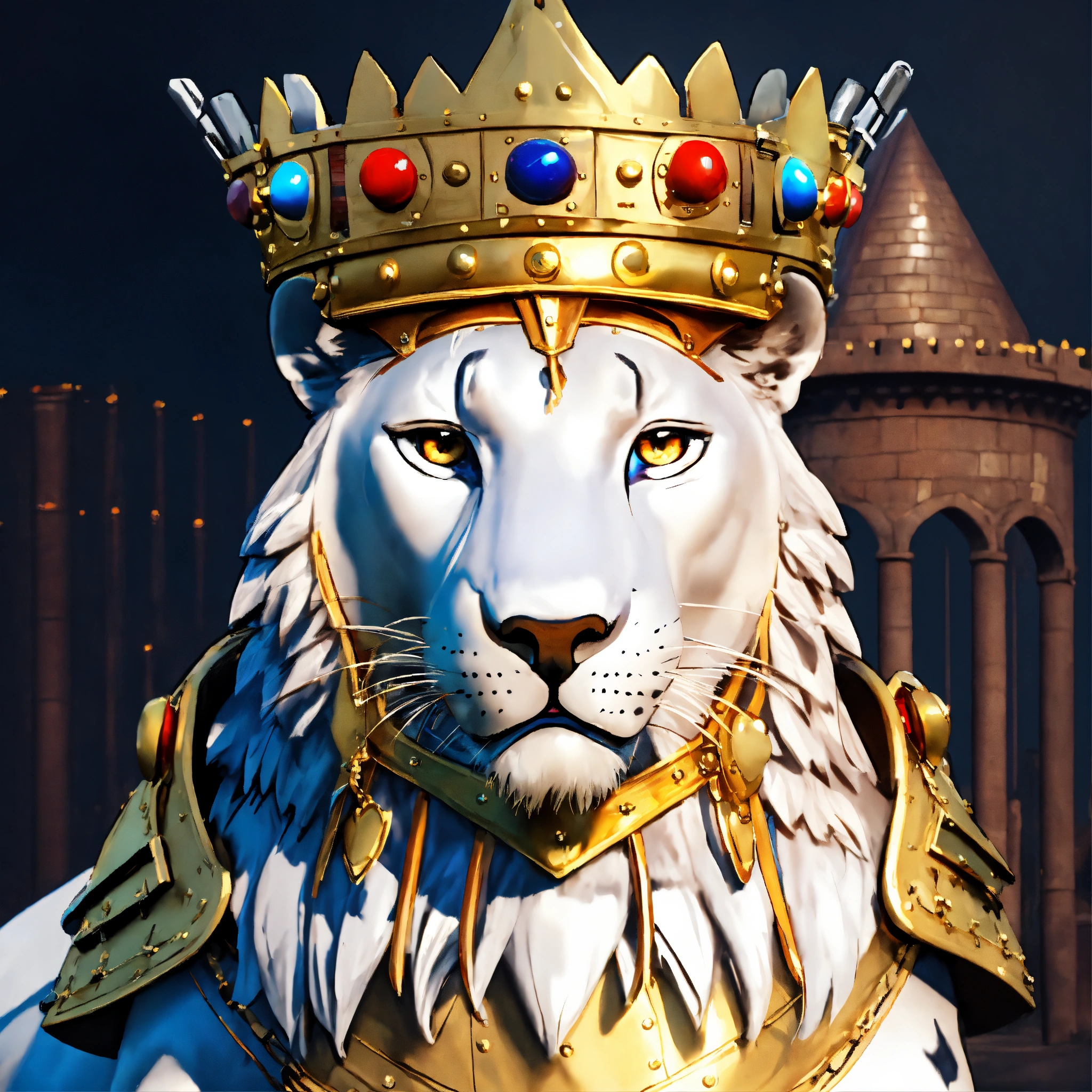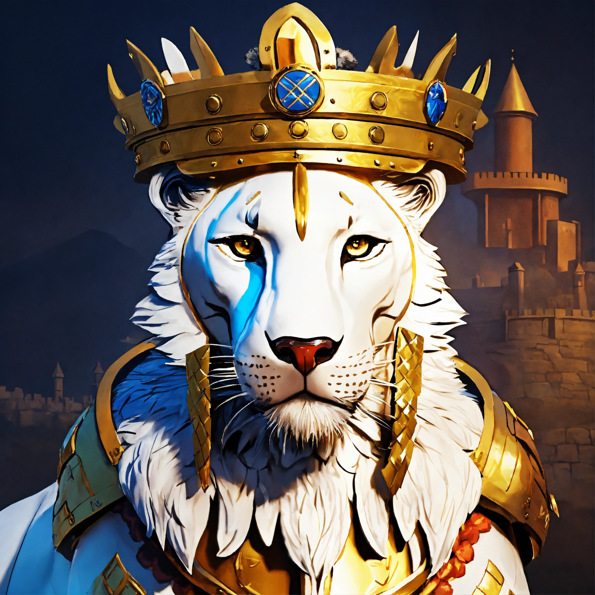 Realistic jaguar, with scottish war paint on his face, medieval helmet, crown, gold armor, brown eyes, against the backdrop of a medieval fortress.