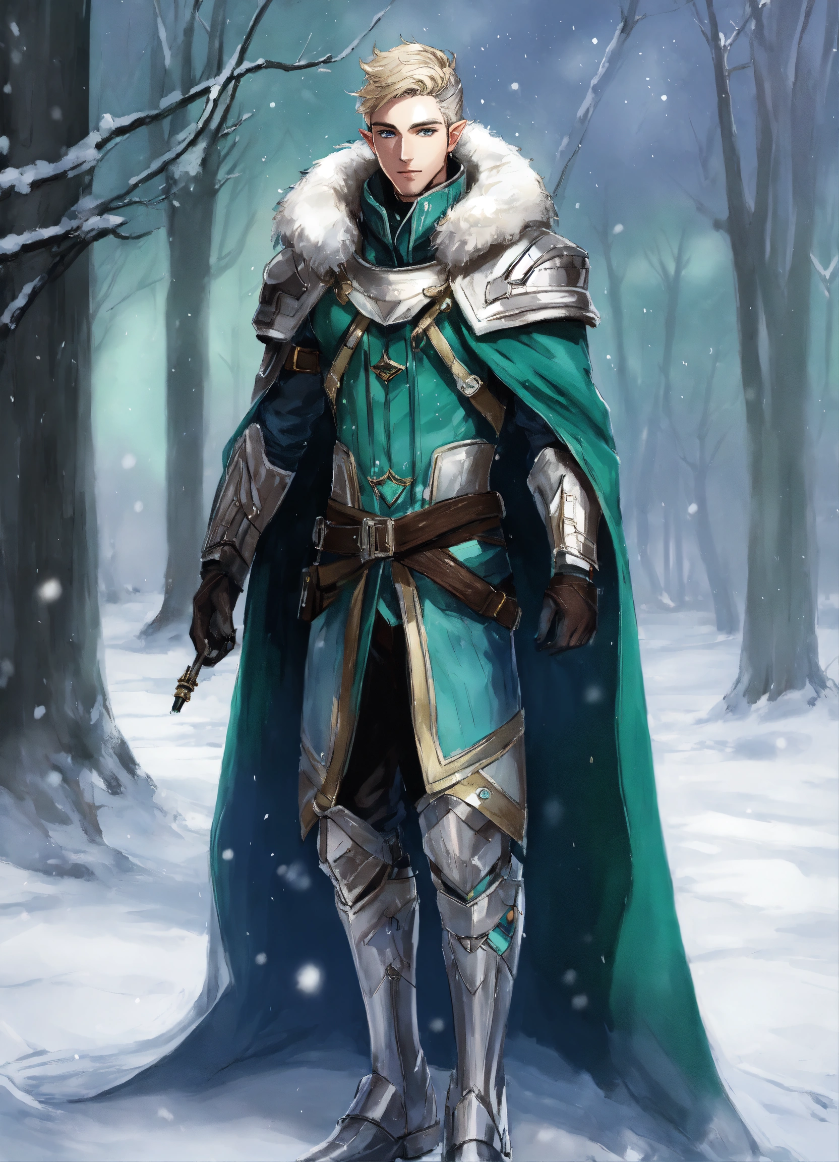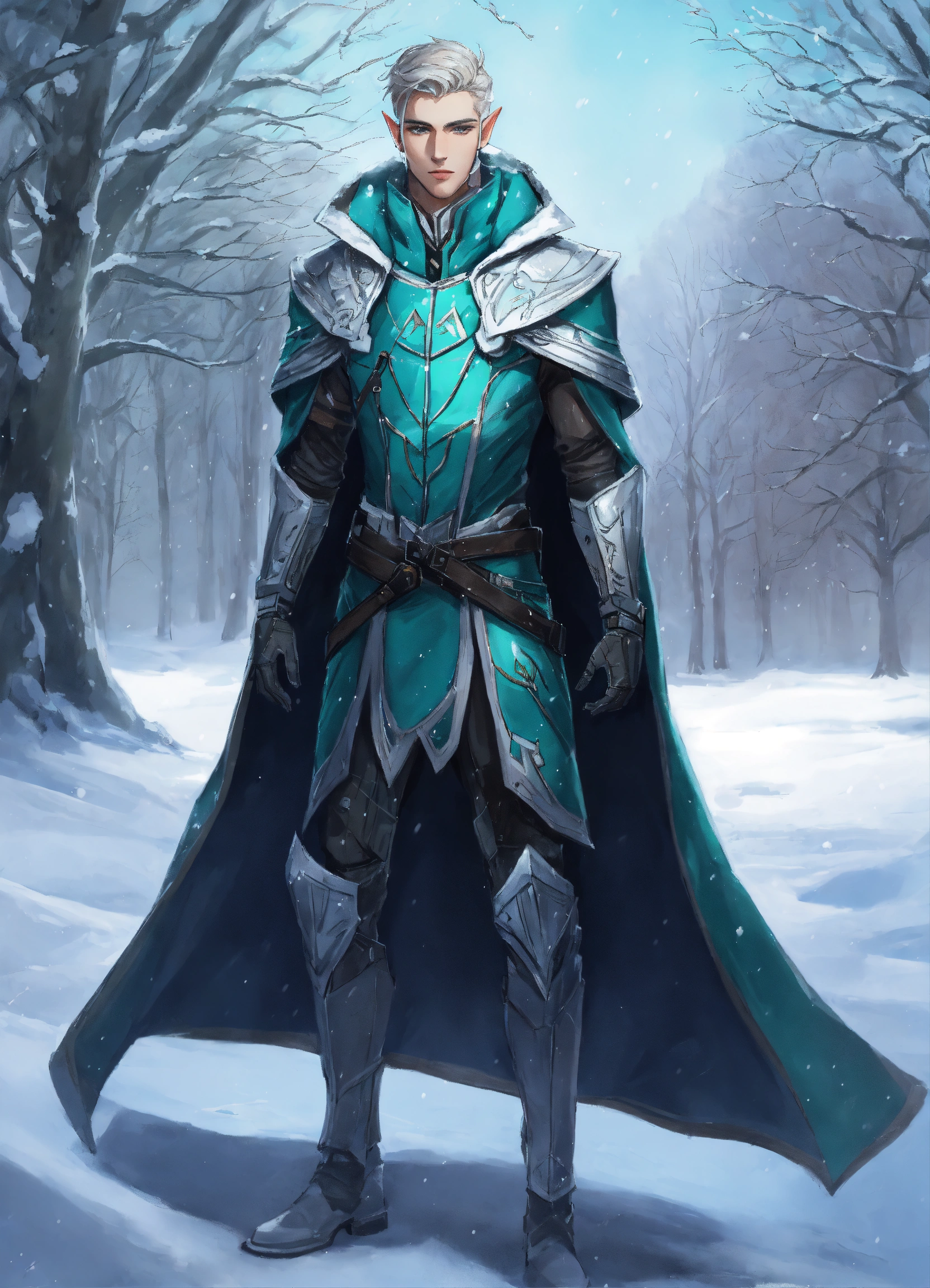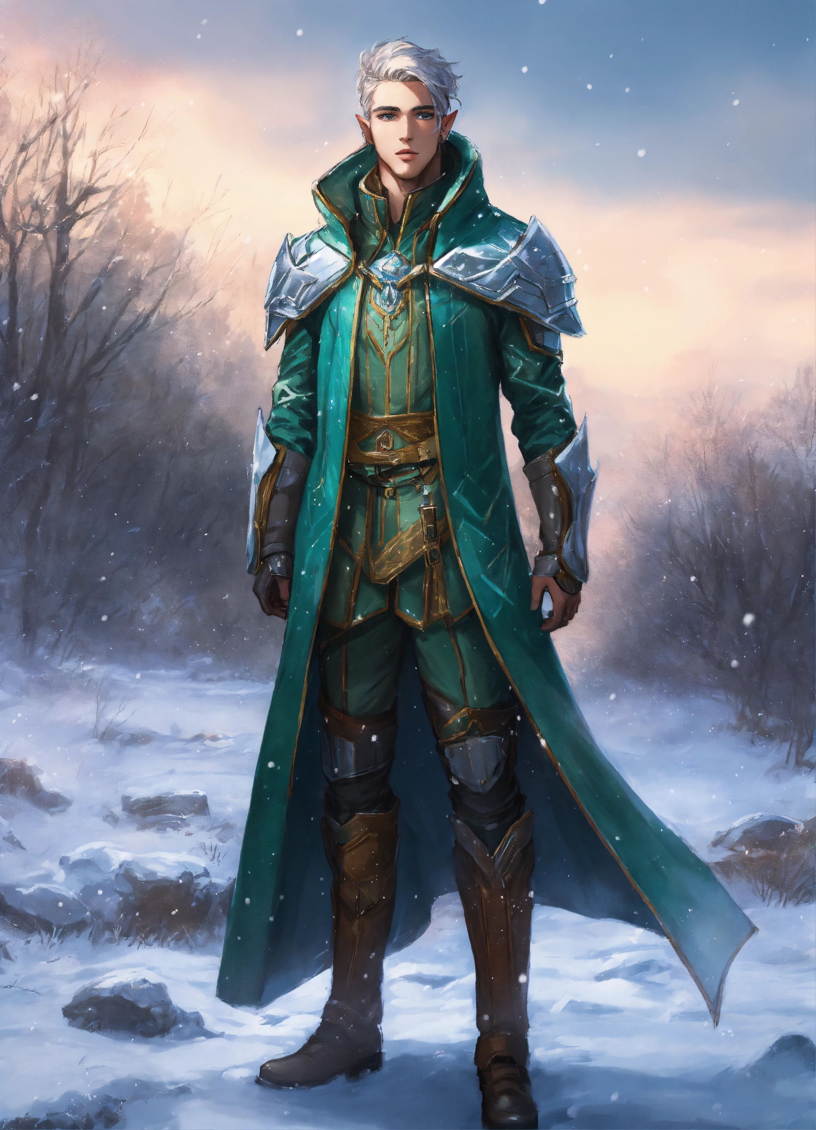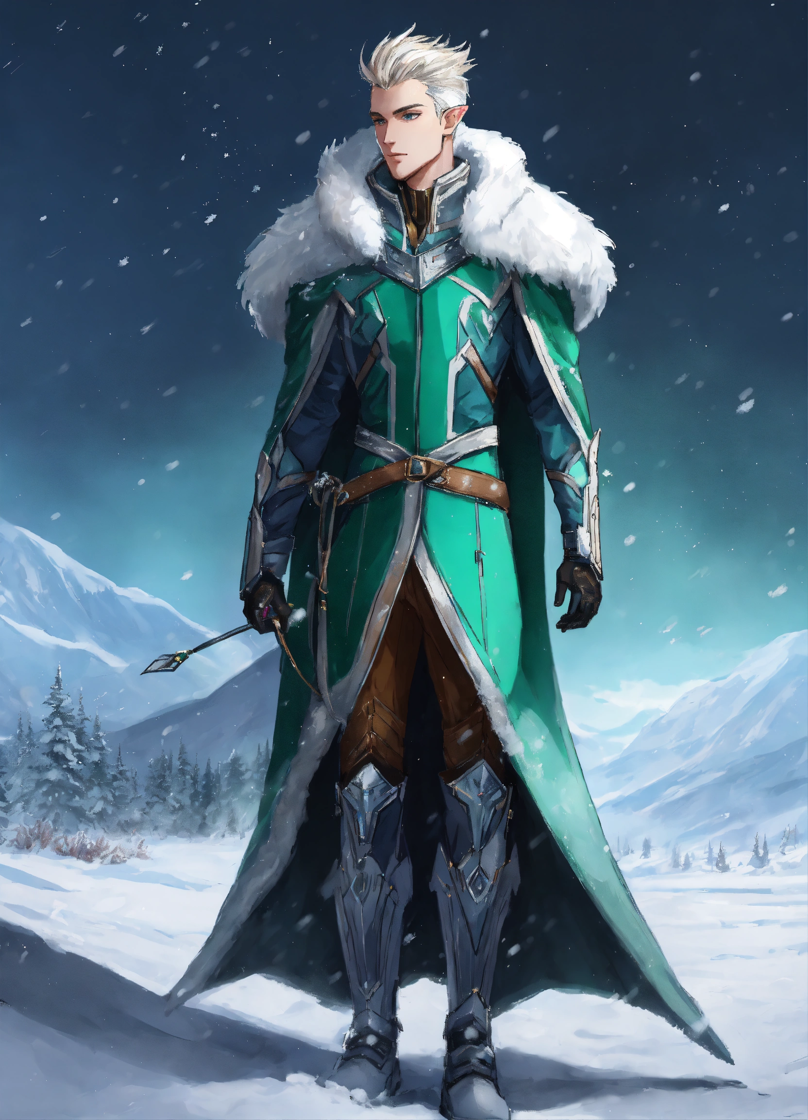 Full body drawing of a sci fi high elf, royalty, futuristic, mint cybernetic royal winter coat, elf, male, handsome, 23 years old, standing in snow covered field in winter