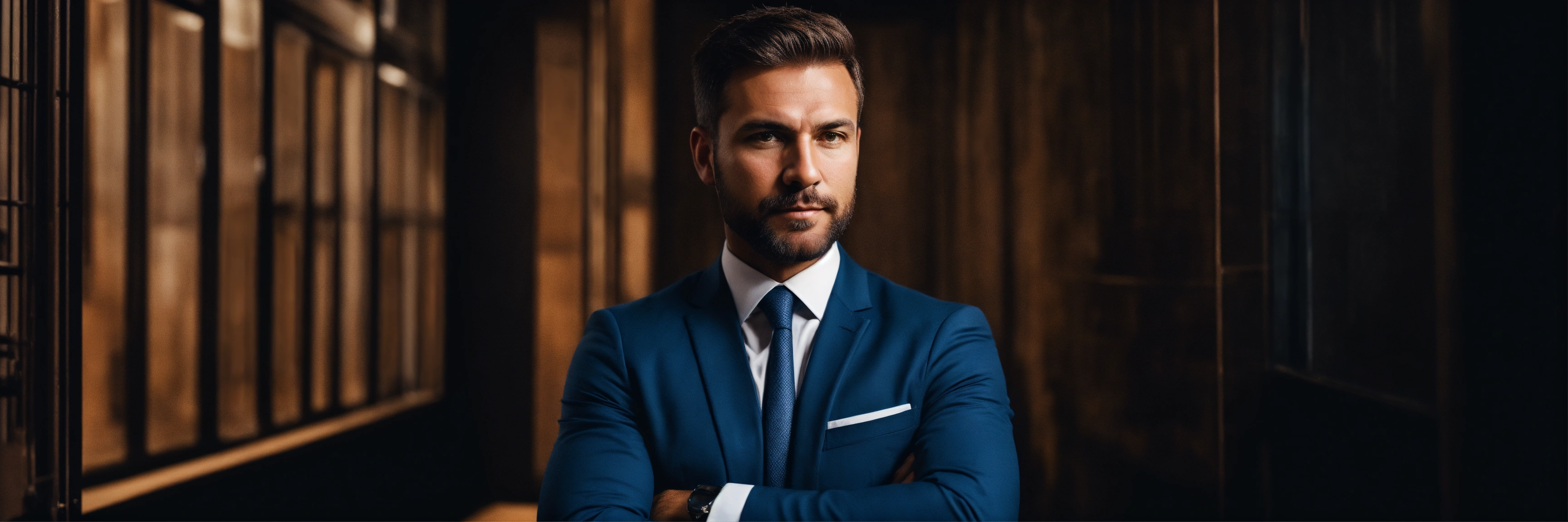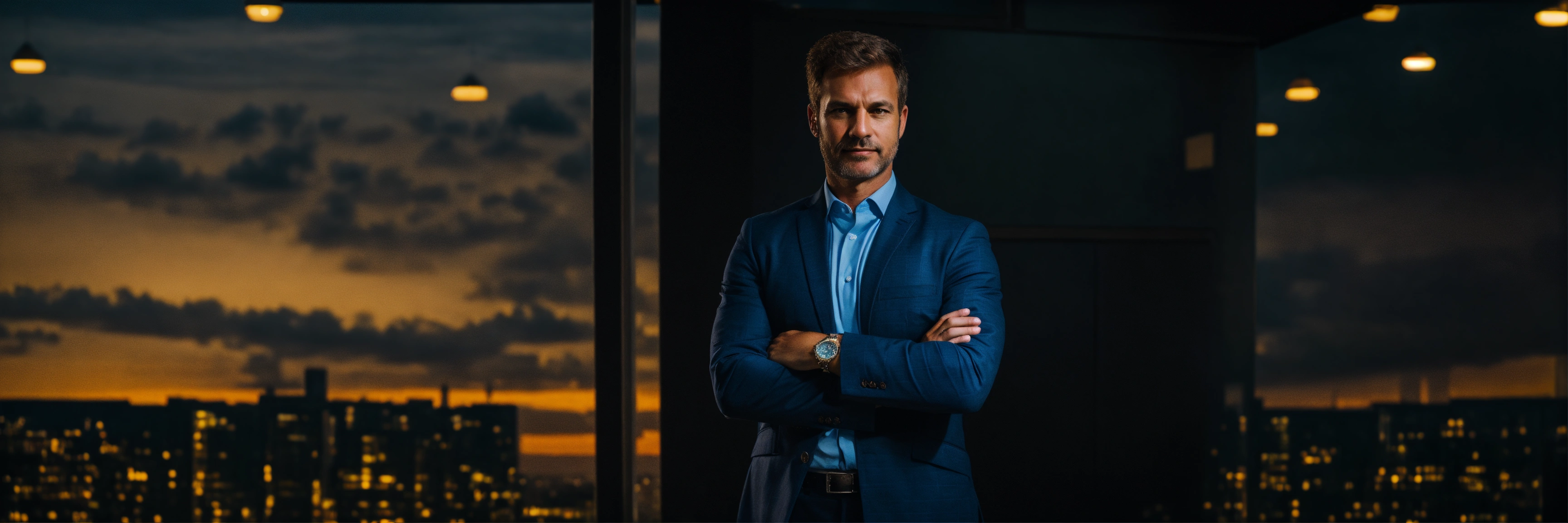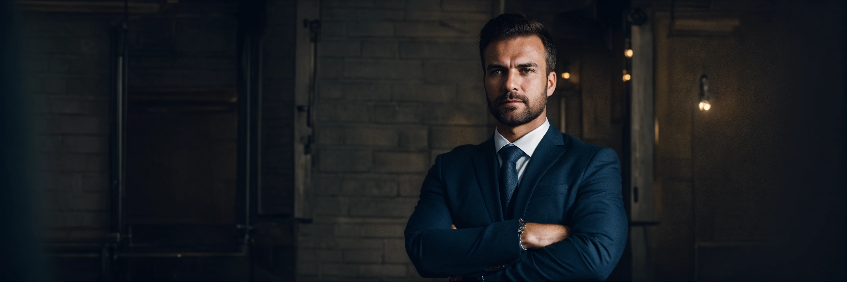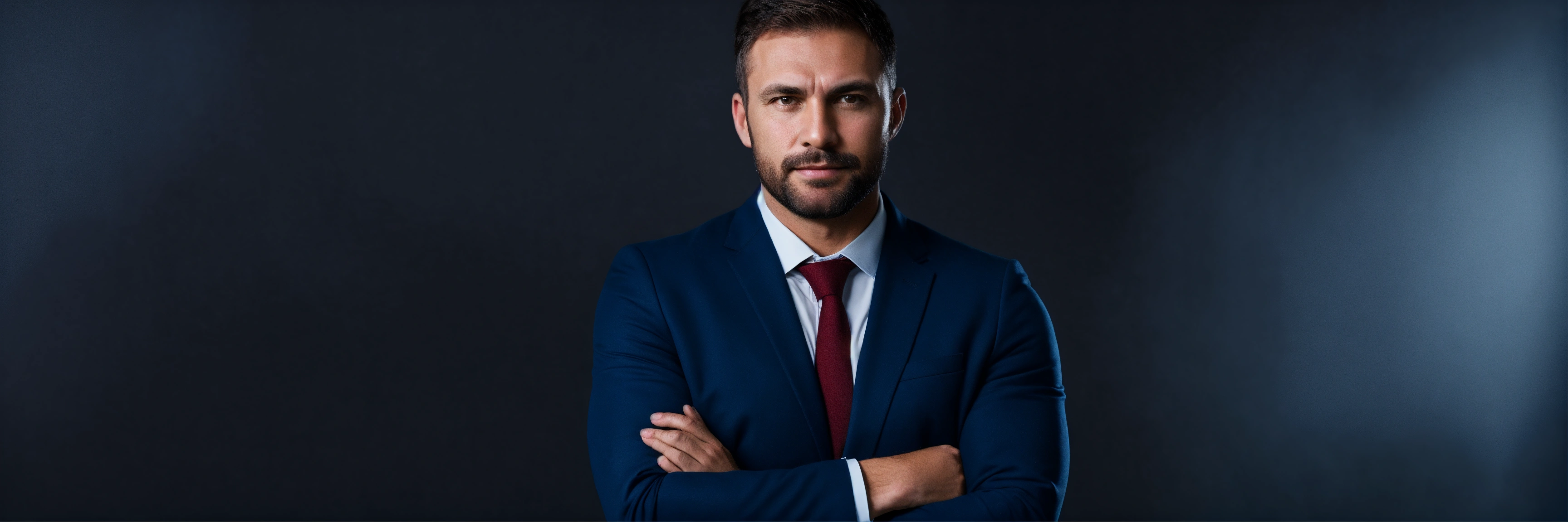 Successful businessman with crossed arms stands on a dark background, high quality photo, caucasian man