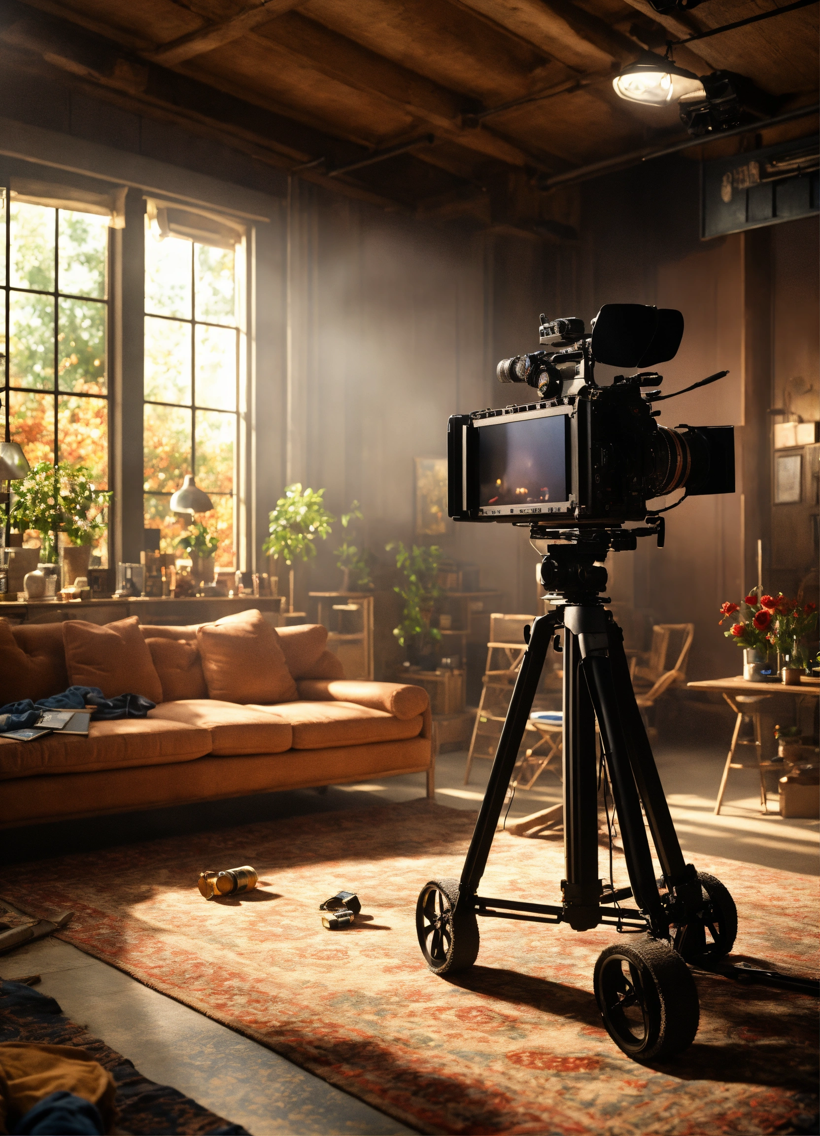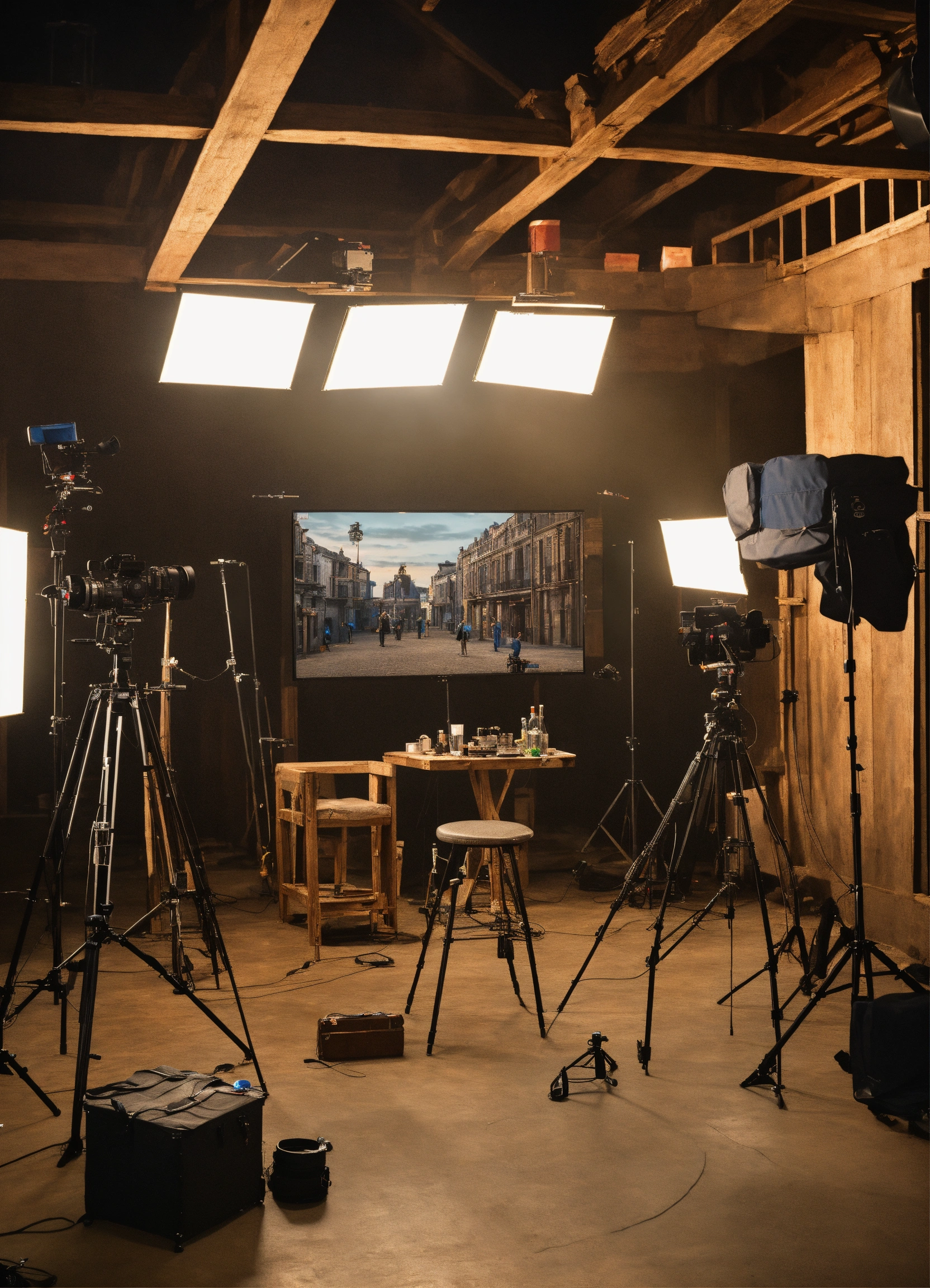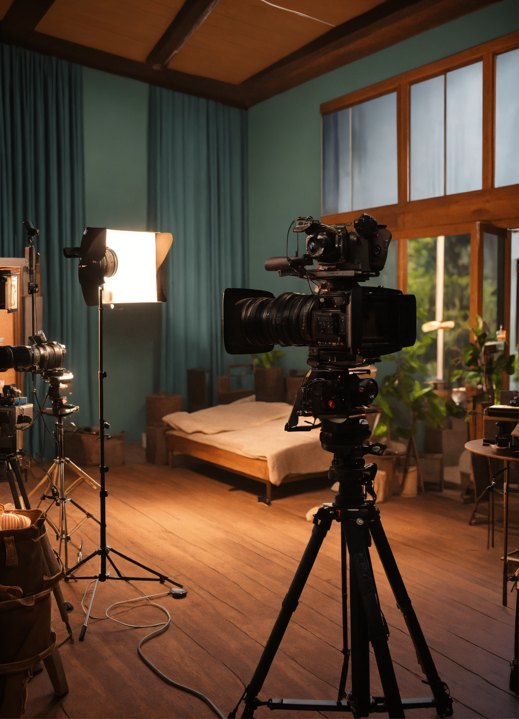 Create a hyper-realistic 4k lifelike digital image of a internal movie set where it's being filmed a scene with actors, cameras etc