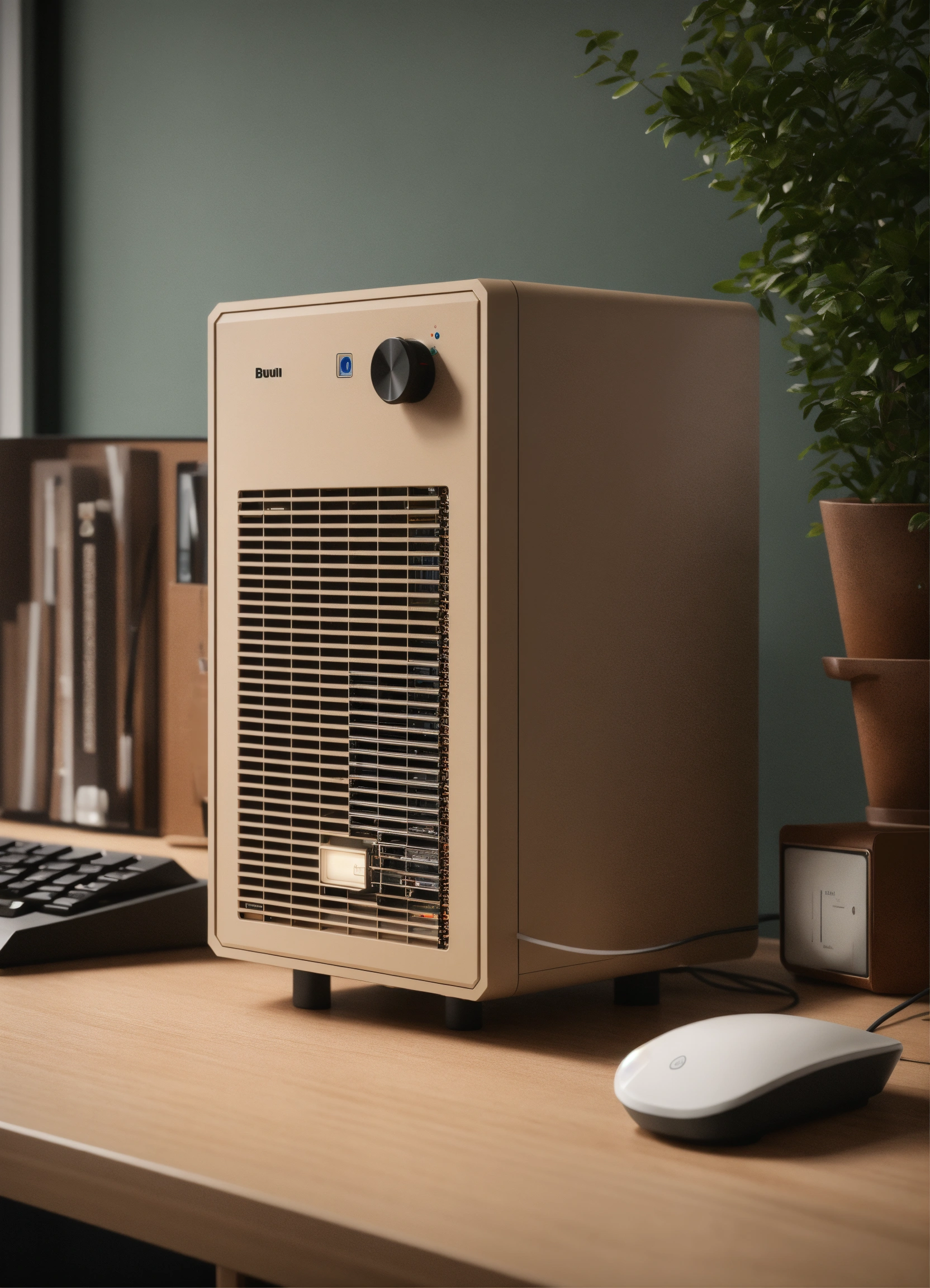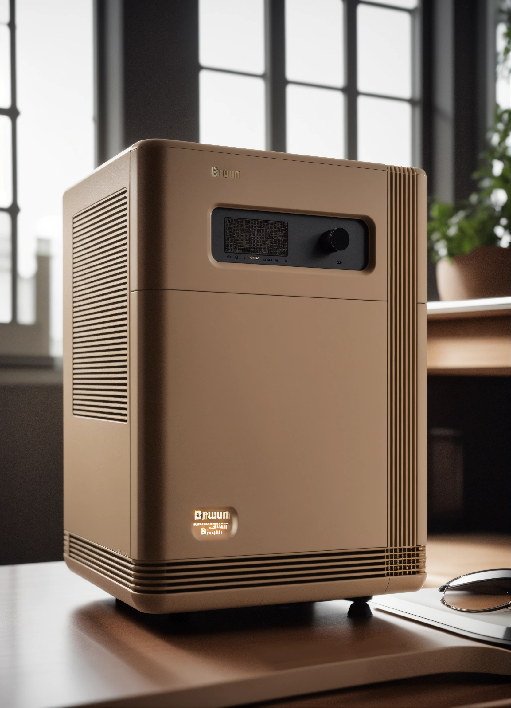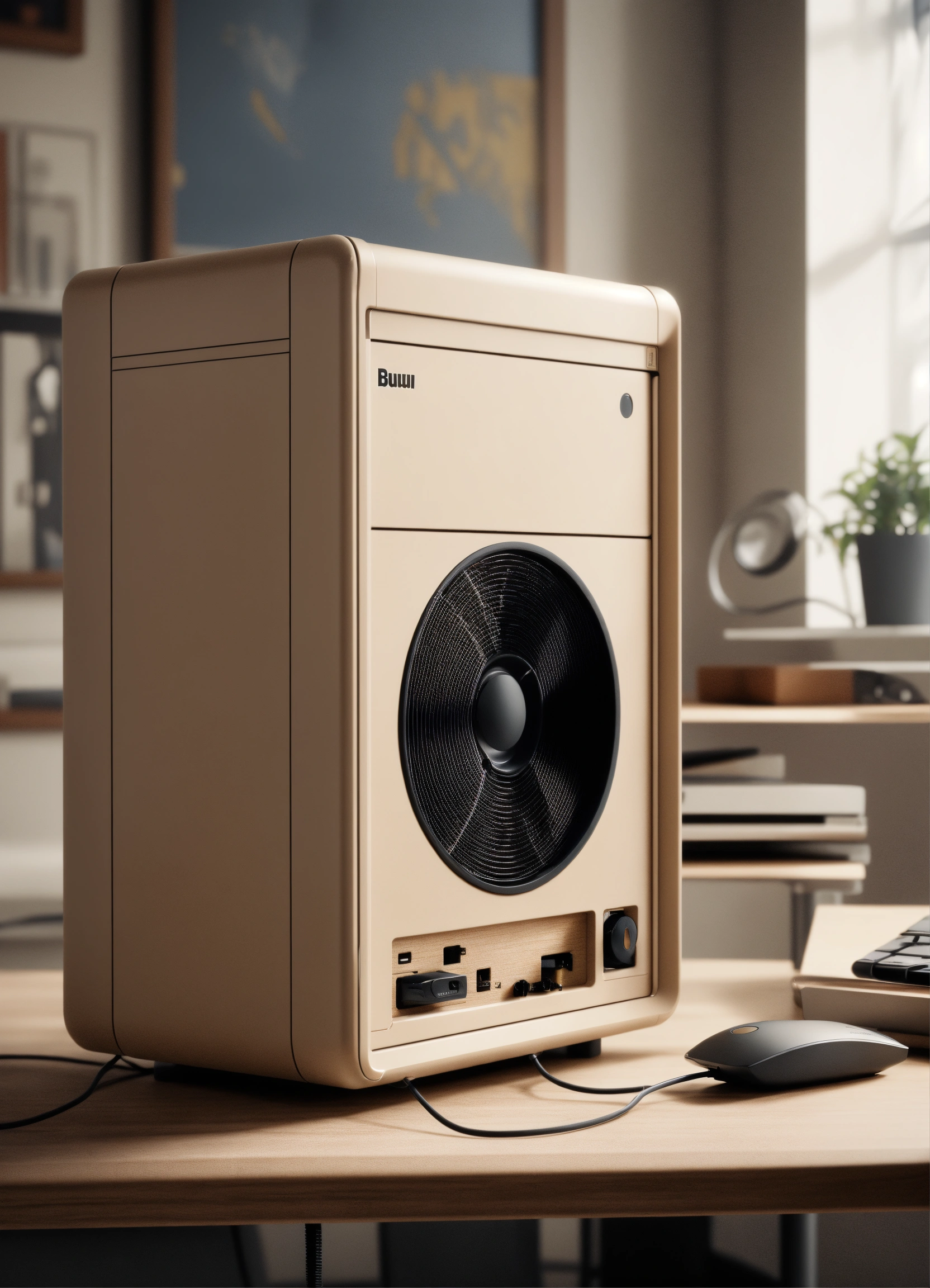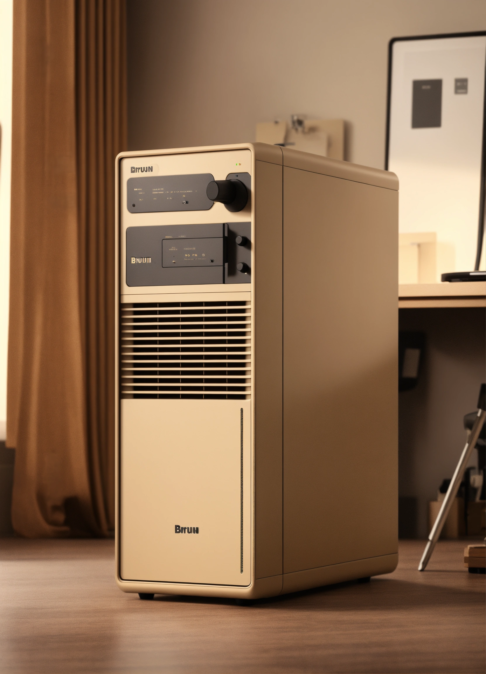 A stunning beige pc case designed by dieter rams, braun. product ad retro. industrial design inspiration. unreal engine render, natural lighting, on desk