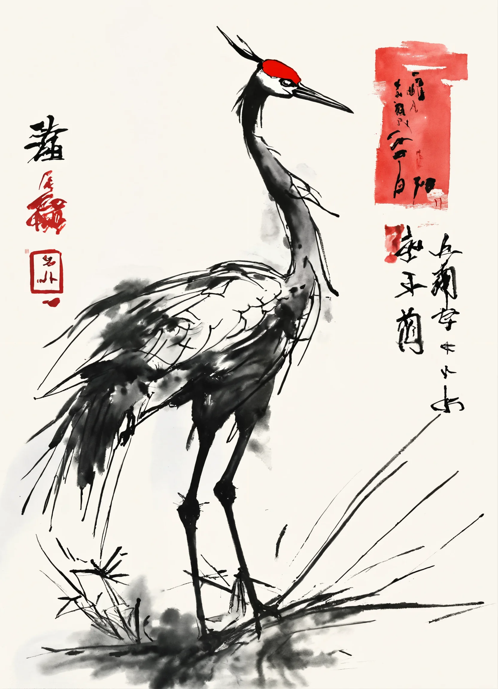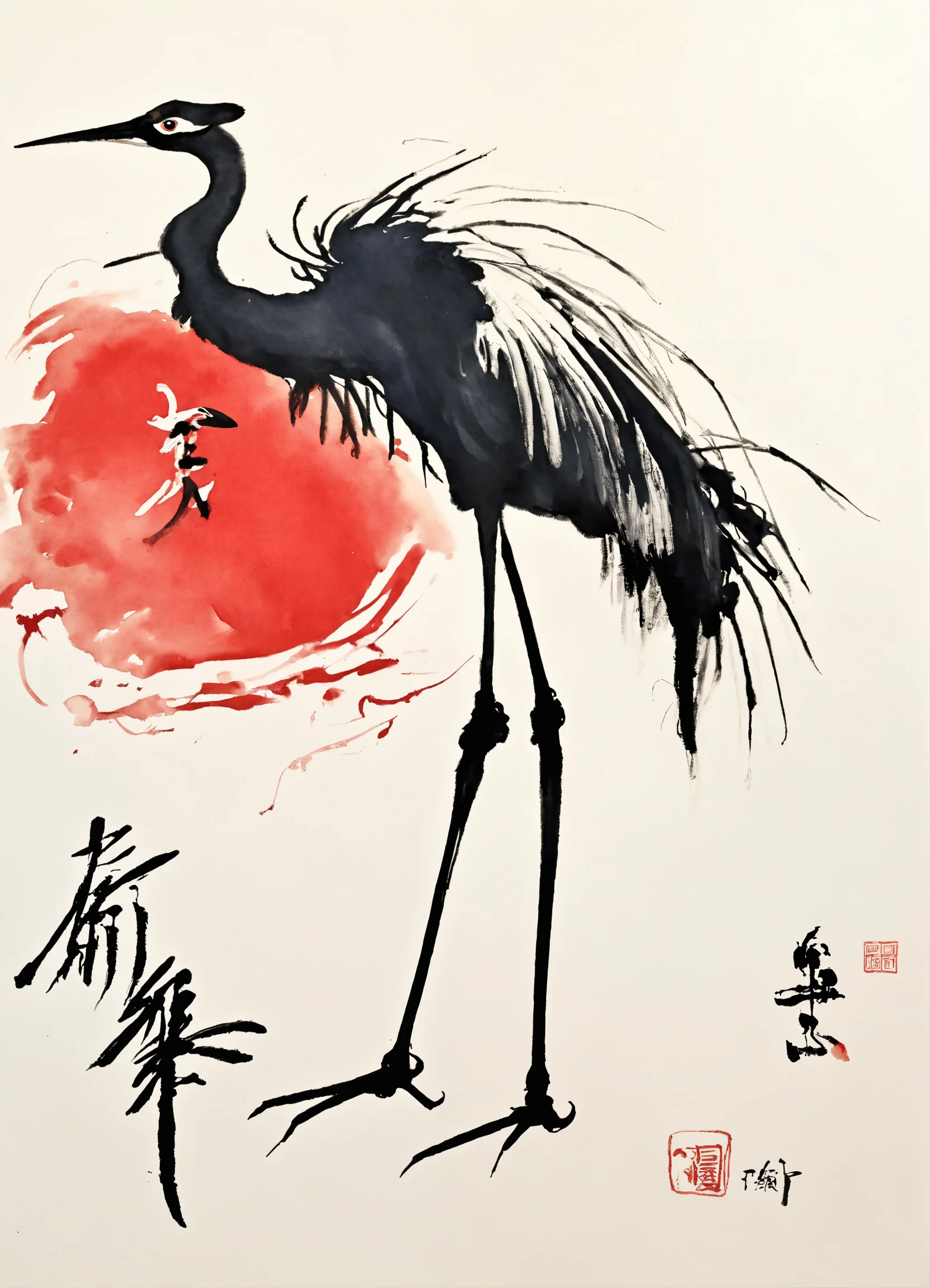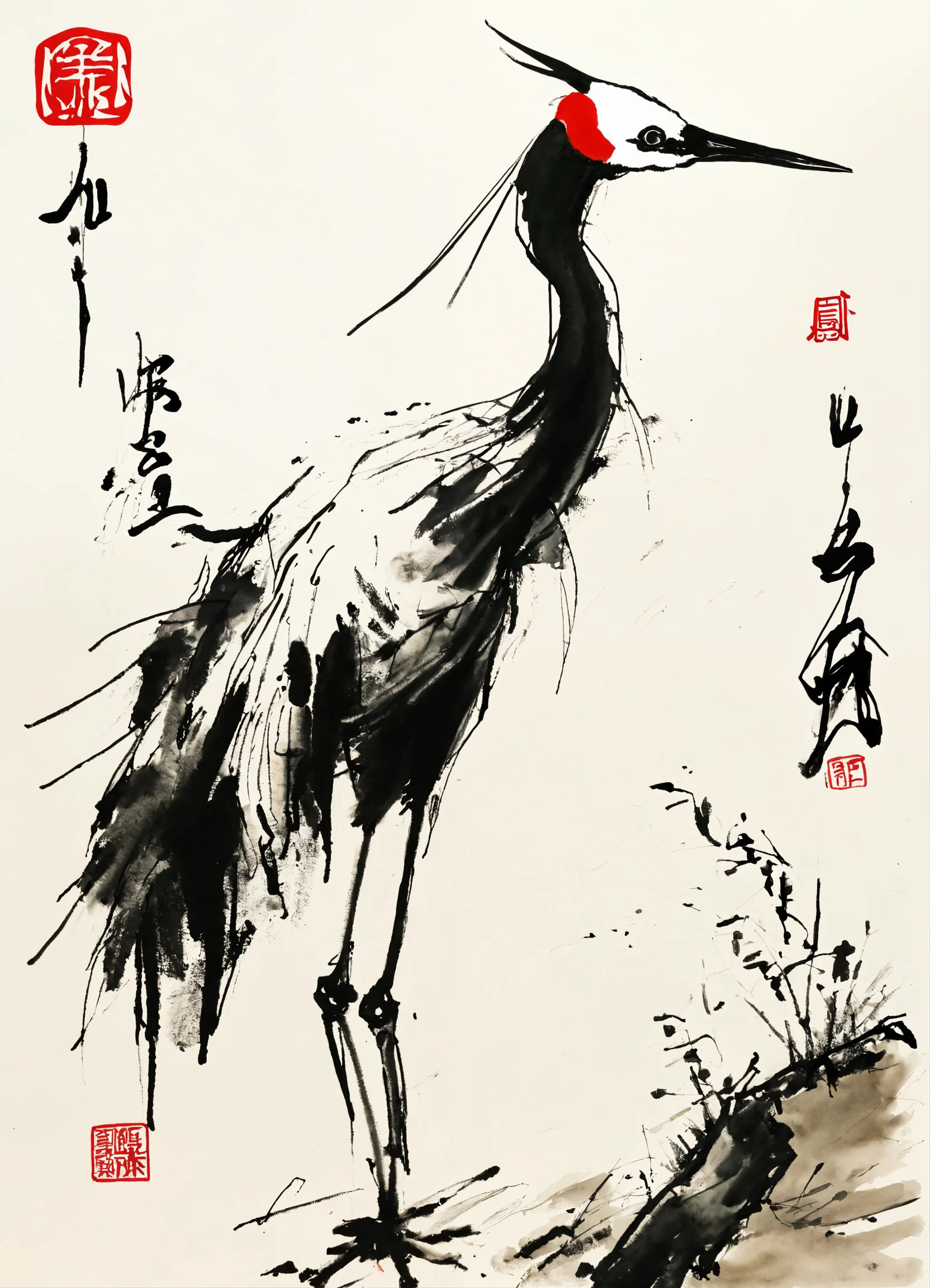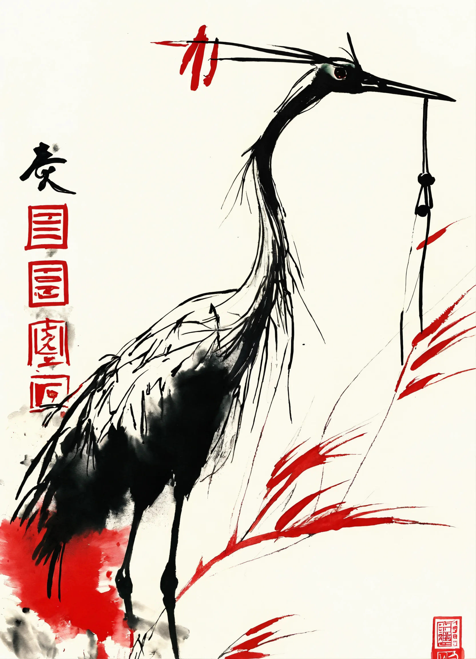 Shuǐmò huà, 水墨画, black and red ink, a crane in chinese style, ink art by mschiffer, whimsical, rough sketch, sketch1.3