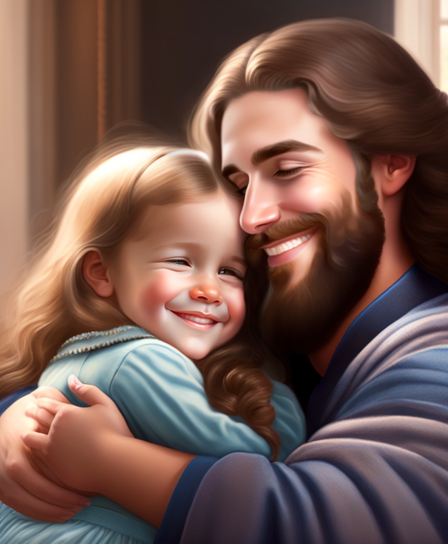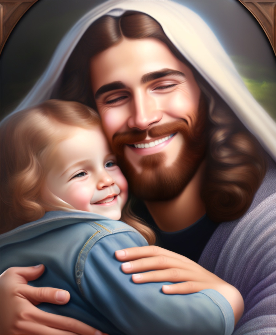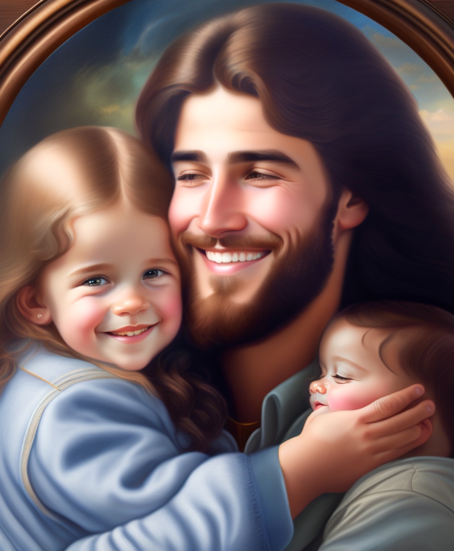 Realistic painting of jesus as a compassionate father, smiling, loving and hugging two children, with beautiful hands.