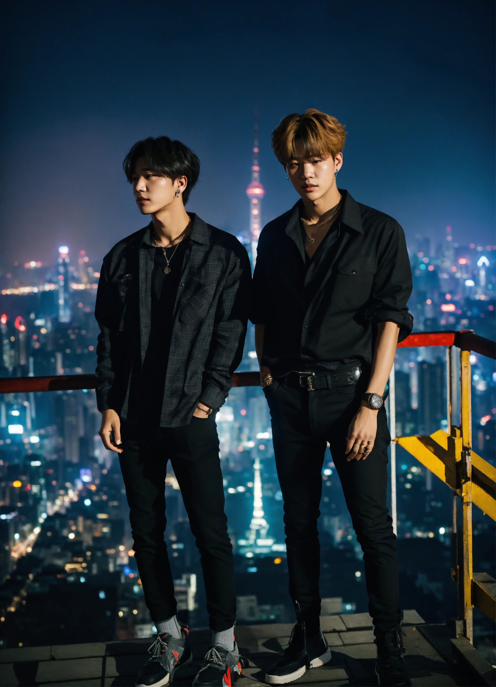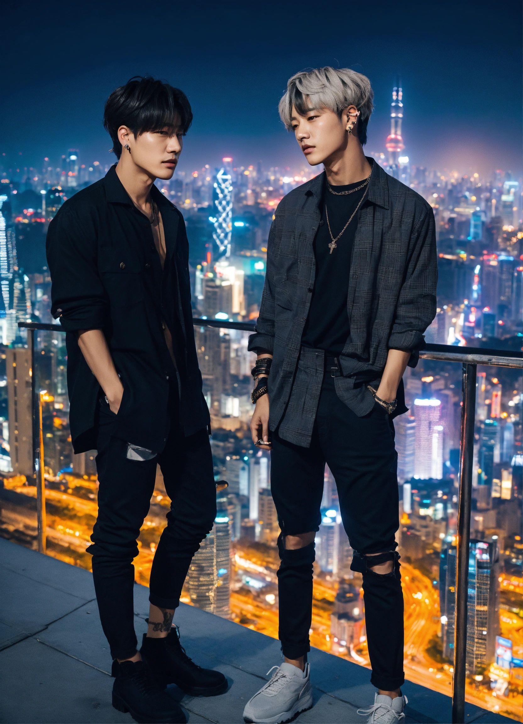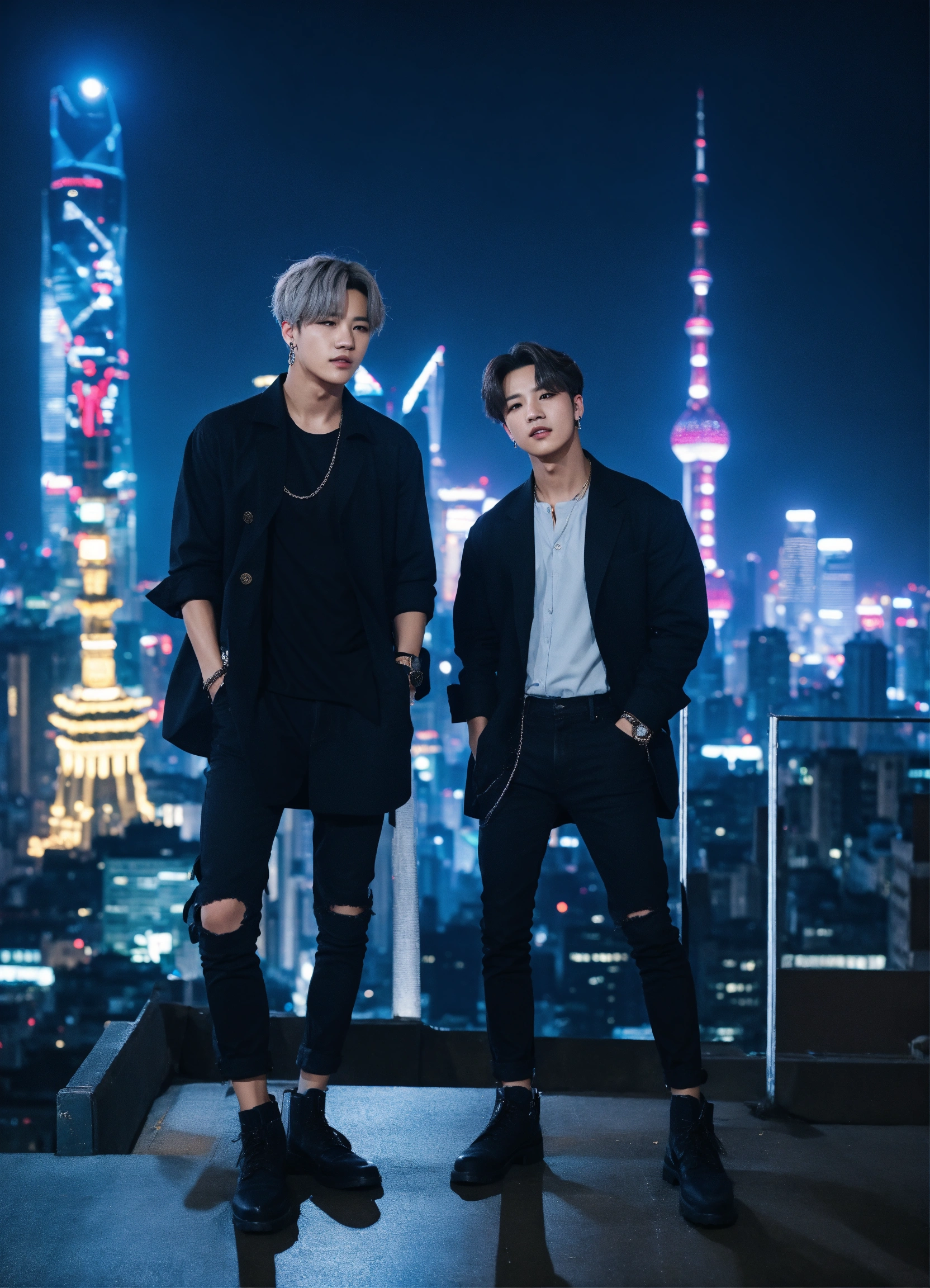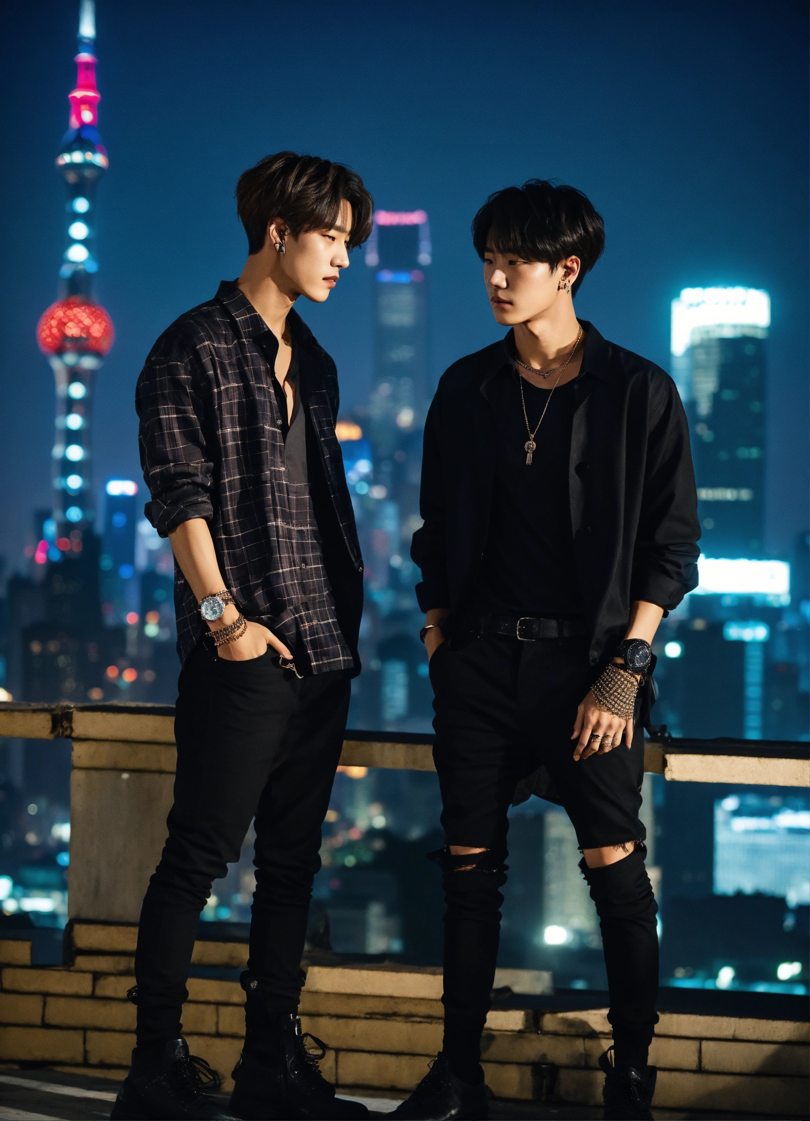Bts jimin and bts jungkook stand on the roof of a building in shanghai. shanghai city at night. jimin is wearing a black shirt with two buttons on the chest, black dress pants, and two holsters on his hips in special mounts for pistols. jungkook is wearing a checkered gray shirt and dark jeans. dark hair is short. jungkook looks at jimin. jimin looks at the city in front of him, his face indifferent.