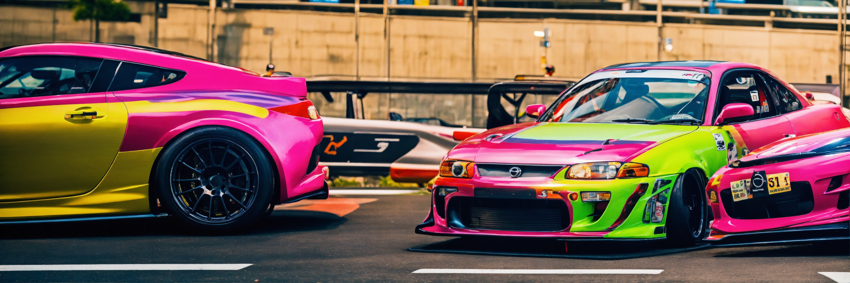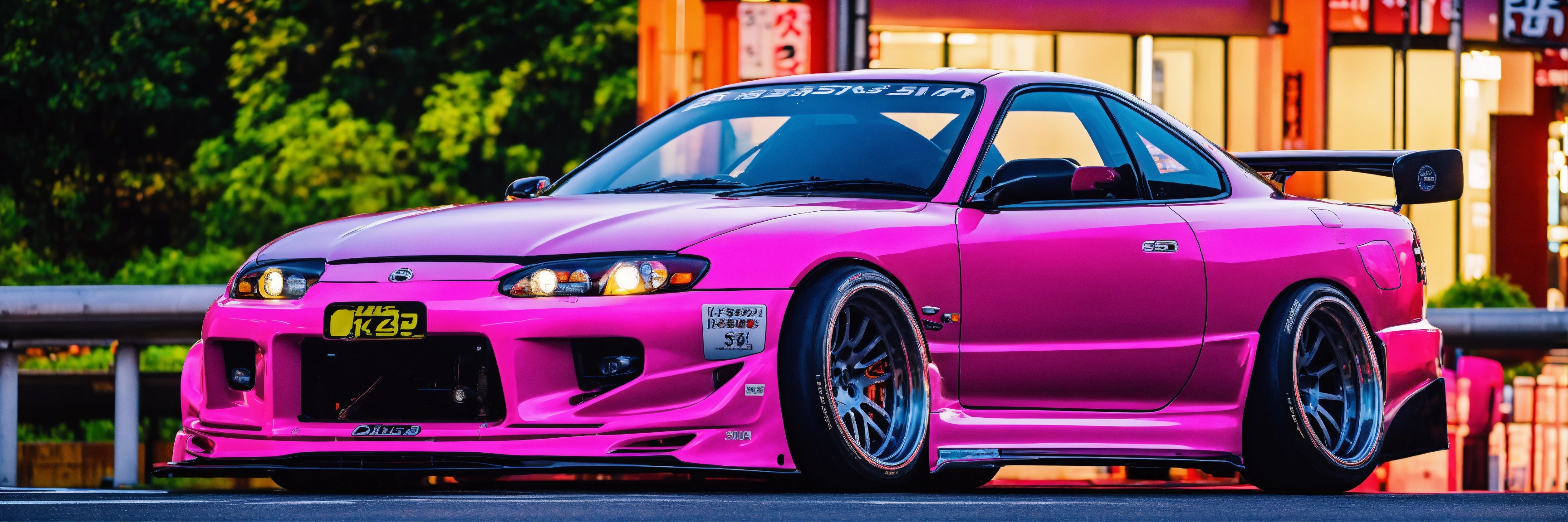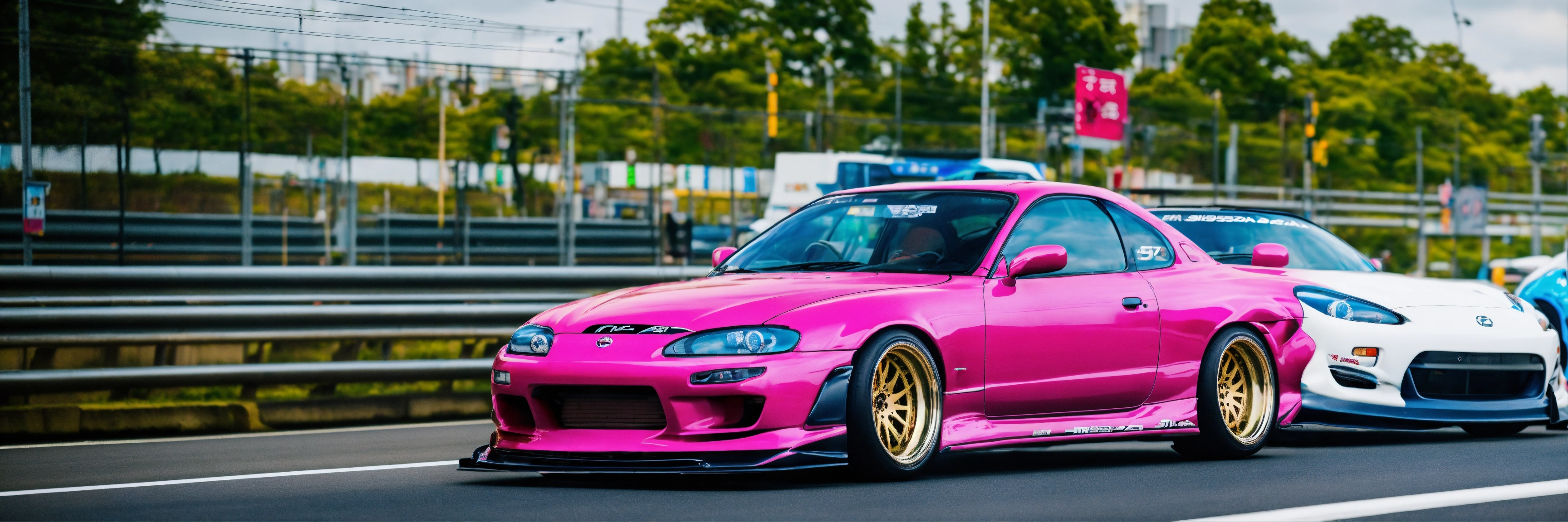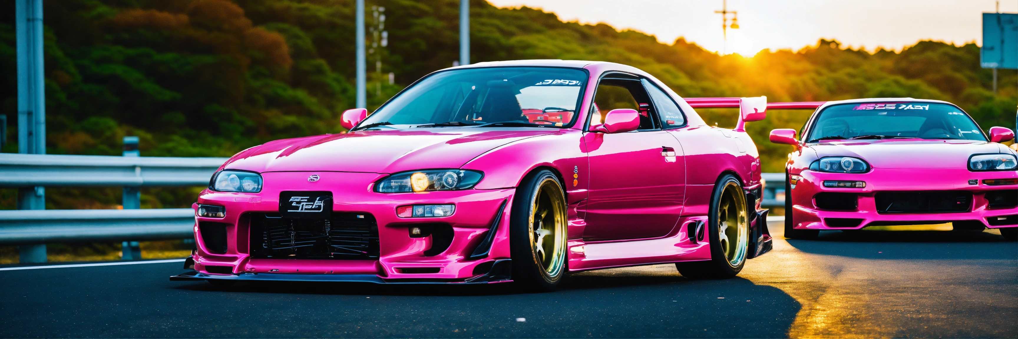 A colorful pink nissan silvia s15 with a wide-body kit racing a white mazda rx7 in tokyo highway