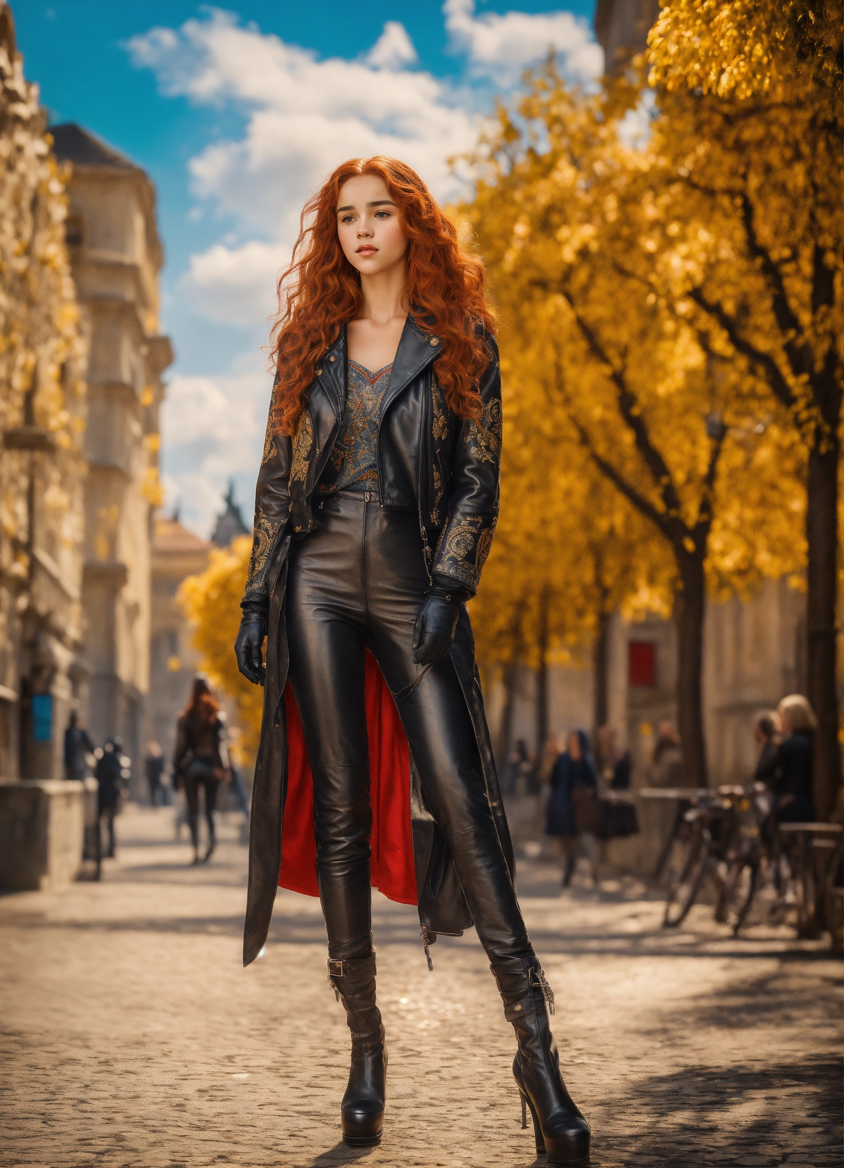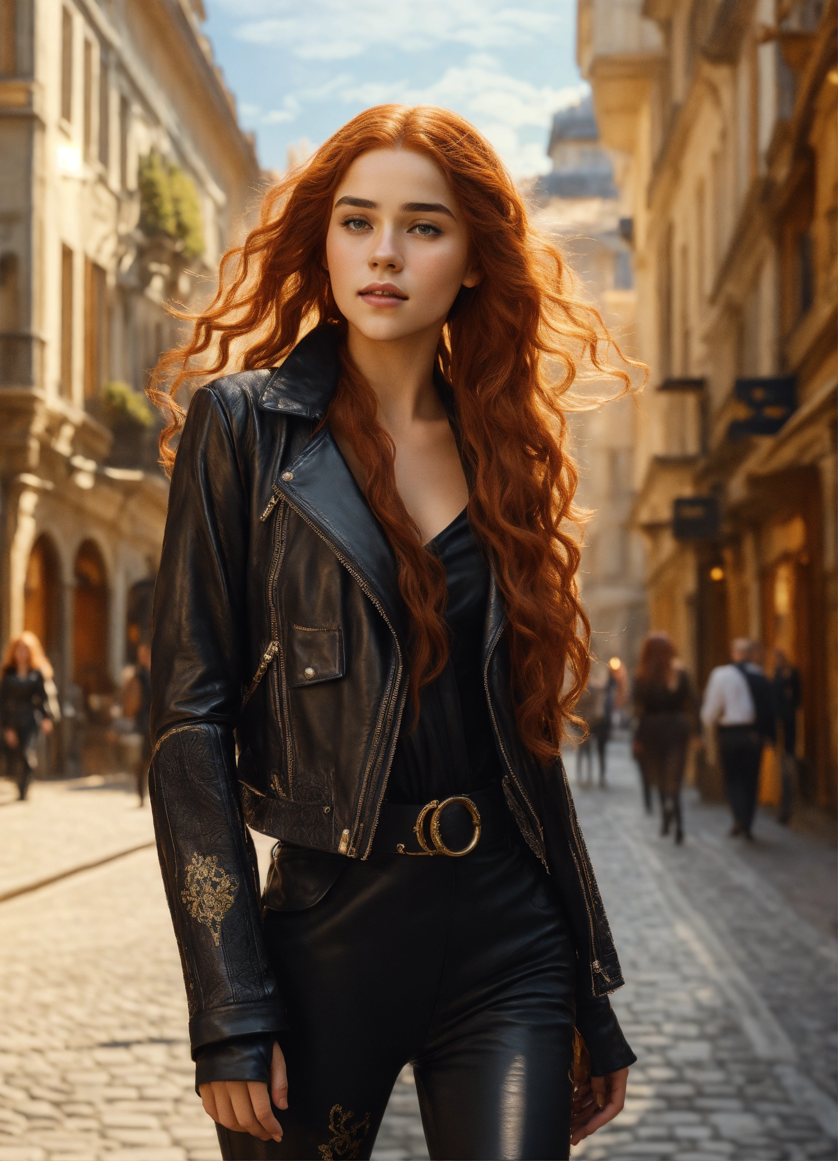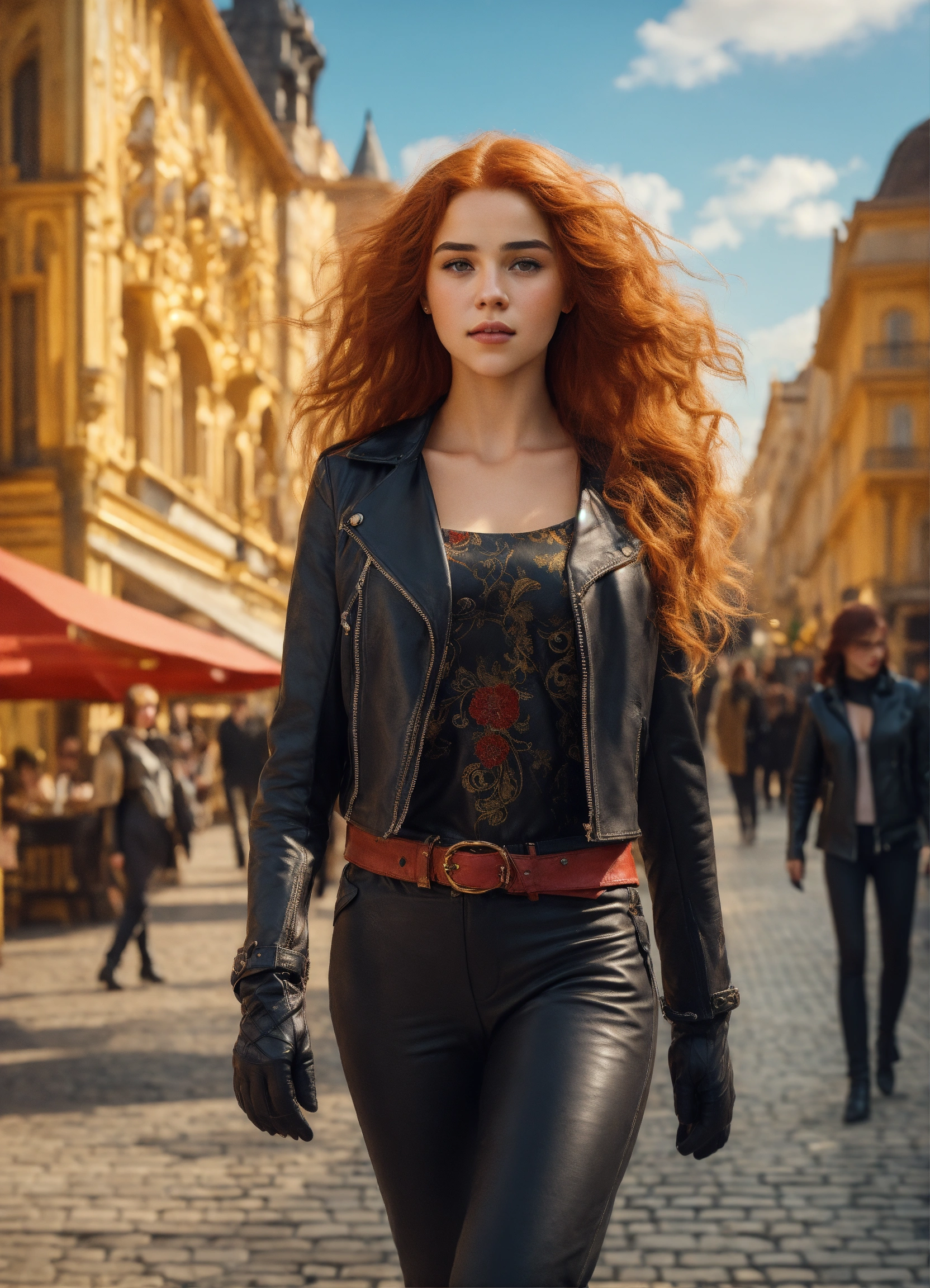 A beautiful 20 years old girl wearing a black leather jacket, pants and gloves walking in a sunny european city outside golden summer light, by gustav klimt art, deco art nouveau style, stunning intricate details, high definition, 8k render fullbody, very long red hair looks like a real life version of daenerys targaryen