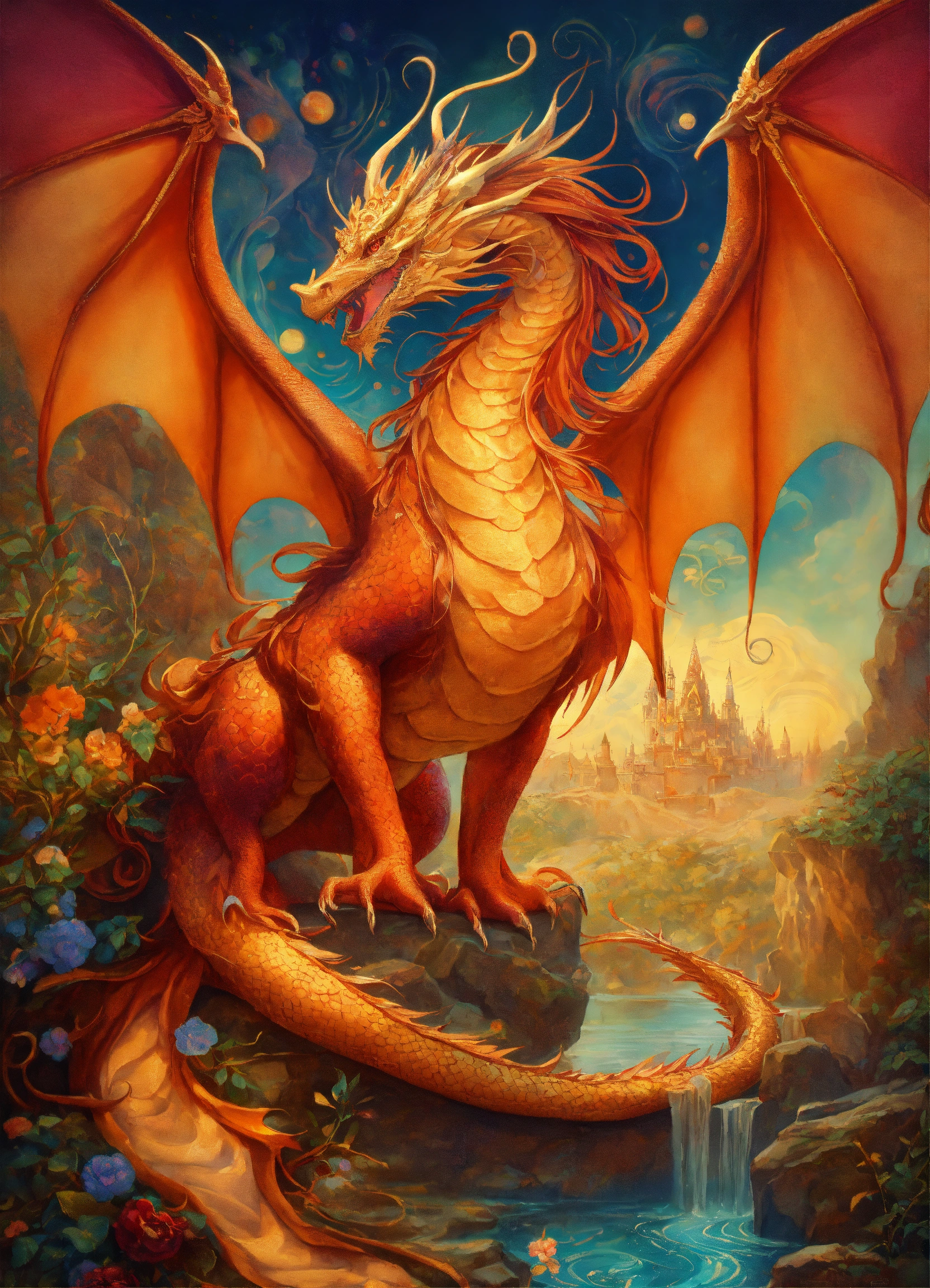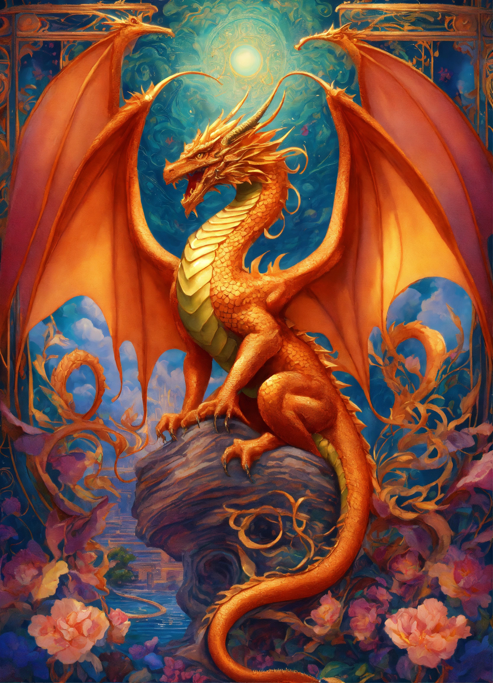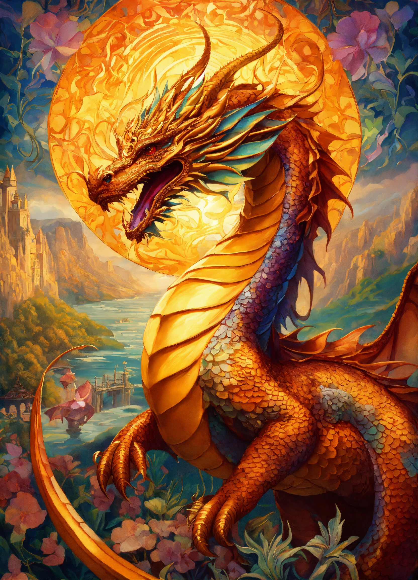 Beautiful, photorealistic, mystical, inspiring, up-lifting, intricate, beautiful, stunning, gorgeous, radiant art nouveau scene, shining rich colors in a high-frequency visionary style, joyful dragon