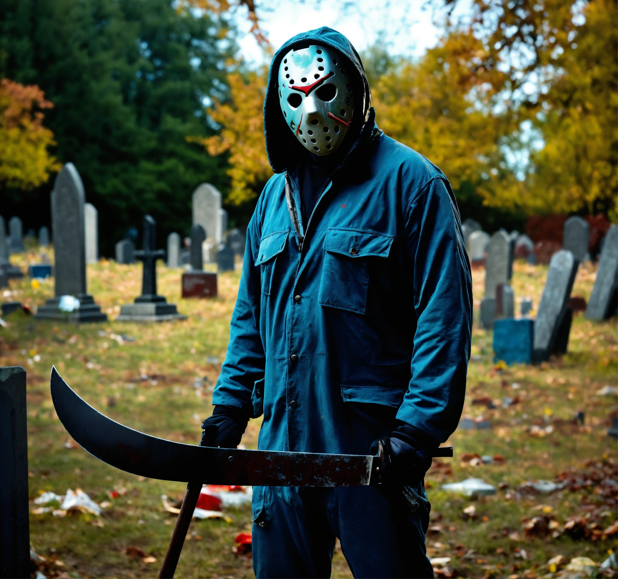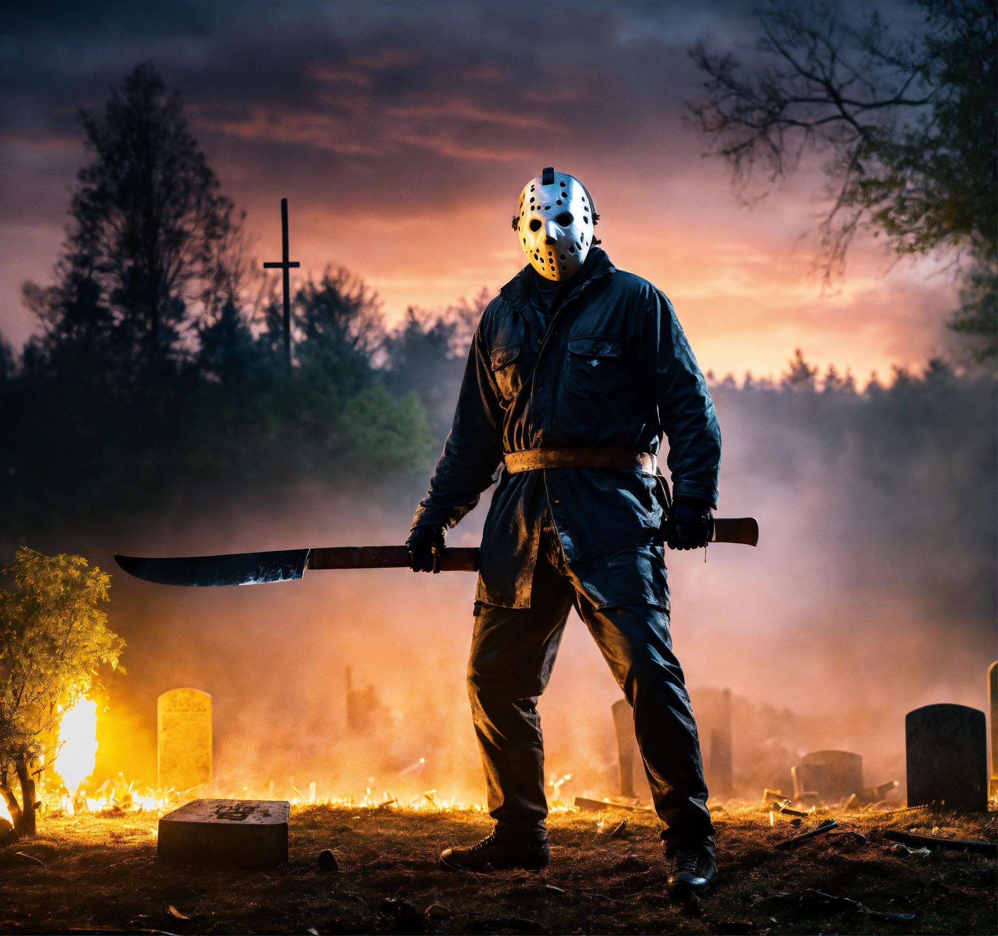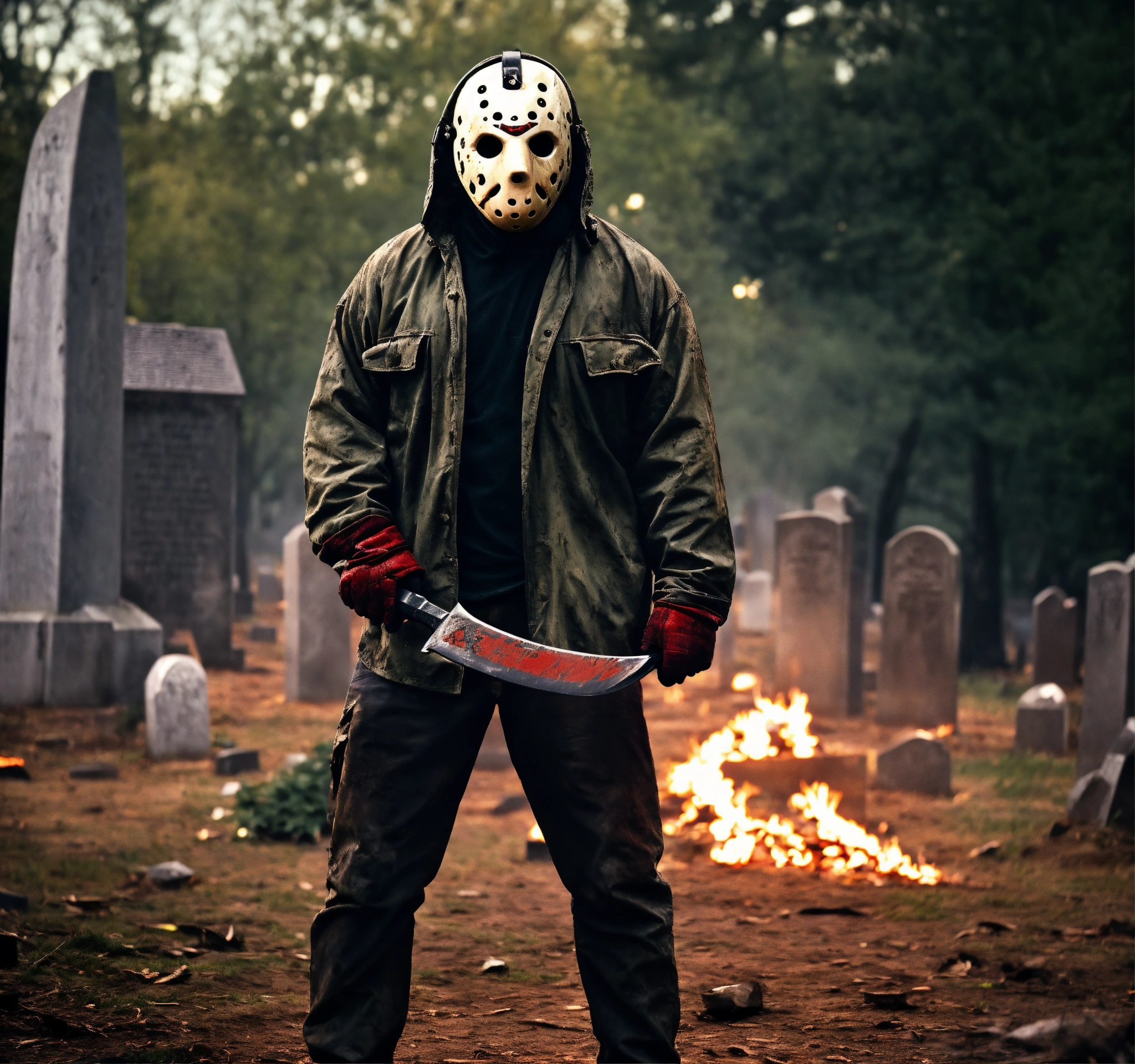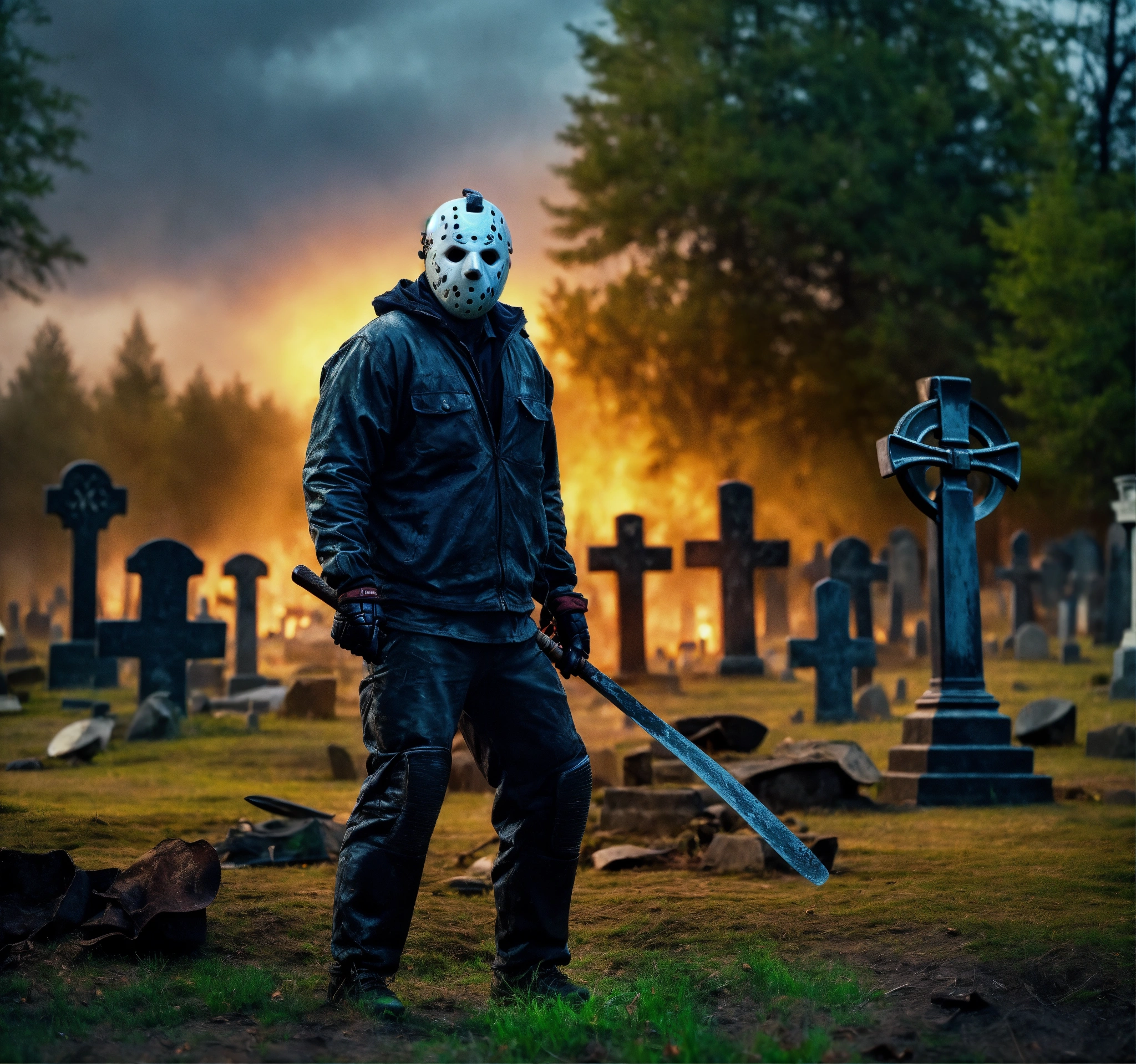 Realistic, cinematic photo of jason voorhees of friday the 13. very realistic photo of jason in his hockey mask holding a machete standing in the graveyard.